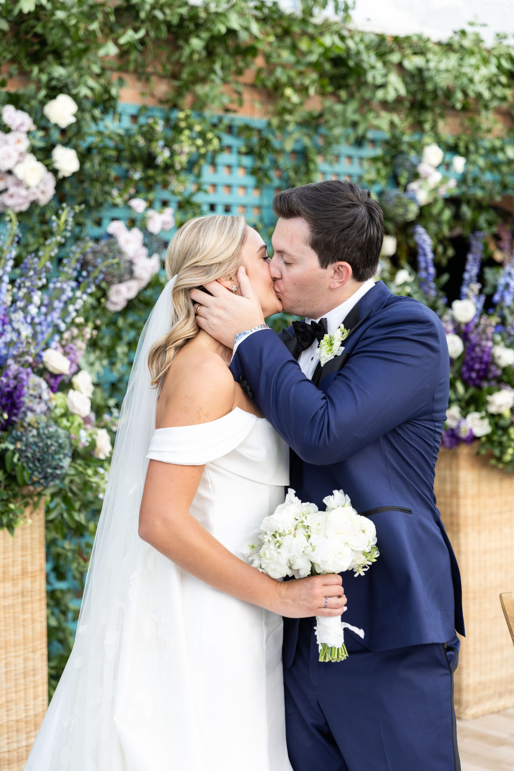 For the rehearsal dinner, Hanna wore a pencil skirt dress custom-made by Nardos Design, with elements from her mother’s wedding gown incorporated into the dress’s oversized cream flowers. And the wrap on her bouquet combined pieces from both her mom’s and Will’s mom’s wedding dresses.