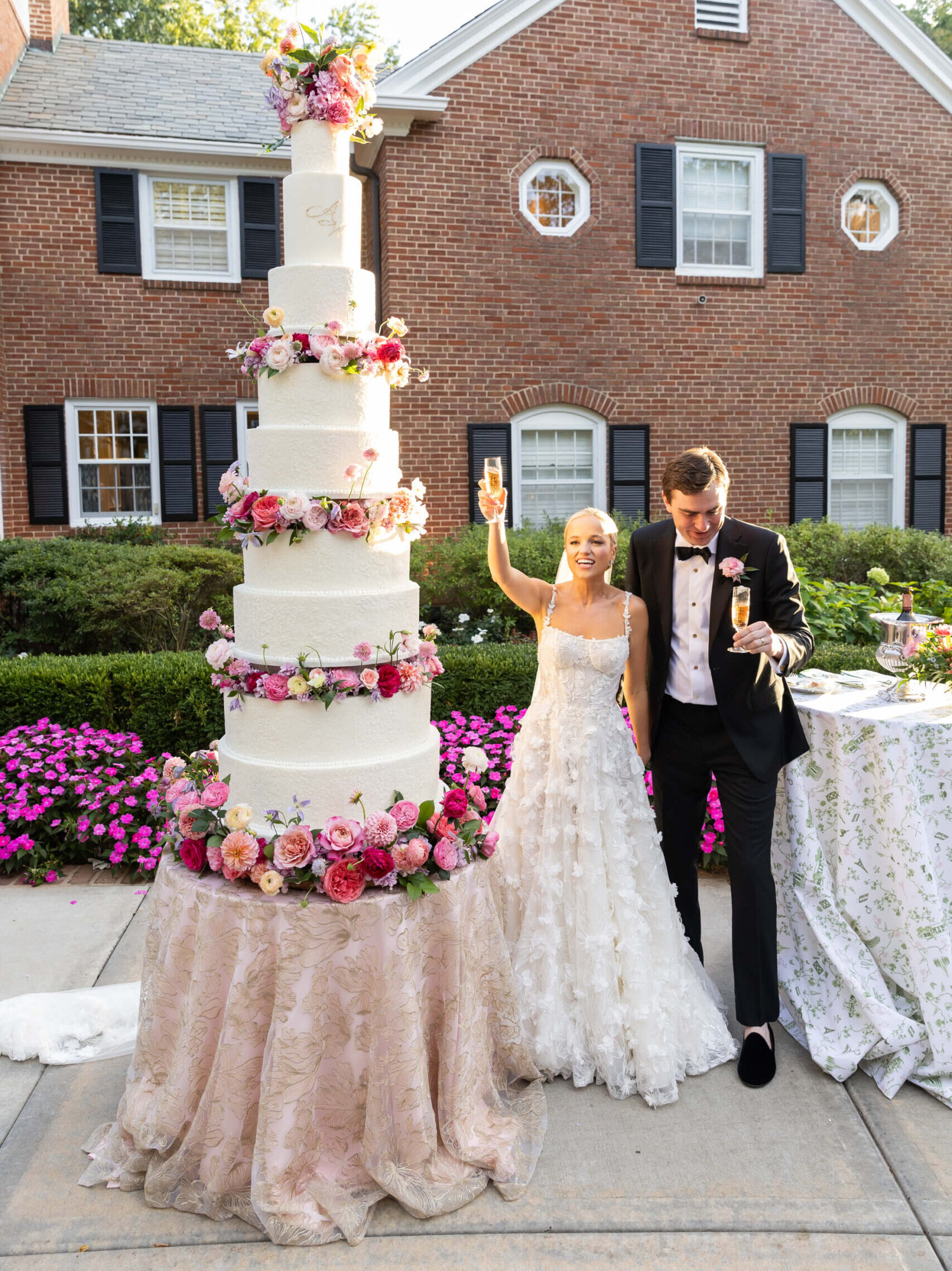 The wedding ceremony took place on Alex’s parents’ anniversary and was held in the same church where they were married. The reception, an unparalleled Glam Garden celebration, took place in the garden of Alex’s childhood home. Both venues were enriched by years of family gatherings and cherished memories.