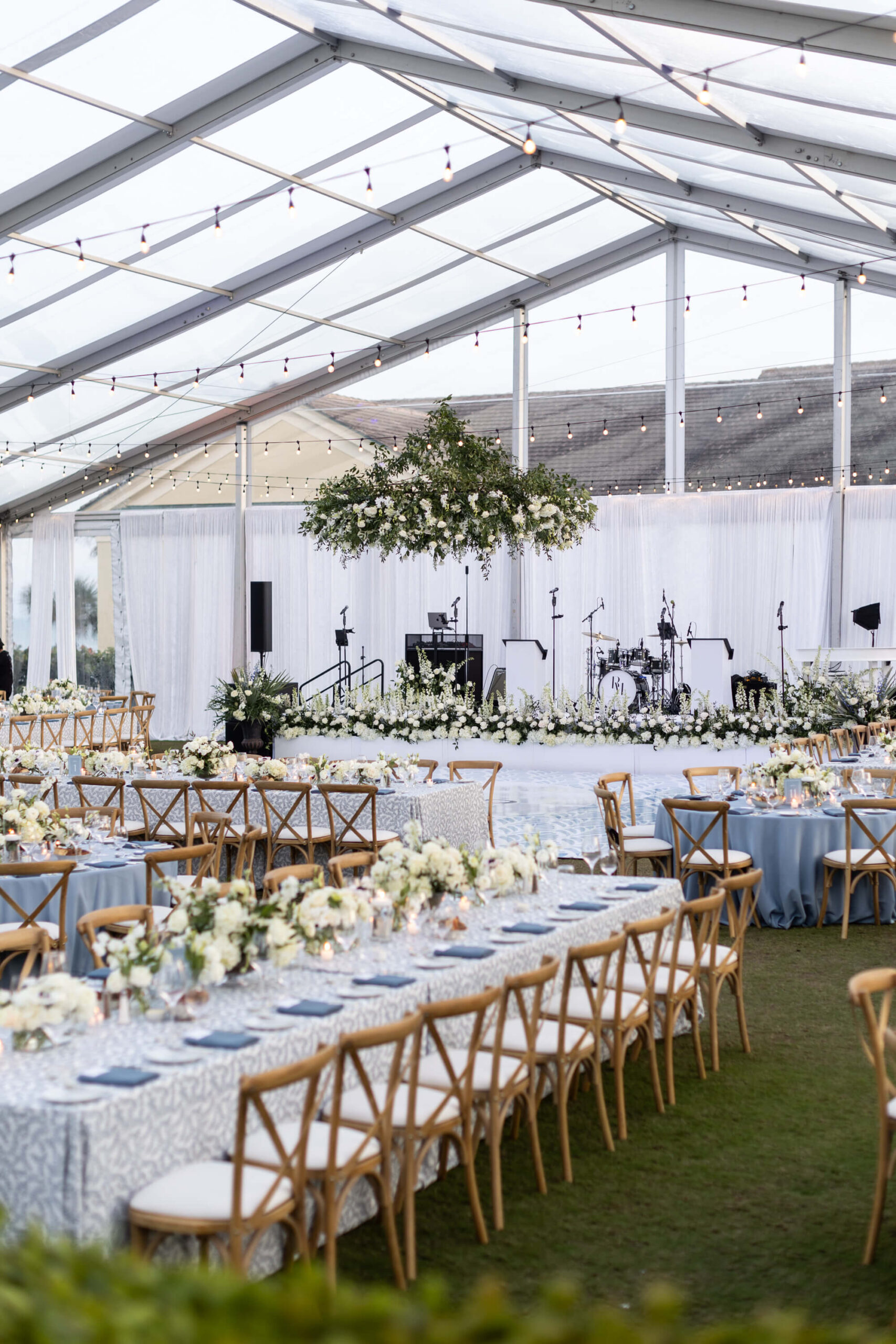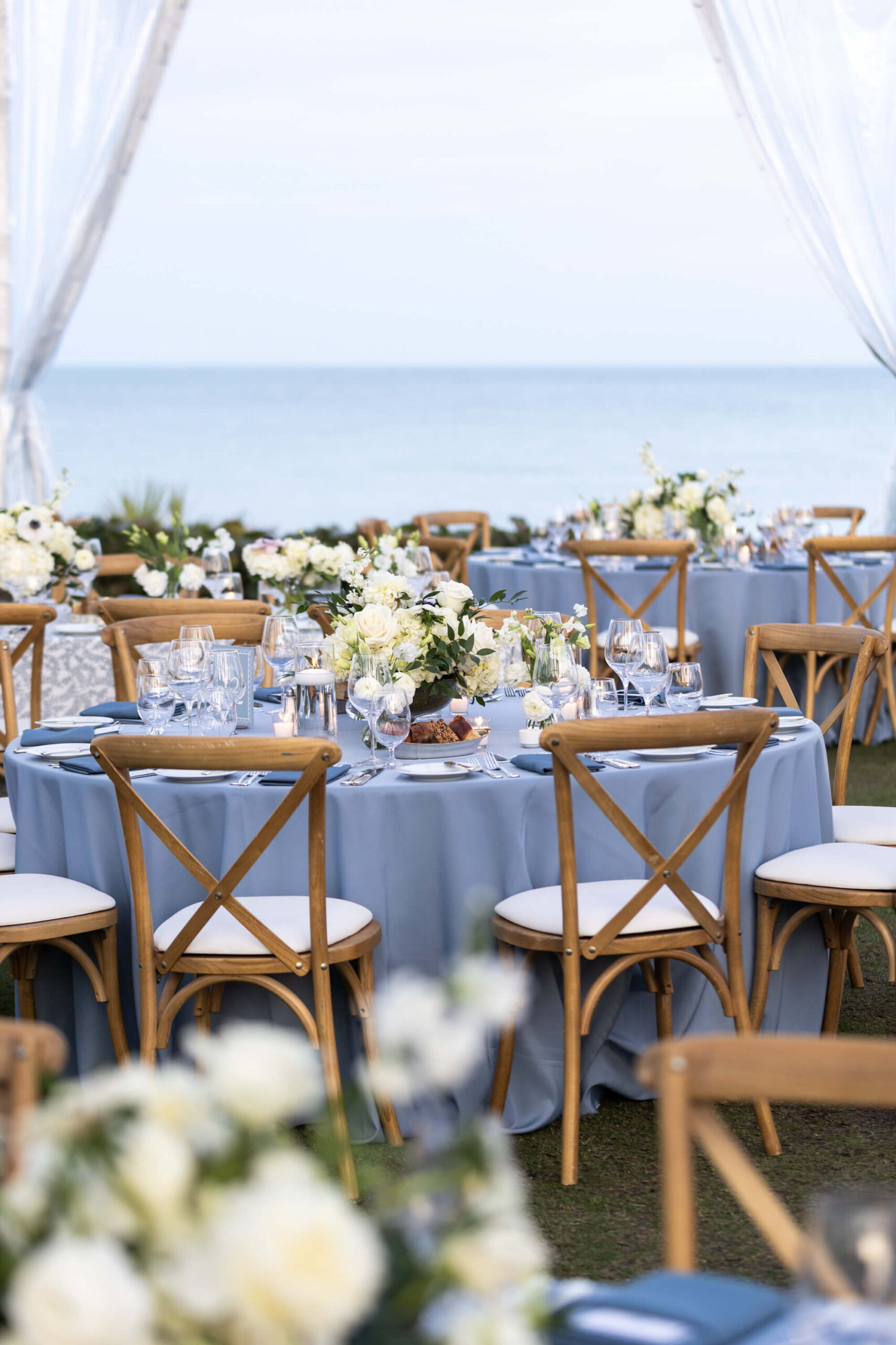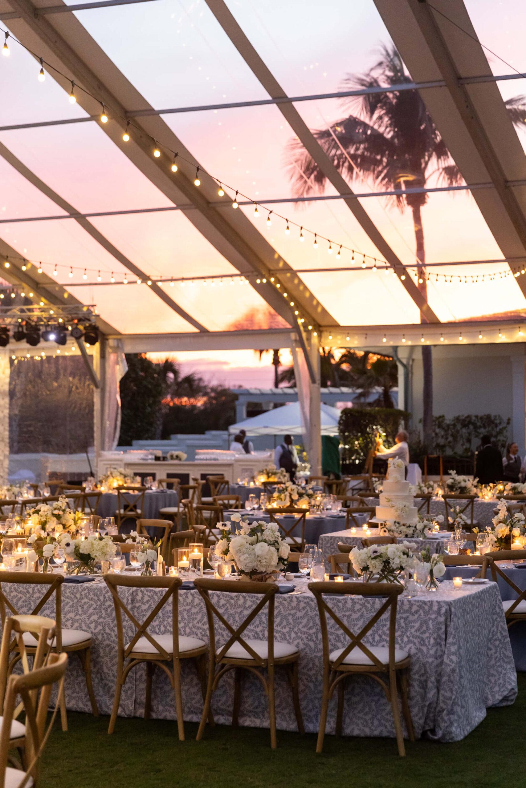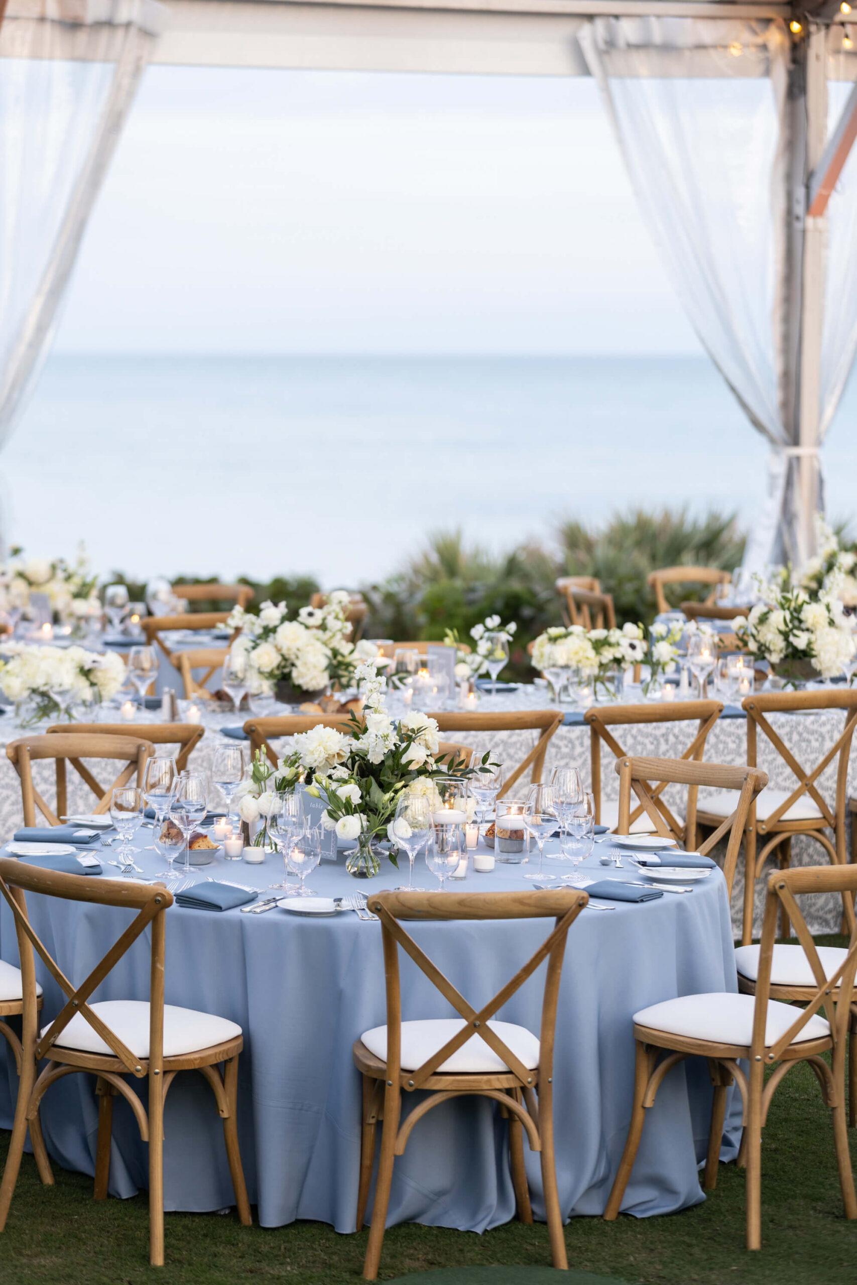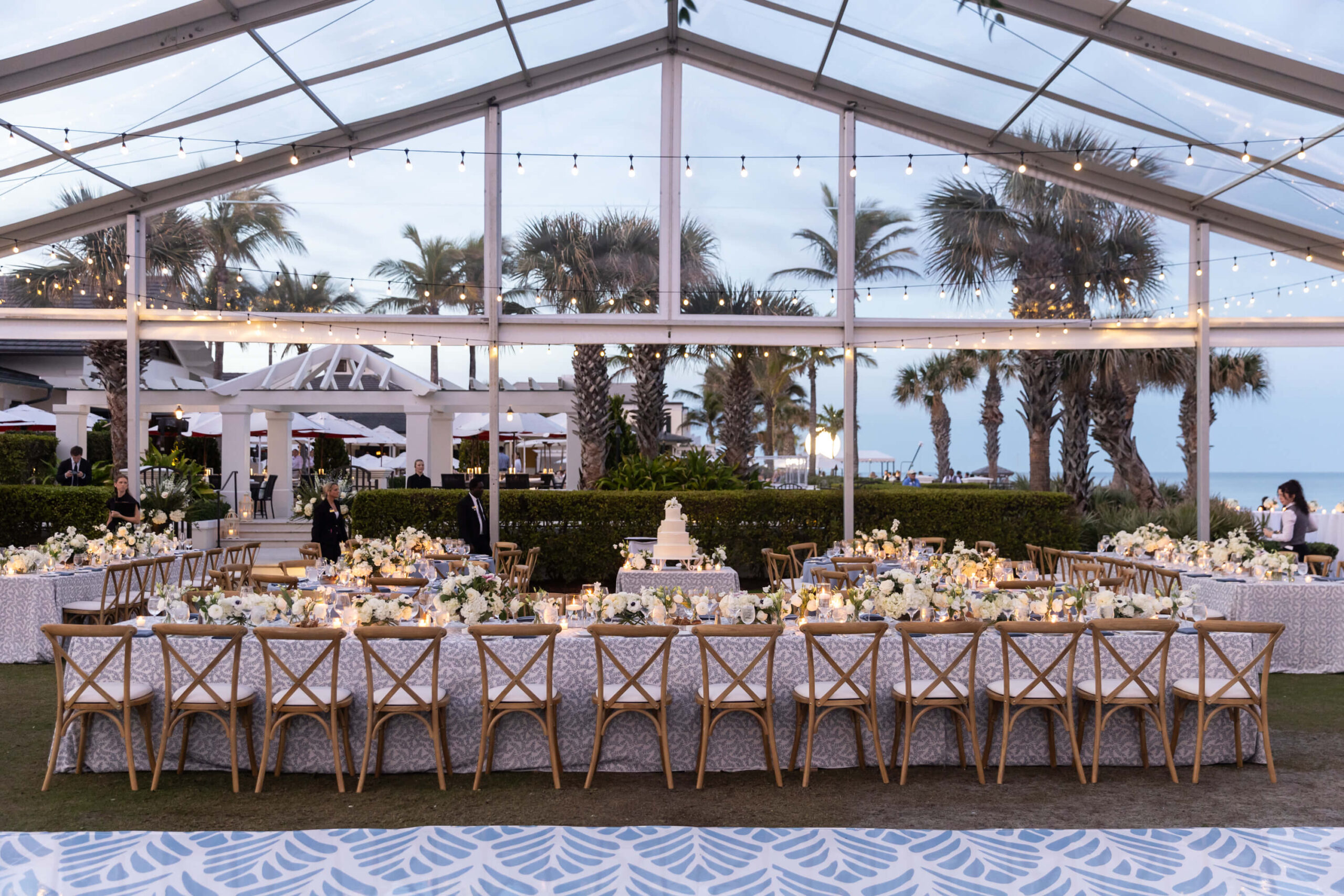 For Alexis and Porter, Vero Beach wasn’t just a picturesque wedding backdrop, it was a place woven into the fabric of their lives. Porter’s family had spent years vacationing there, and with the Atlantic coastline stretching behind them, Johns Island Club became the perfect setting to gather loved ones for an elegant January wedding. Blue accents and all-white florals filled the clear-top tent, creating the sensation of dancing beneath the stars, while the ocean breeze and cloudless sky made for a dreamlike day.
