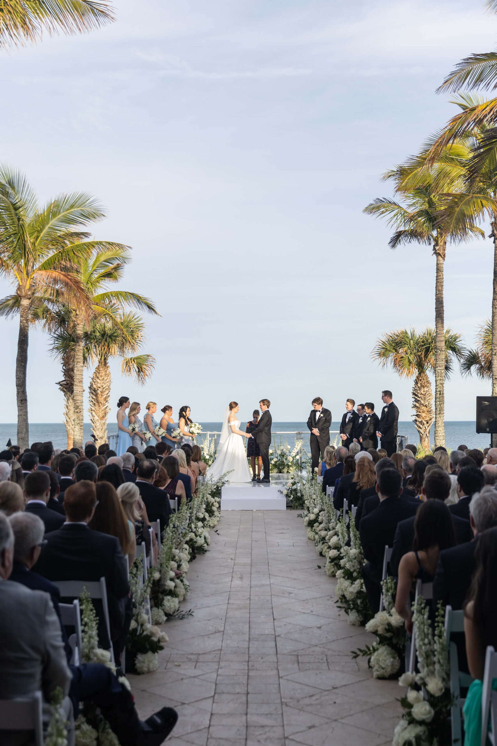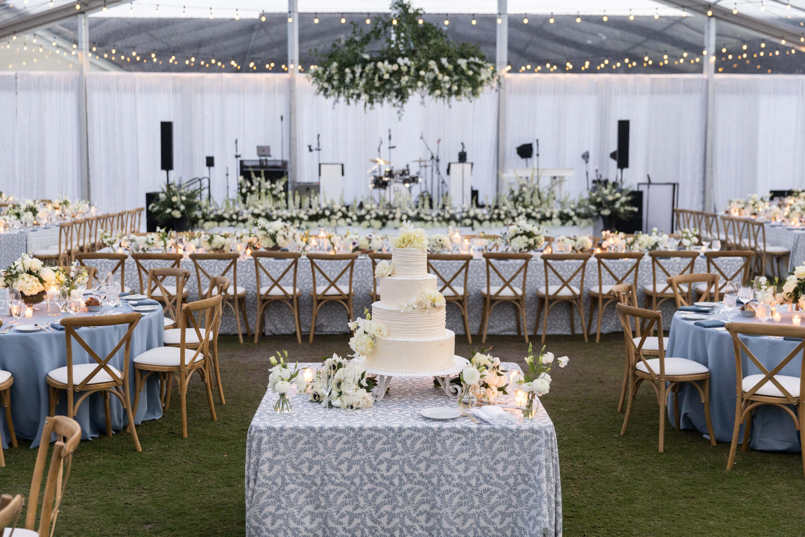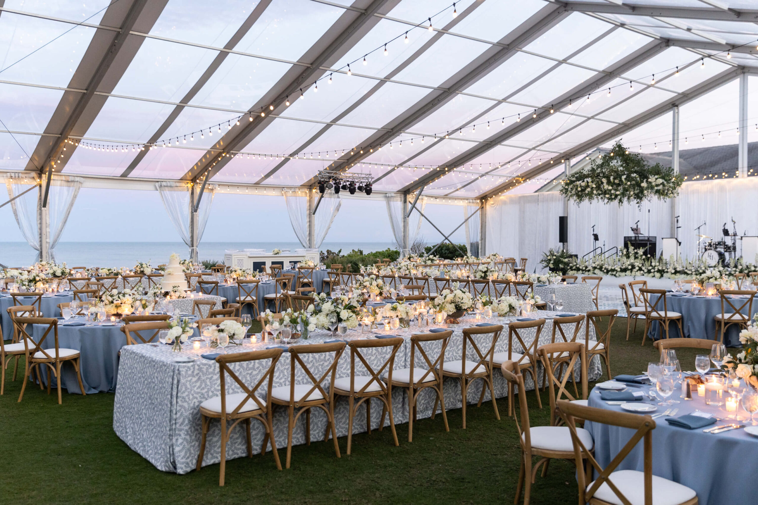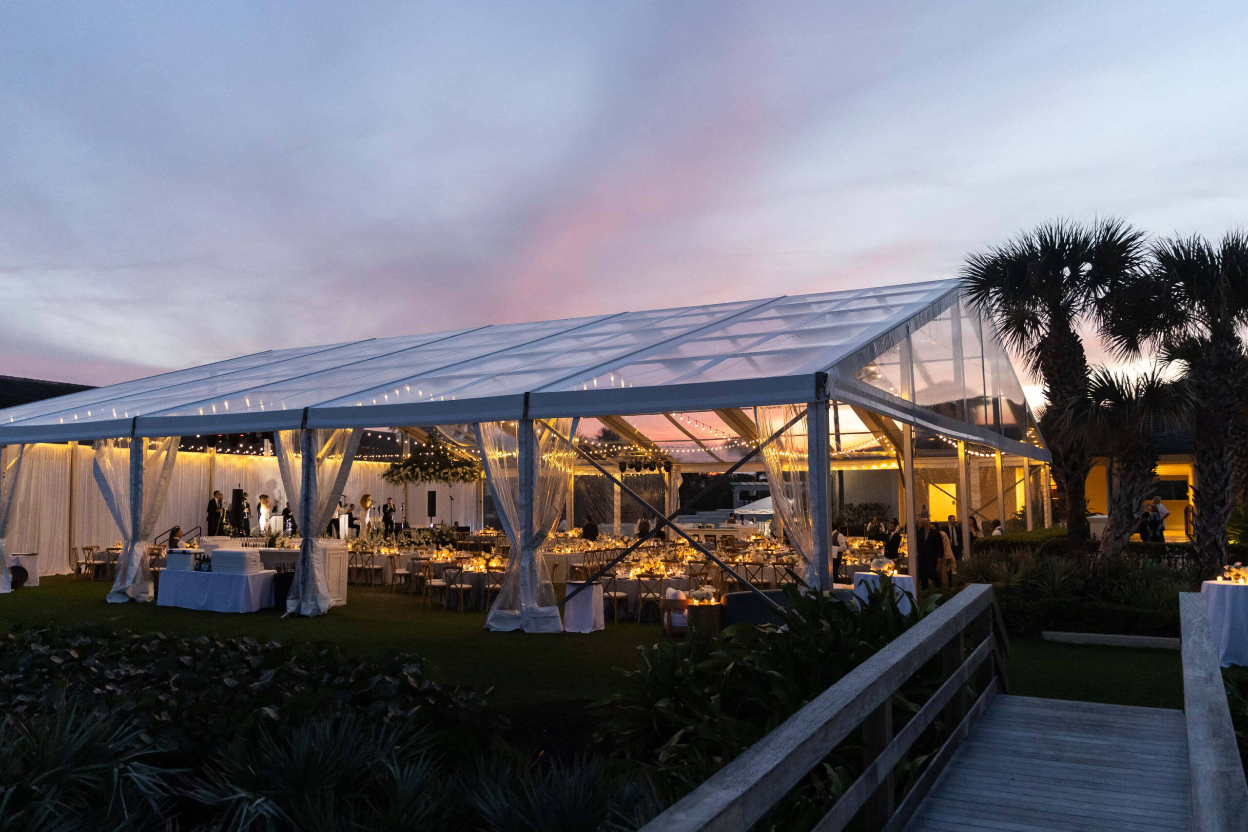 For Alexis and Porter, Vero Beach wasn’t just a picturesque wedding backdrop, it was a place woven into the fabric of their lives. Porter’s family had spent years vacationing there, and with the Atlantic coastline stretching behind them, Johns Island Club became the perfect setting to gather loved ones for an elegant January wedding. Blue accents and all-white florals filled the clear-top tent, creating the sensation of dancing beneath the stars, while the ocean breeze and cloudless sky made for a dreamlike day.