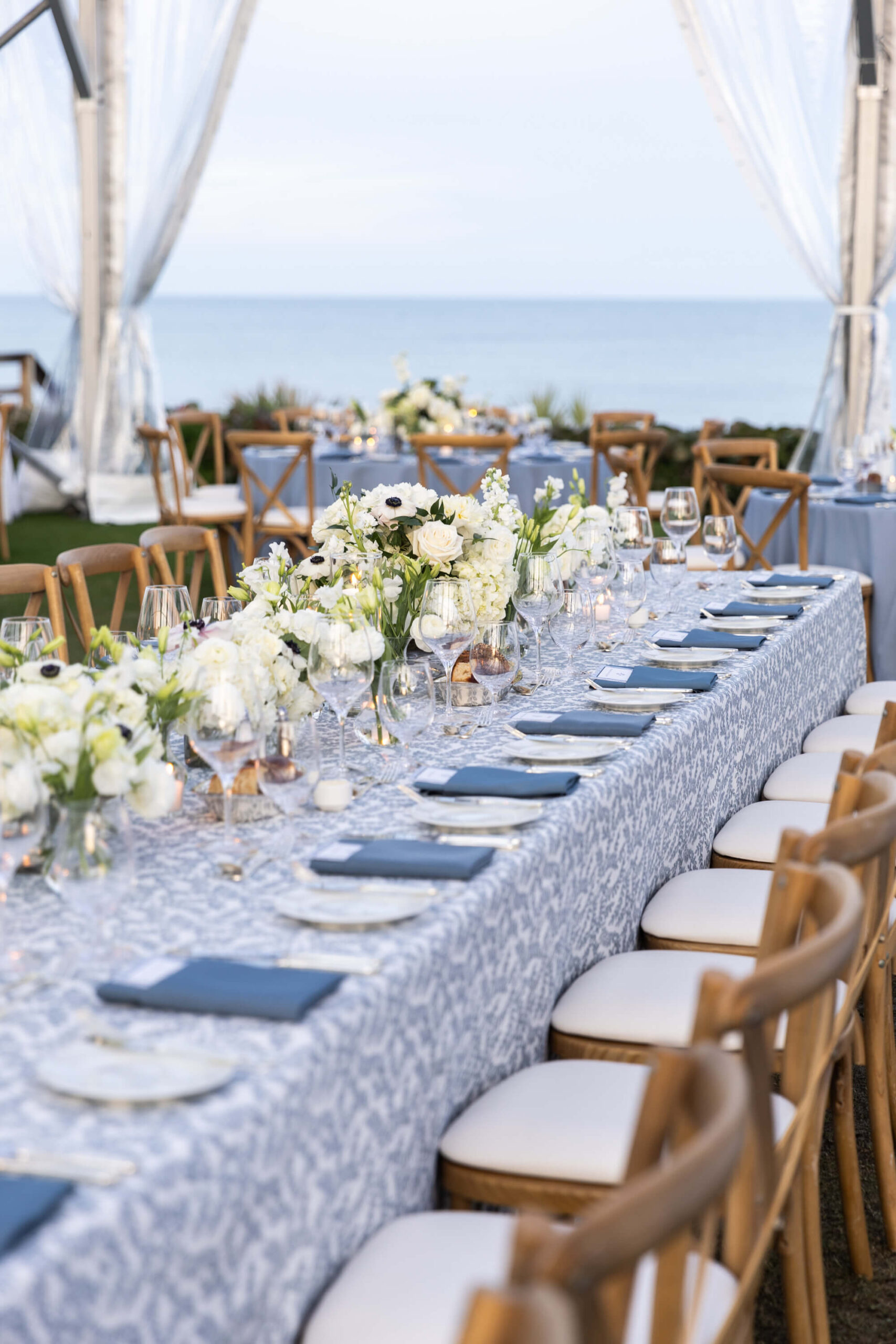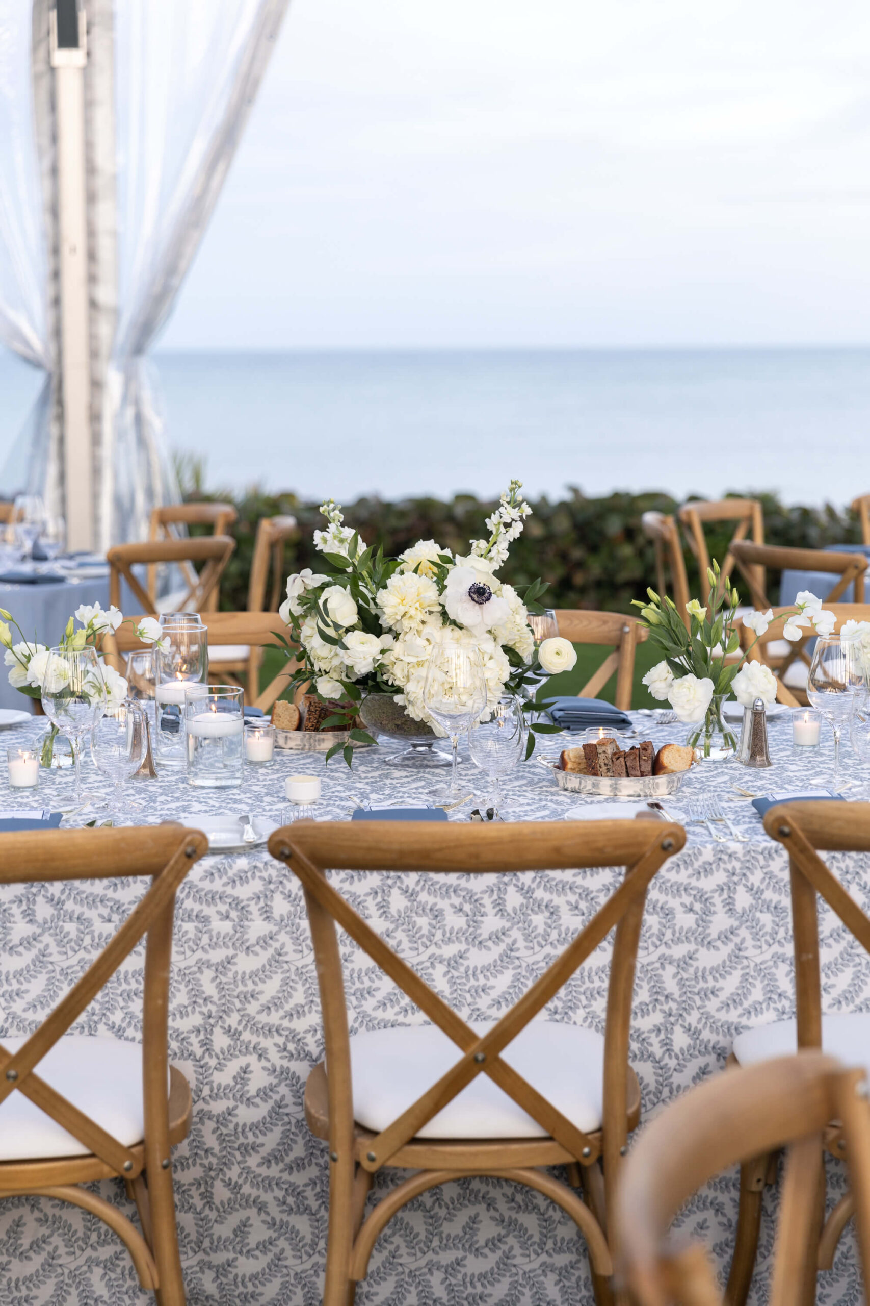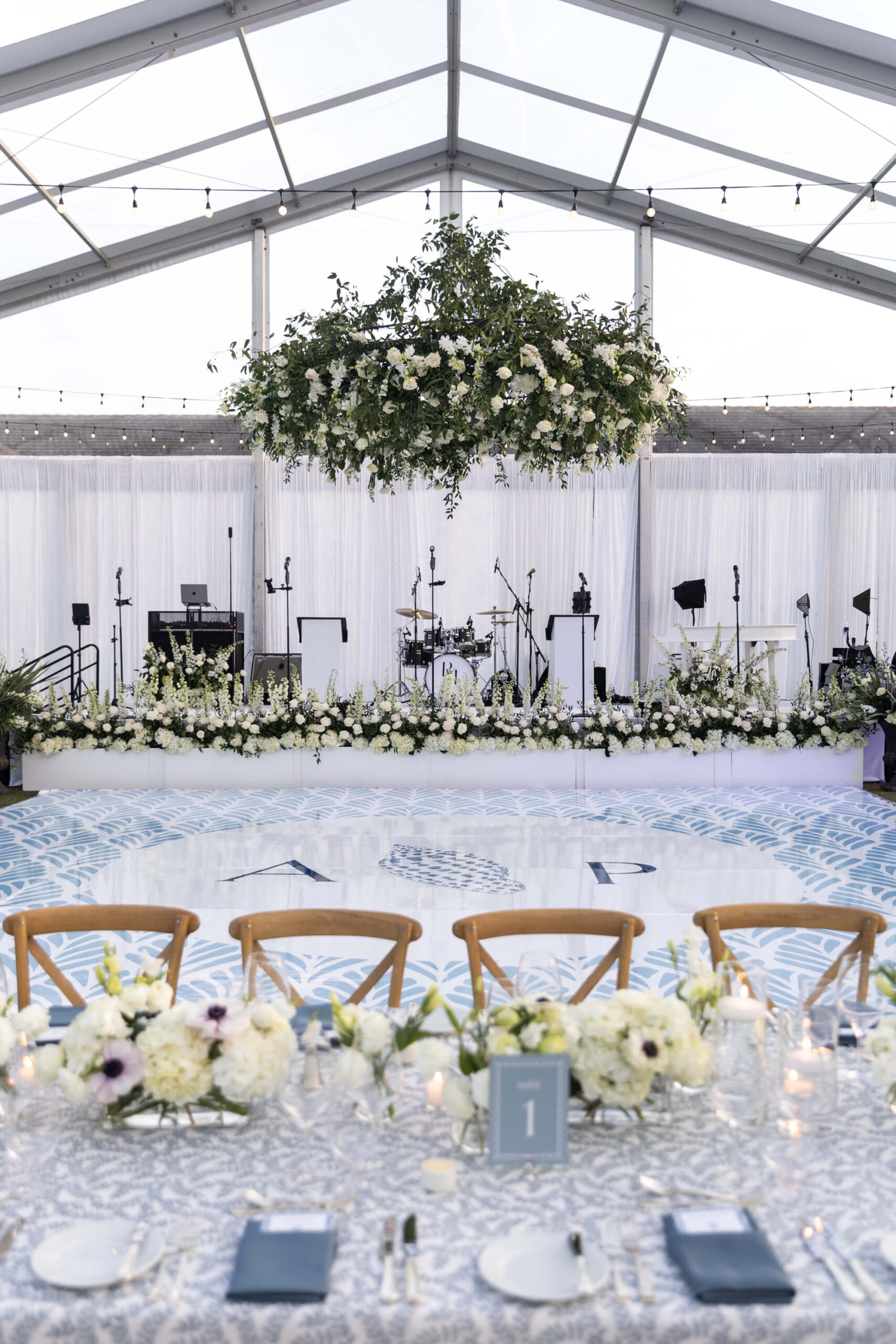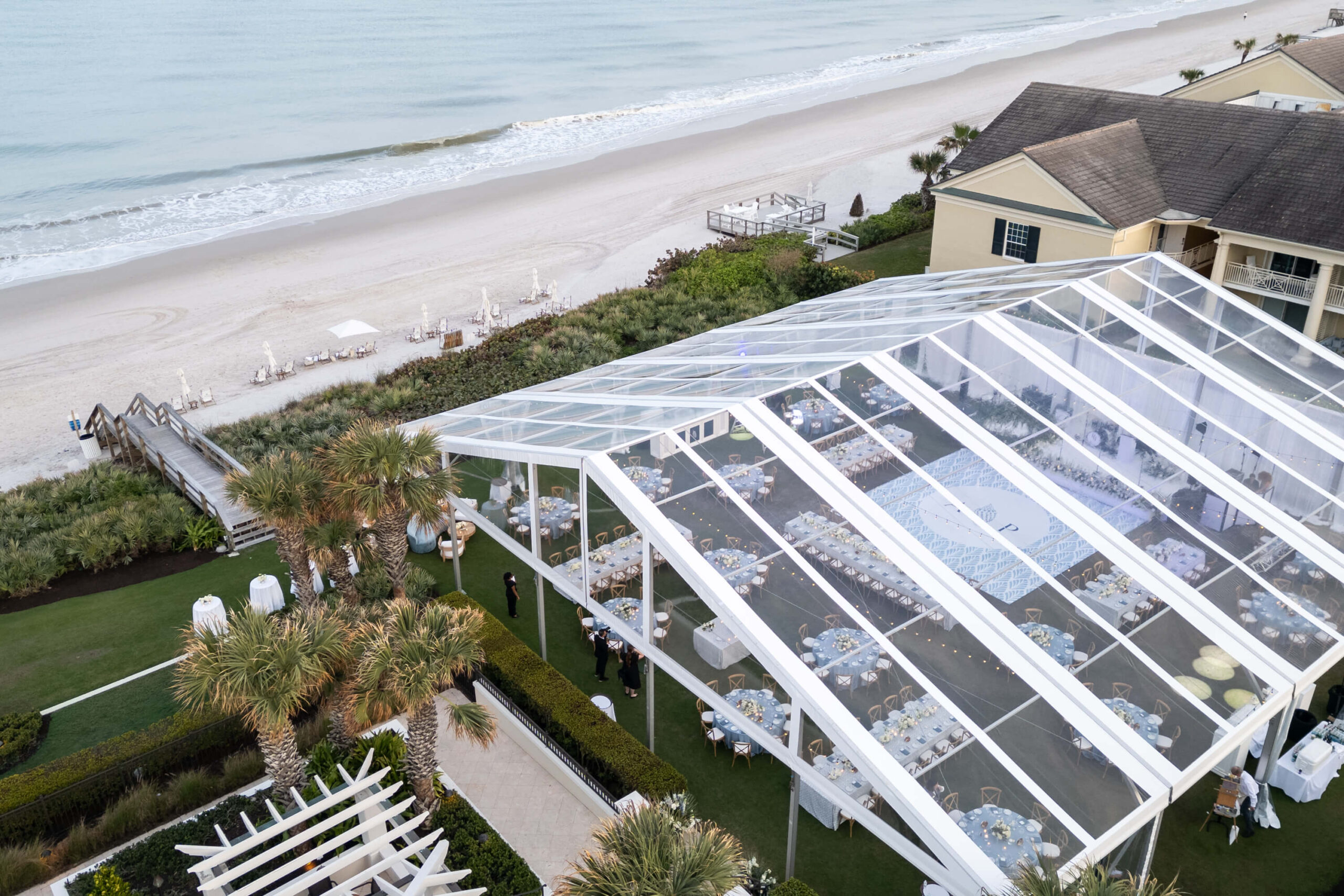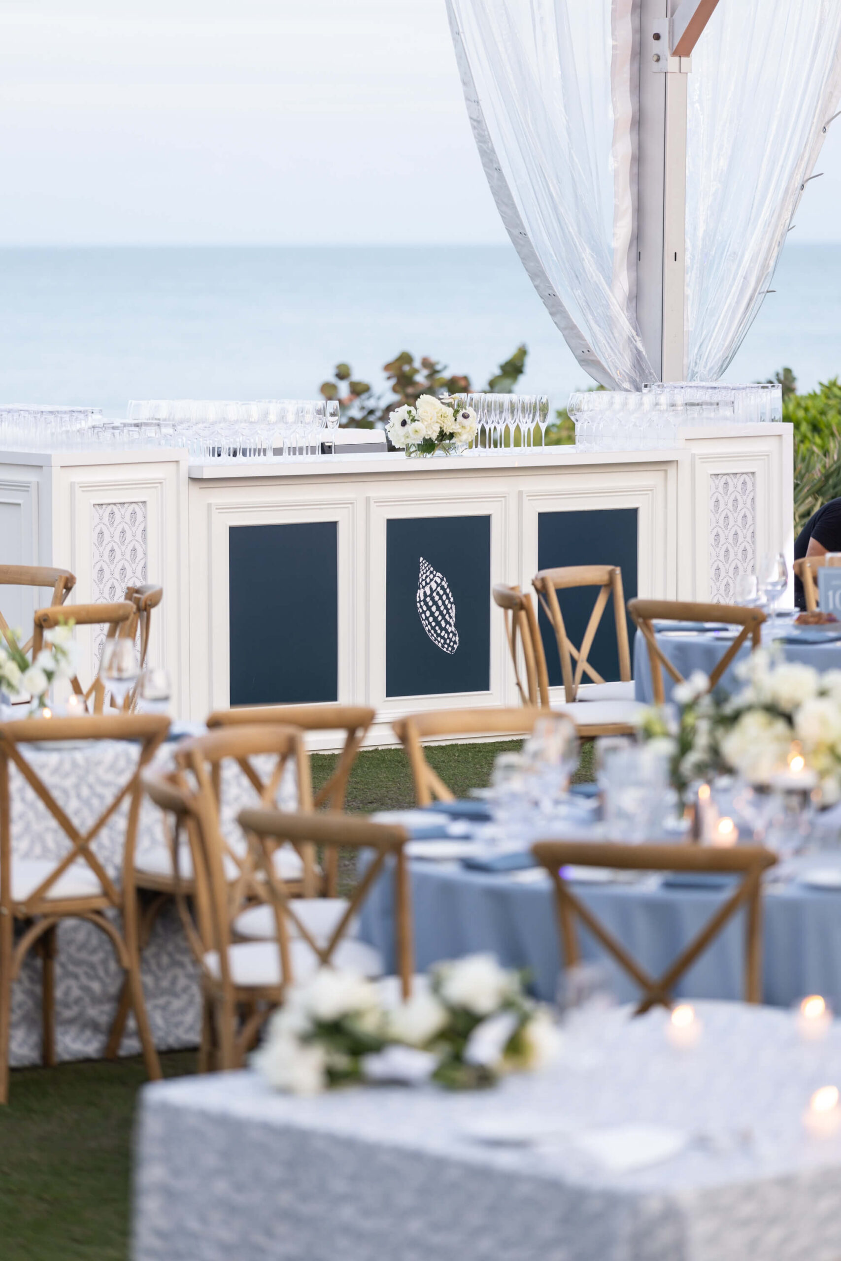 For Alexis and Porter, Vero Beach wasn’t just a picturesque wedding backdrop, it was a place woven into the fabric of their lives. Porter’s family had spent years vacationing there, and with the Atlantic coastline stretching behind them, Johns Island Club became the perfect setting to gather loved ones for an elegant January wedding. Blue accents and all-white florals filled the clear-top tent, creating the sensation of dancing beneath the stars, while the ocean breeze and cloudless sky made for a dreamlike day.
