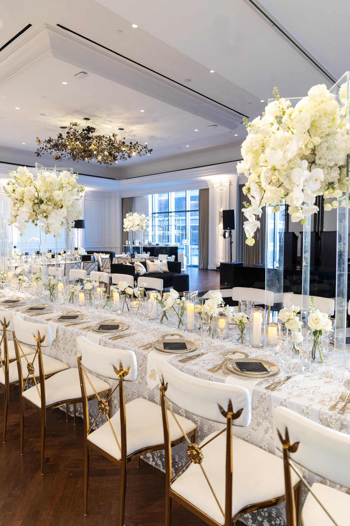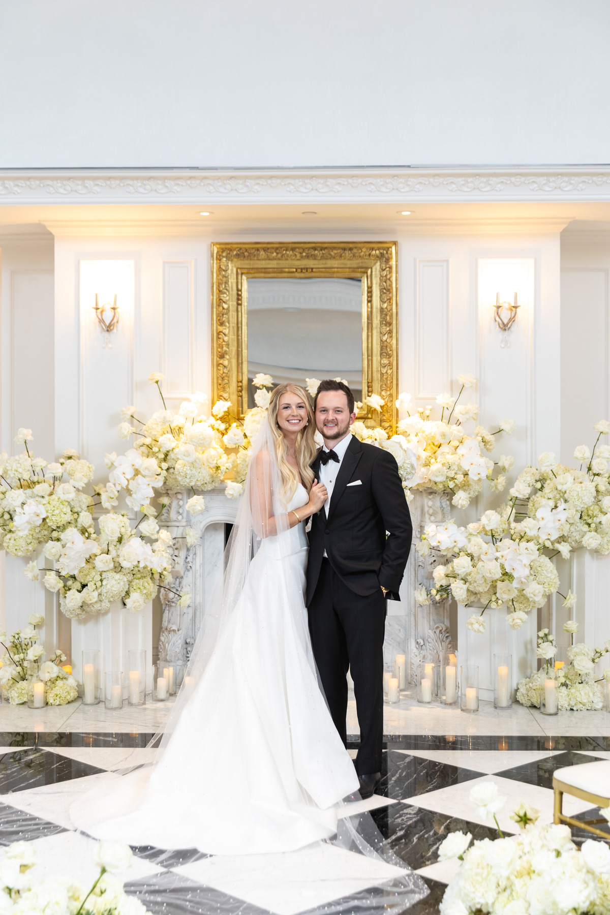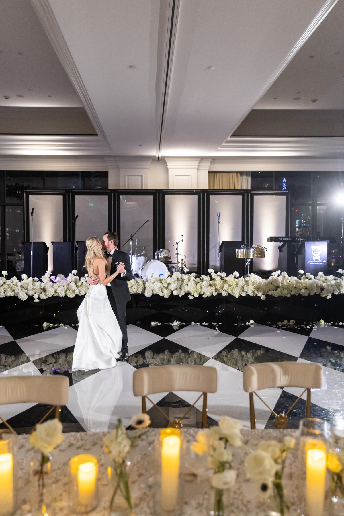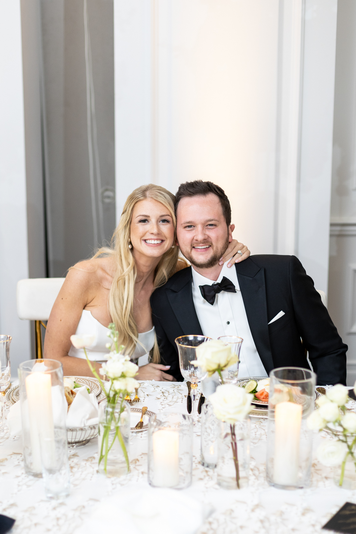 Working closely with her mom and planner, the design came together around a classic black-and-white palette with abundant candles and florals, creating a warm and romantic atmosphere perfect for a November wedding. “I was really excited to see everything come together,” Alexis said. “Our vision was romantic and elegant with lots of candles and flowers.”