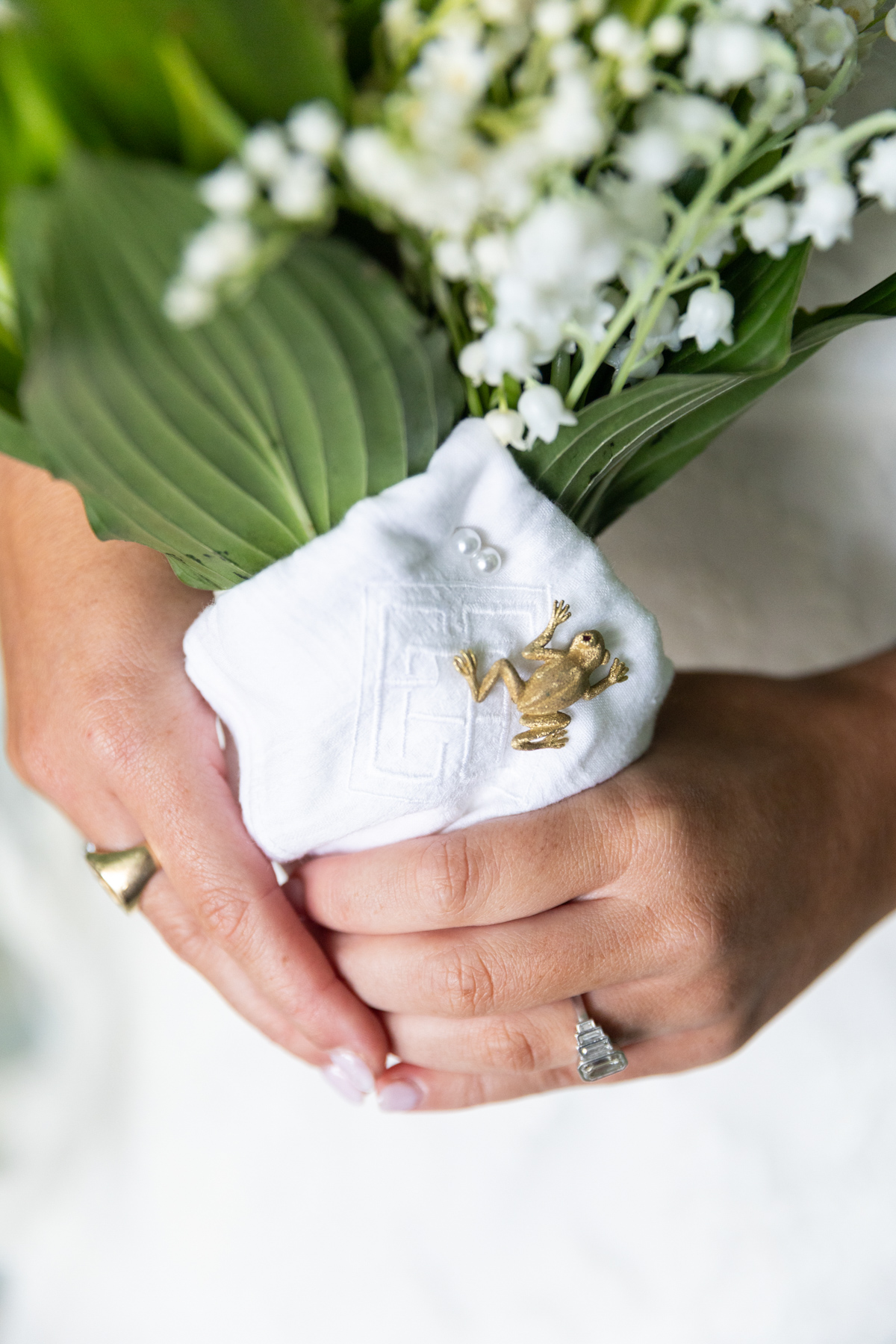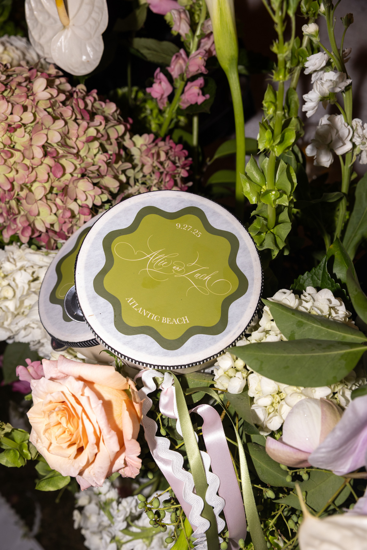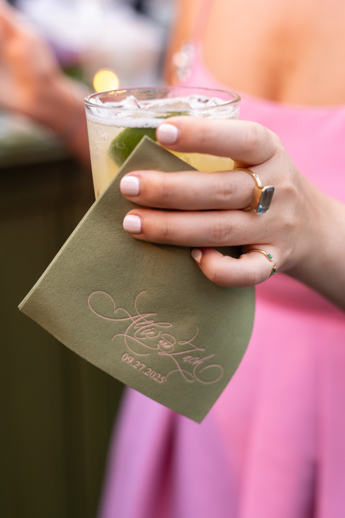 The sentimental details were at the heart of everything. Allie’s veil was made from the lace of her mother’s wedding dress, the very same lace that perfectly matched both sisters’ gowns by coincidence. She carried her grandmother’s rings as her “something blue,” wrapped her bouquet with her grandfather’s handkerchief, and pinned it with a frog brooch honoring her grandmother’s favorite symbol. Silver trays from her mother’s collection held matchboxes and small décor pieces, while her best friend needlepointed a custom ring bearer pillow inspired by the calligraphy from their save the date. Even the branded limes for the bar, an idea Allie had fallen in love with, became a core memory.