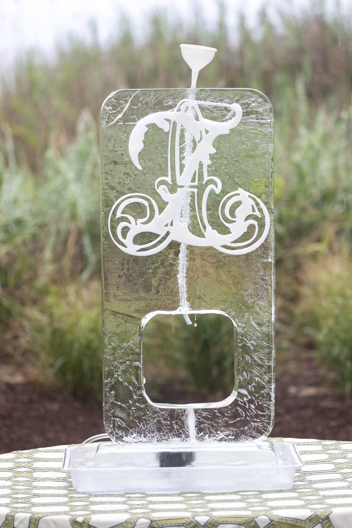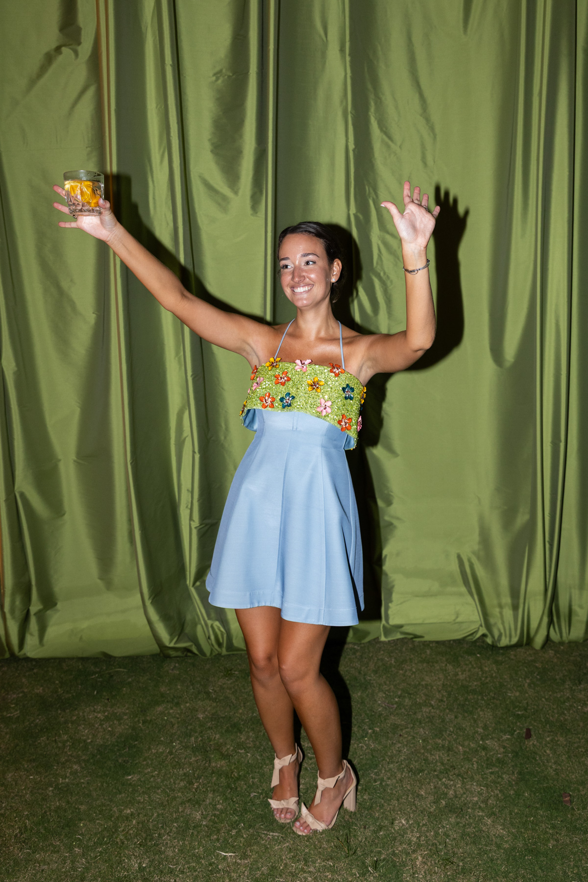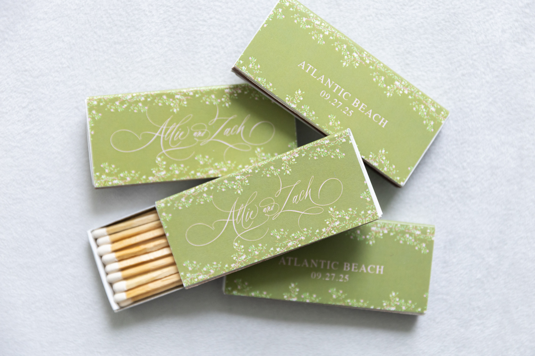 The sentimental details were at the heart of everything. Allie’s veil was made from the lace of her mother’s wedding dress, the very same lace that perfectly matched both sisters’ gowns by coincidence. She carried her grandmother’s rings as her “something blue,” wrapped her bouquet with her grandfather’s handkerchief, and pinned it with a frog brooch honoring her grandmother’s favorite symbol. Silver trays from her mother’s collection held matchboxes and small décor pieces, while her best friend needlepointed a custom ring bearer pillow inspired by the calligraphy from their save the date. Even the branded limes for the bar, an idea Allie had fallen in love with, became a core memory.