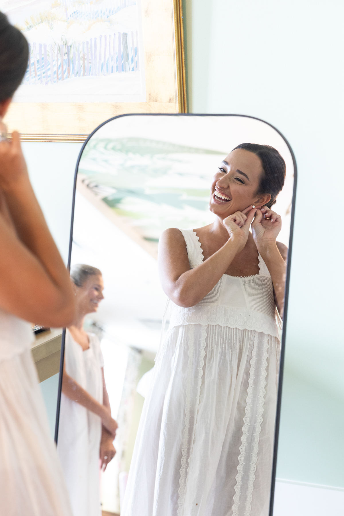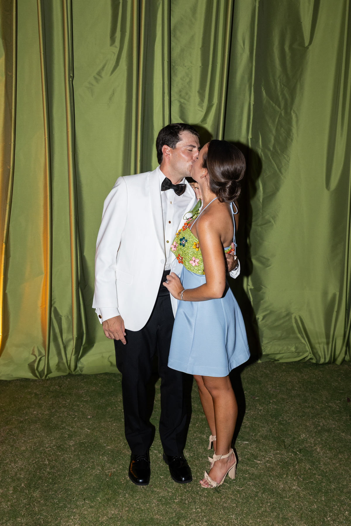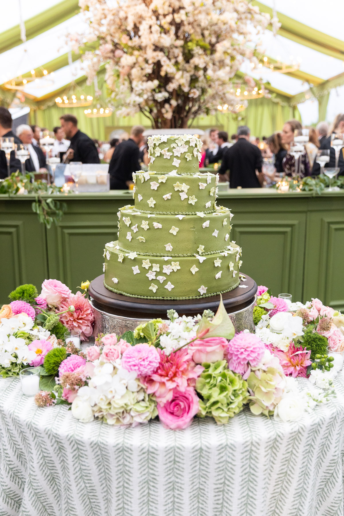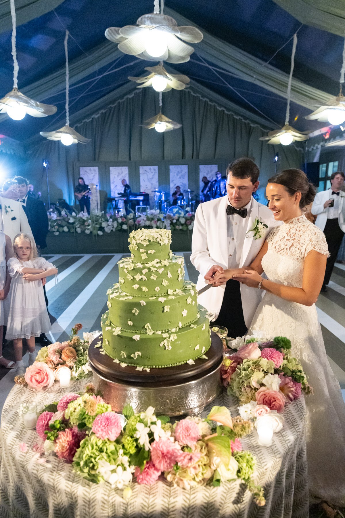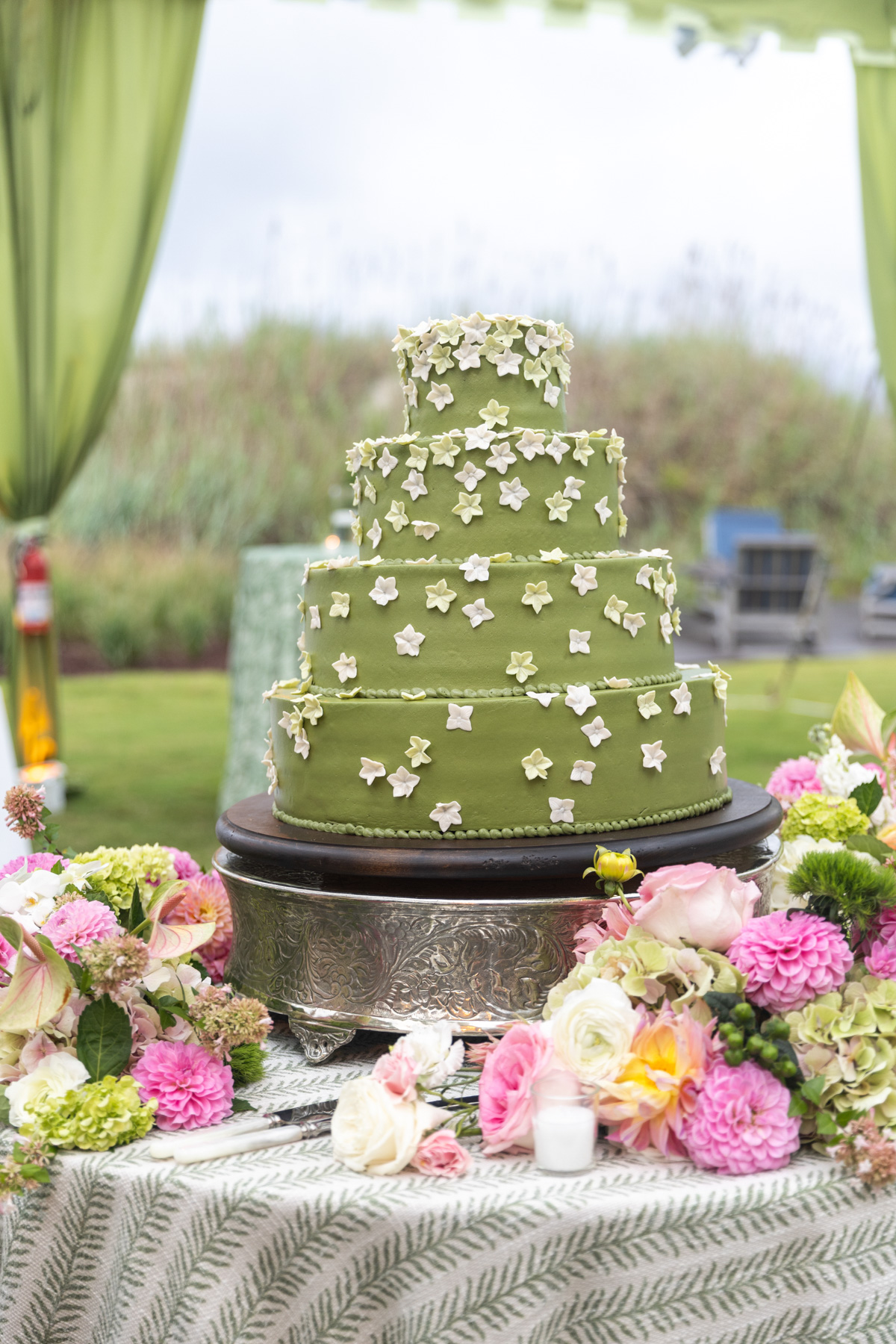 After the ceremony, the two slipped away to a quiet room for a few minutes to share a plate of food and breathe in the reality of the moment. The reception was a whirlwind in the best way, filled with coastal air, green tones, laughter, and dancing. The wedding cake, perfectly color-matched to the paint swatches of their bar backdrop, was one of the most creative elements of the night.