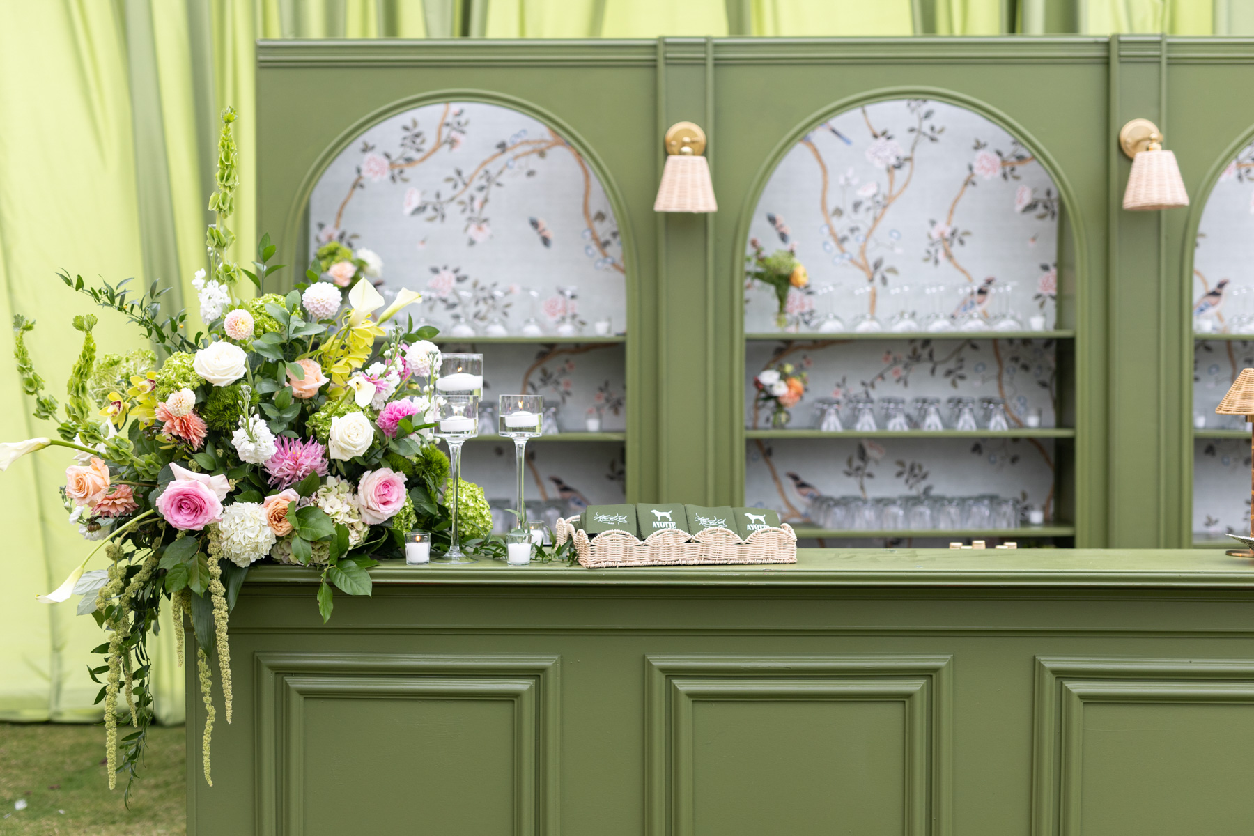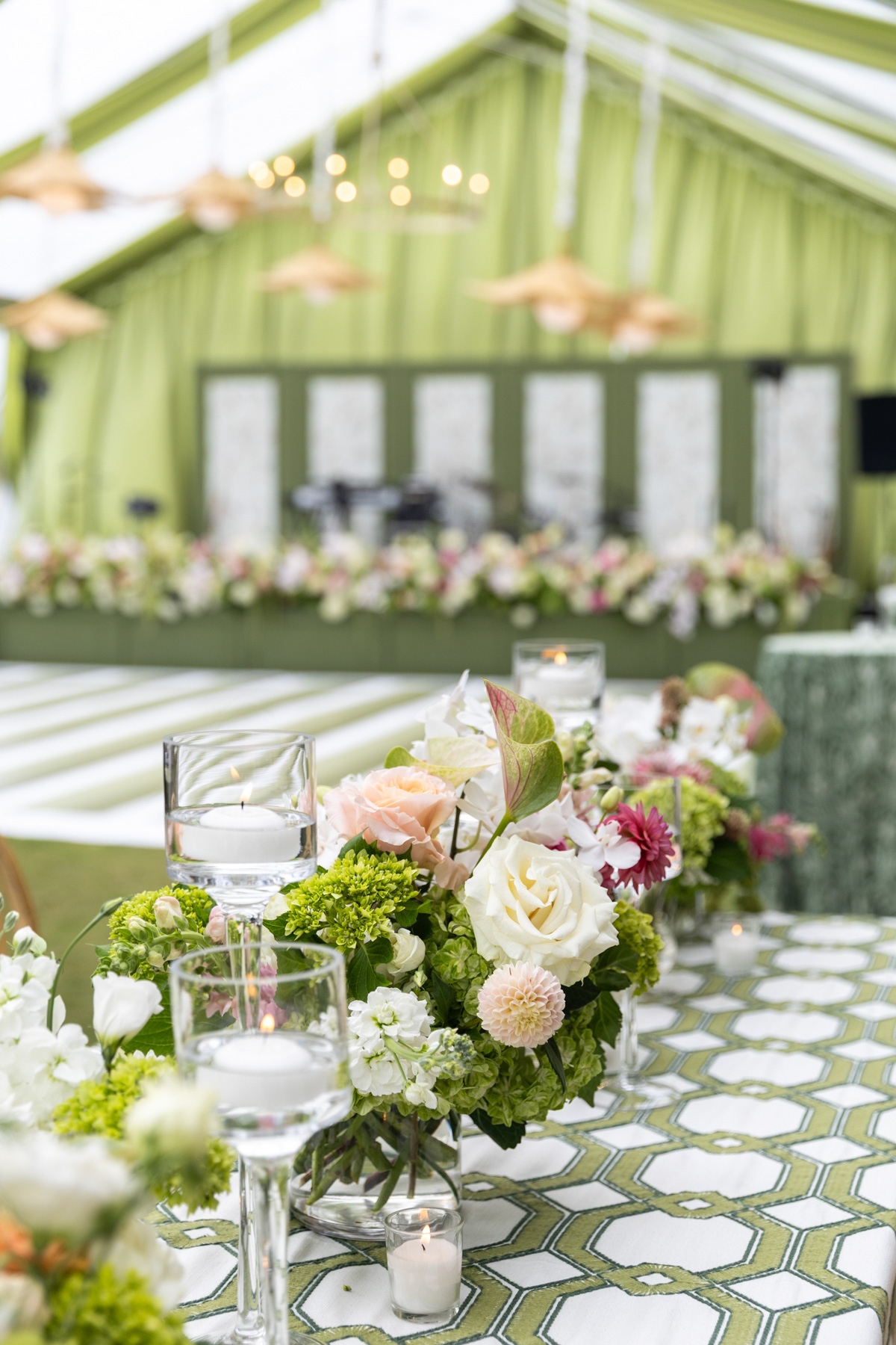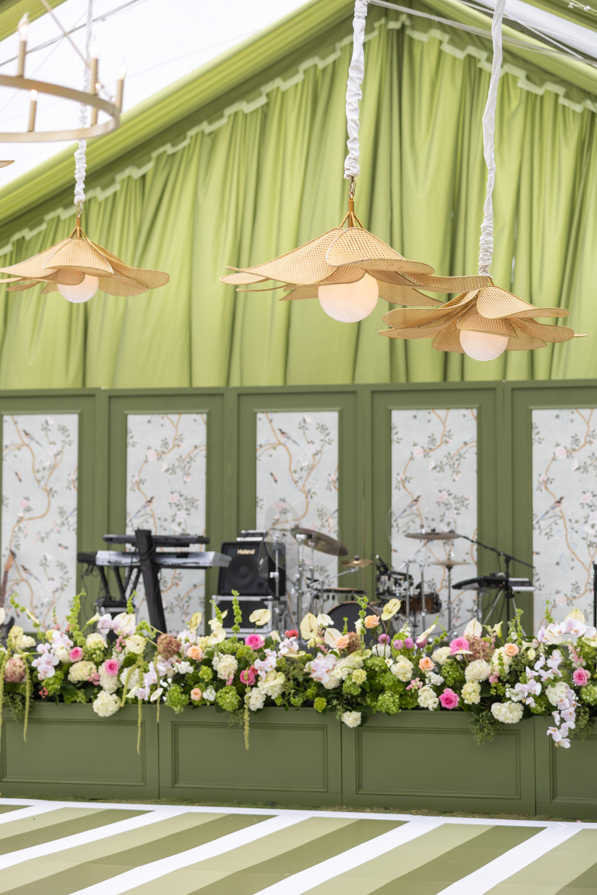 Using inspiration collected over years, Allie envisioned a reception that felt fresh, personal, and uniquely theirs, filled with green tones, layered patterns, custom touches, and heirlooms woven throughout. The striped dance floor, hanging pendants, soft patterns, and statement bar came together in a way that exceeded every expectation Allie had imagined during months of dreaming and mock-ups. Their rental partners even built a custom wallpapered backdrop for the band, something they’d never created before.