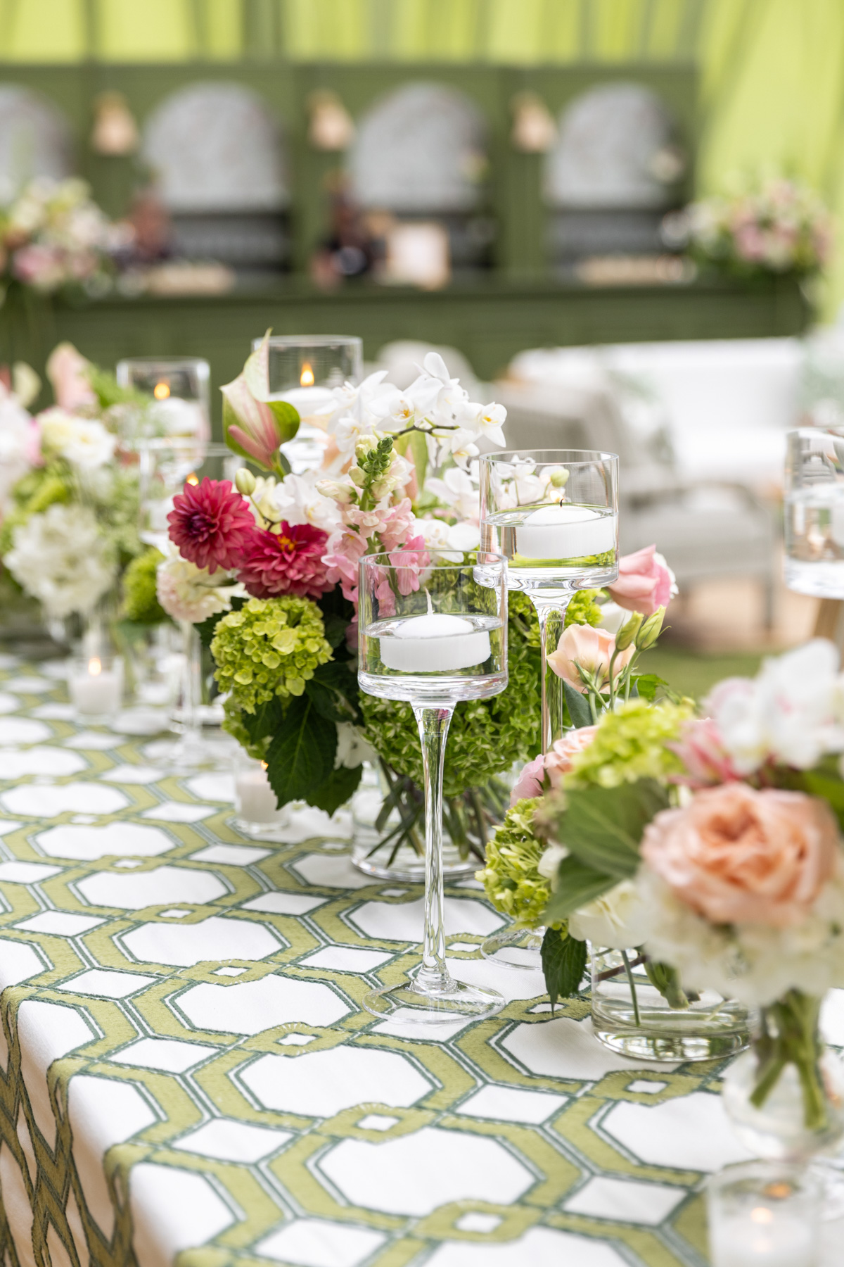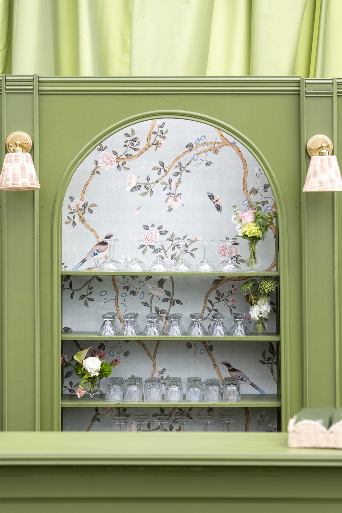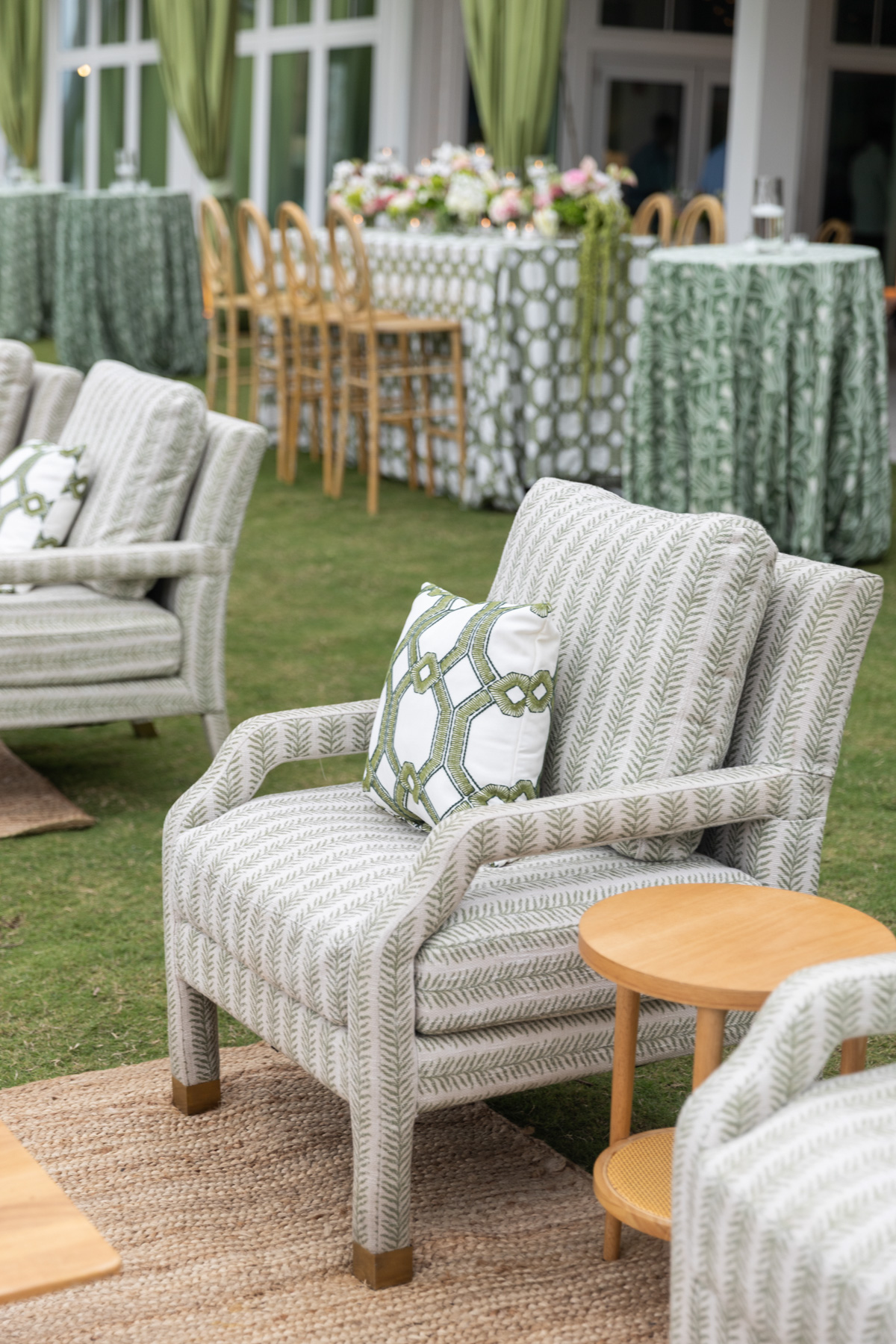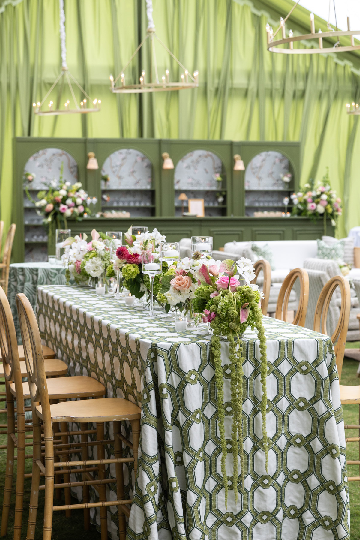 Using inspiration collected over years, Allie envisioned a reception that felt fresh, personal, and uniquely theirs, filled with green tones, layered patterns, custom touches, and heirlooms woven throughout. The striped dance floor, hanging pendants, soft patterns, and statement bar came together in a way that exceeded every expectation Allie had imagined during months of dreaming and mock-ups. Their rental partners even built a custom wallpapered backdrop for the band, something they’d never created before.