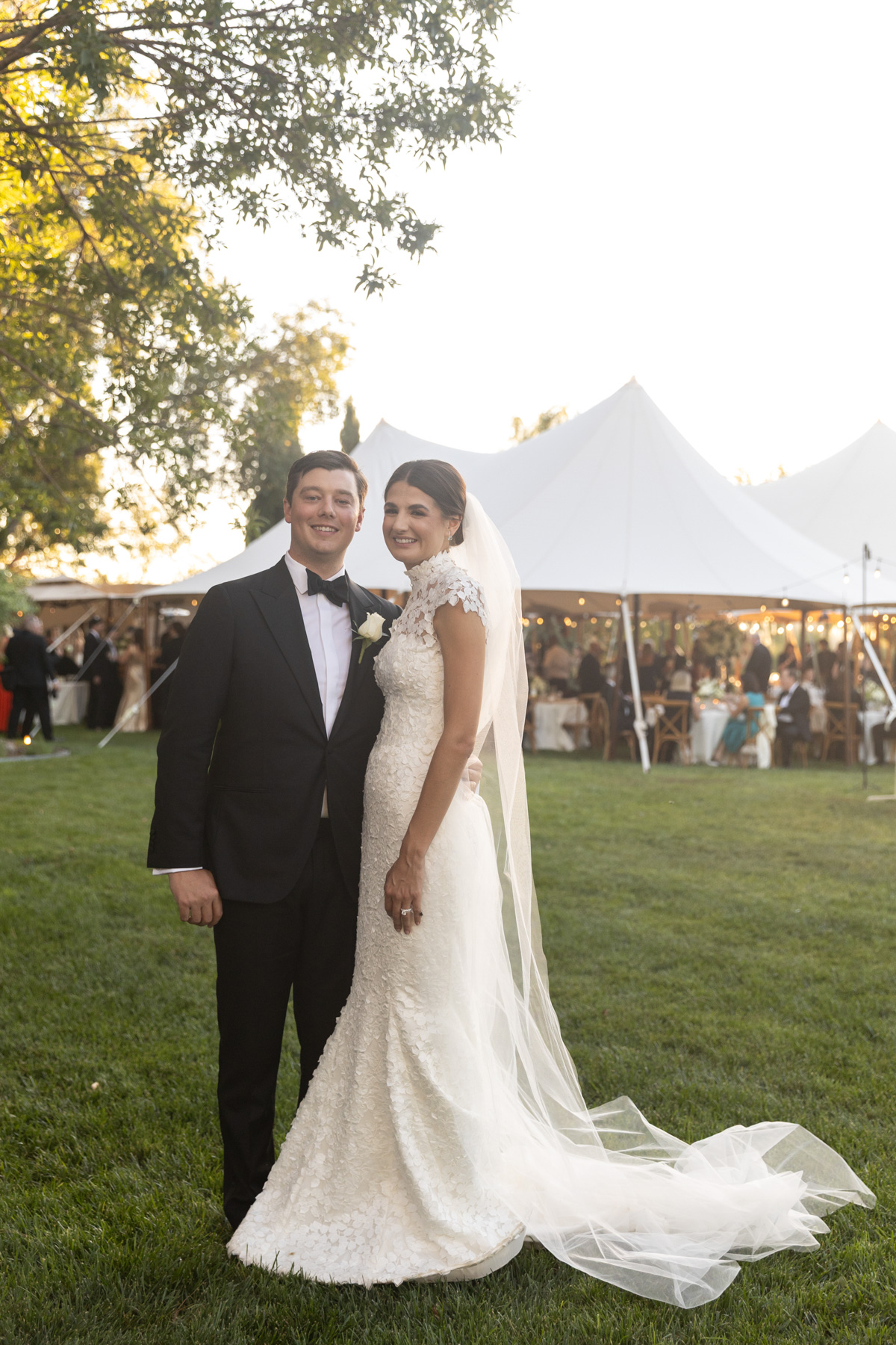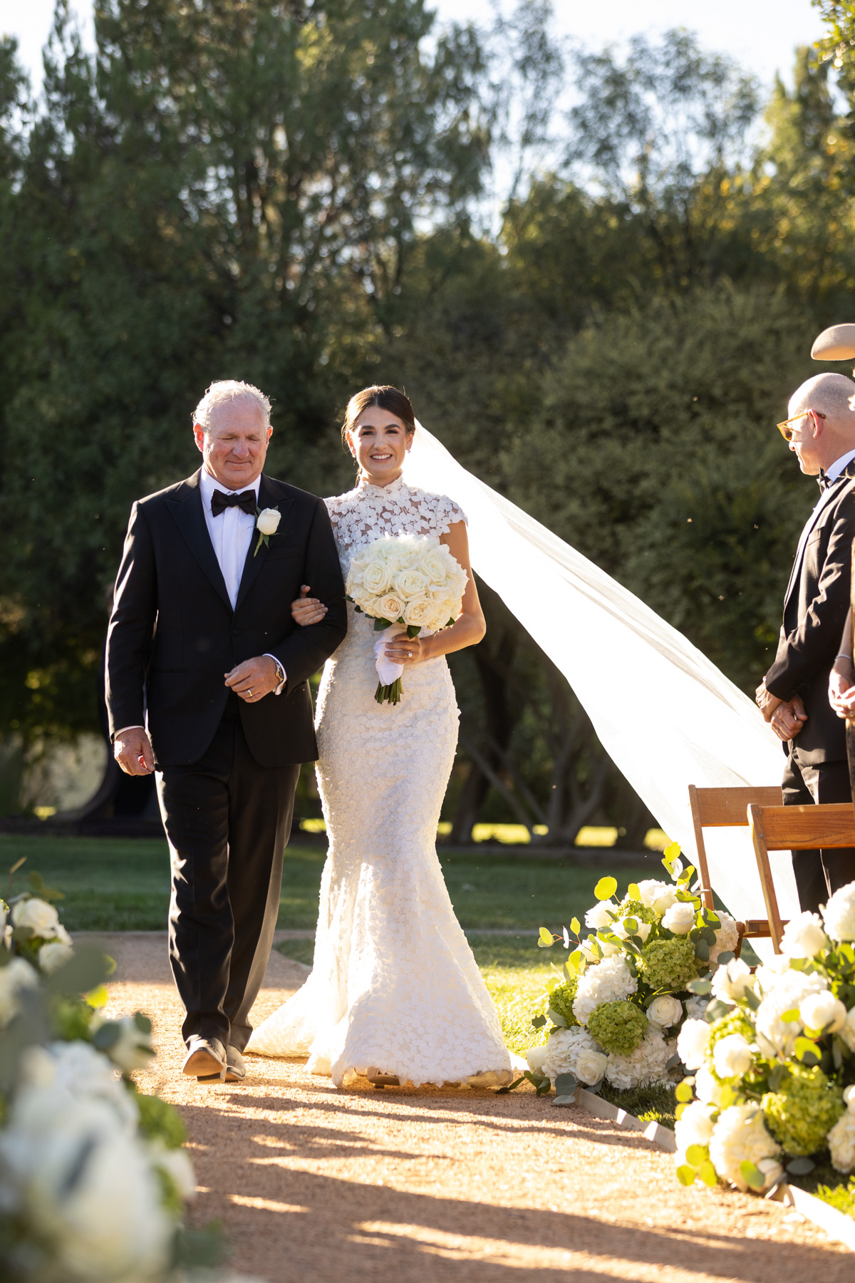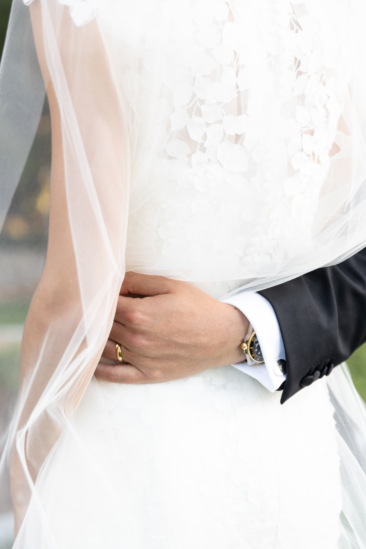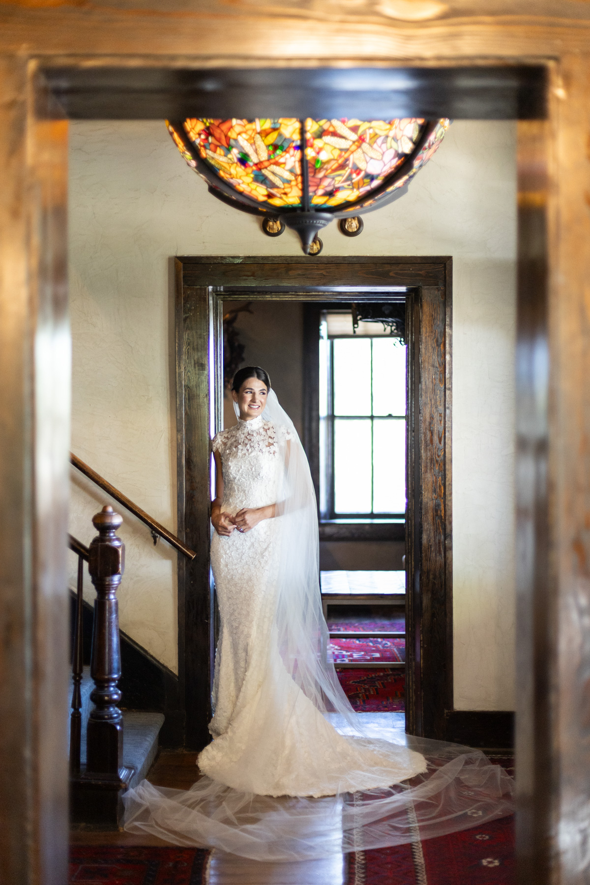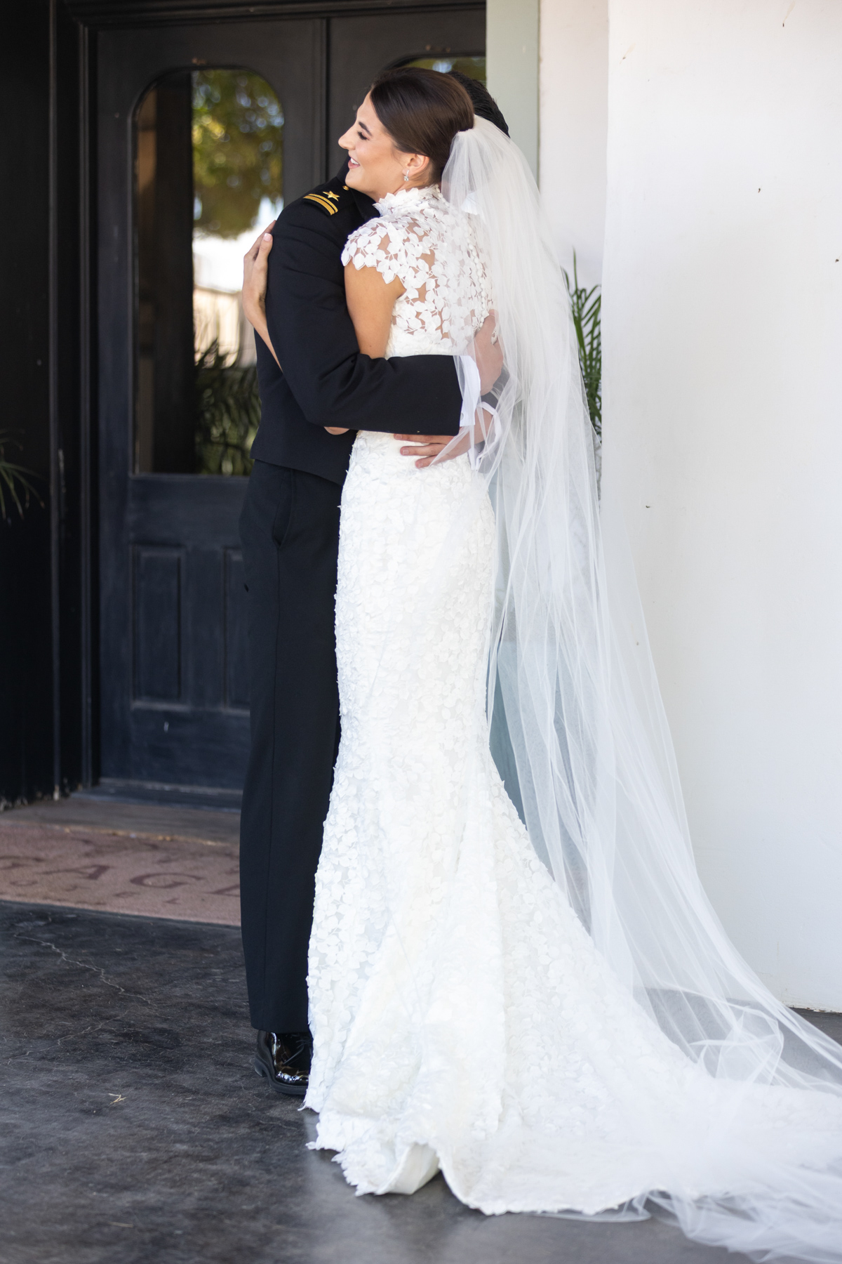 Avery’s gown reflected that same balance of classic and unexpected. She fell in love with a more detailed silhouette: elevated by a lace bolero with cap sleeves that transformed the look entirely. Avery wore her grandmother’s aquamarine and diamond earrings. A handkerchief wrapped around her bouquet carried both her mother’s monogram and her own newly married one.