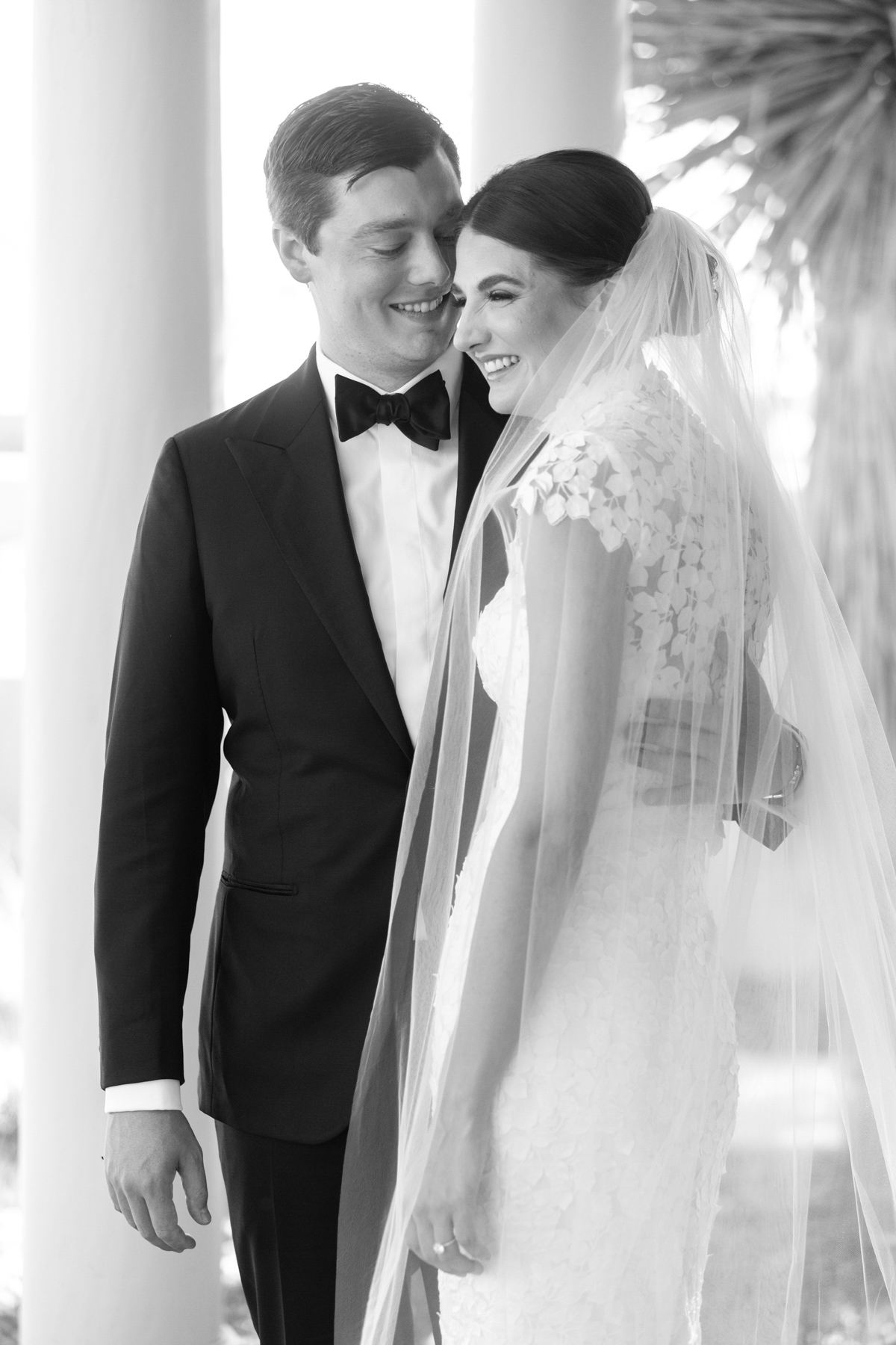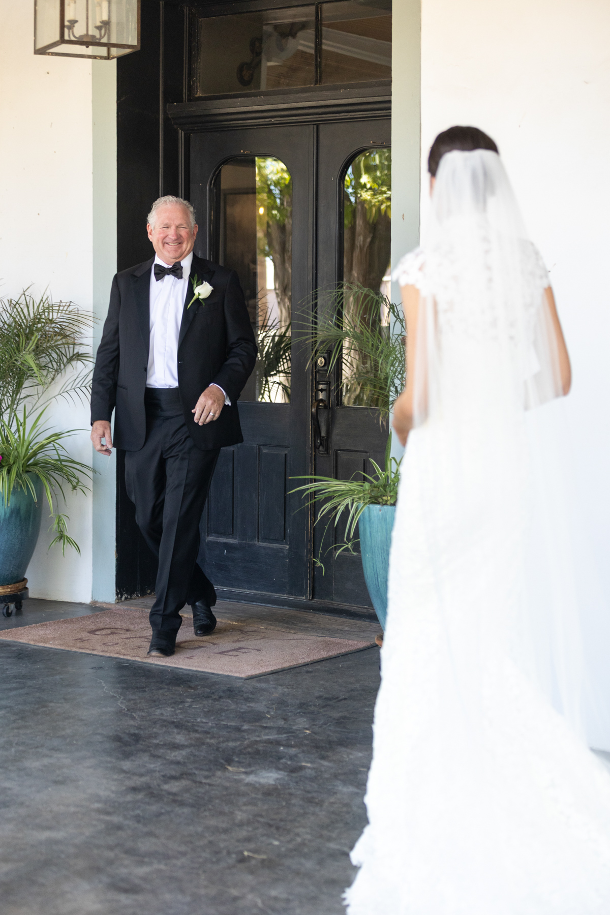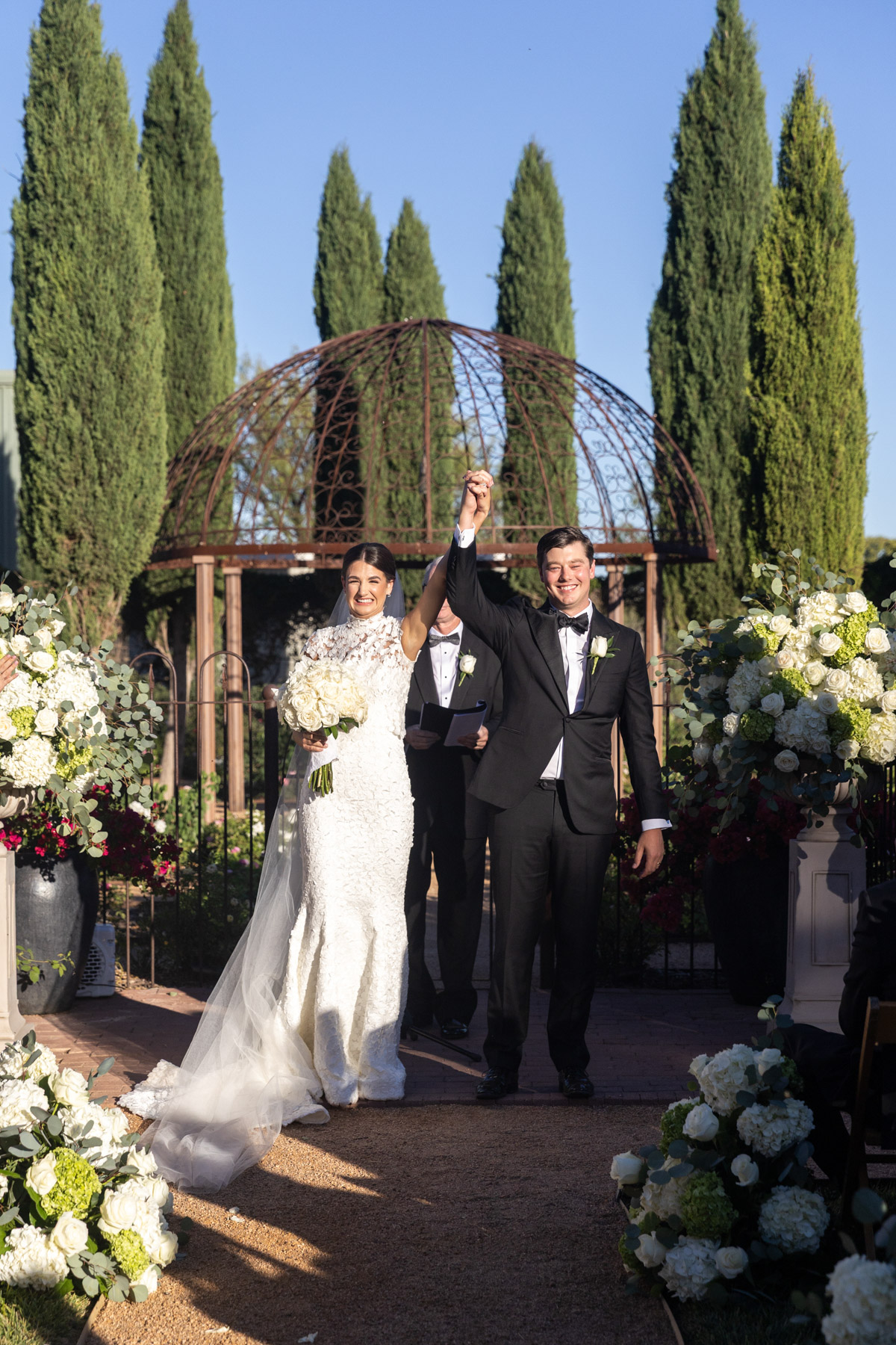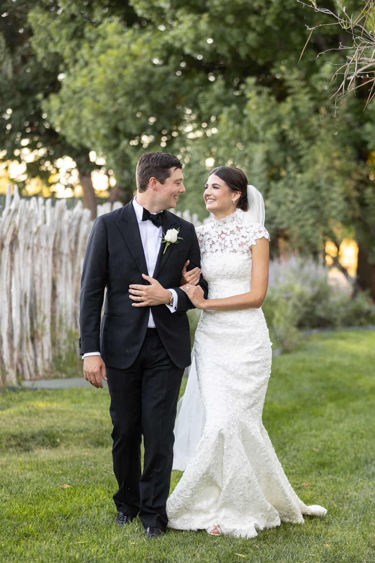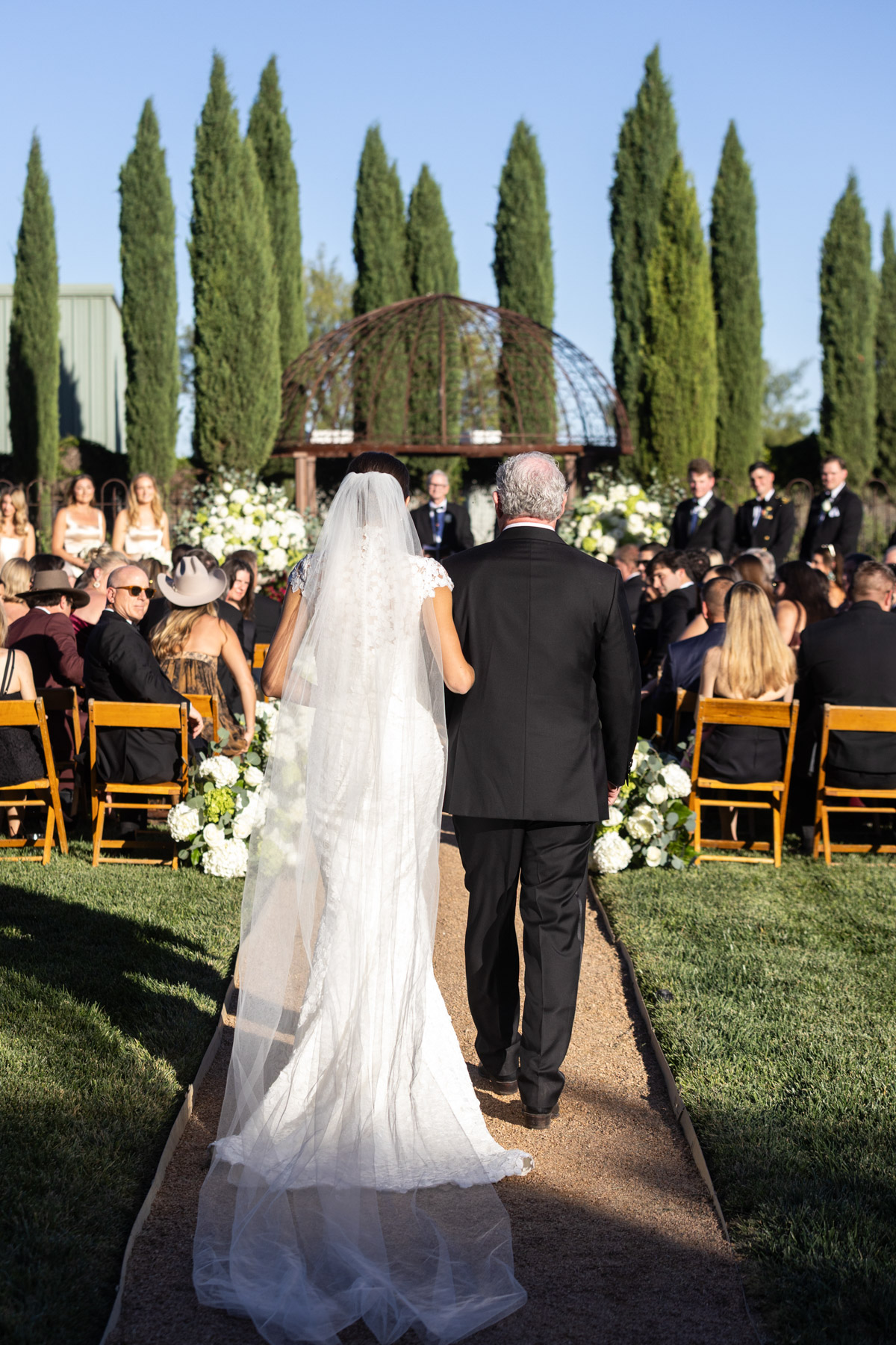 Avery’s gown reflected that same balance of classic and unexpected. She fell in love with a more detailed silhouette: elevated by a lace bolero with cap sleeves that transformed the look entirely. Avery wore her grandmother’s aquamarine and diamond earrings. A handkerchief wrapped around her bouquet carried both her mother’s monogram and her own newly married one.