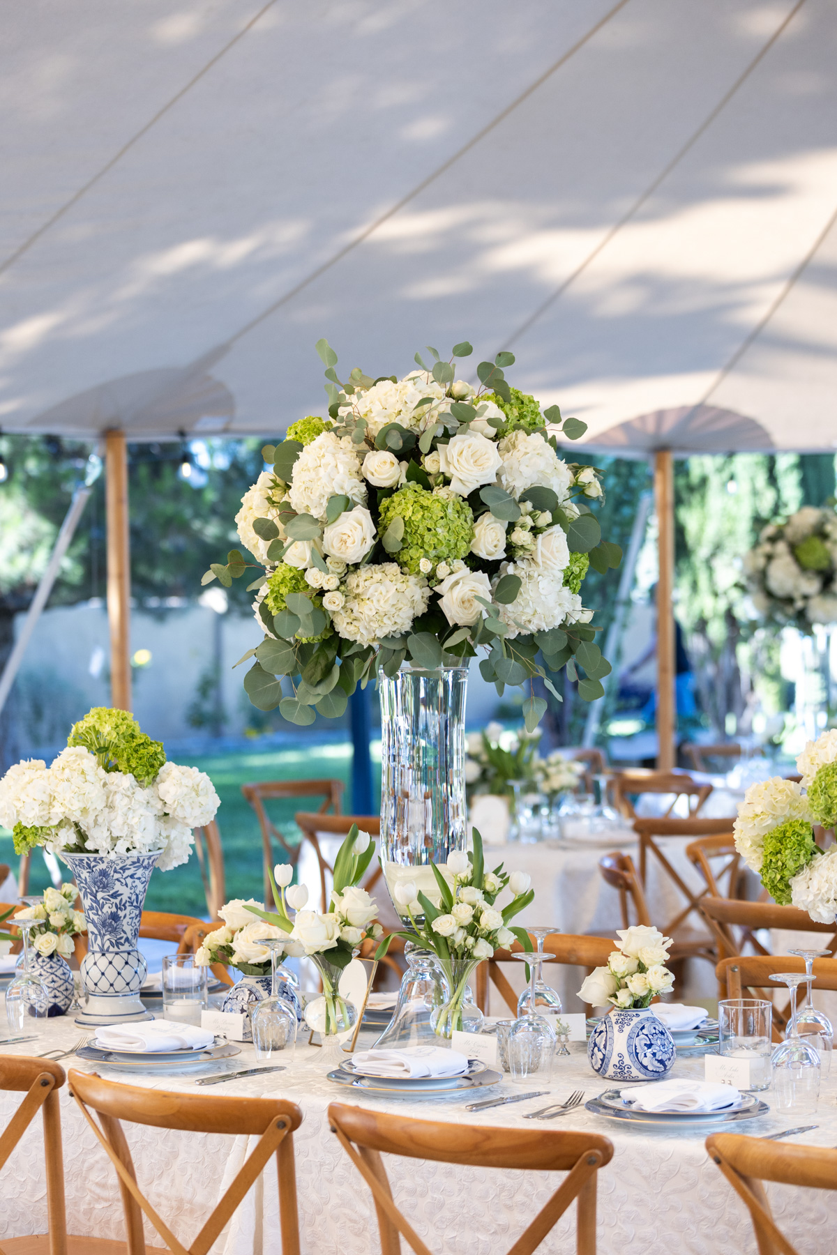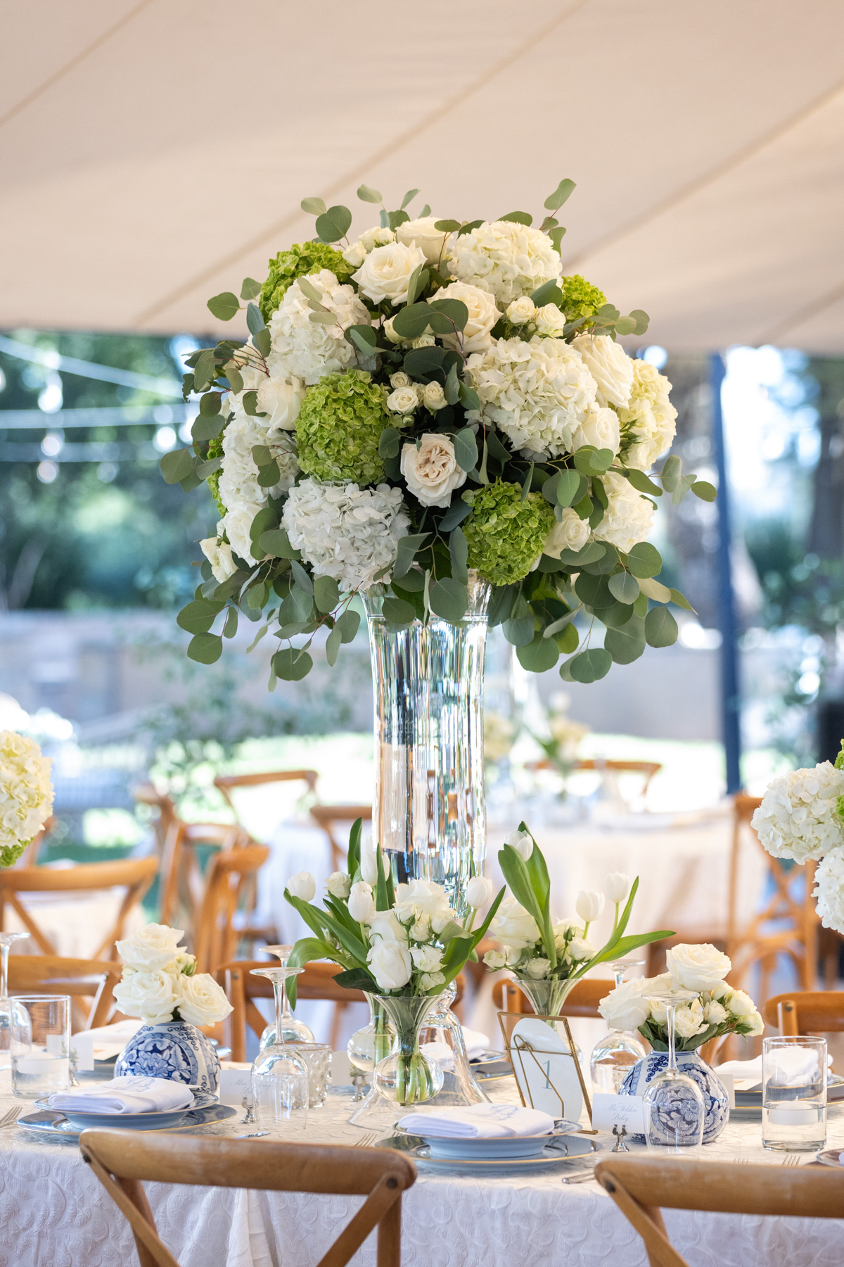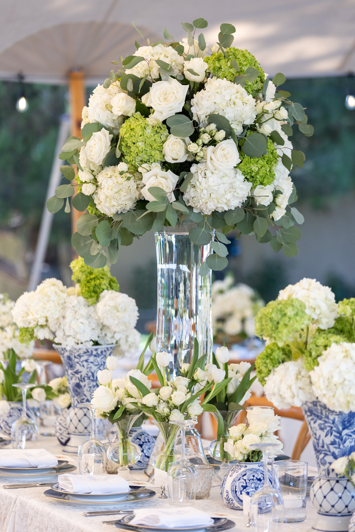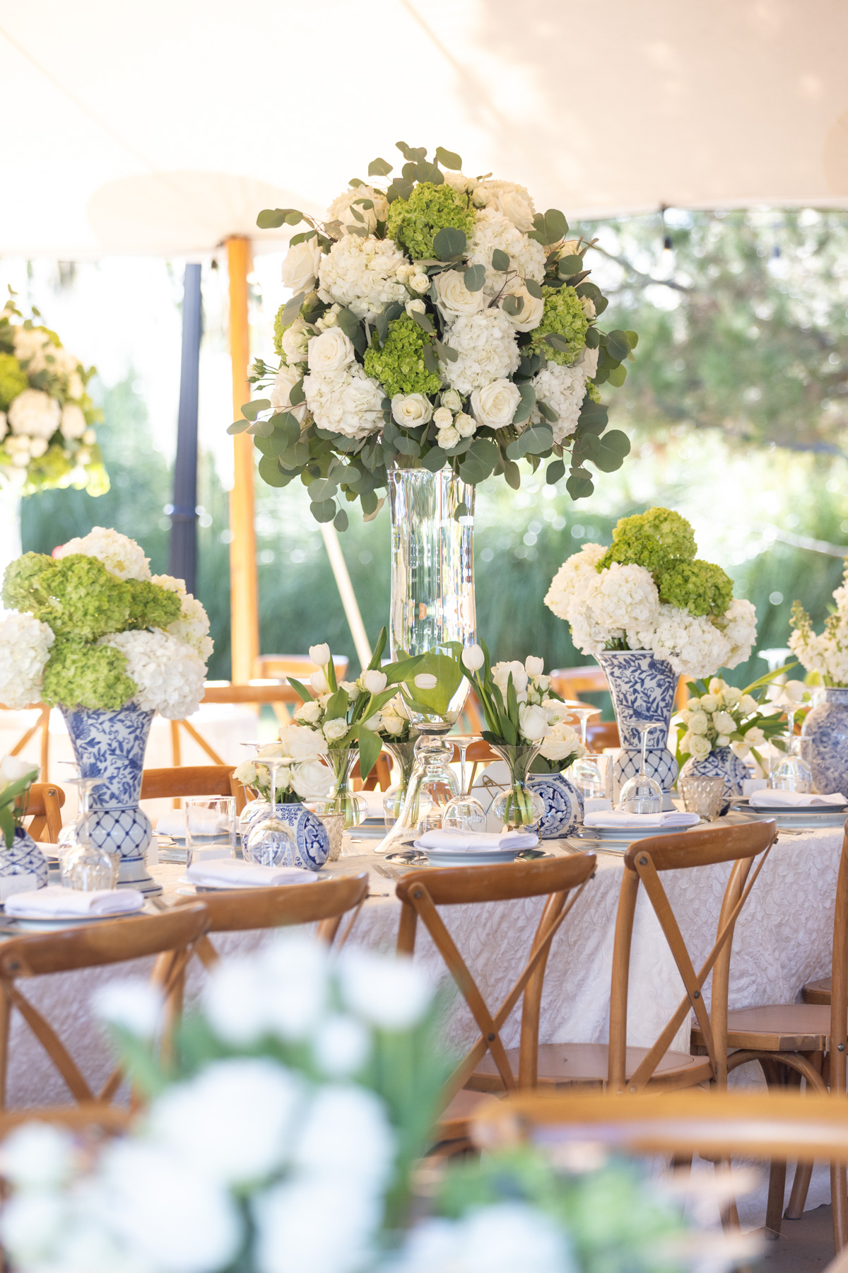 Avery’s taste leaned classic, and timeless. The floral palette centered on white blooms, particularly hydrangeas, layered with soft greenery to add depth without distraction. Blue-and-white chinoiserie appeared throughout the weekend, drawn directly from her mother’s own collection. At the head table, Avery’s parents’ wedding china was used once again, quietly tying generations together.
