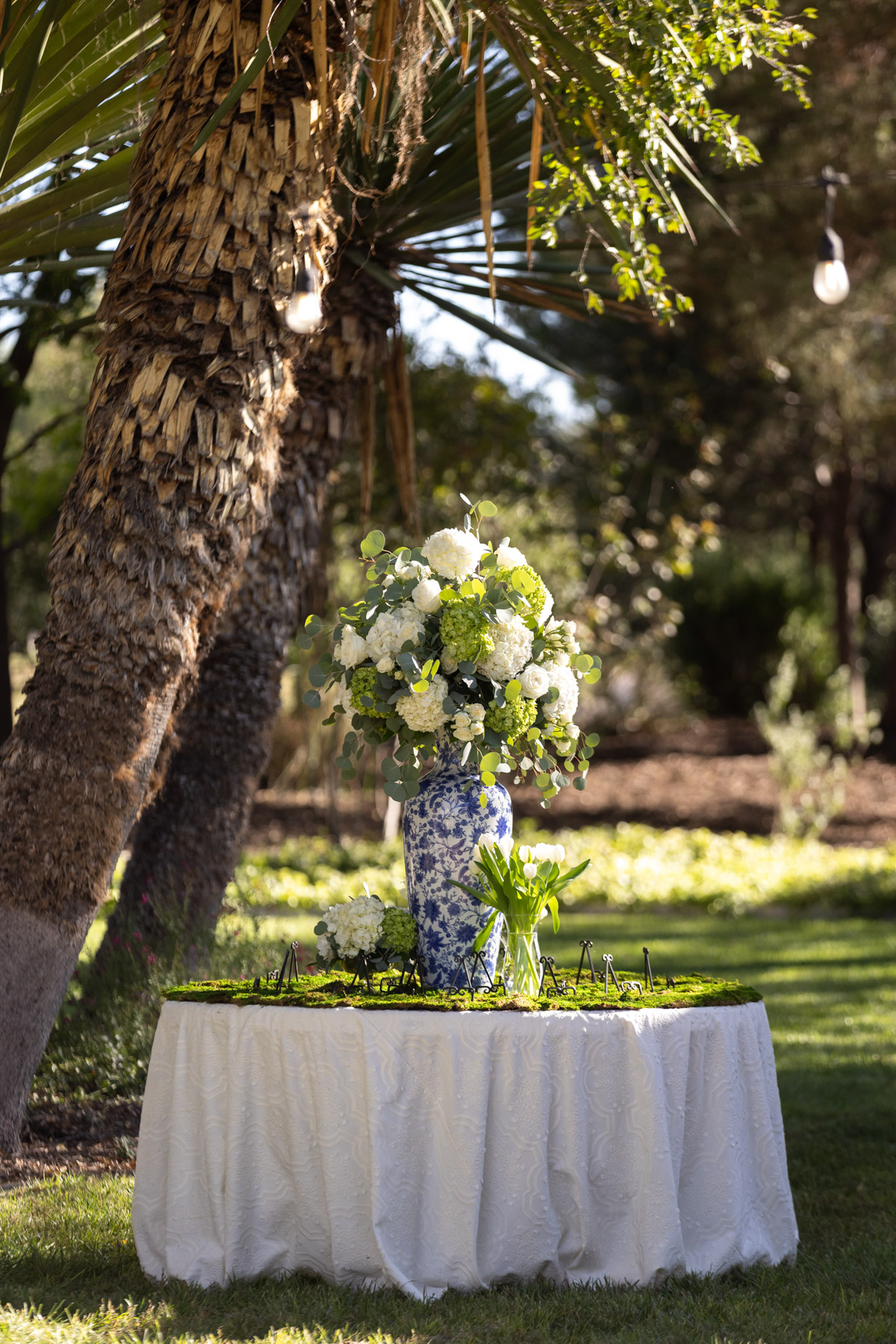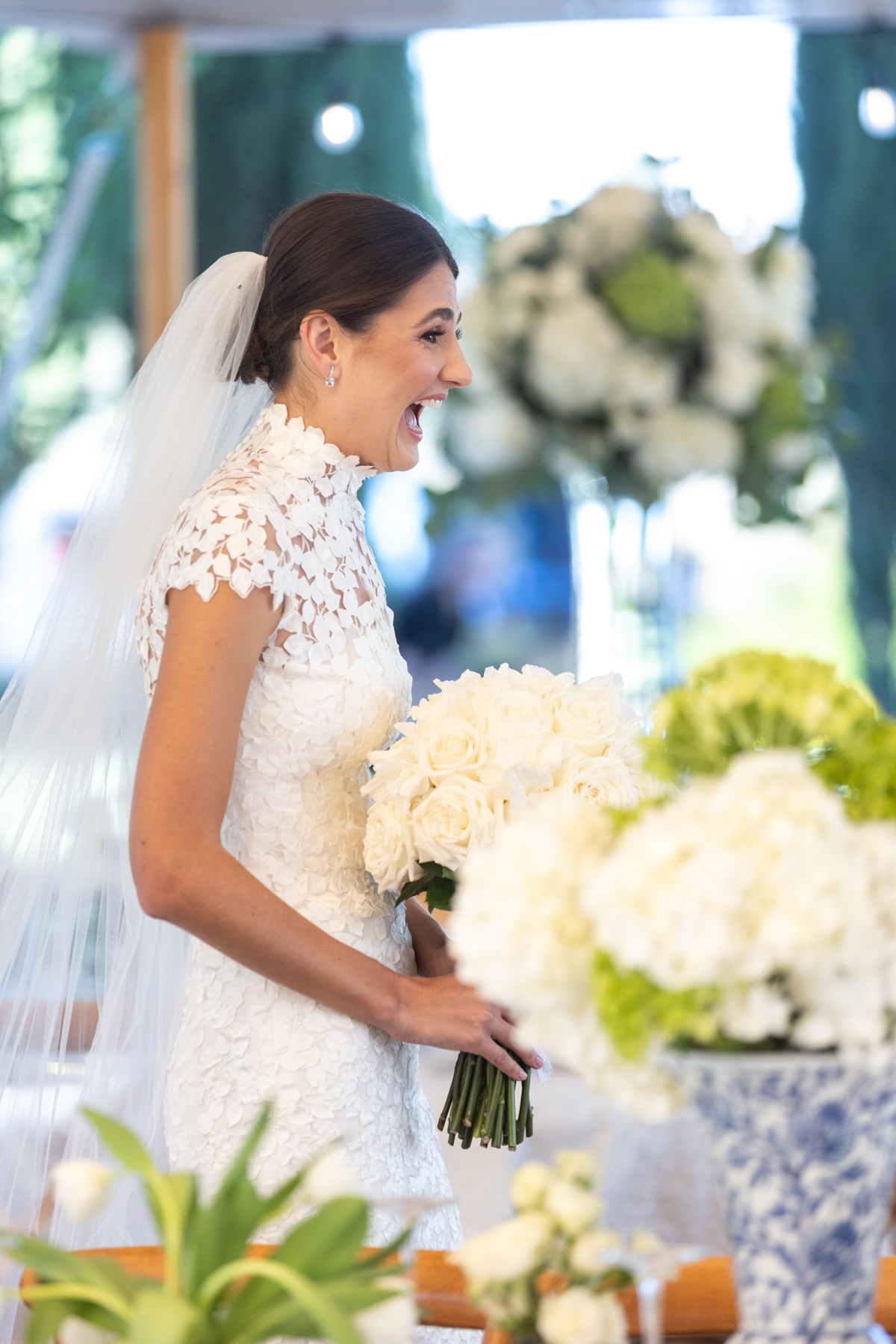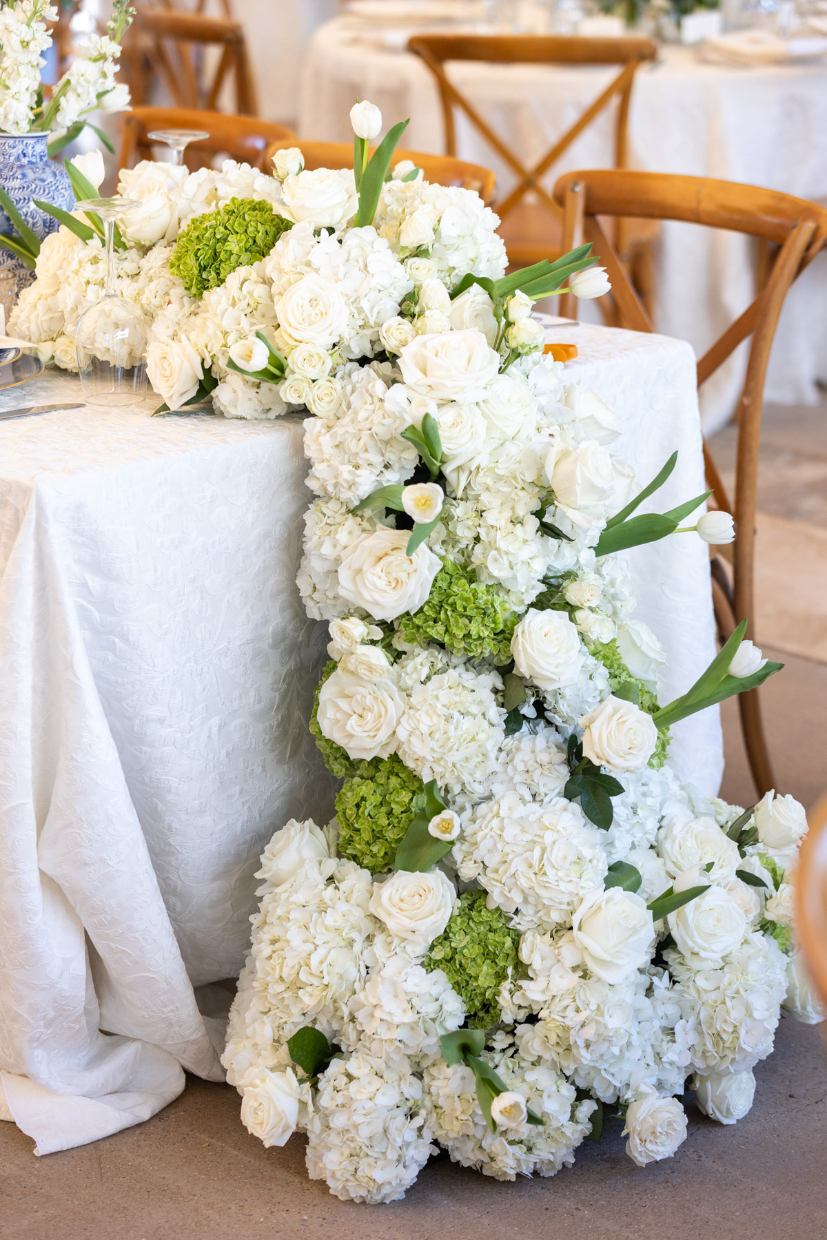 Avery’s taste leaned classic, and timeless. The floral palette centered on white blooms, particularly hydrangeas, layered with soft greenery to add depth without distraction. Blue-and-white chinoiserie appeared throughout the weekend, drawn directly from her mother’s own collection. At the head table, Avery’s parents’ wedding china was used once again, quietly tying generations together.