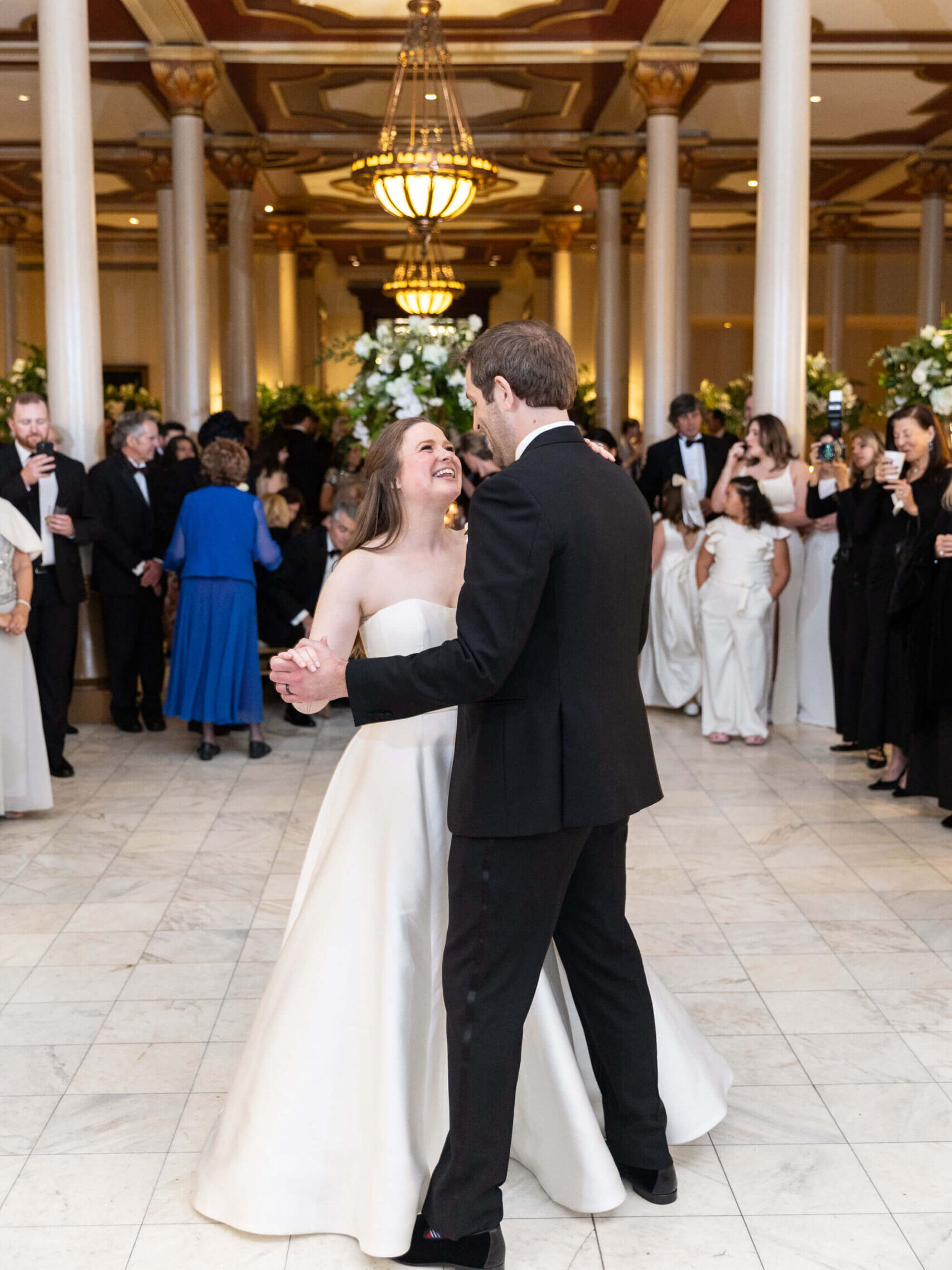 Even the reception venue was sentimental. Held at the Driskill Hotel, it’s where Andrew first told Cate he loved her while they were attending another friend’s wedding. The dark wood, marble accents and candlelight brought Cate’s vision of a romantic celebration to life. She wore a strapless satin gown with a sheer floral overlay, with her “something blue” embroidered inside, a patch from the dress she wore to her sister’s wedding years ago. Her “something old” was her great-grandmother’s watch, and her “something borrowed” was her sister’s handkerchief.