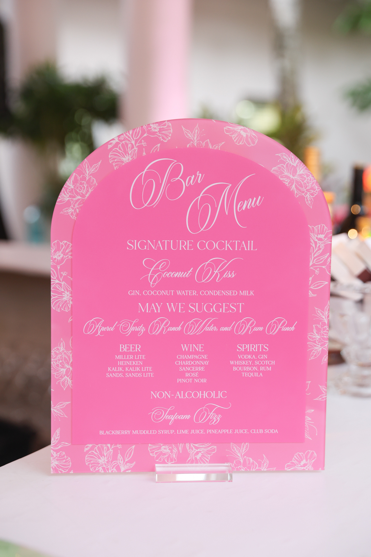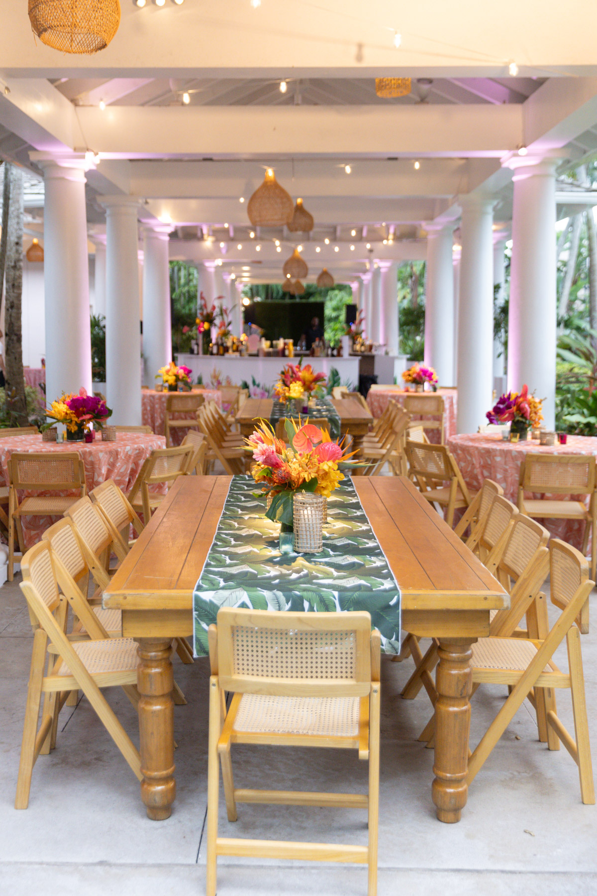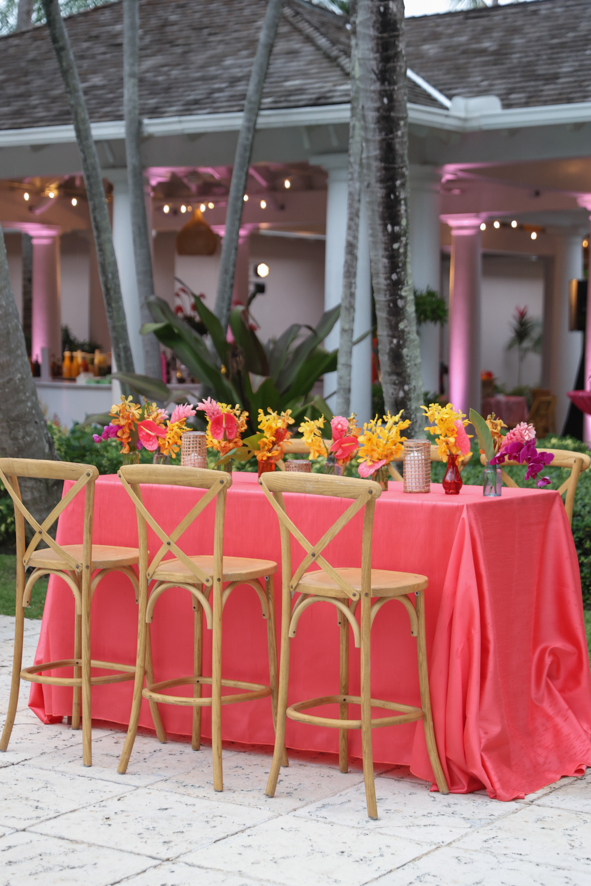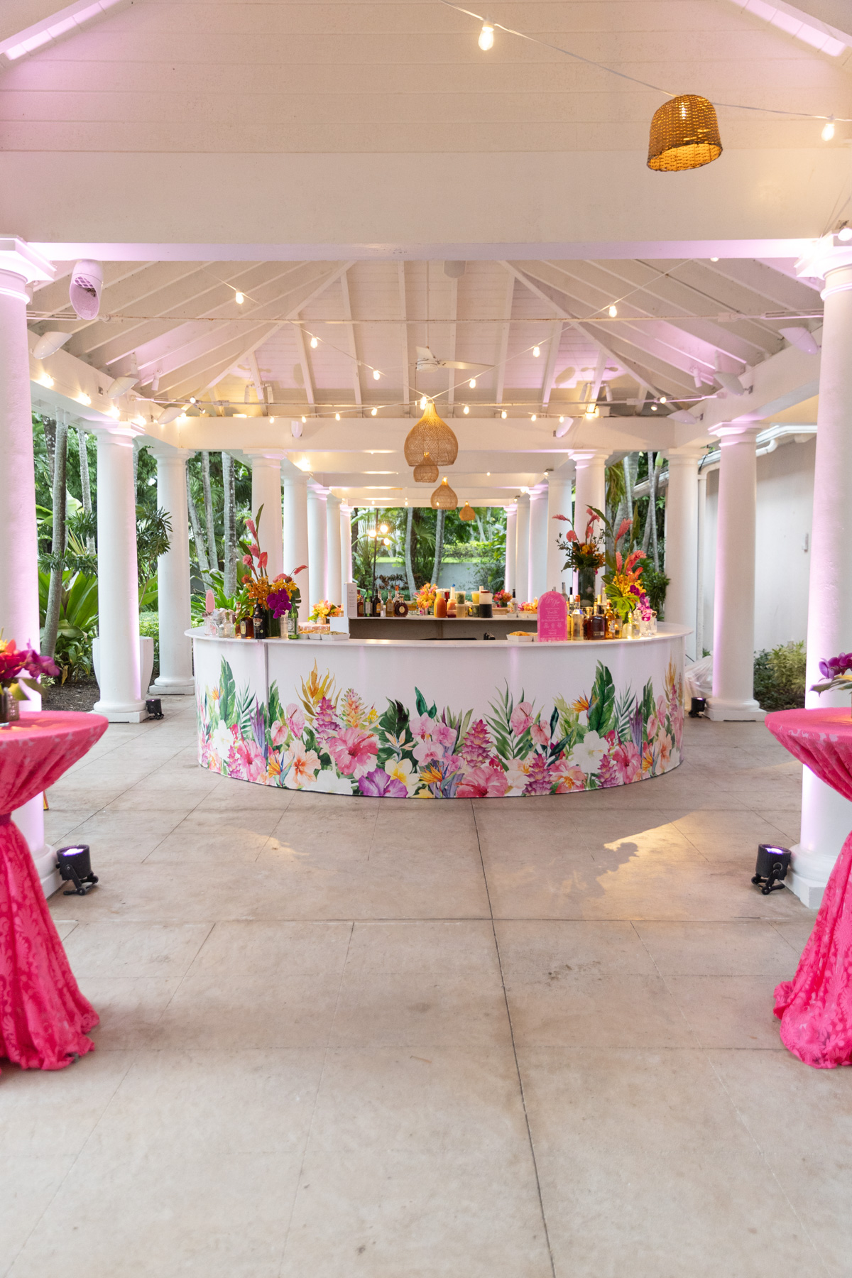 Layers of pink wove through the design, from vibrant tropical florals to softly glowing details that mirrored the warmth of the island setting. A statement floral-wrapped bar became an instant focal point, blending seamlessly into the lush surroundings while setting the tone for the celebration ahead. Thoughtful details, from engraved coconuts and custom matchboxes to curated welcome gift boxes and personalized stir sticks featuring their dog, layered the celebration with touches that honored both the destination and their story.