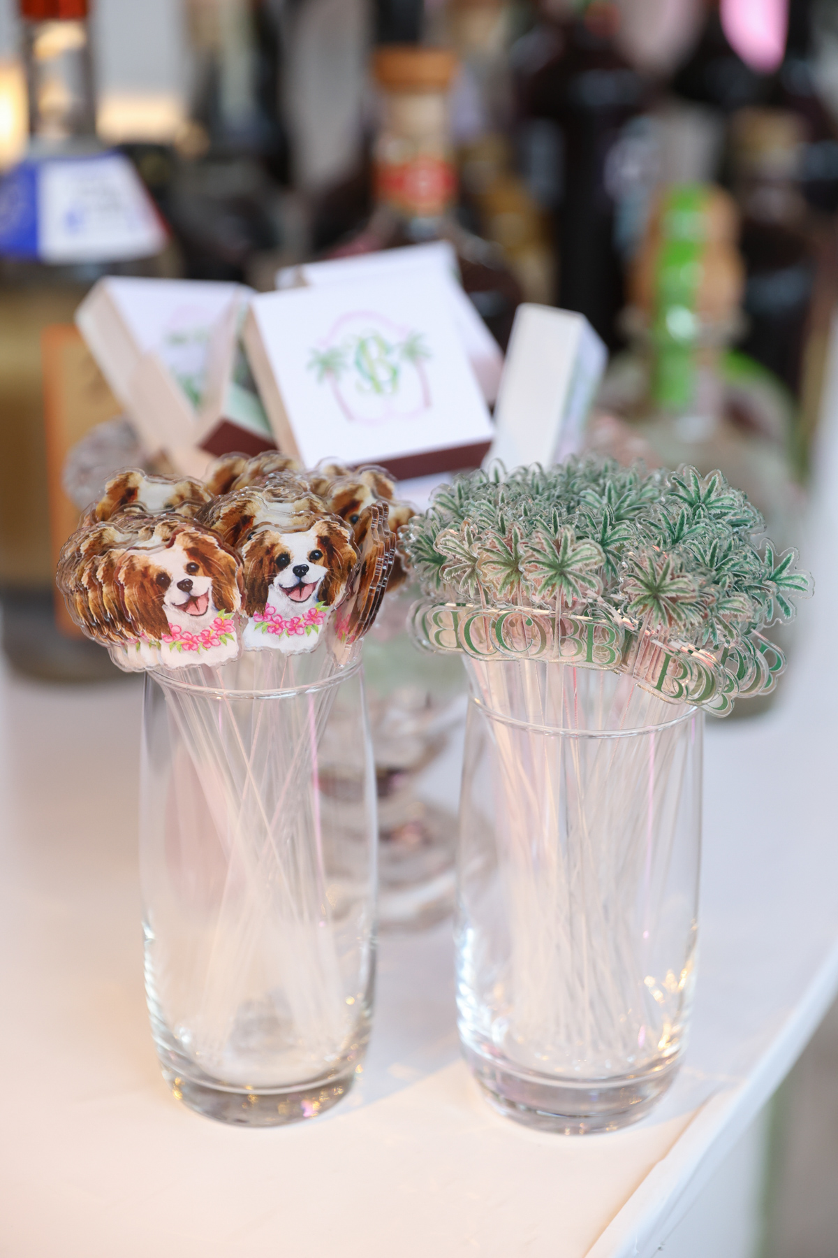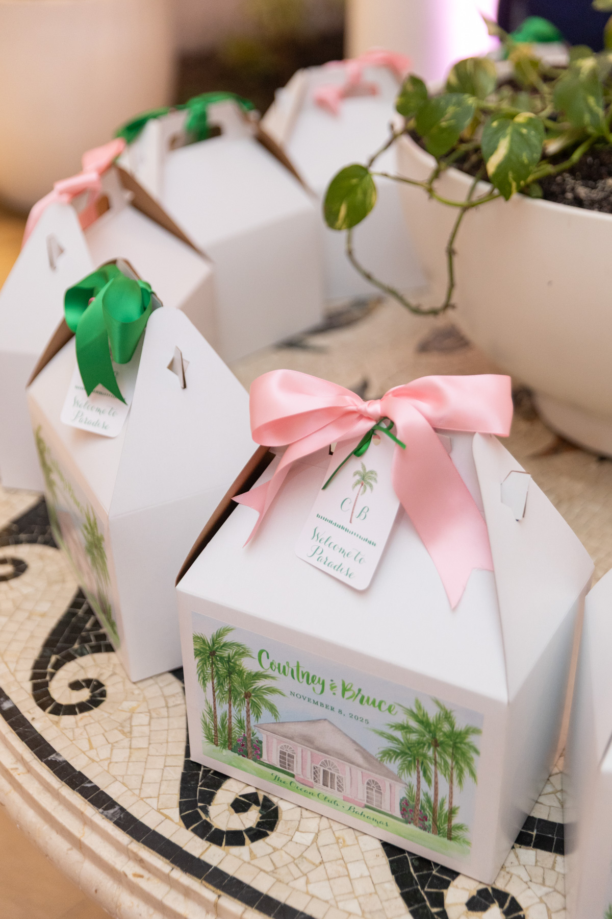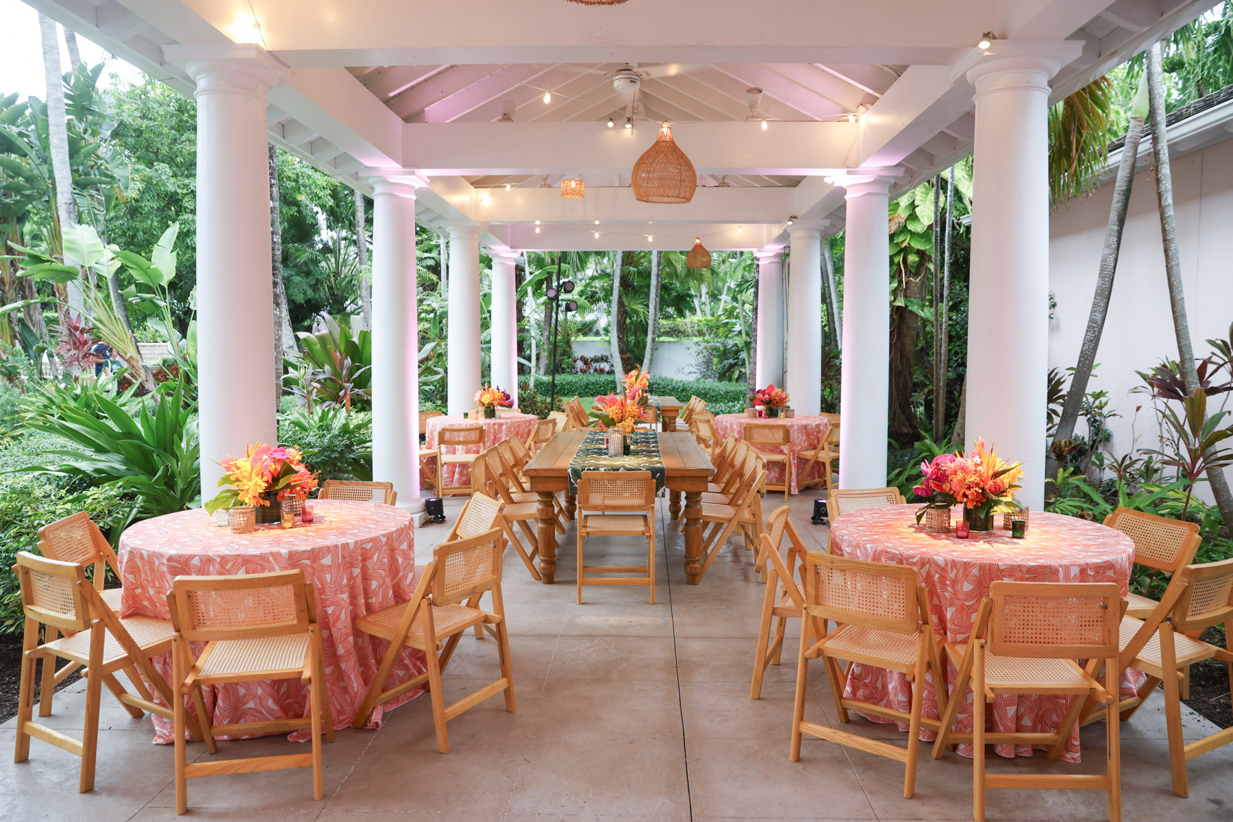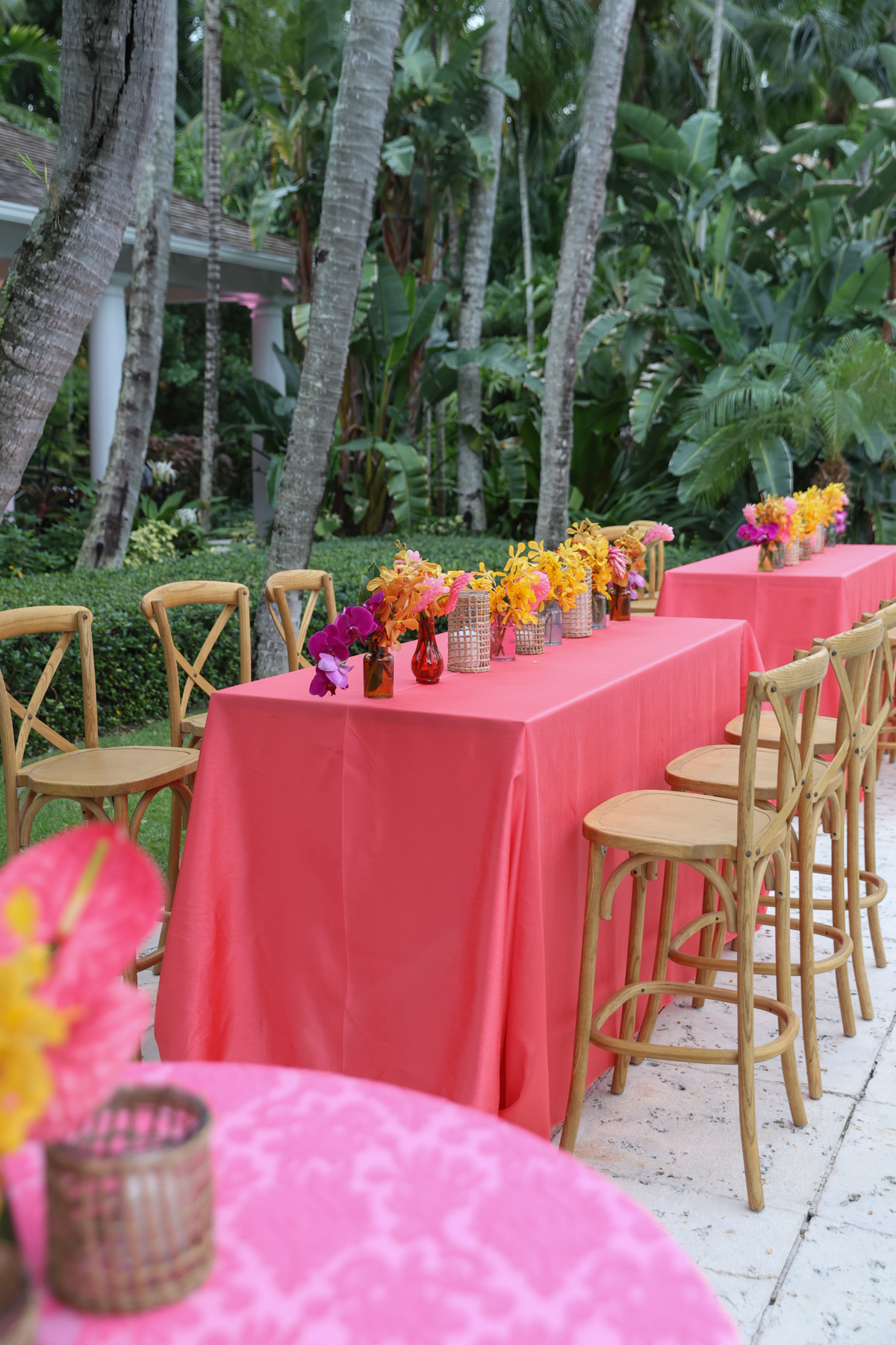 Layers of pink wove through the design, from vibrant tropical florals to softly glowing details that mirrored the warmth of the island setting. A statement floral-wrapped bar became an instant focal point, blending seamlessly into the lush surroundings while setting the tone for the celebration ahead. Thoughtful details, from engraved coconuts and custom matchboxes to curated welcome gift boxes and personalized stir sticks featuring their dog, layered the celebration with touches that honored both the destination and their story.