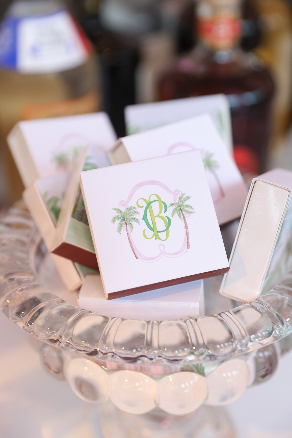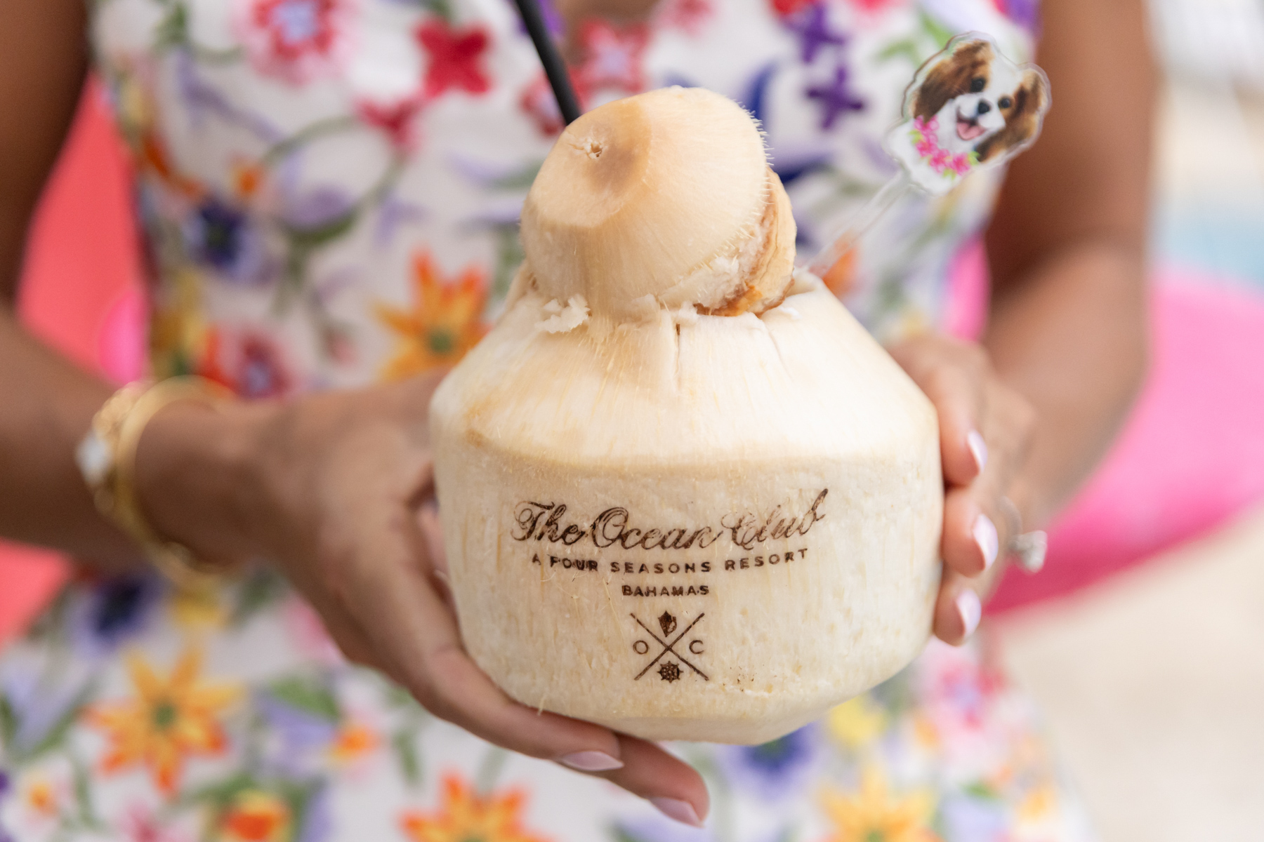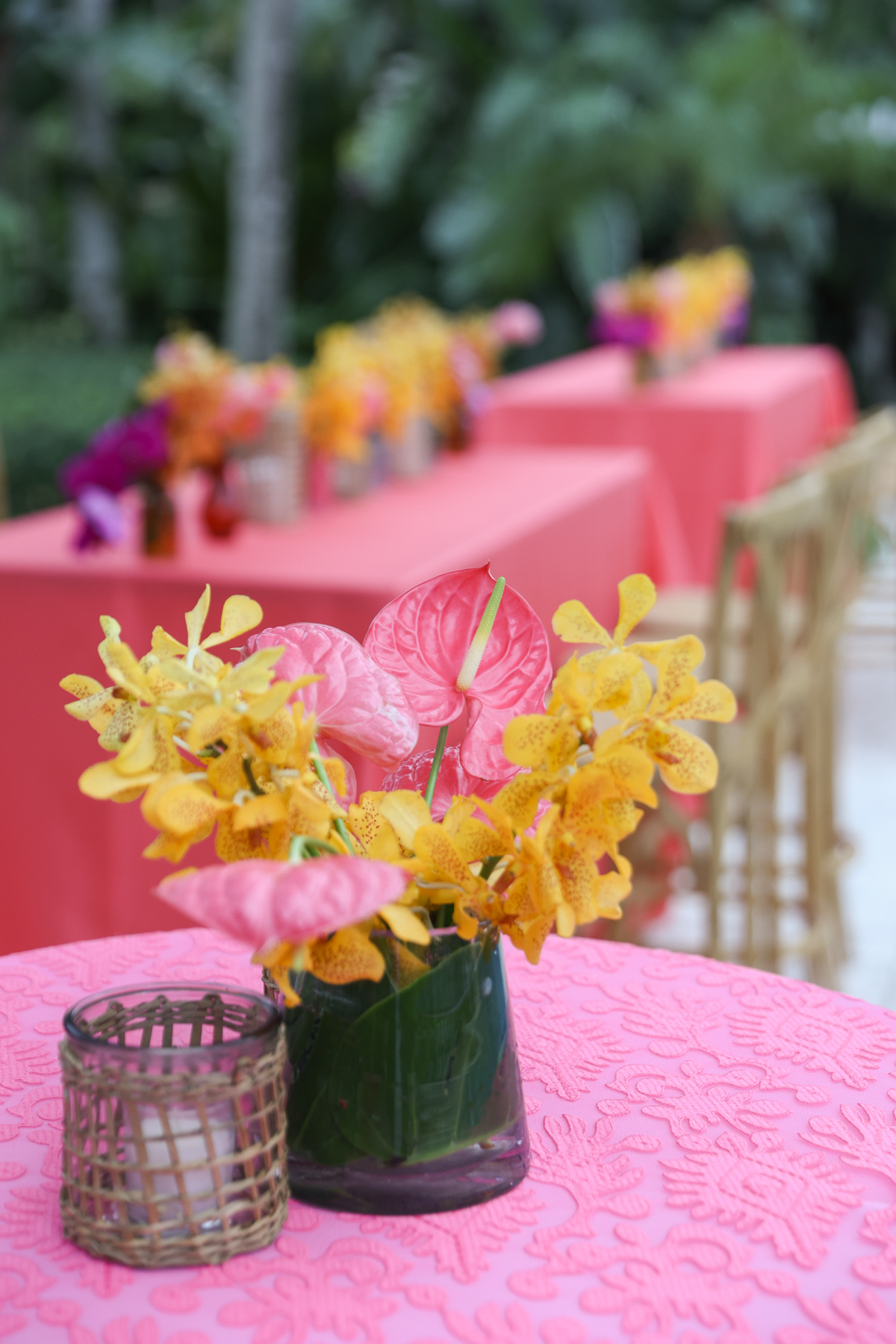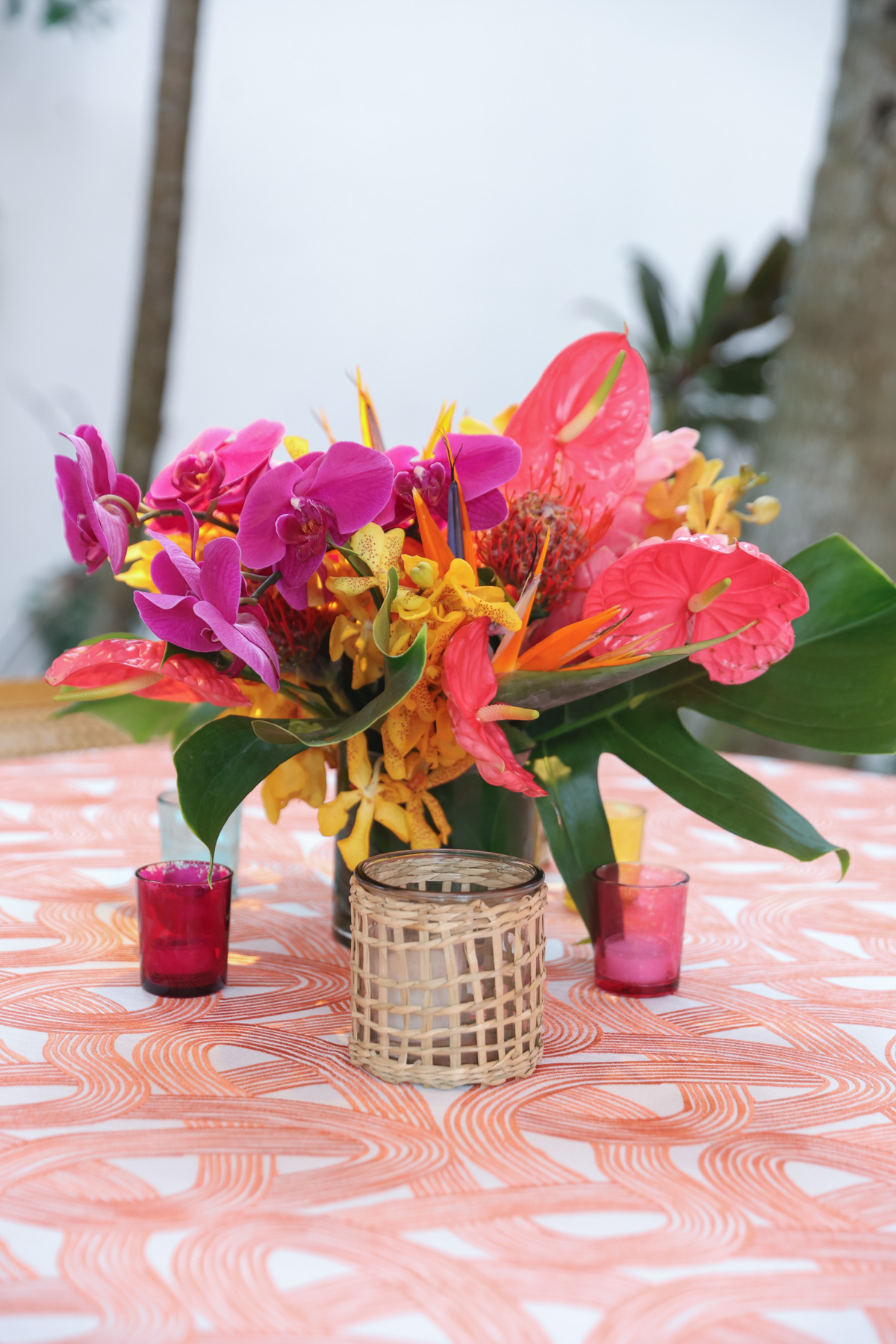 Layers of pink wove through the design, from vibrant tropical florals to softly glowing details that mirrored the warmth of the island setting. A statement floral-wrapped bar became an instant focal point, blending seamlessly into the lush surroundings while setting the tone for the celebration ahead. Thoughtful details, from engraved coconuts and custom matchboxes to curated welcome gift boxes and personalized stir sticks featuring their dog, layered the celebration with touches that honored both the destination and their story.