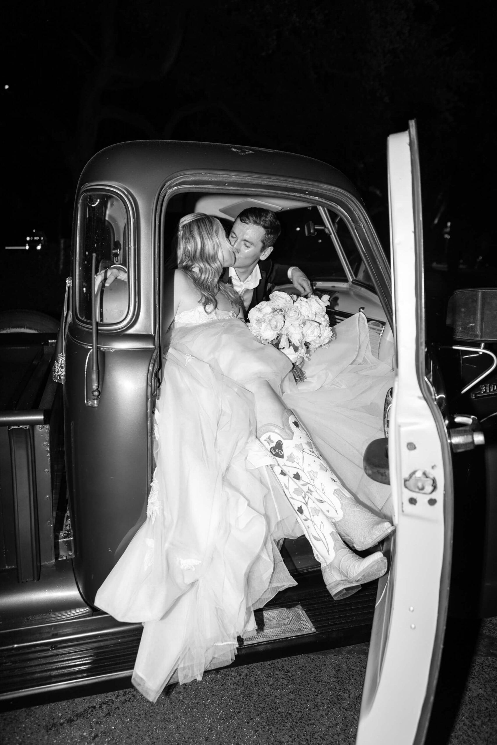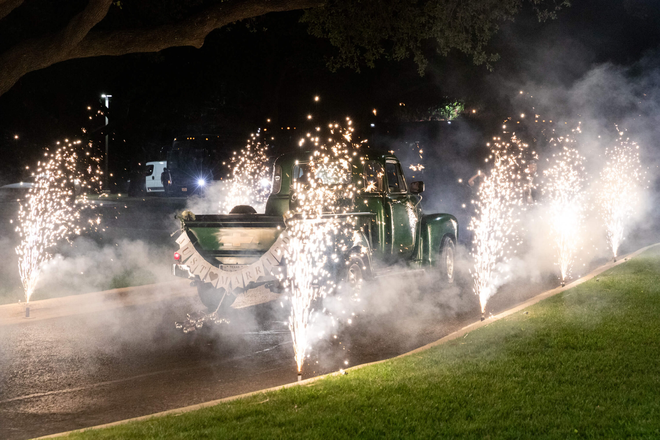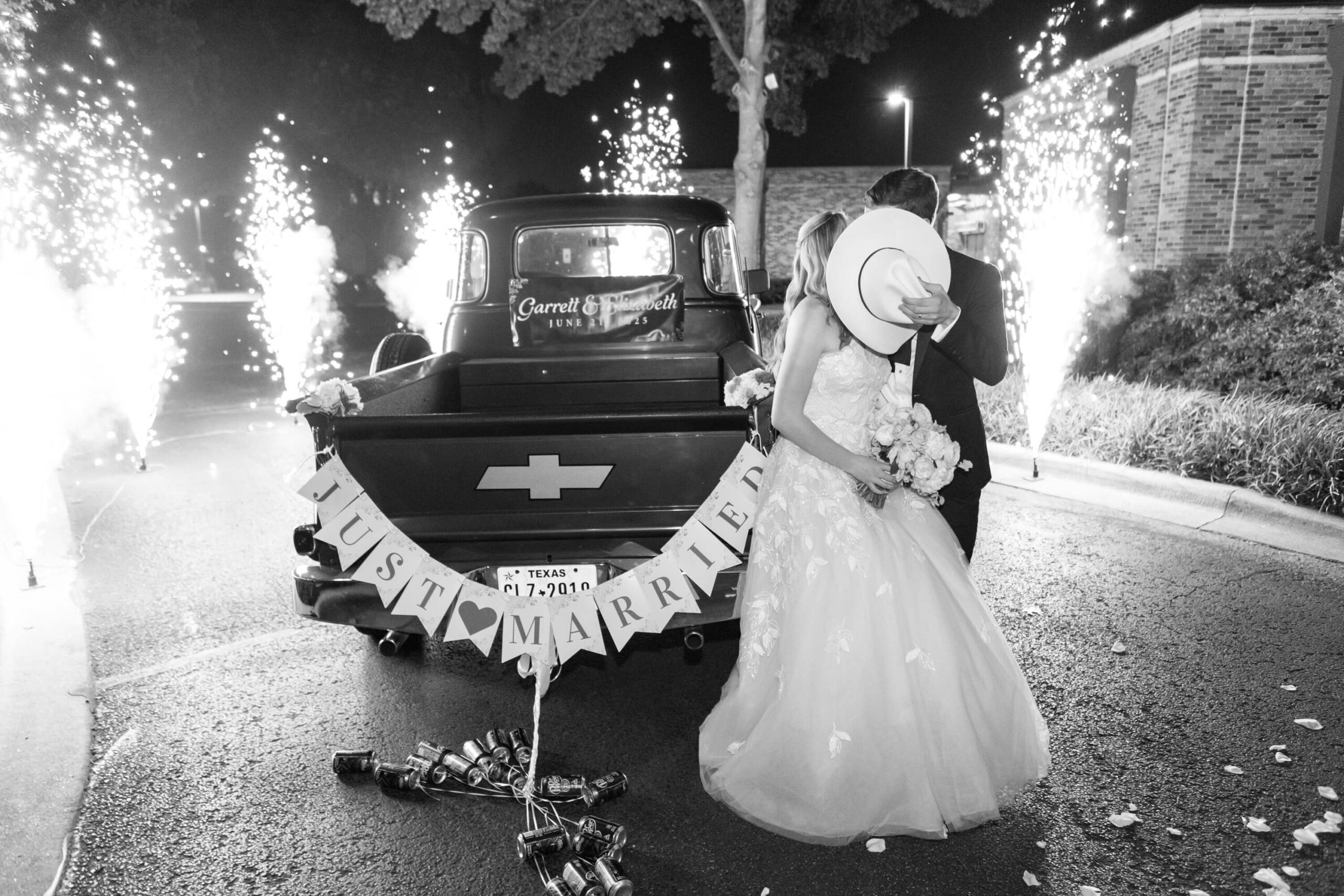 As the sun set on the summer solstice, Elizabeth and Garrett stepped away for golden hour portraits, taking in a quiet moment before their grand exit. Waiting for them was Garrett’s grandfather’s dark green 1950s Chevrolet pickup truck: a vehicle he had grown up helping restore, brought to Dallas on a transport truck just for the occasion. It was the perfect sendoff to a day filled with sentiment, style, and the kind of personal touches that made their wedding feel entirely, beautifully their own.