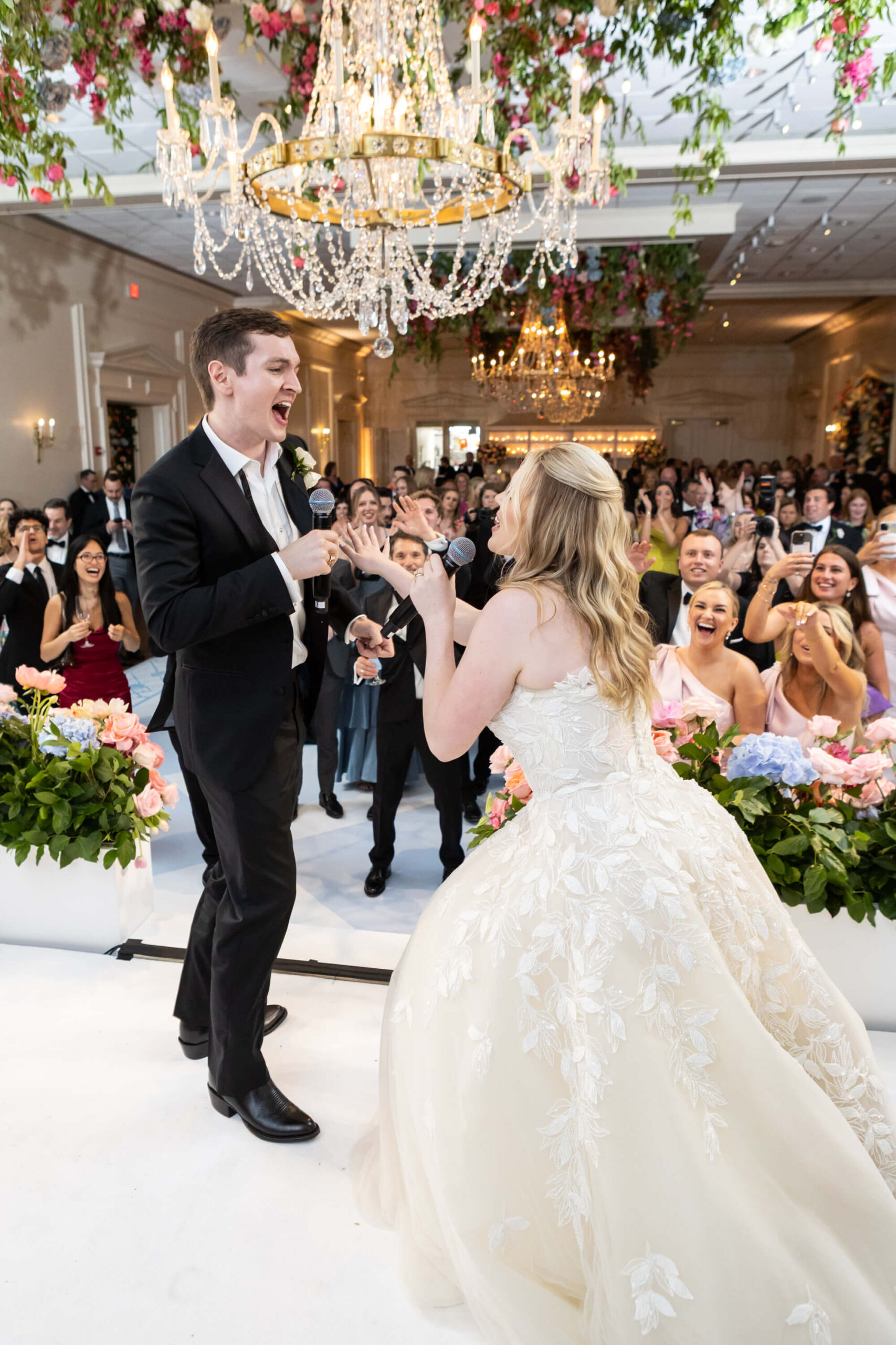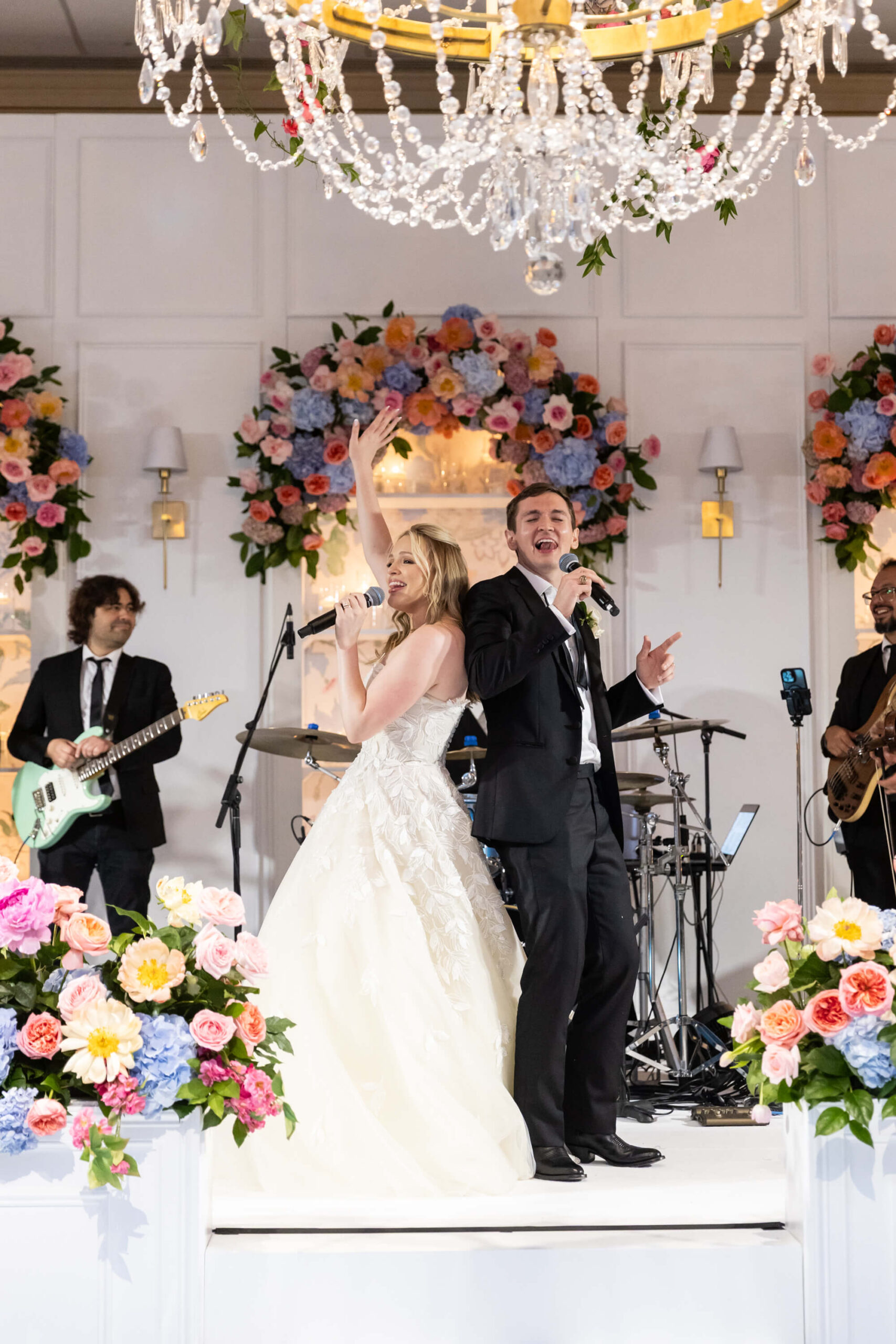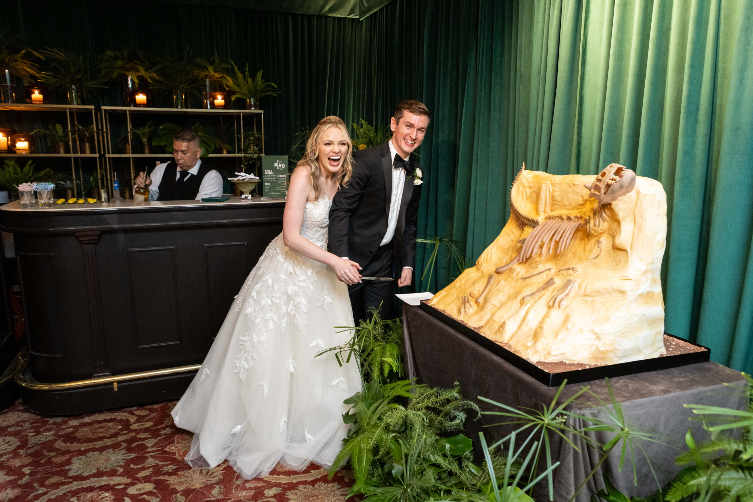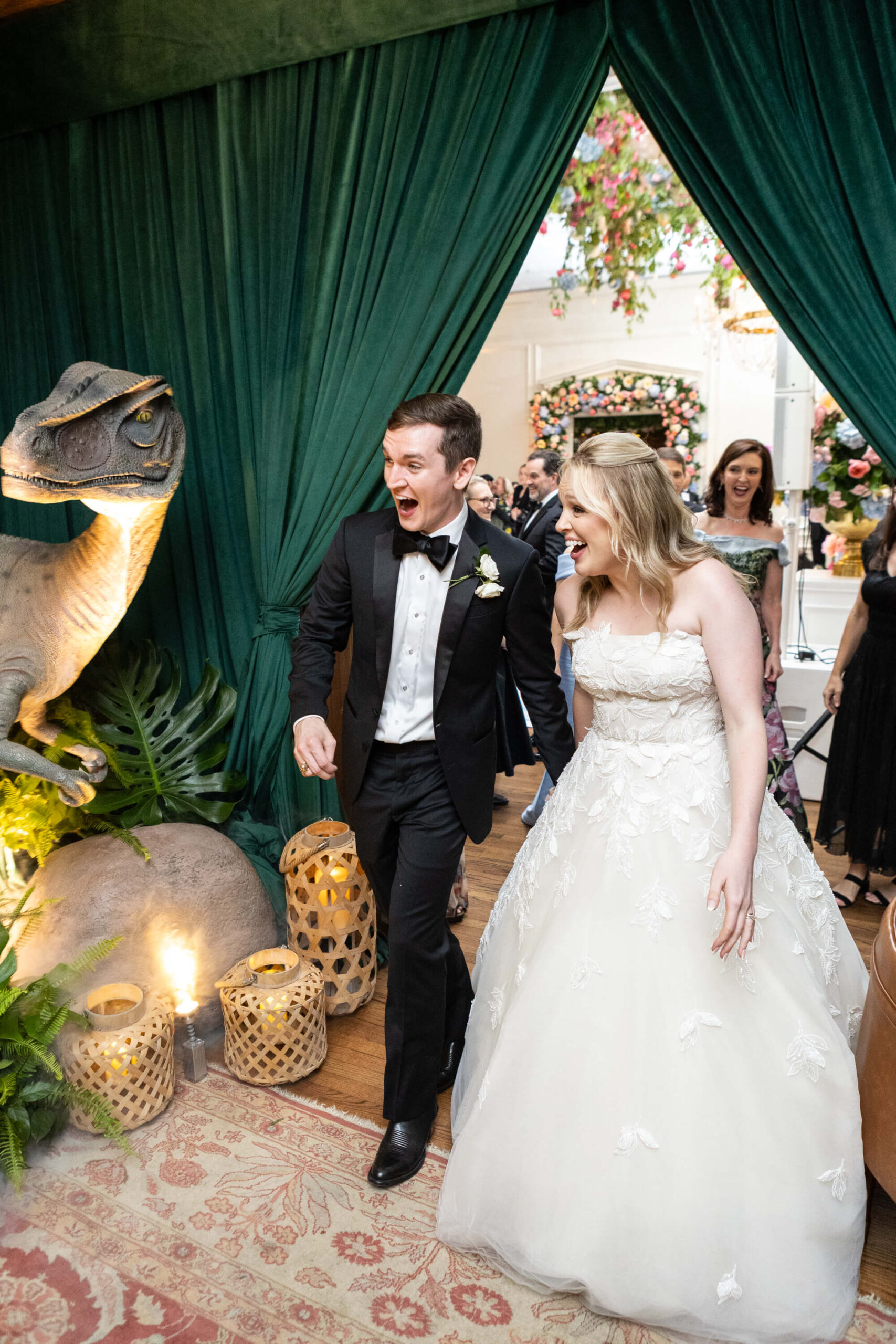 The groom’s surprise “Dino Den” was a true showstopper: complete with tropical plants, a fog machine, themed cocktails, and a towering dinosaur cake. It was a playful tribute to Garrett’s lifelong love of dinosaurs and a moment of pure joy for the couple and their guests. Another highlight of the evening came when Elizabeth and Garrett took the stage for a surprise duet of “Guilty” by Barbra Streisand and Barry Gibb: an unexpected performance and a favorite memory for many.
