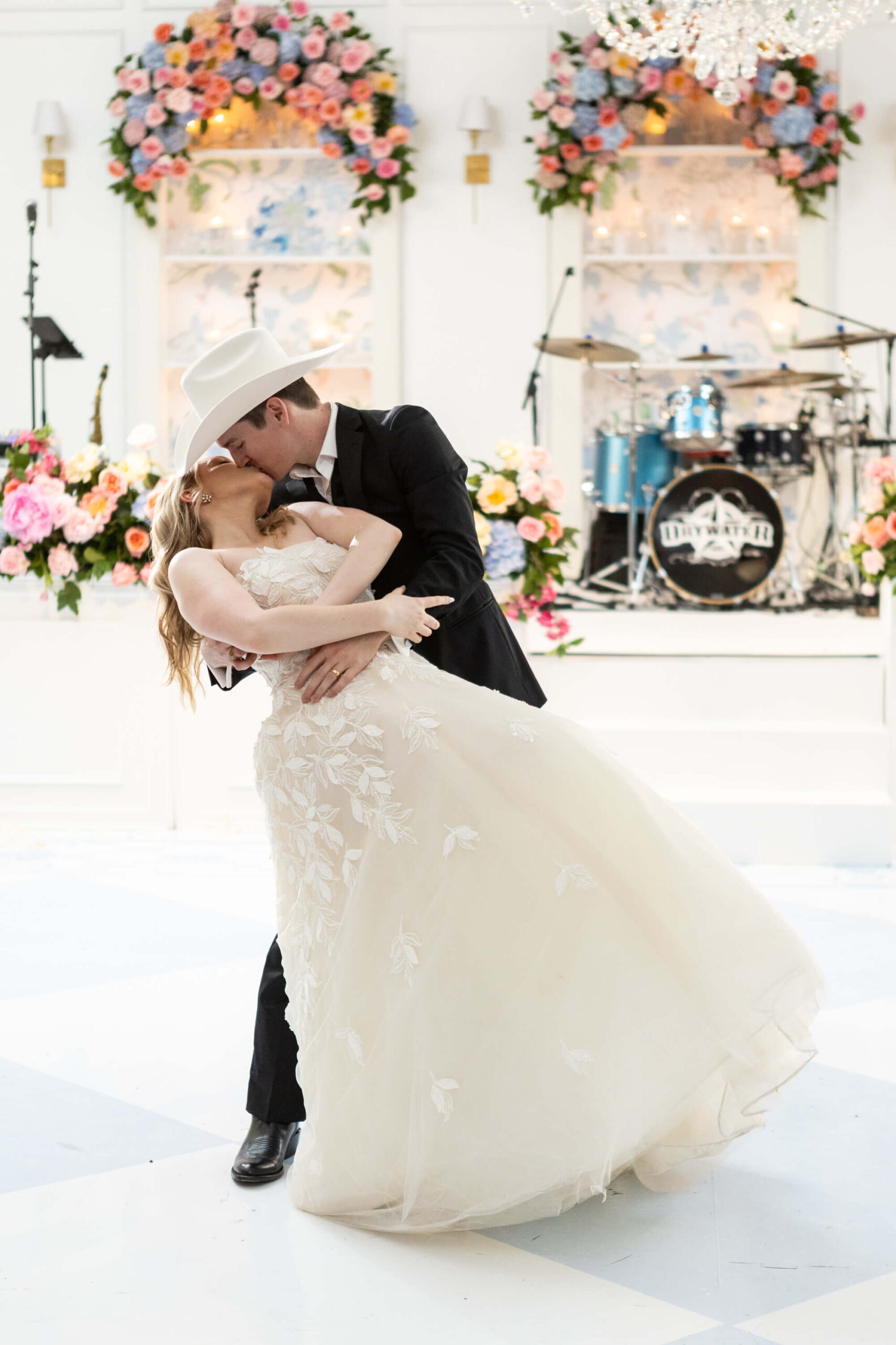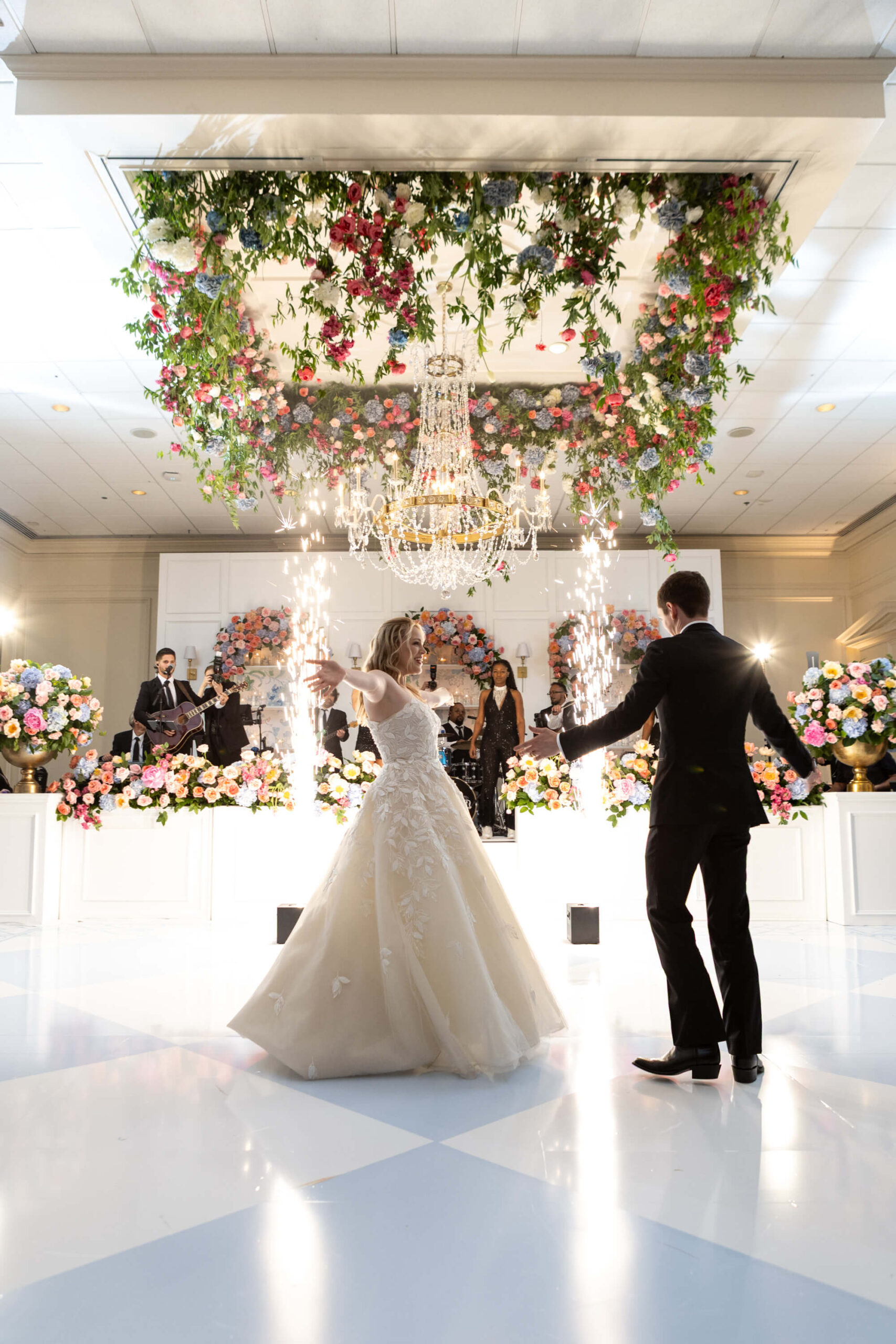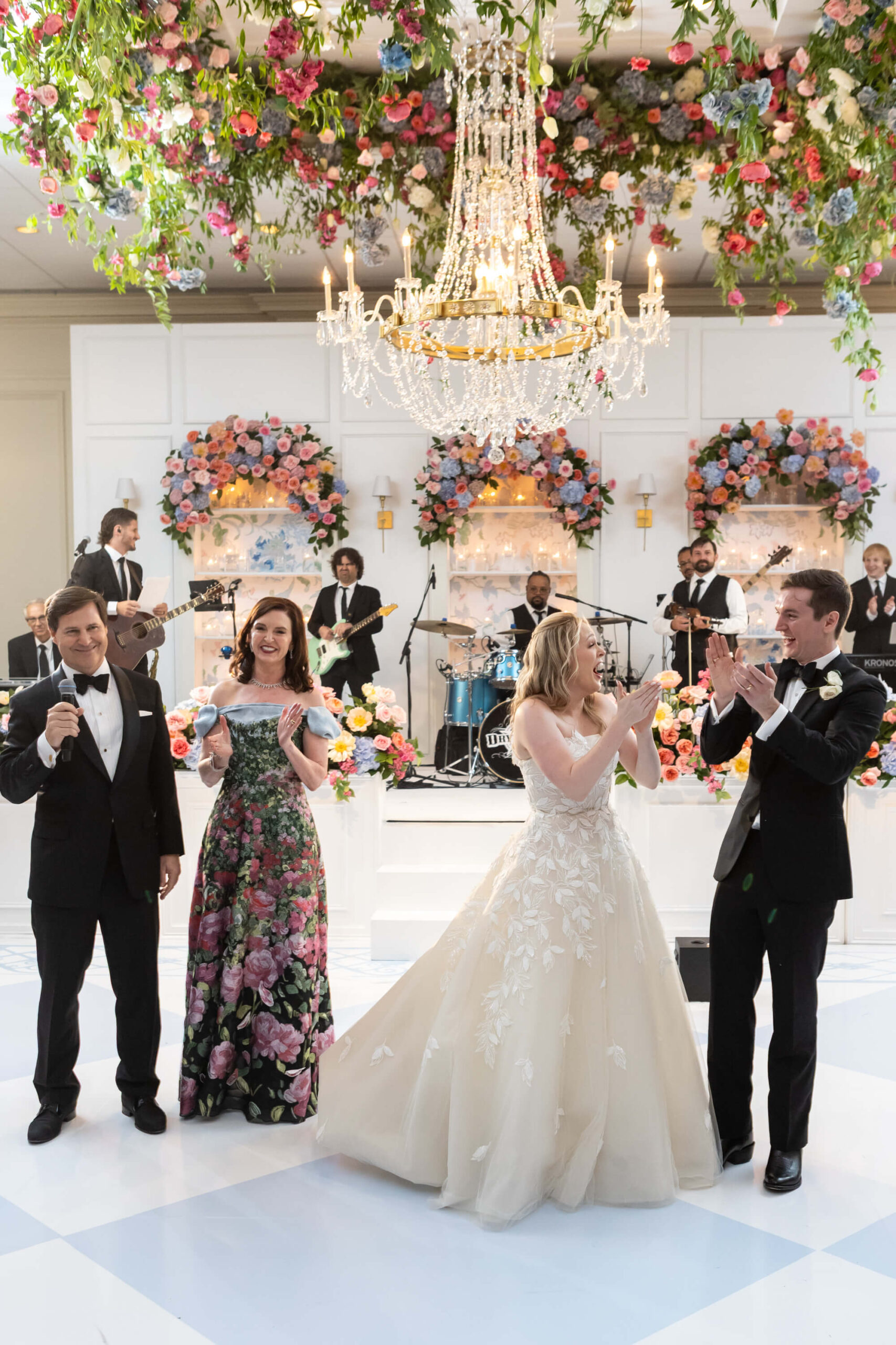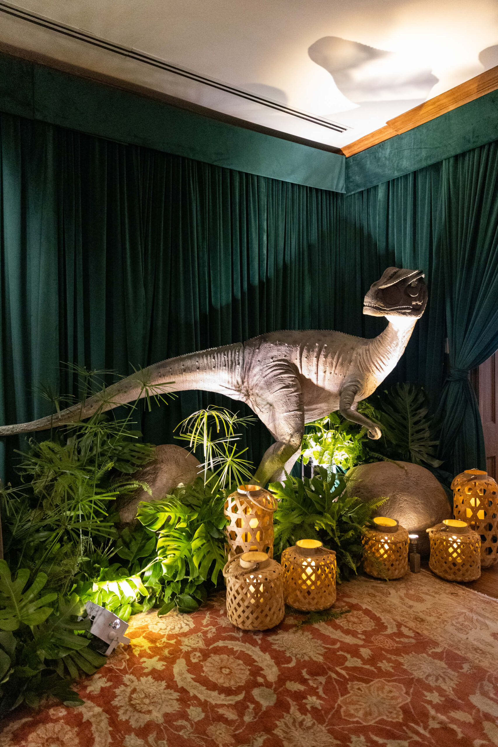 The groom’s surprise “Dino Den” was a true showstopper: complete with tropical plants, a fog machine, themed cocktails, and a towering dinosaur cake. It was a playful tribute to Garrett’s lifelong love of dinosaurs and a moment of pure joy for the couple and their guests. Another highlight of the evening came when Elizabeth and Garrett took the stage for a surprise duet of “Guilty” by Barbra Streisand and Barry Gibb: an unexpected performance and a favorite memory for many.