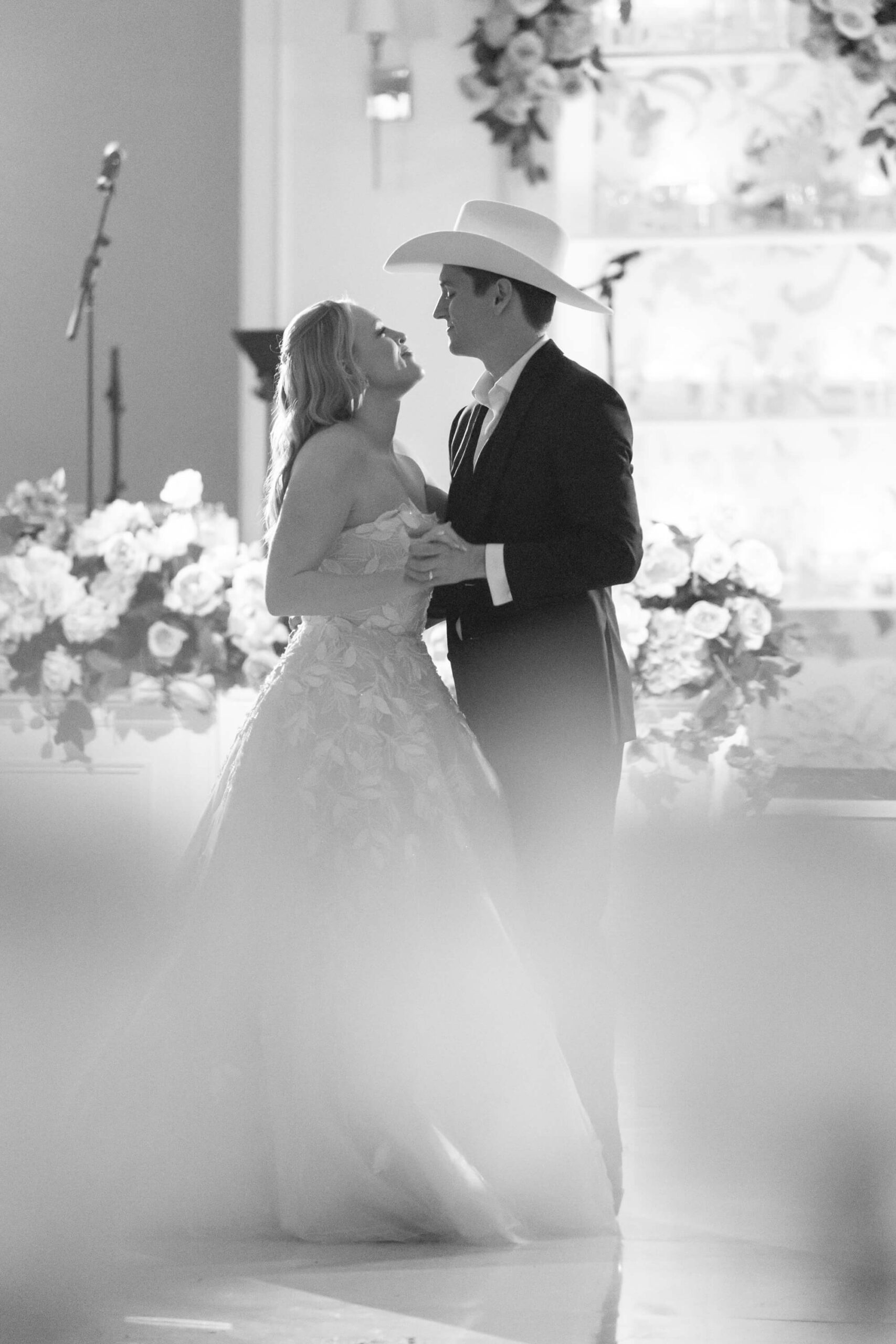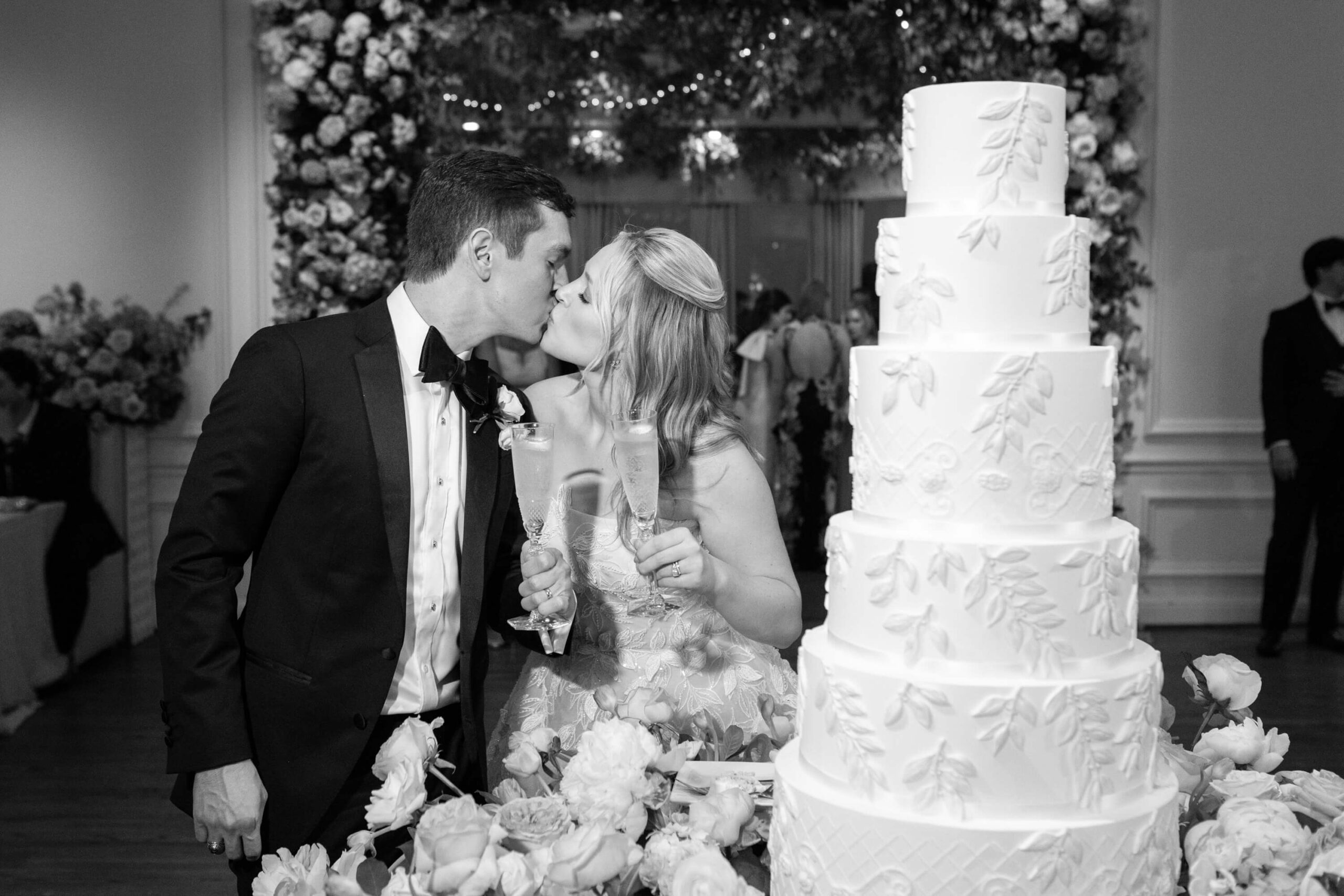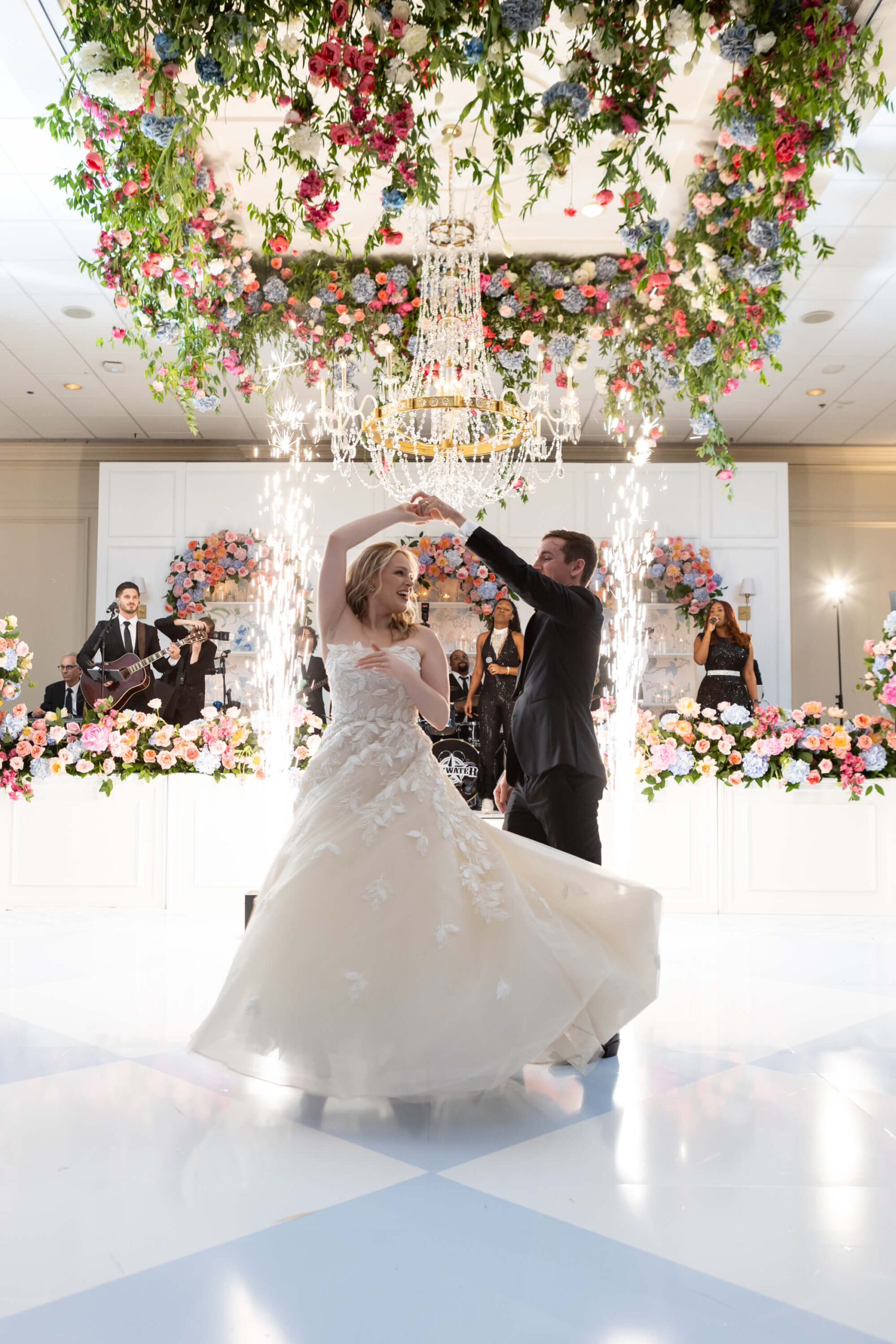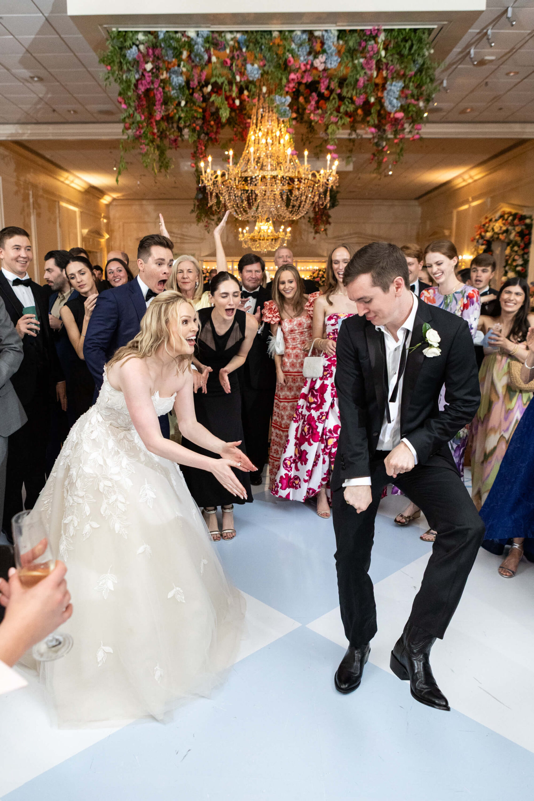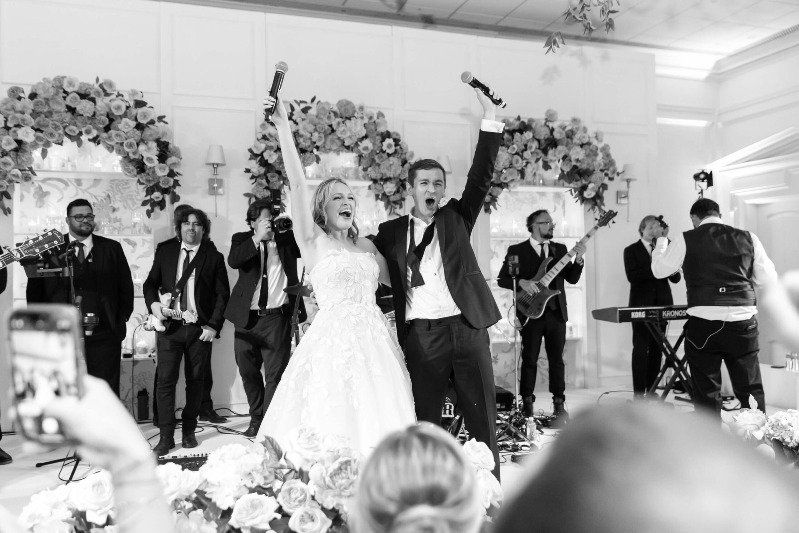 The groom’s surprise “Dino Den” was a true showstopper: complete with tropical plants, a fog machine, themed cocktails, and a towering dinosaur cake. It was a playful tribute to Garrett’s lifelong love of dinosaurs and a moment of pure joy for the couple and their guests. Another highlight of the evening came when Elizabeth and Garrett took the stage for a surprise duet of “Guilty” by Barbra Streisand and Barry Gibb: an unexpected performance and a favorite memory for many.