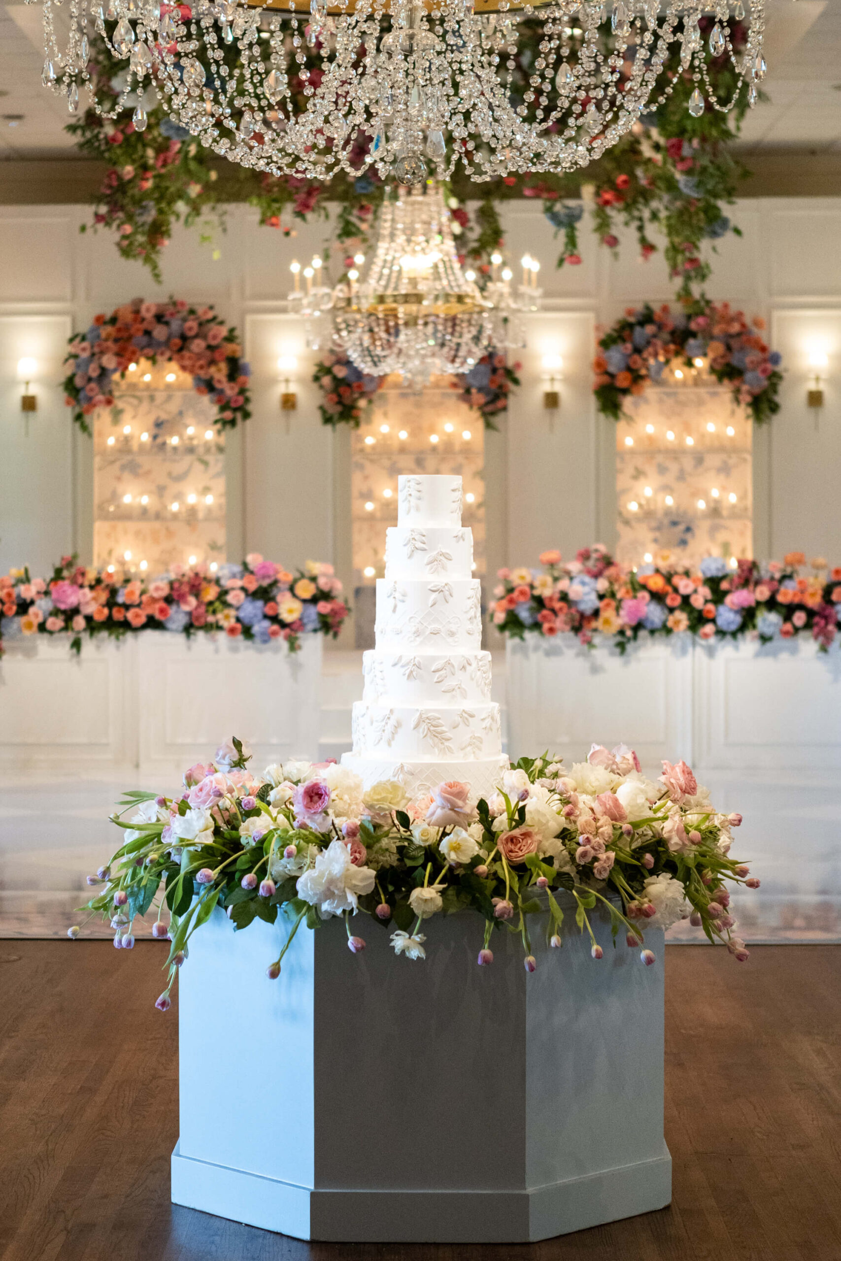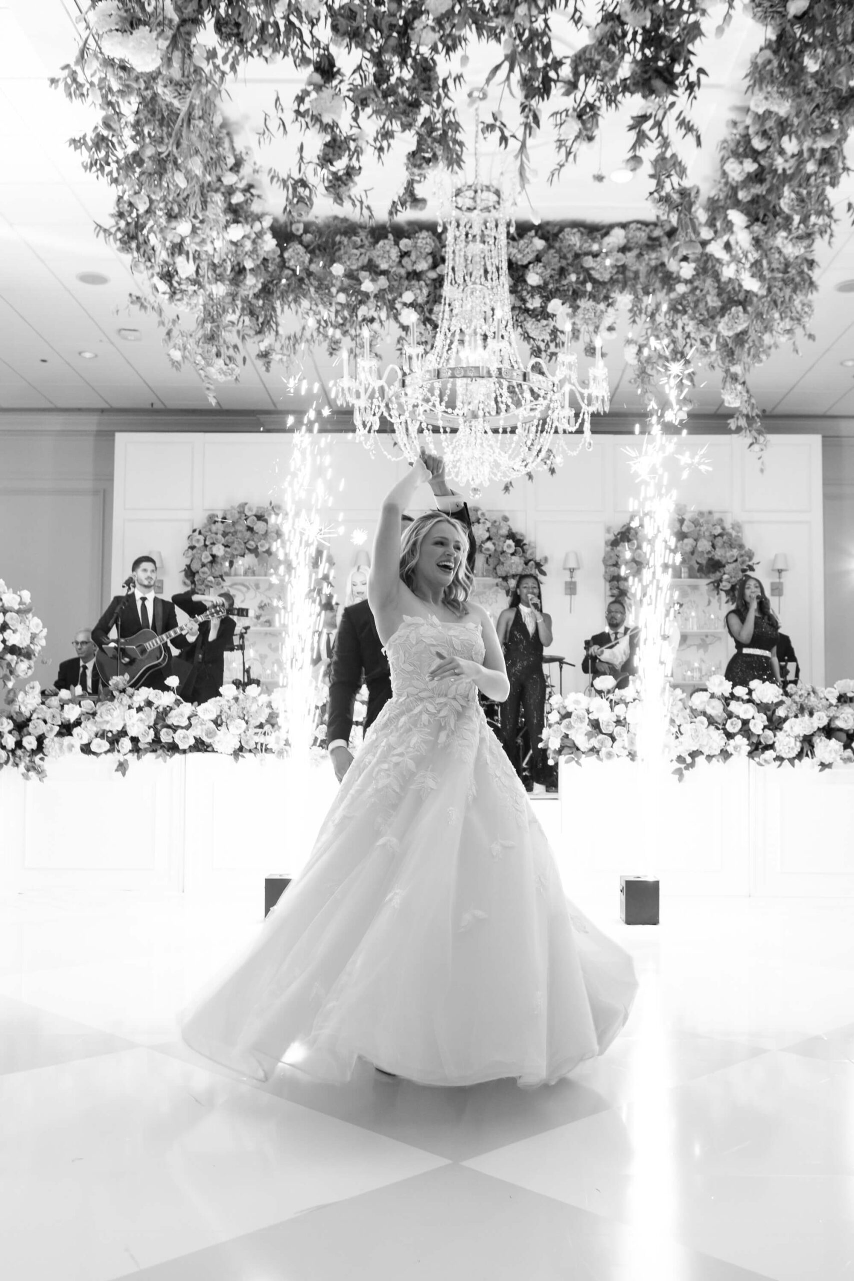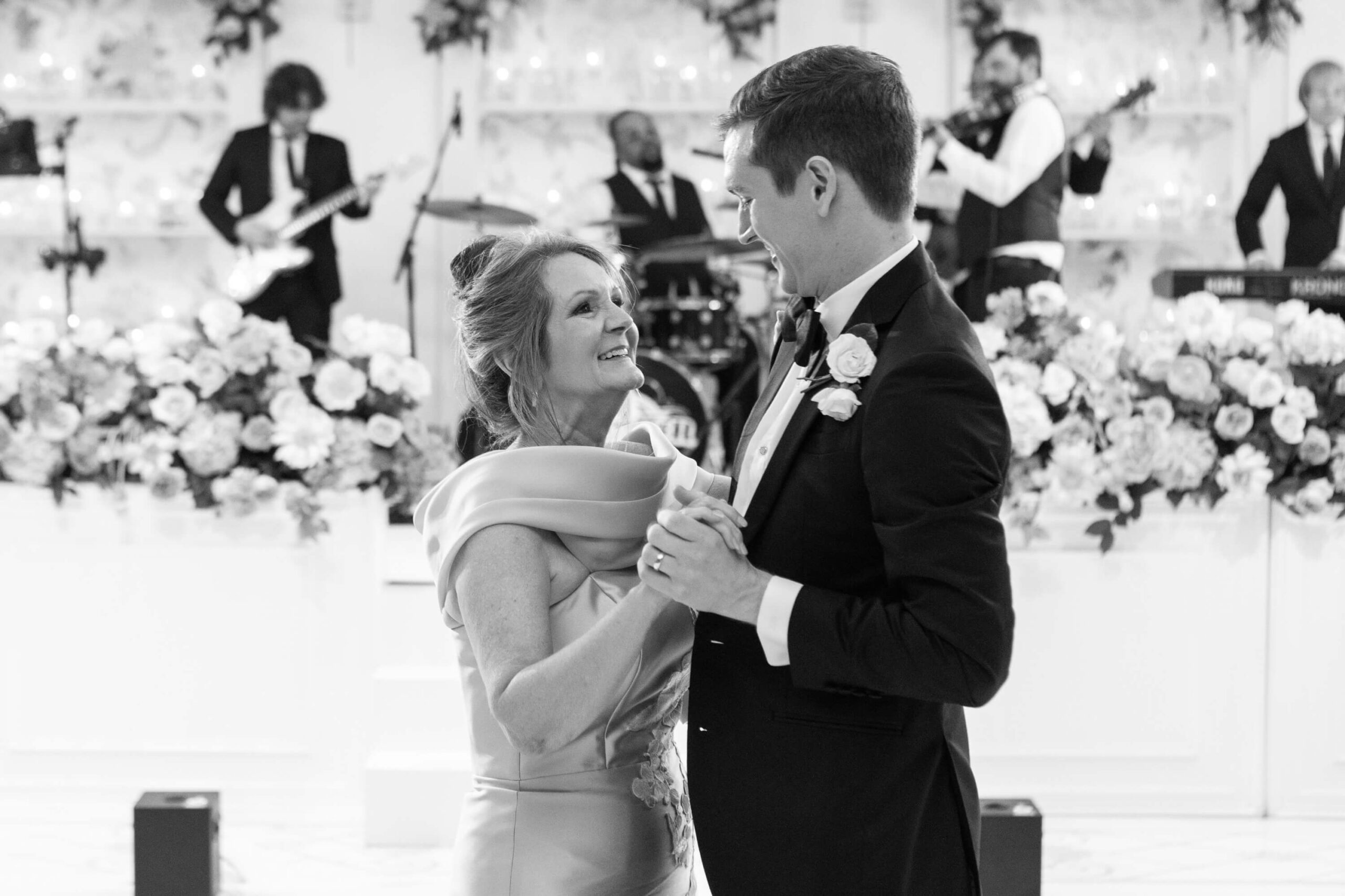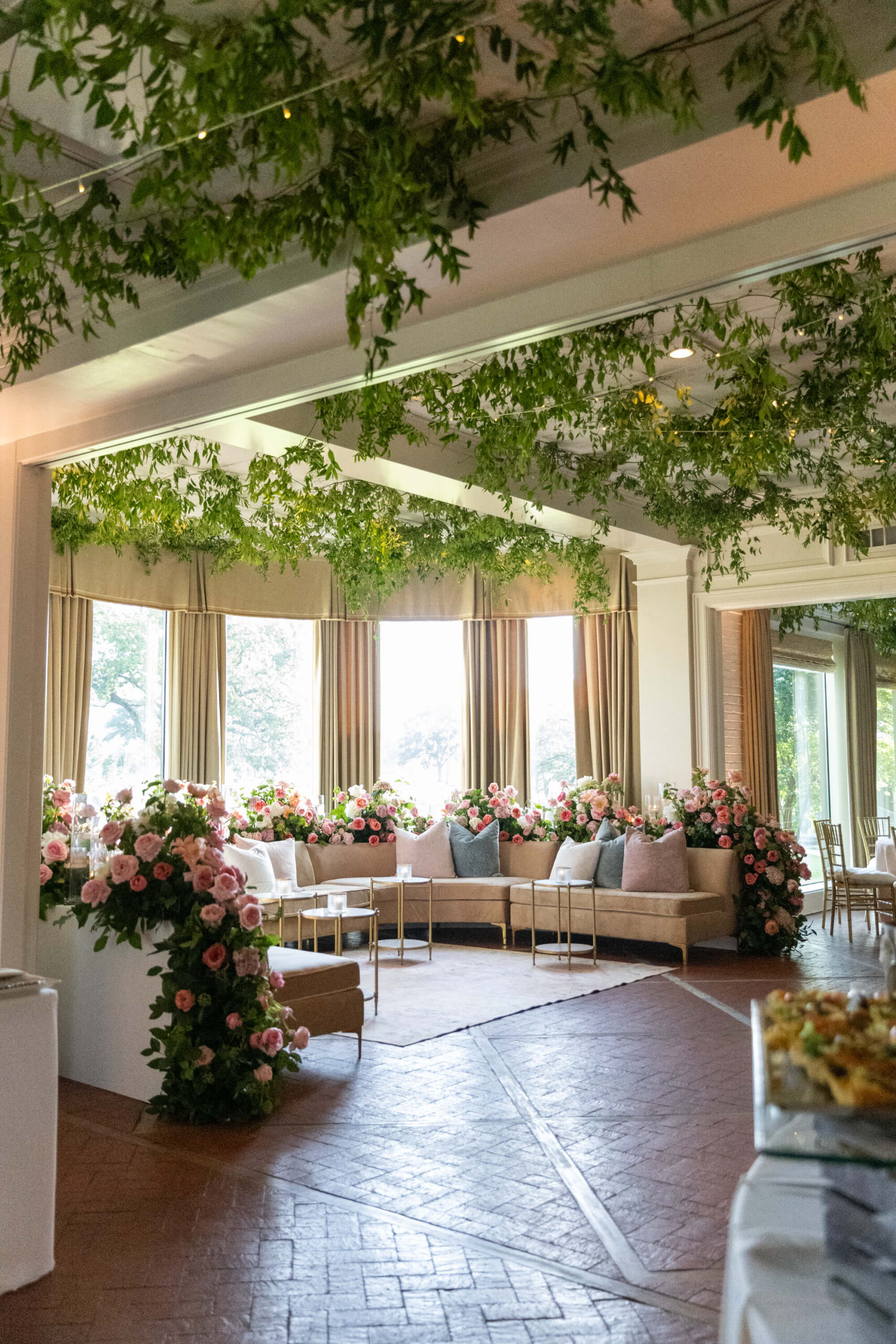 The groom’s surprise “Dino Den” was a true showstopper: complete with tropical plants, a fog machine, themed cocktails, and a towering dinosaur cake. It was a playful tribute to Garrett’s lifelong love of dinosaurs and a moment of pure joy for the couple and their guests. Another highlight of the evening came when Elizabeth and Garrett took the stage for a surprise duet of “Guilty” by Barbra Streisand and Barry Gibb: an unexpected performance and a favorite memory for many.