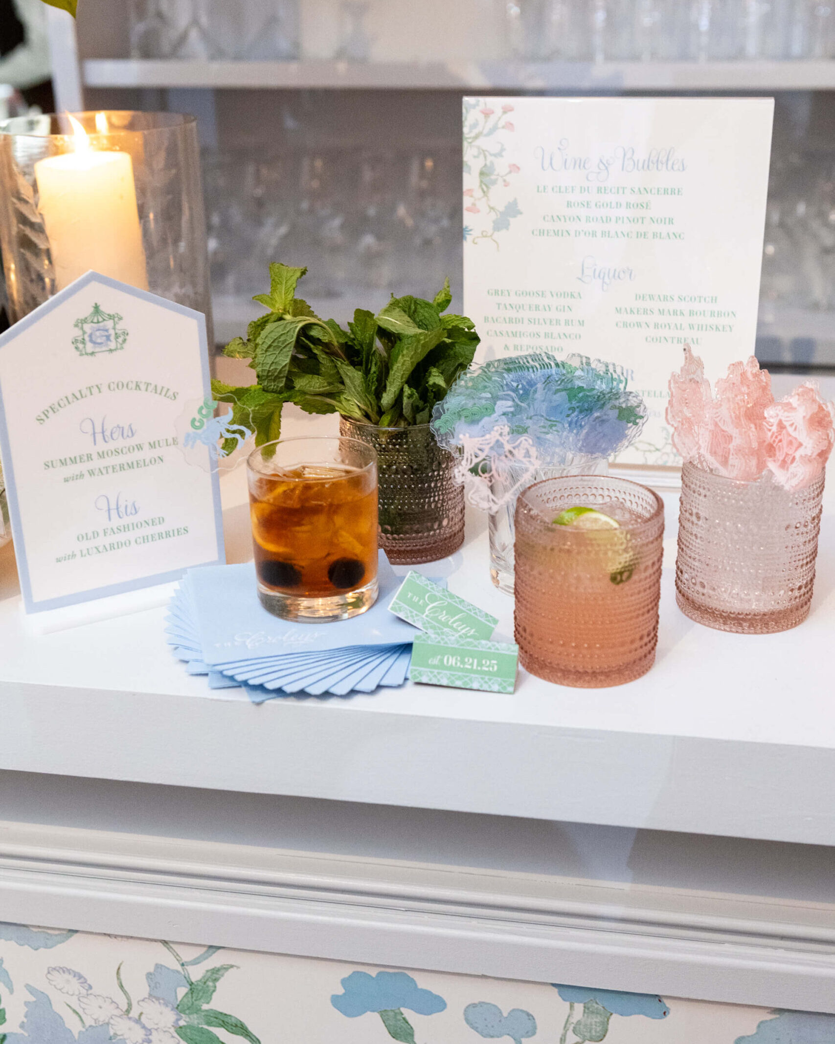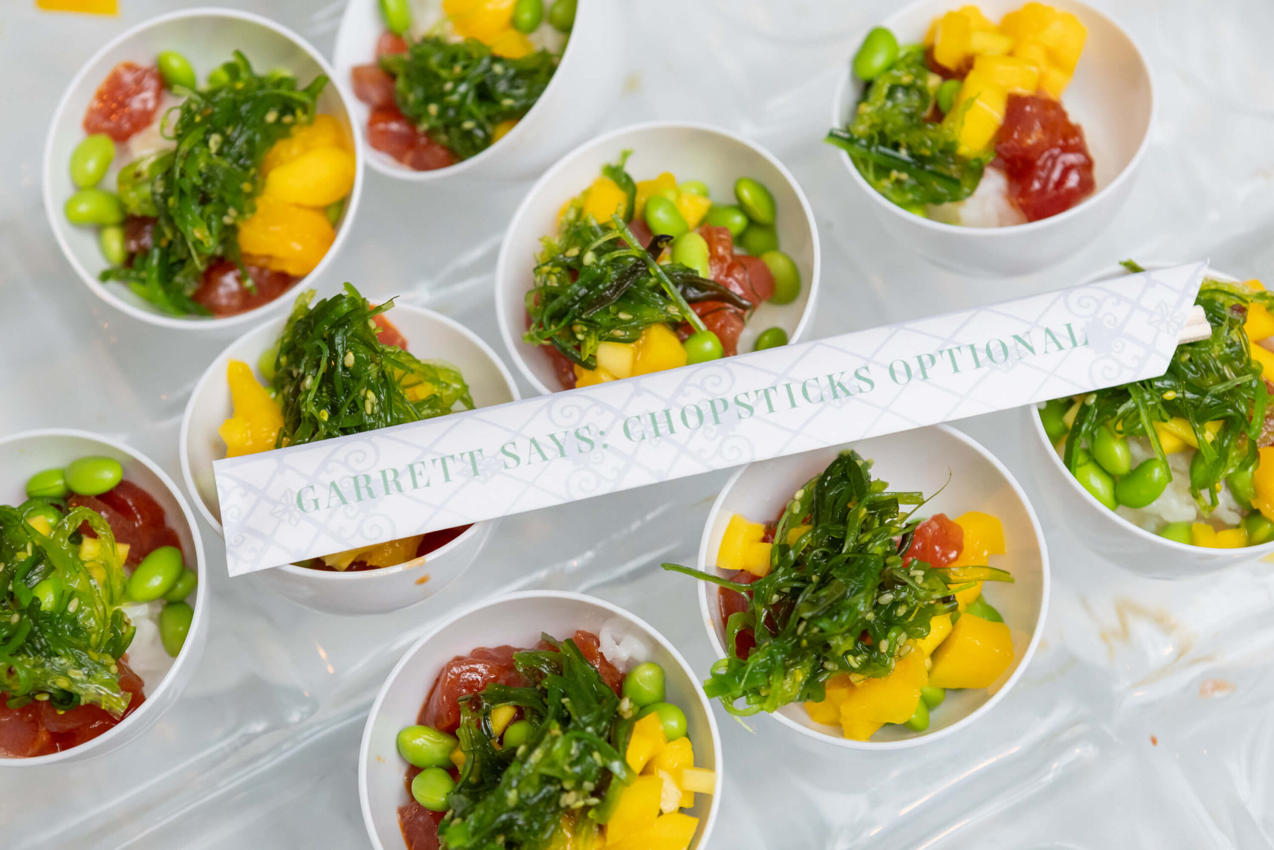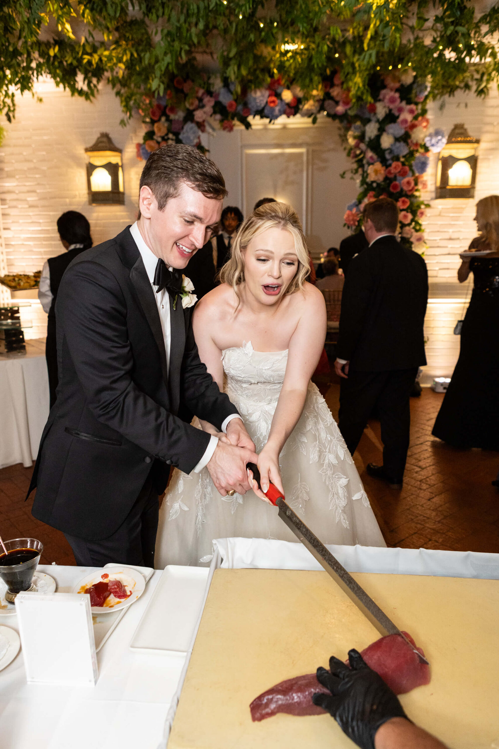 With Garrett’s demanding med school schedule, Elizabeth and her mother took the lead on planning early, ensuring every element felt intentional. The result? A vibrant, personality-filled day where no detail was too small to carry a story, like custom chopstick sleeves at the sushi station that read “Chopsticks Optional,” a cheeky nod to their second date.