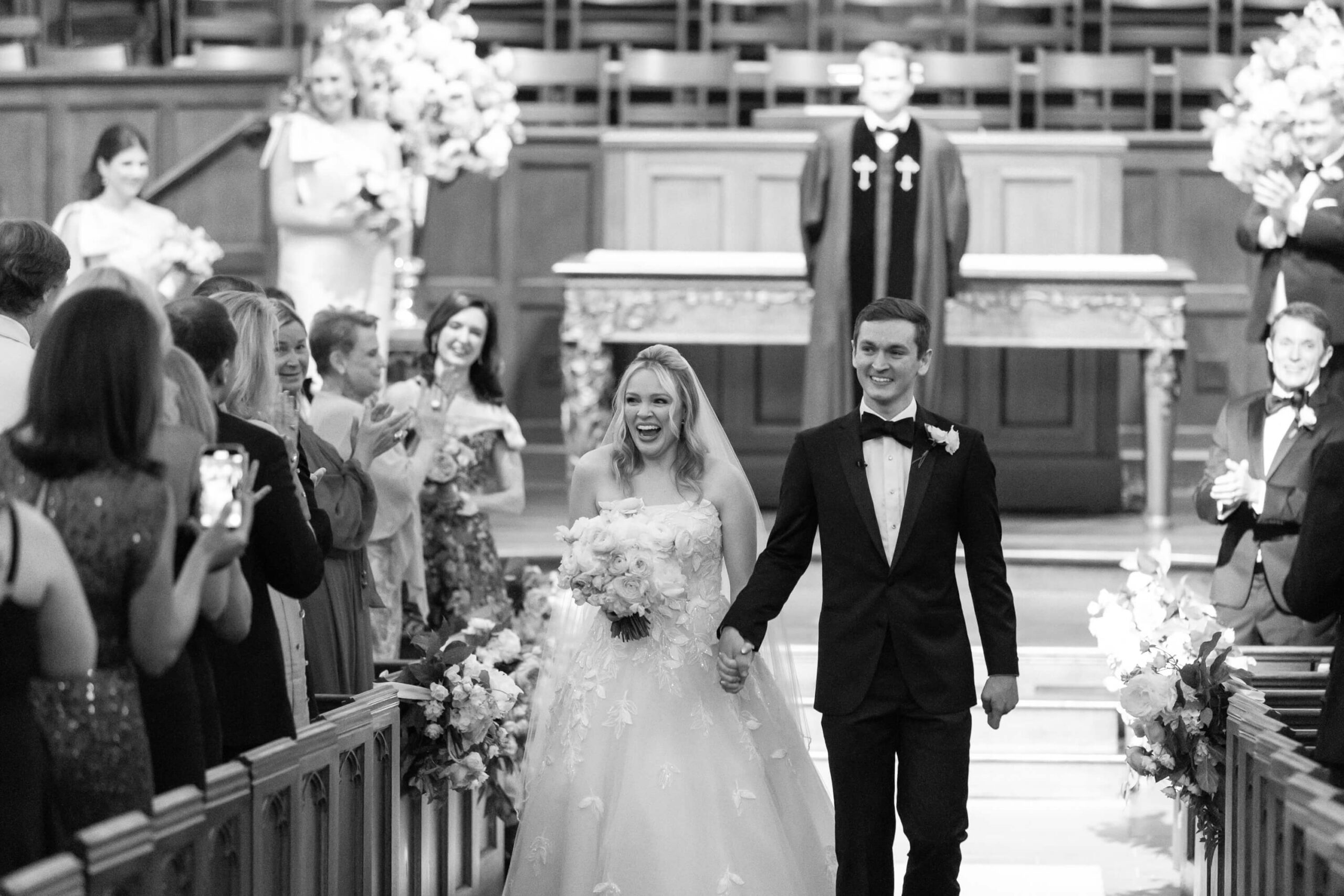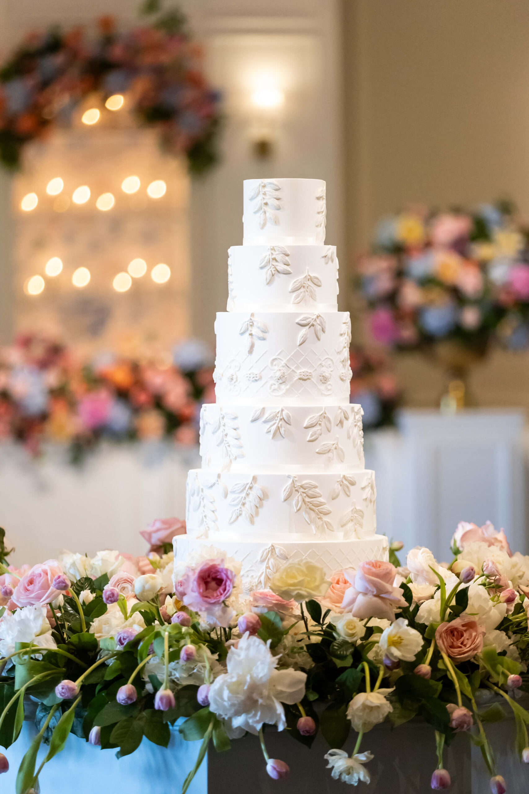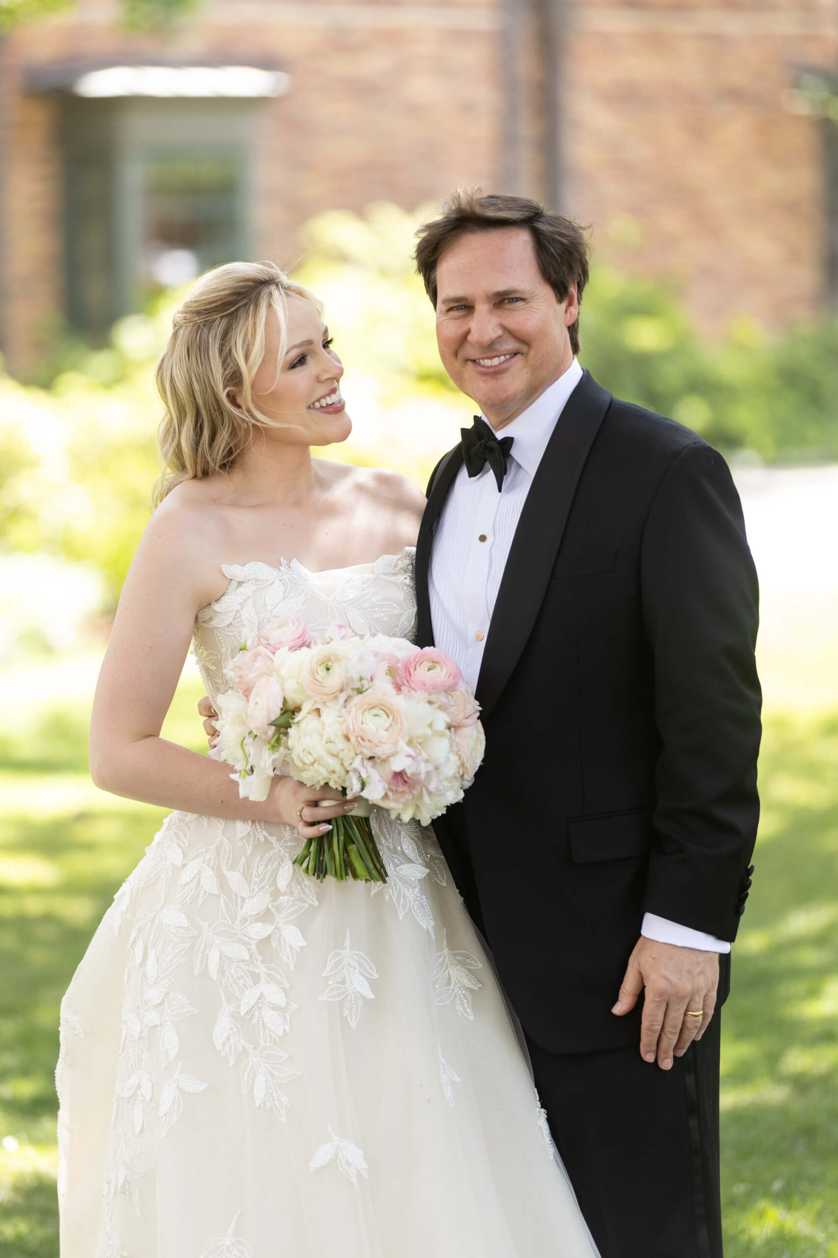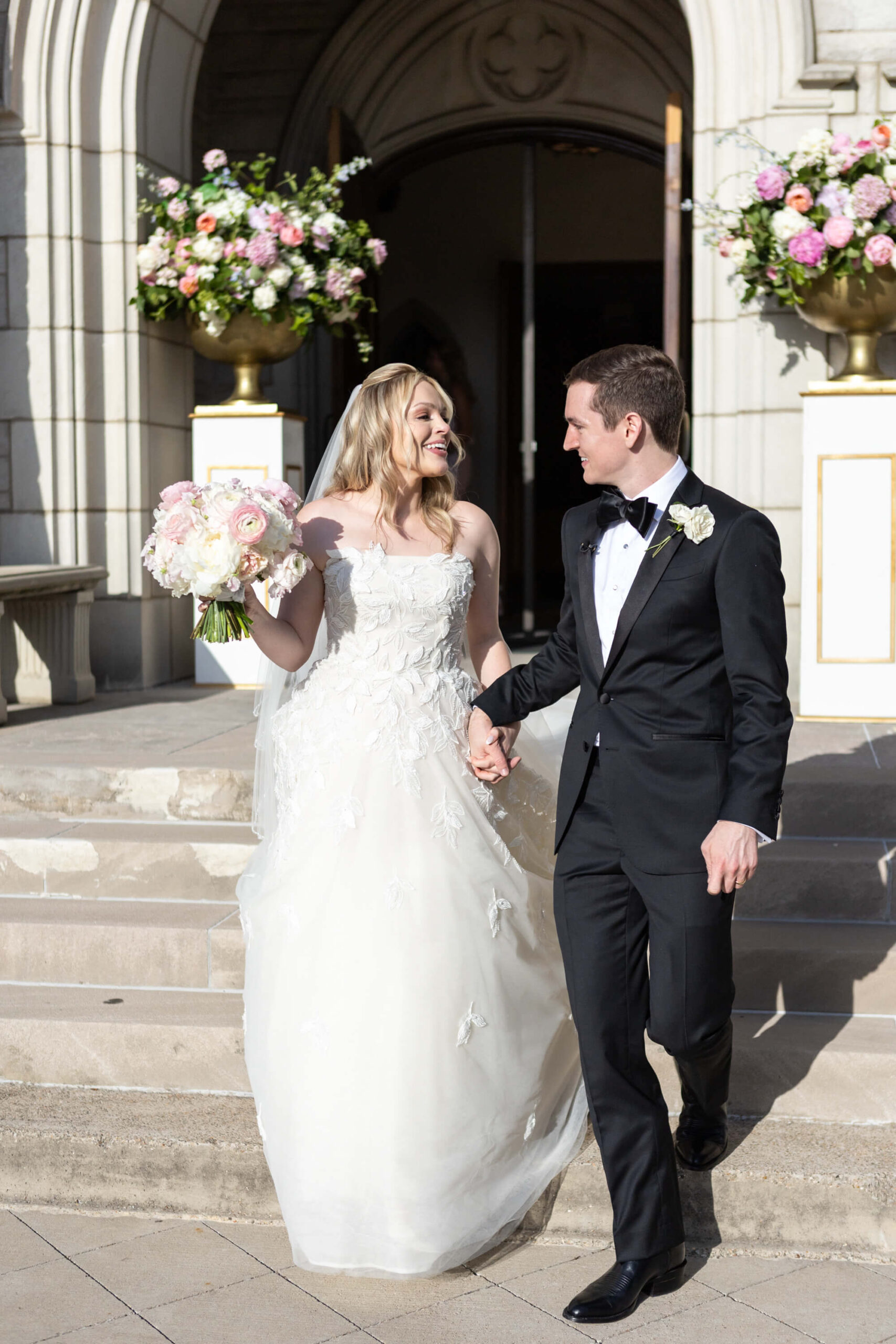 Elizabeth wore a romantic Elie Saab gown with appliqué leaves, a motif subtly echoed throughout the day from invitation design to the couple’s cake. The embroidered handkerchief wrapped around the bouquet was the perfect something borrowed detail as Elizabeth’s mother did the same on her wedding day.