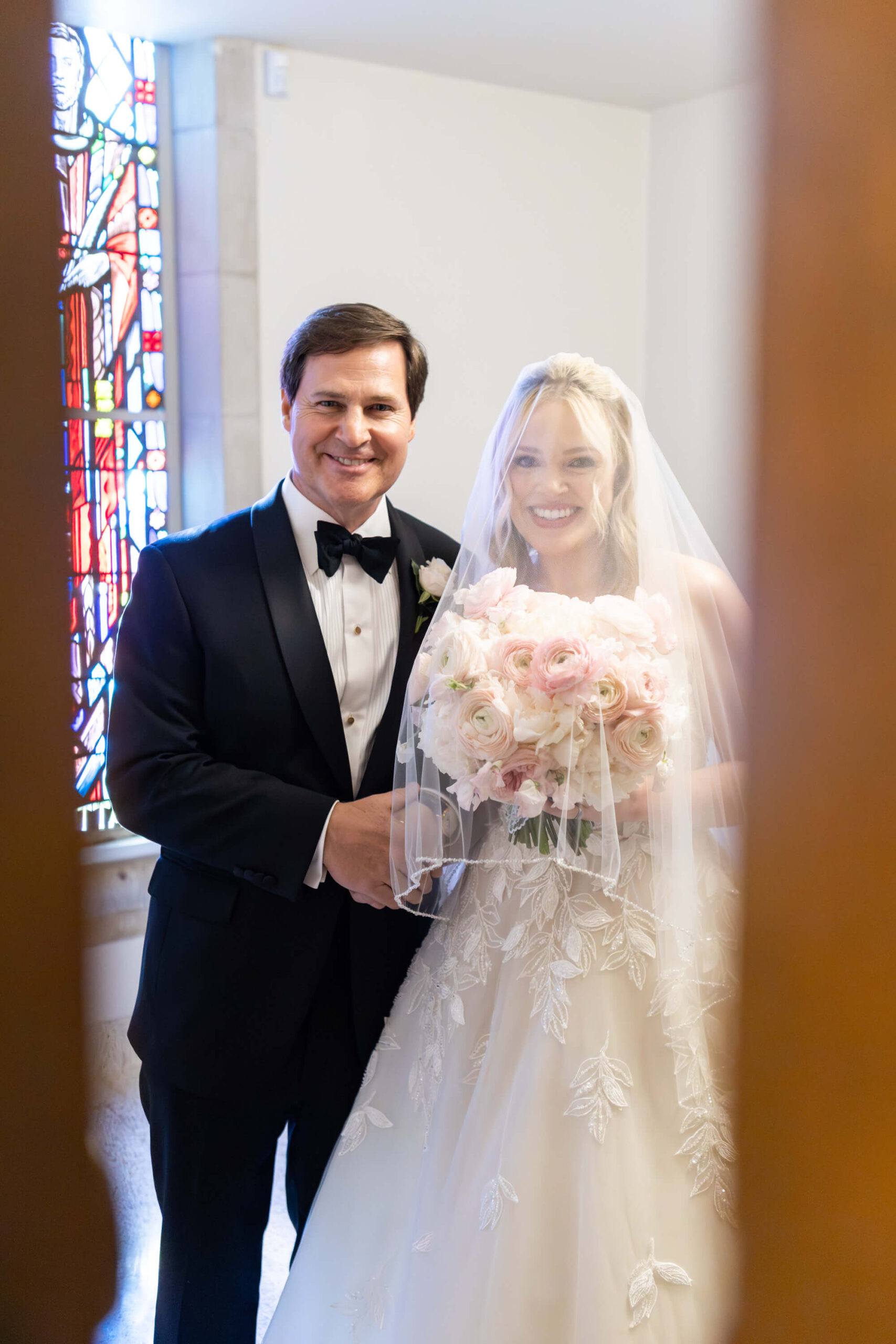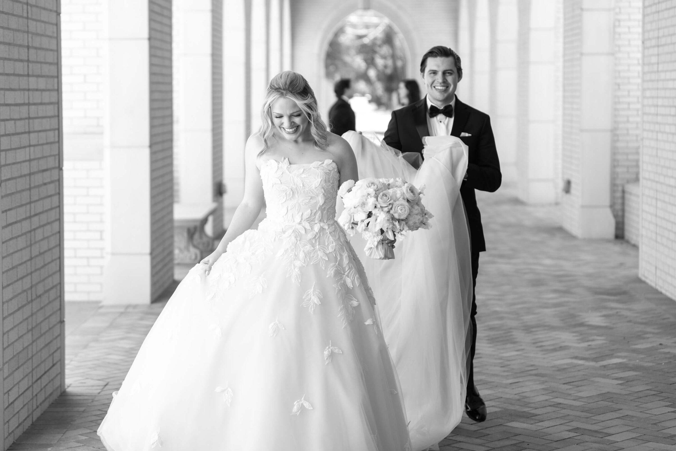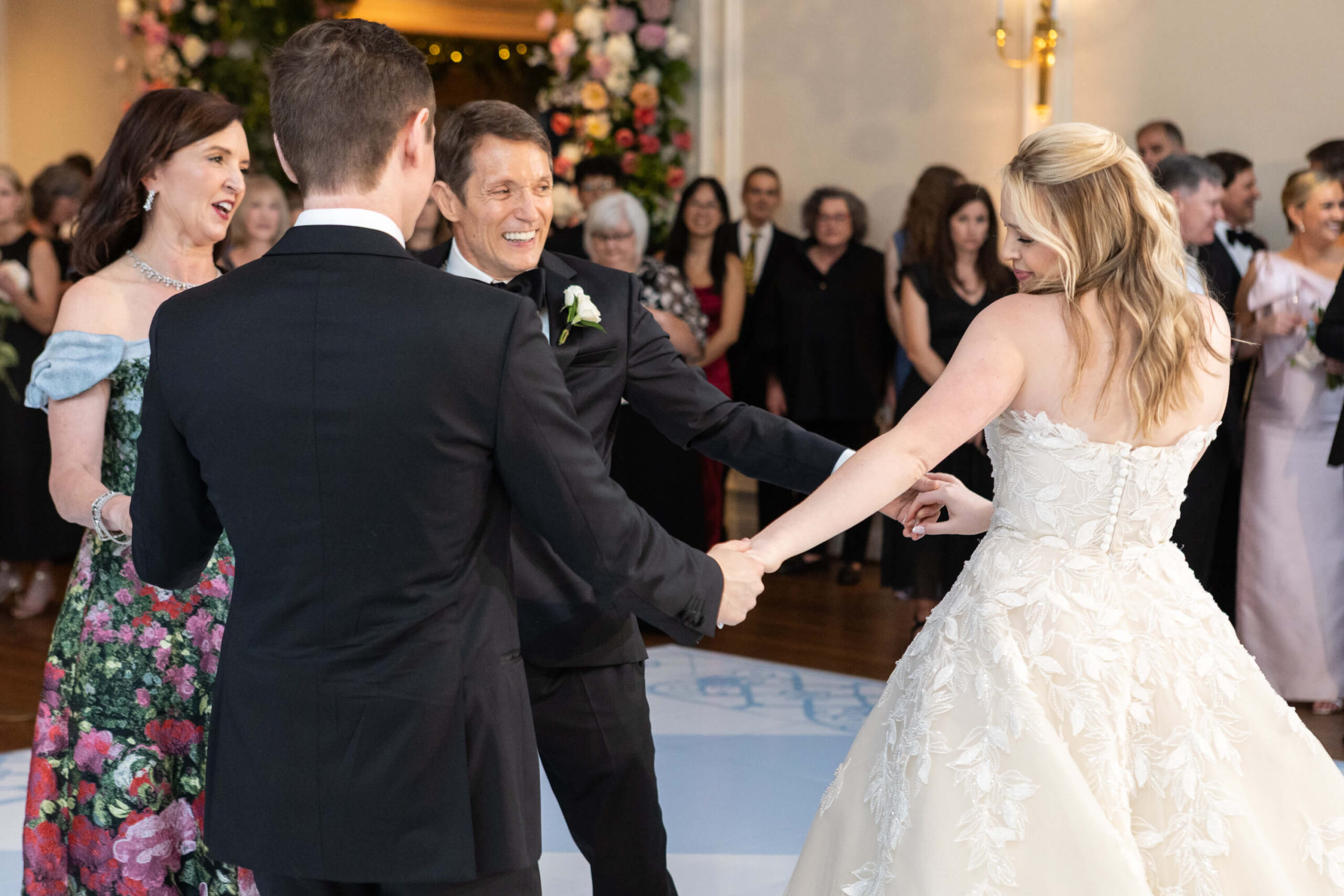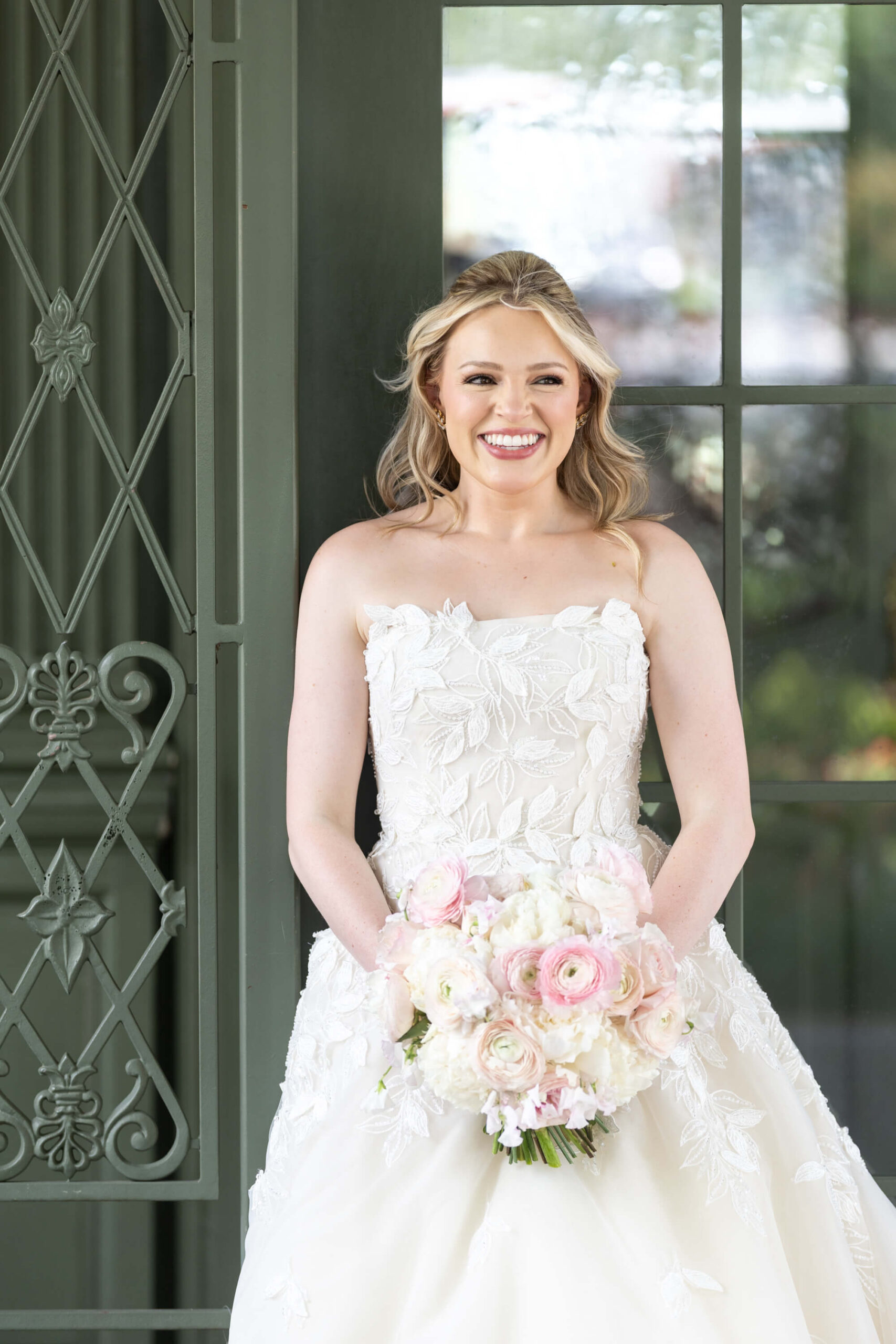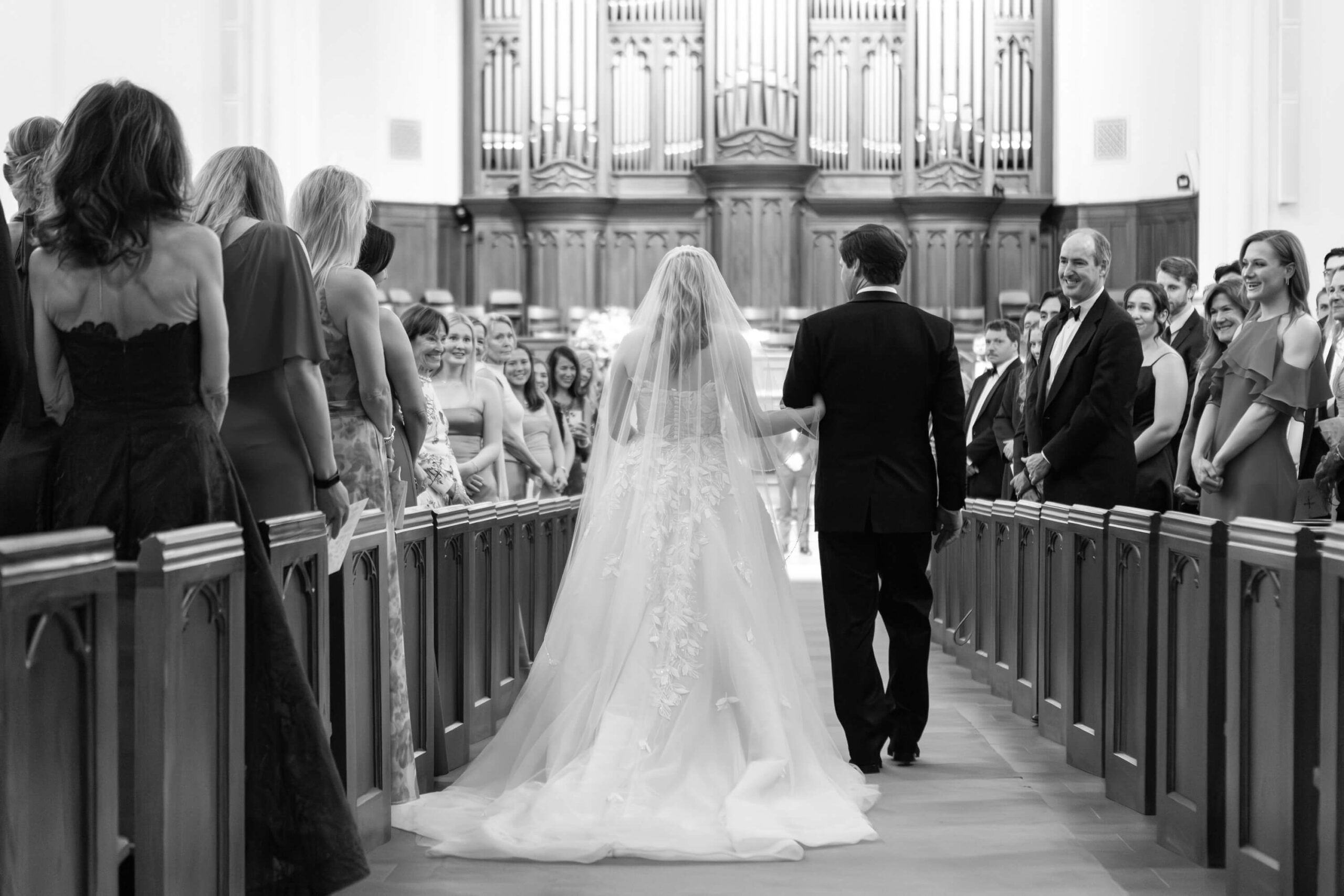 Elizabeth wore a romantic Elie Saab gown with appliqué leaves, a motif subtly echoed throughout the day from invitation design to the couple’s cake. The embroidered handkerchief wrapped around the bouquet was the perfect something borrowed detail as Elizabeth’s mother did the same on her wedding day.