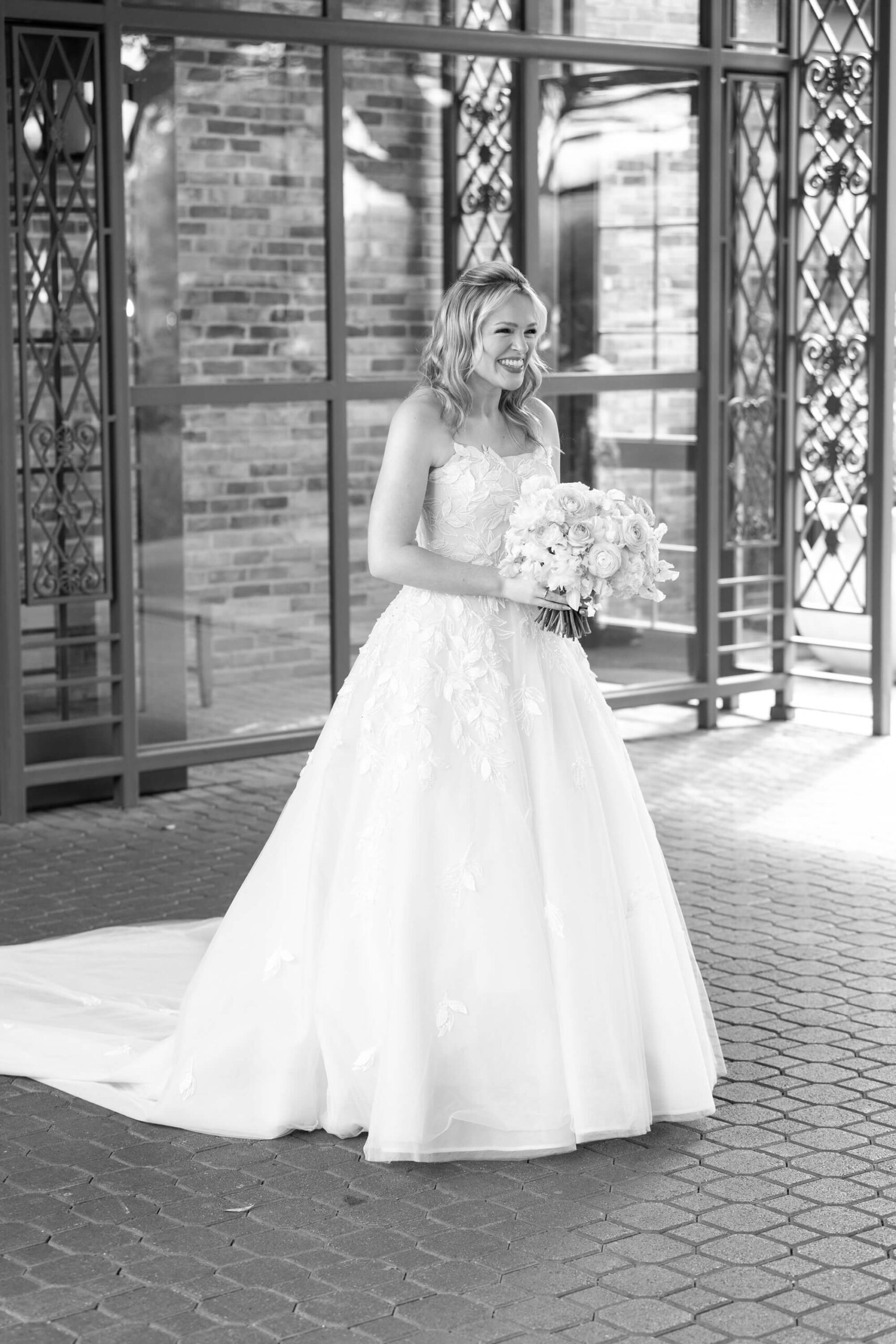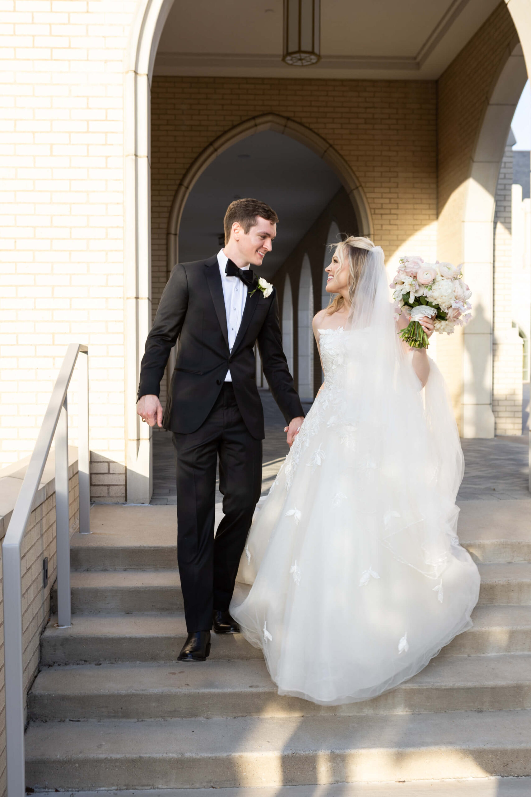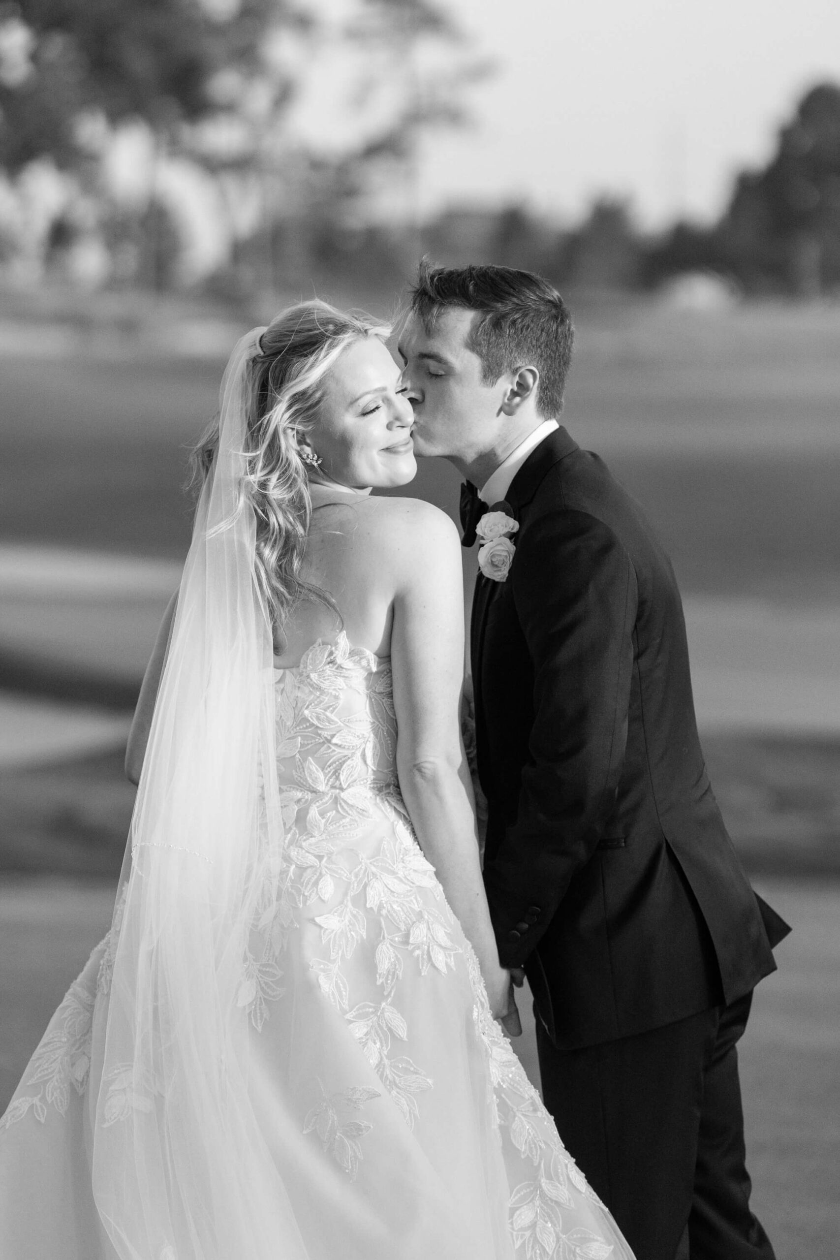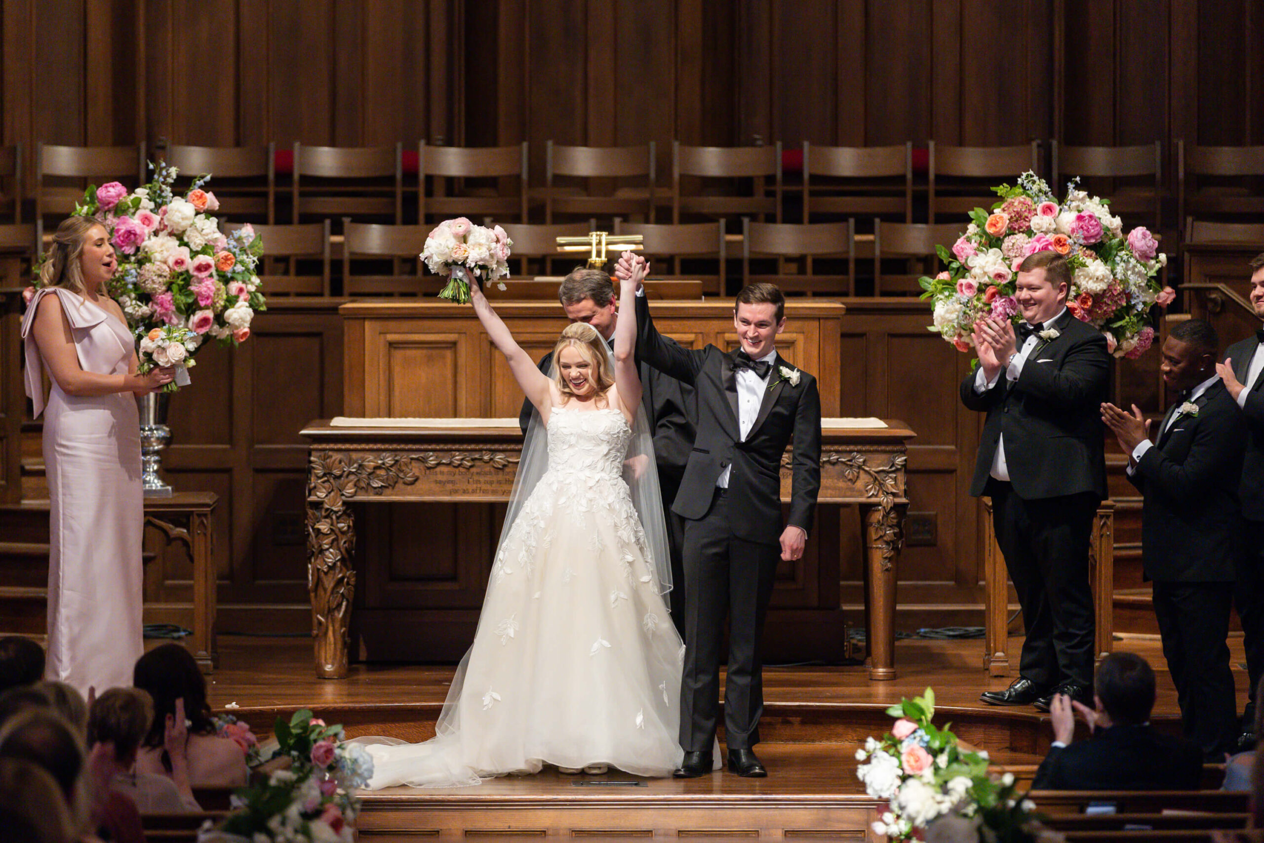 Elizabeth wore a romantic Elie Saab gown with appliqué leaves, a motif subtly echoed throughout the day from invitation design to the couple’s cake. The embroidered handkerchief wrapped around the bouquet was the perfect something borrowed detail as Elizabeth’s mother did the same on her wedding day.