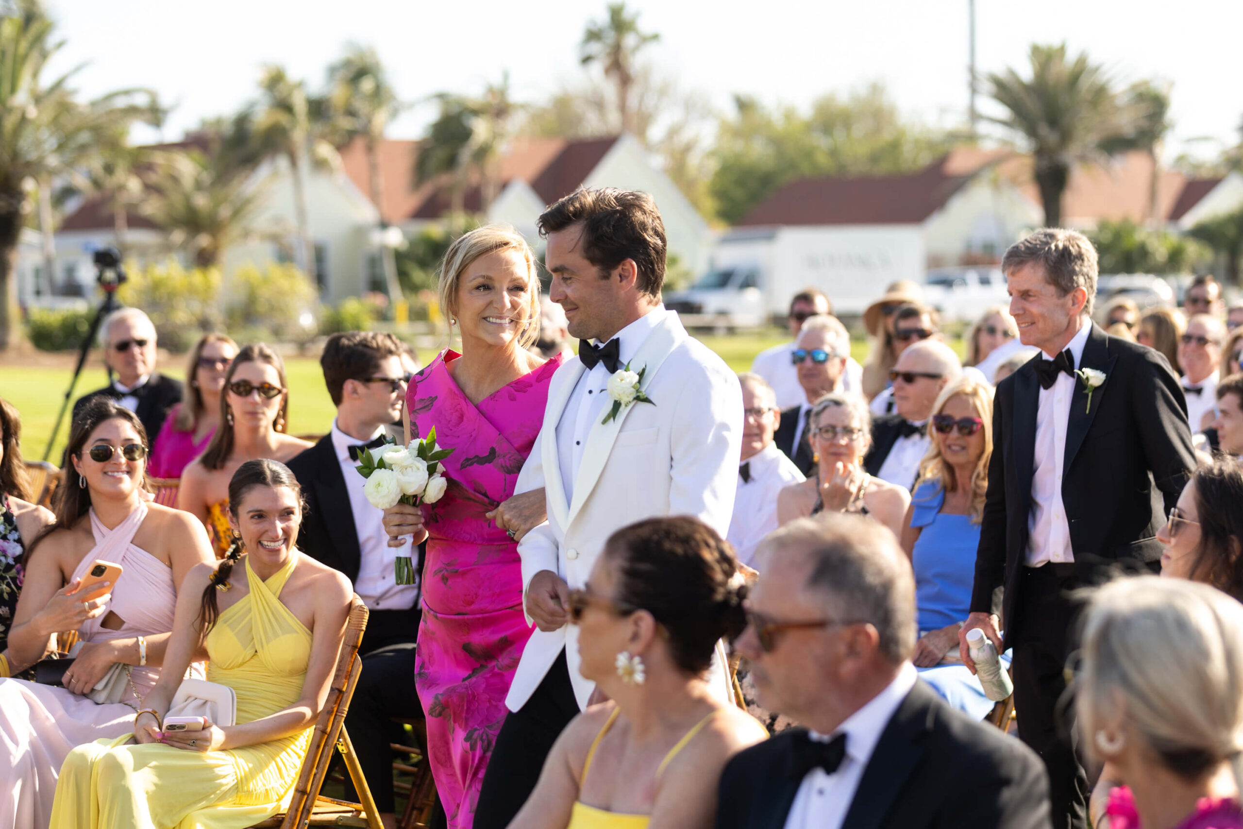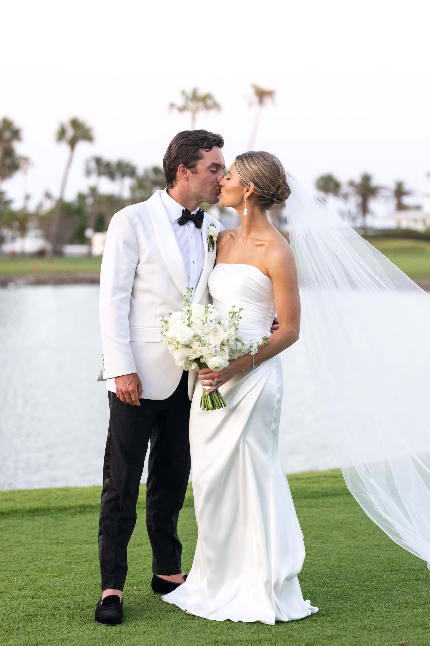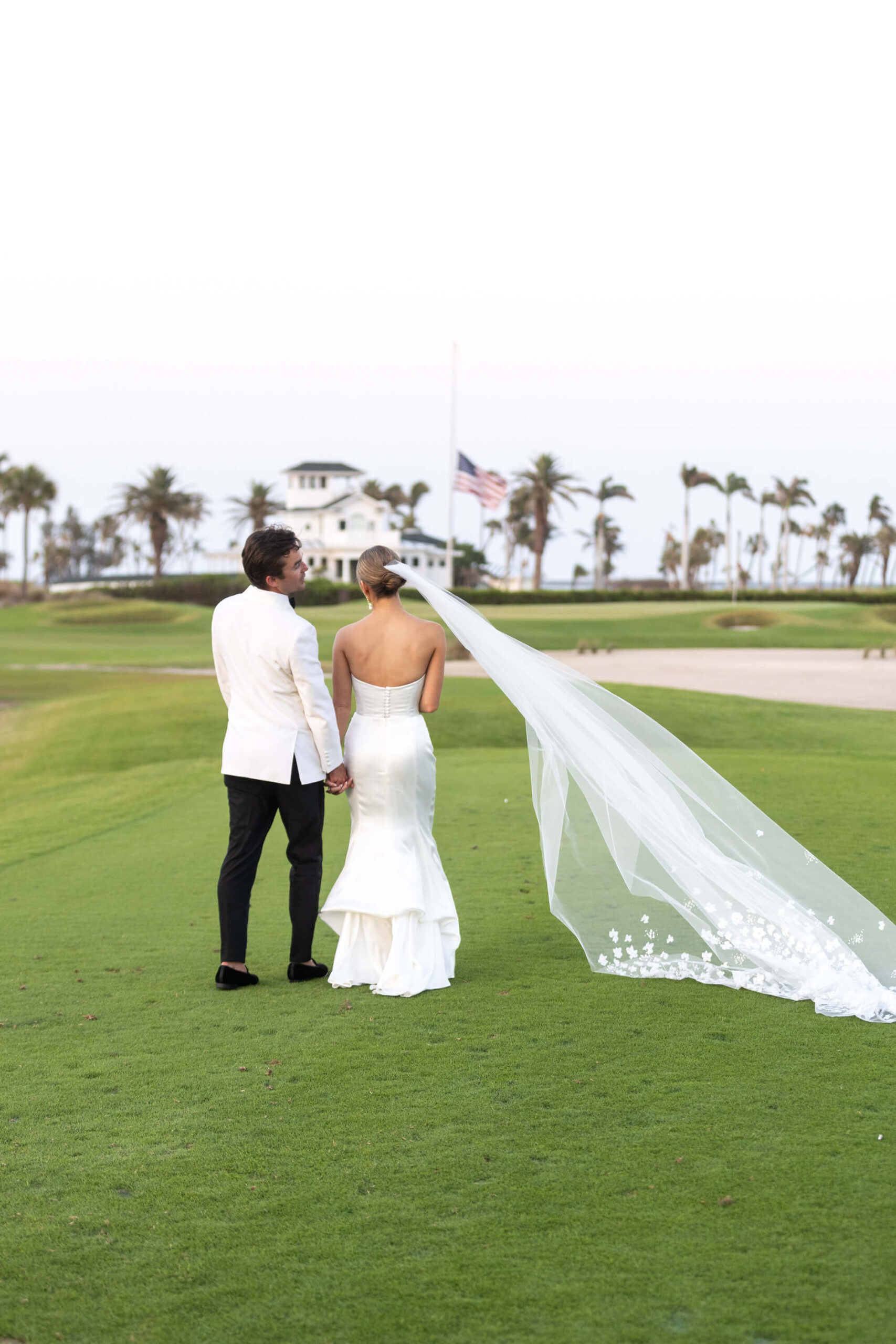 Guests awoke to a perfect Florida day, the air warm with the promise of celebration. The ceremony space was transformed with a romantic palette of white and green florals, accented with lush greenery that echoed the natural beauty of the coast. Every arrangement felt intentional yet effortless, a reflection of Emmy and David’s style: classic, understated, and timeless. Emmy walked down the aisle in a pure silk fitted gown that seemed to move like water, the look completed by a long, embellished veil that caught the light and the faint sea breeze. As she met David’s gaze, the moment felt both grand and intimate, framed by the love of family and friends who had traveled to share it with them.