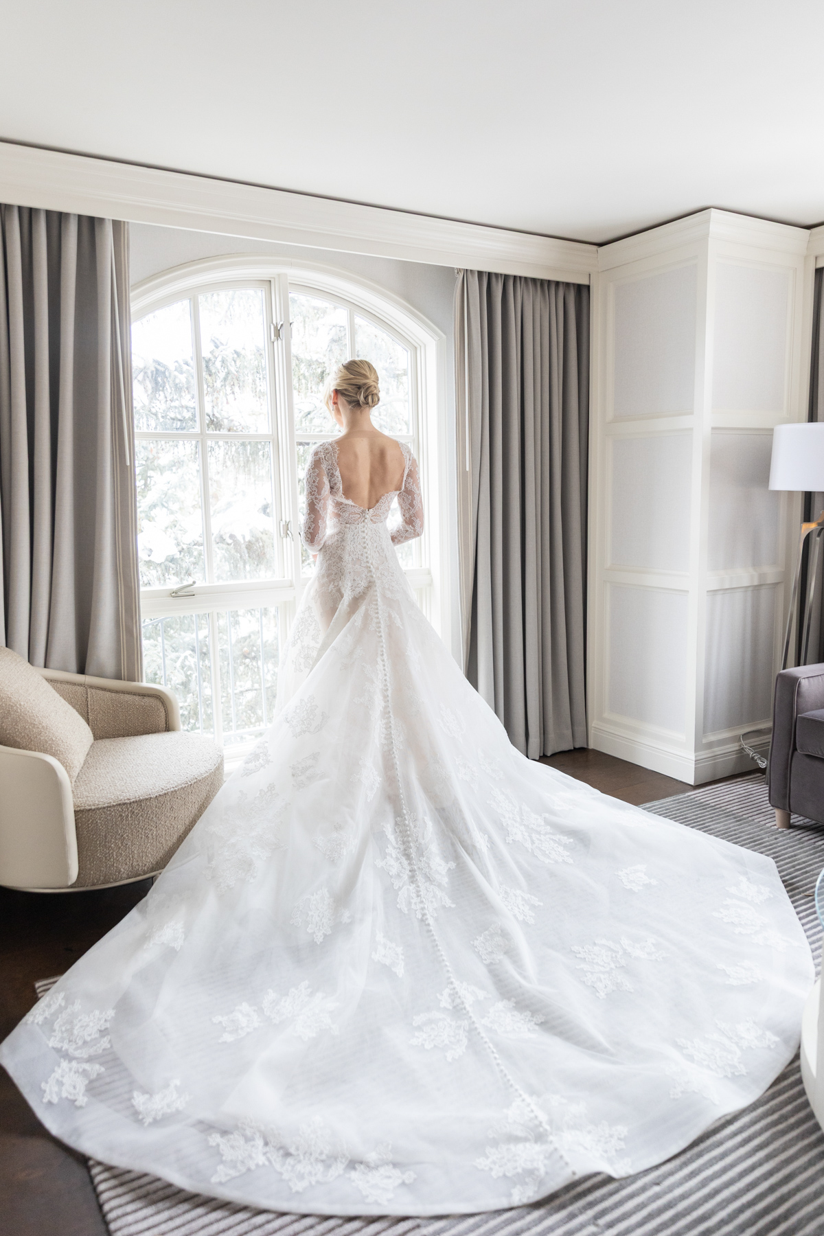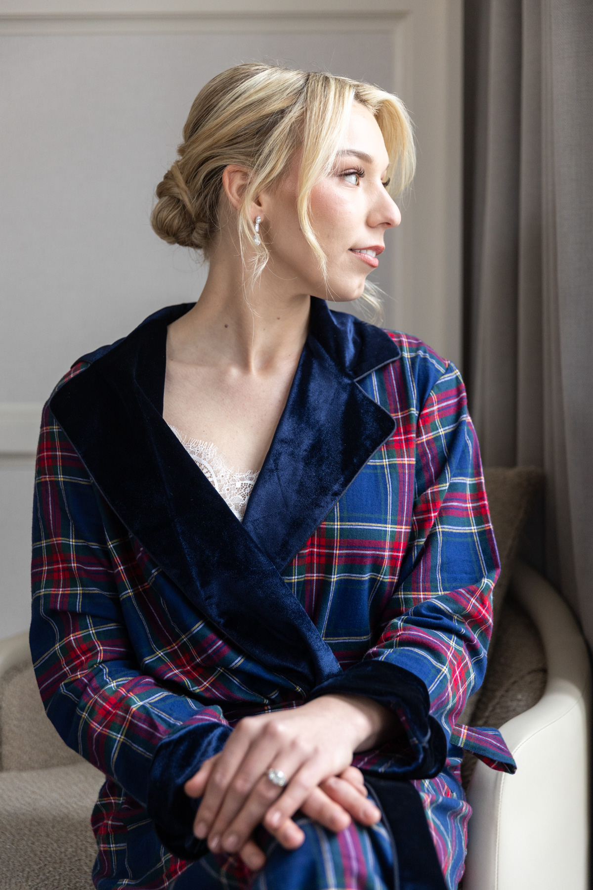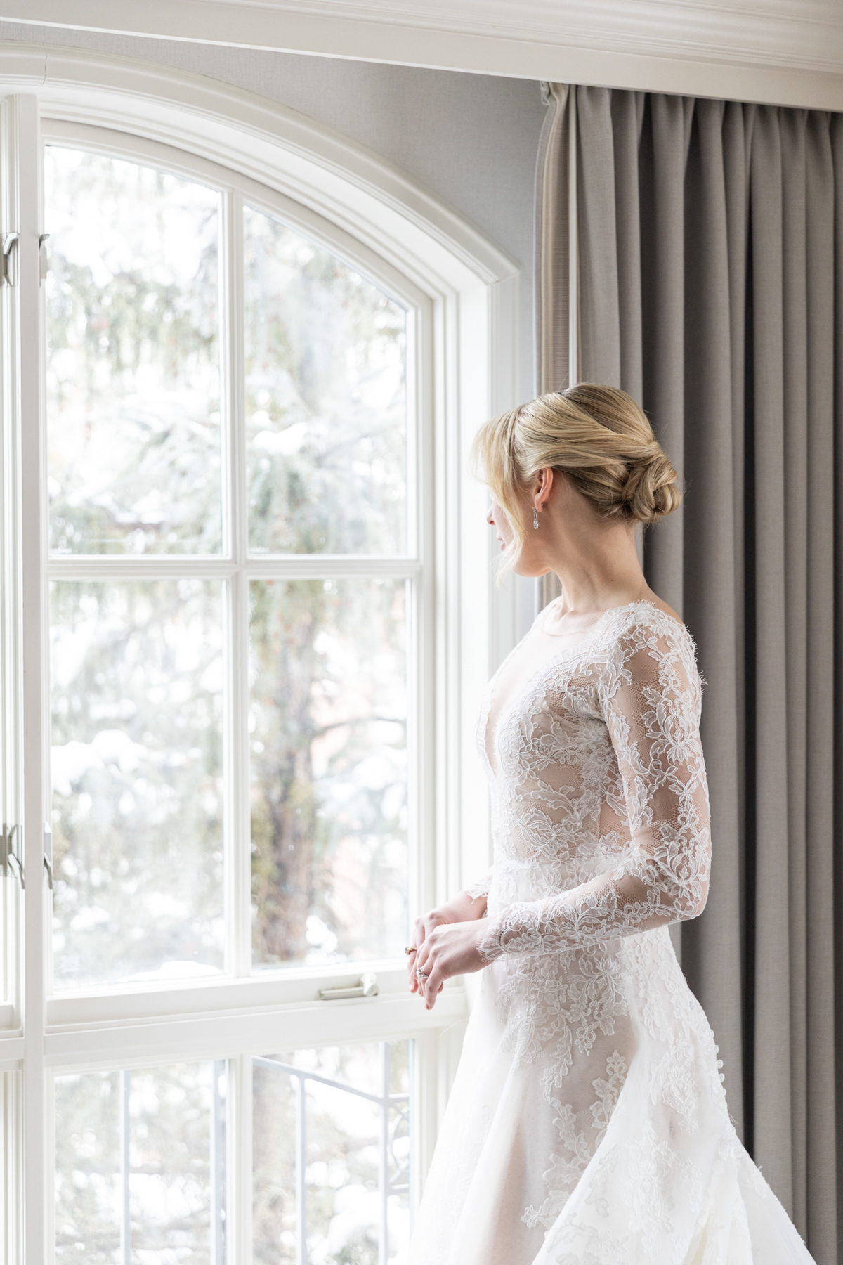 The wedding day began calmly, with Grace getting ready in a setting that felt relaxed and familial. Her winter-ready getting-ready look reflected the broader aesthetic of the weekend: classic, tailored, and timeless, leaning into a lodge-inspired palette rather than anything overly staged.