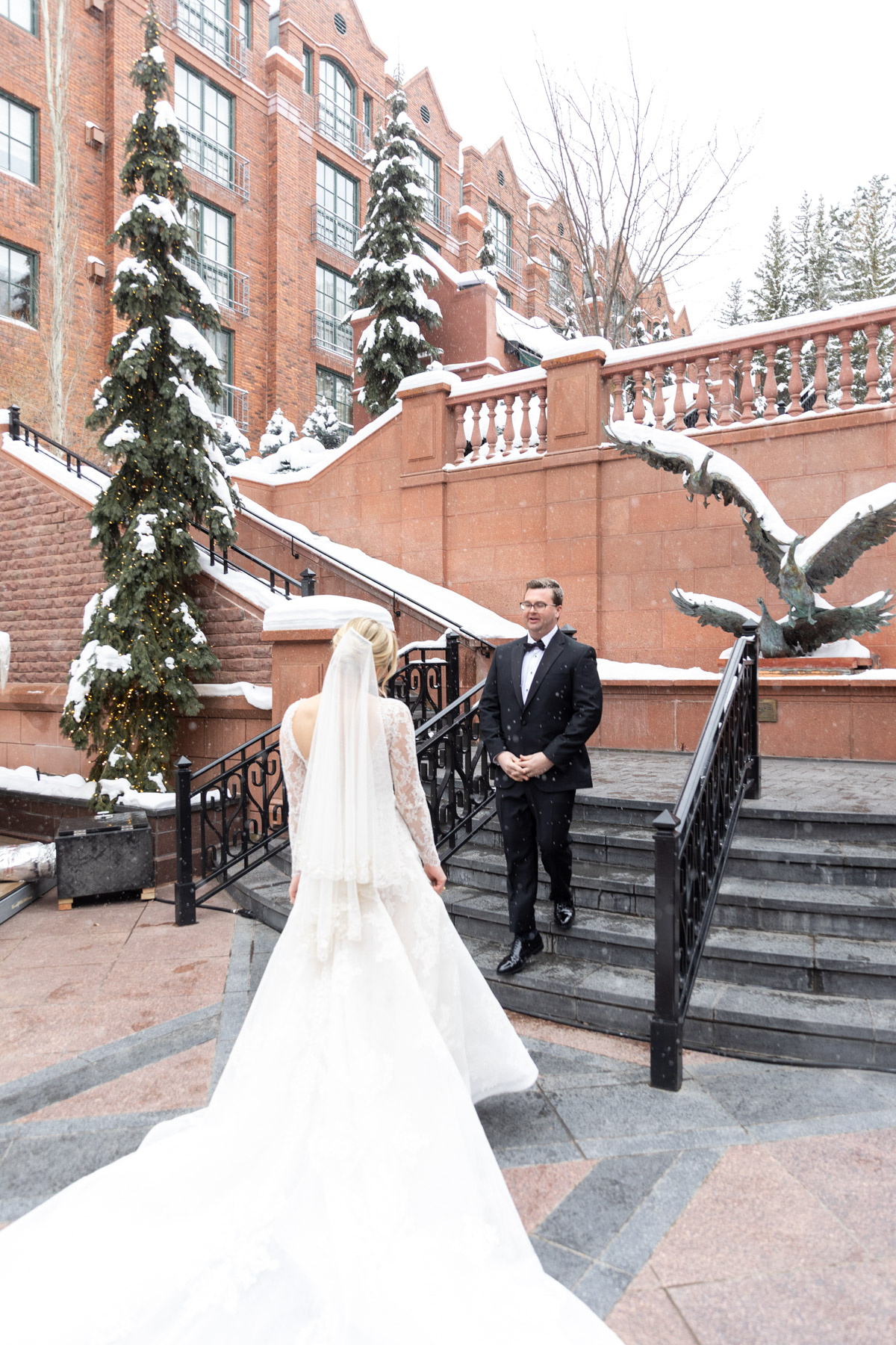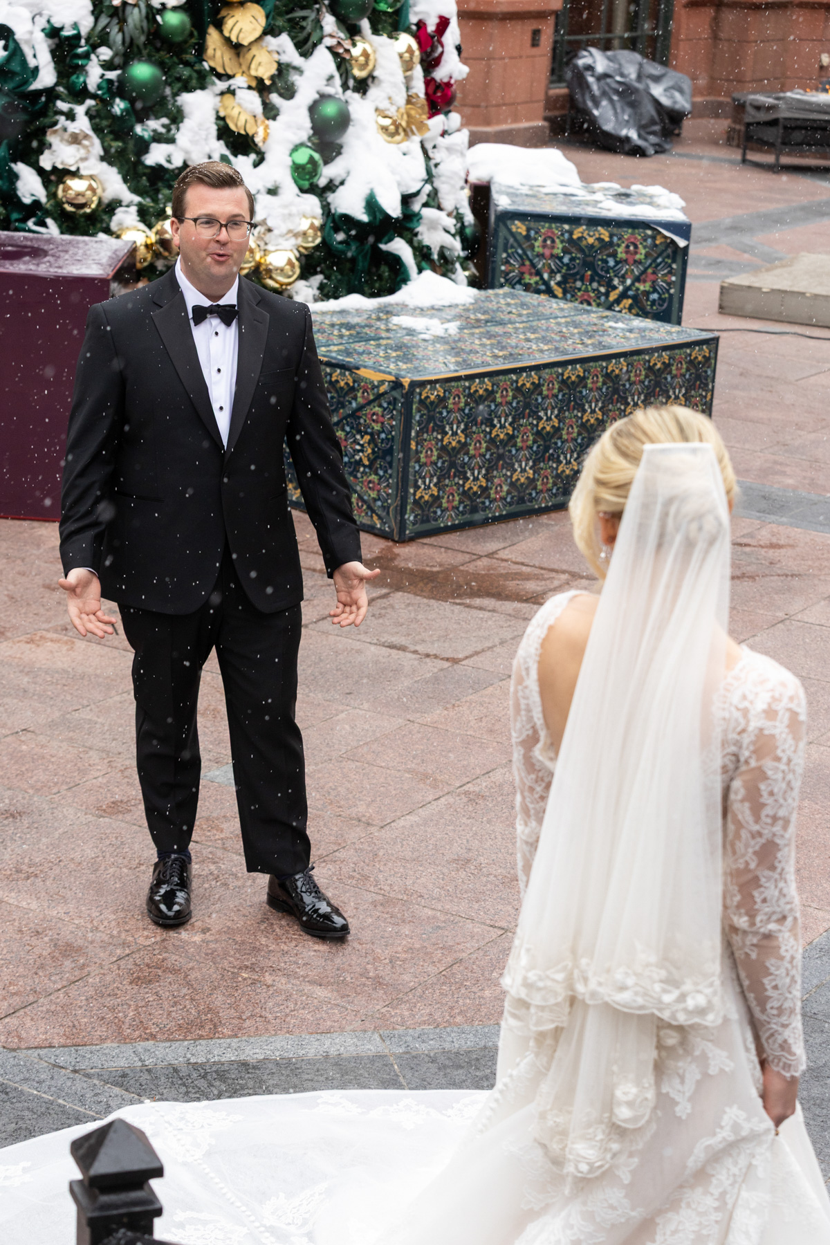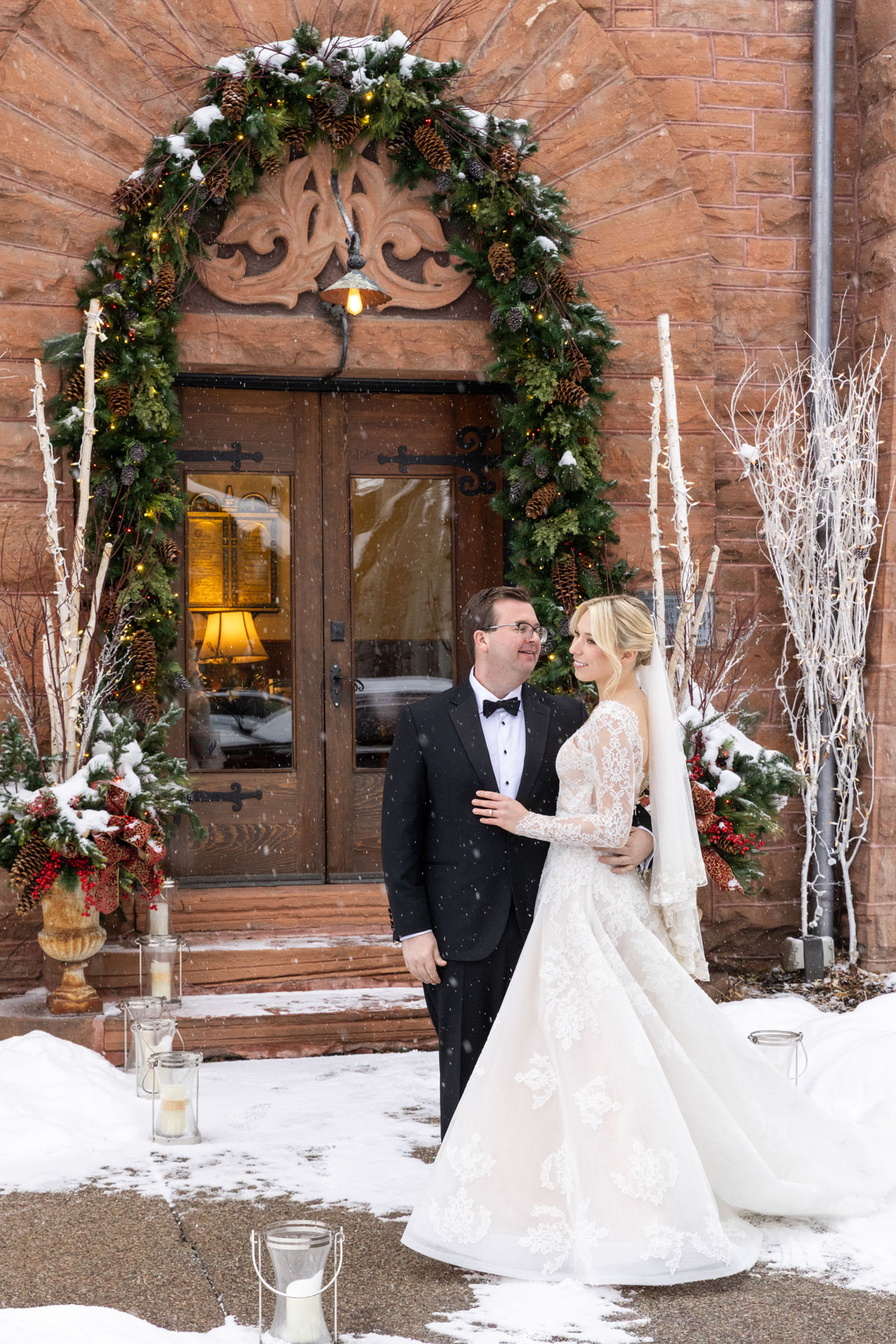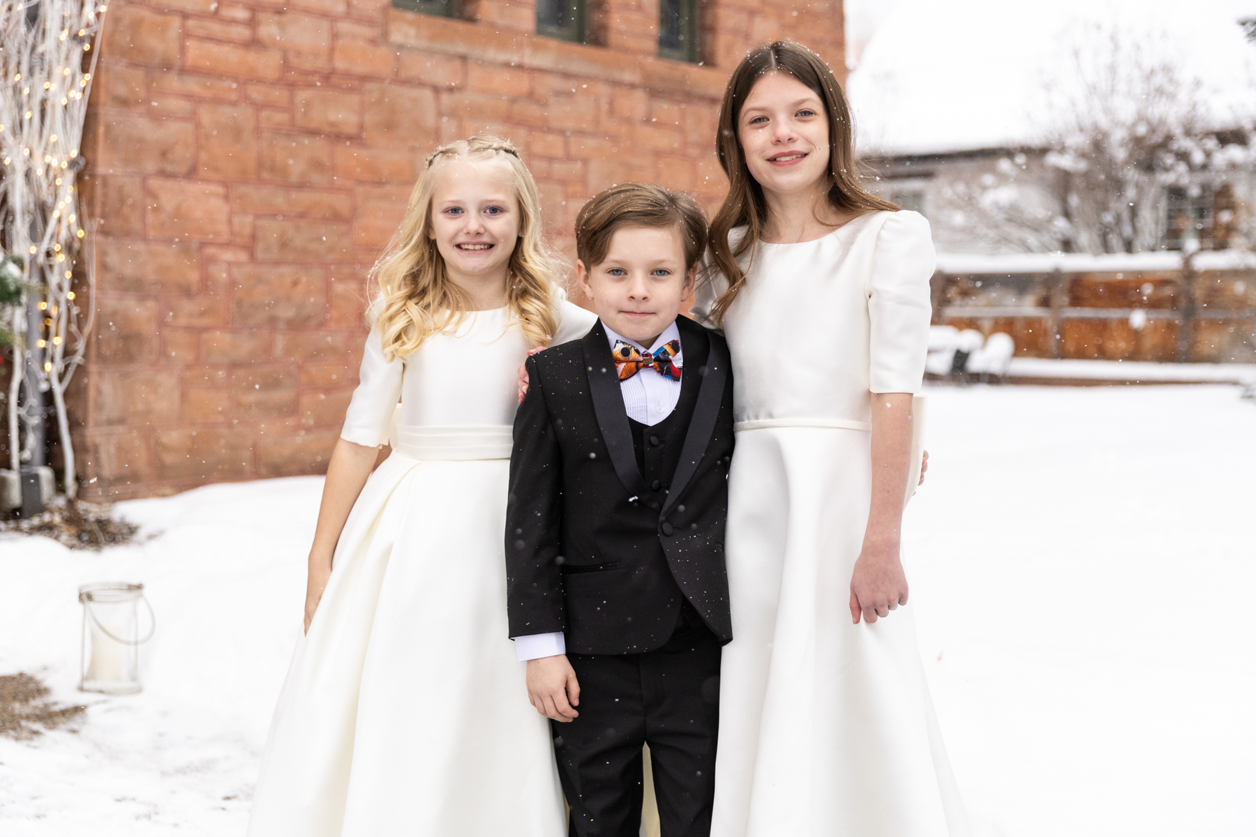 The ceremony itself unfolded with intention and grace. Faith, family, and tradition guided each moment, from scripture readings by Grace’s niece and nephew to the measured pacing that allowed the significance of the moment to truly land. Even with the grandeur of the setting and snowfall outside, the ceremony remained intimate: focused less on spectacle and more on meaning.