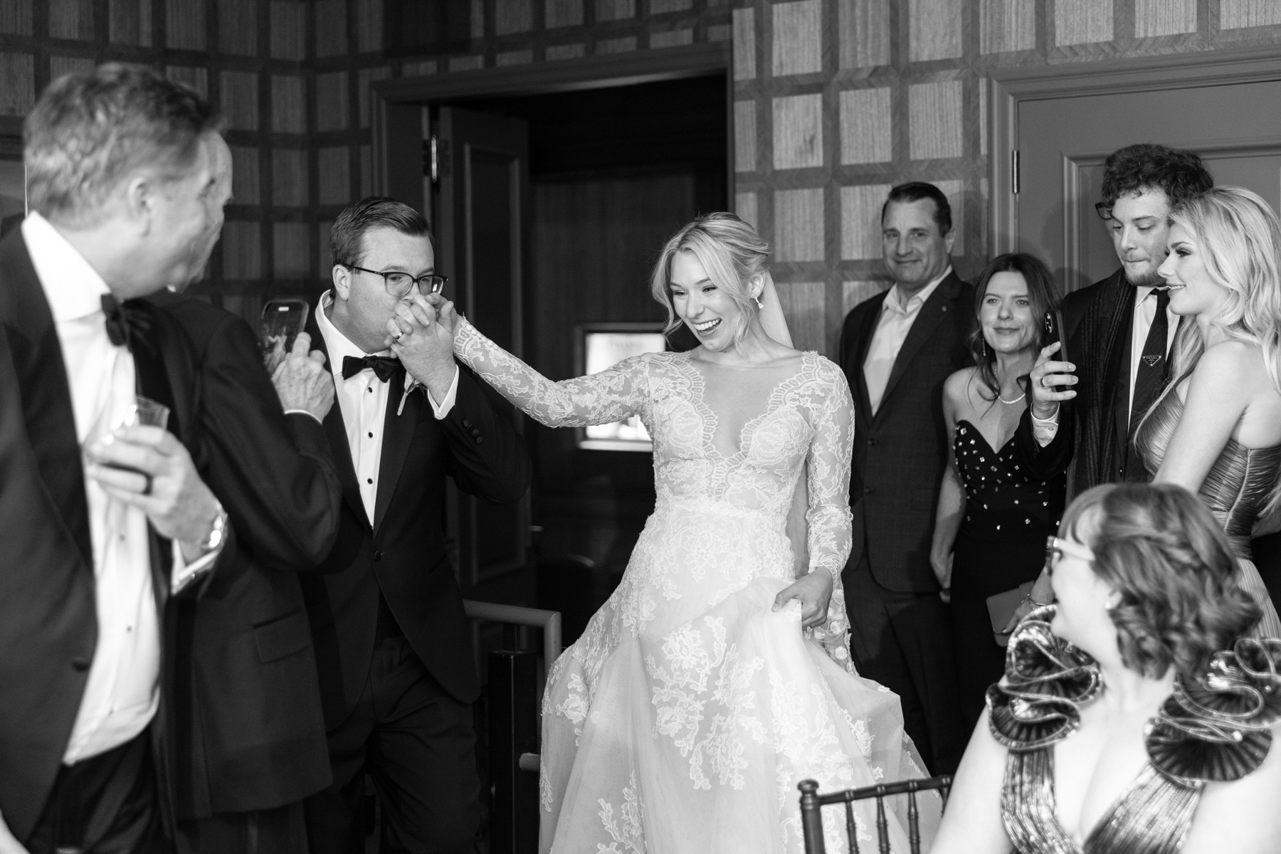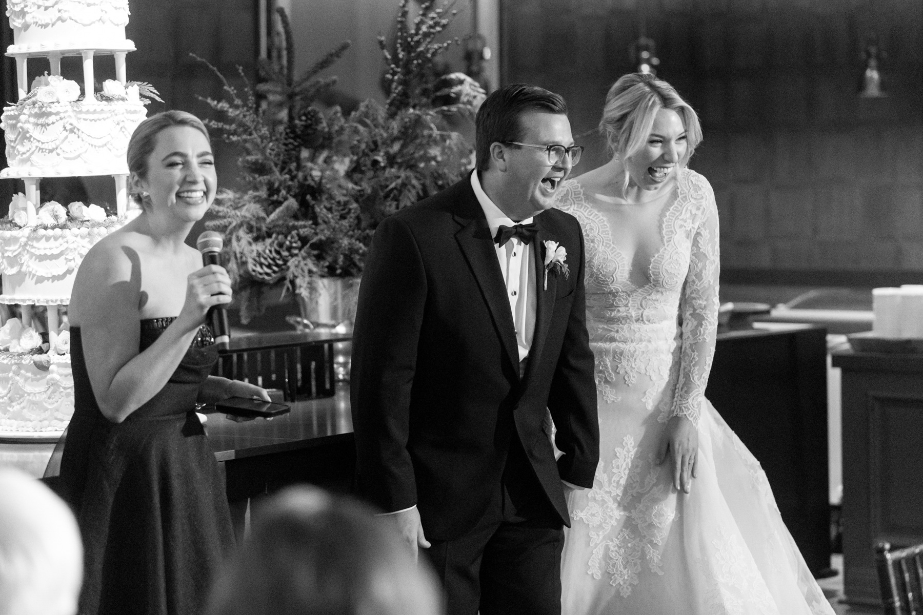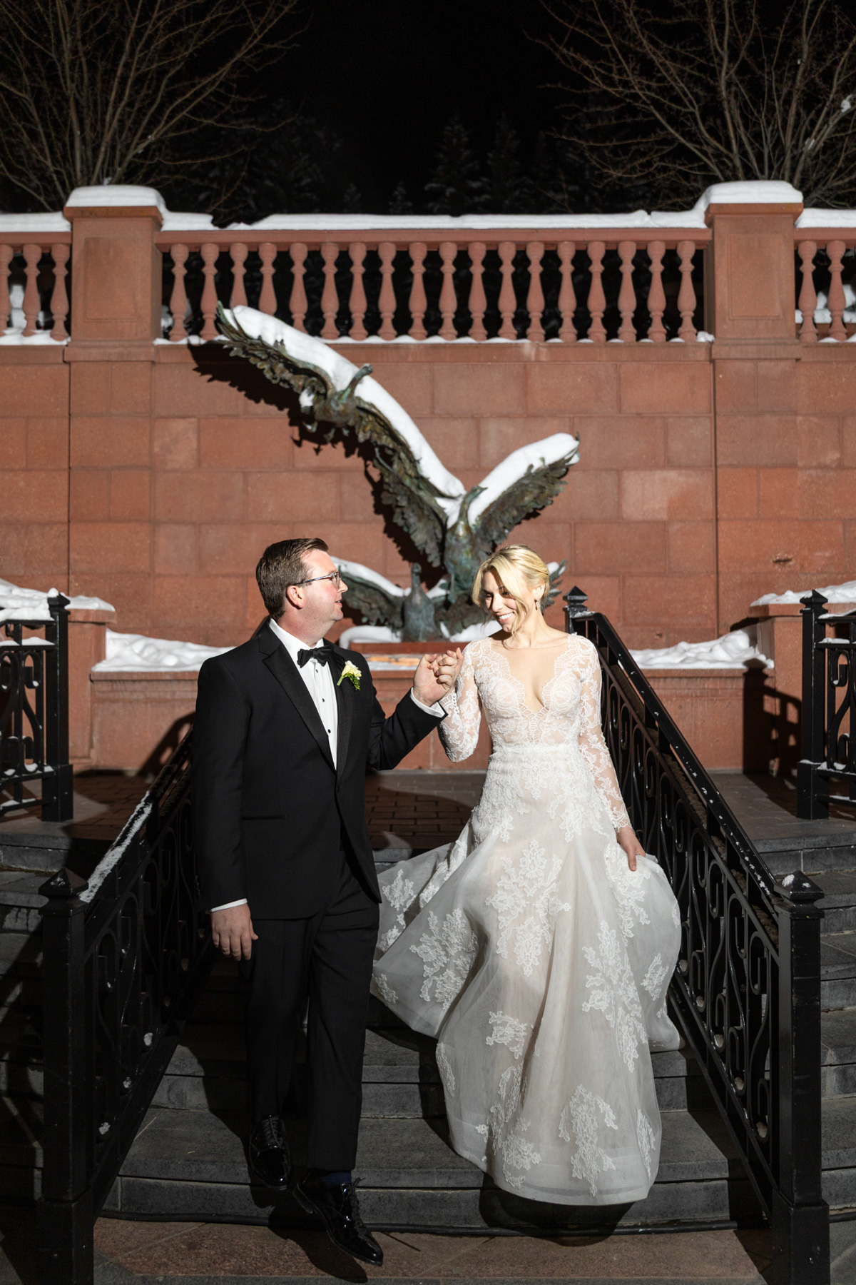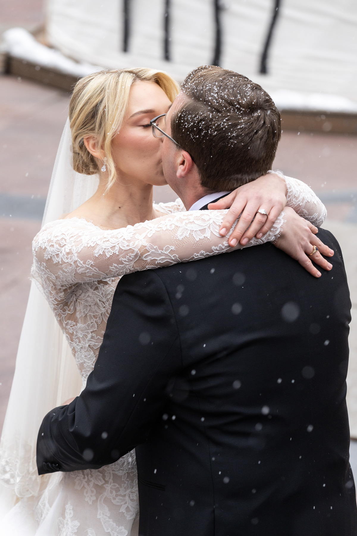 The ceremony itself unfolded with intention and grace. Faith, family, and tradition guided each moment, from scripture readings by Grace’s niece and nephew to the measured pacing that allowed the significance of the moment to truly land. Even with the grandeur of the setting and snowfall outside, the ceremony remained intimate: focused less on spectacle and more on meaning.