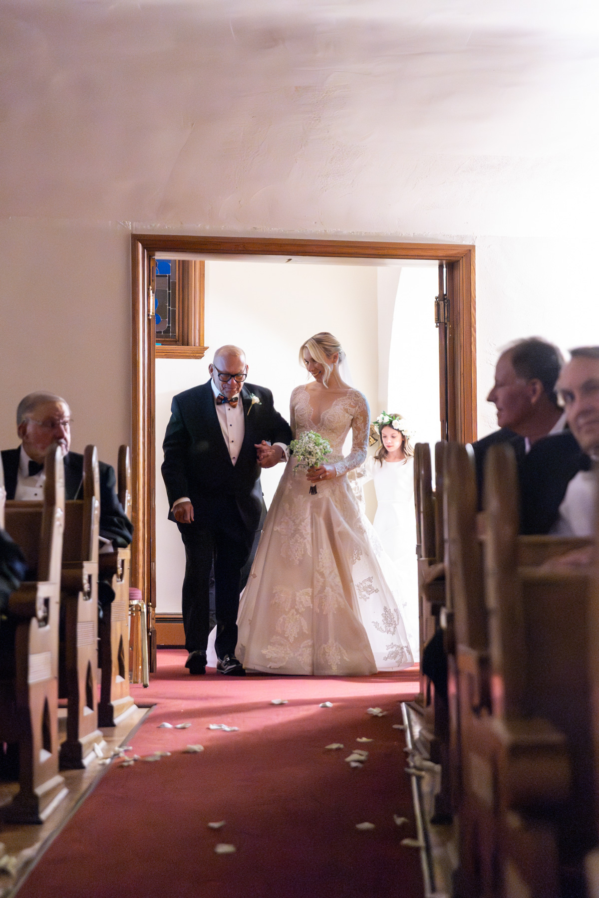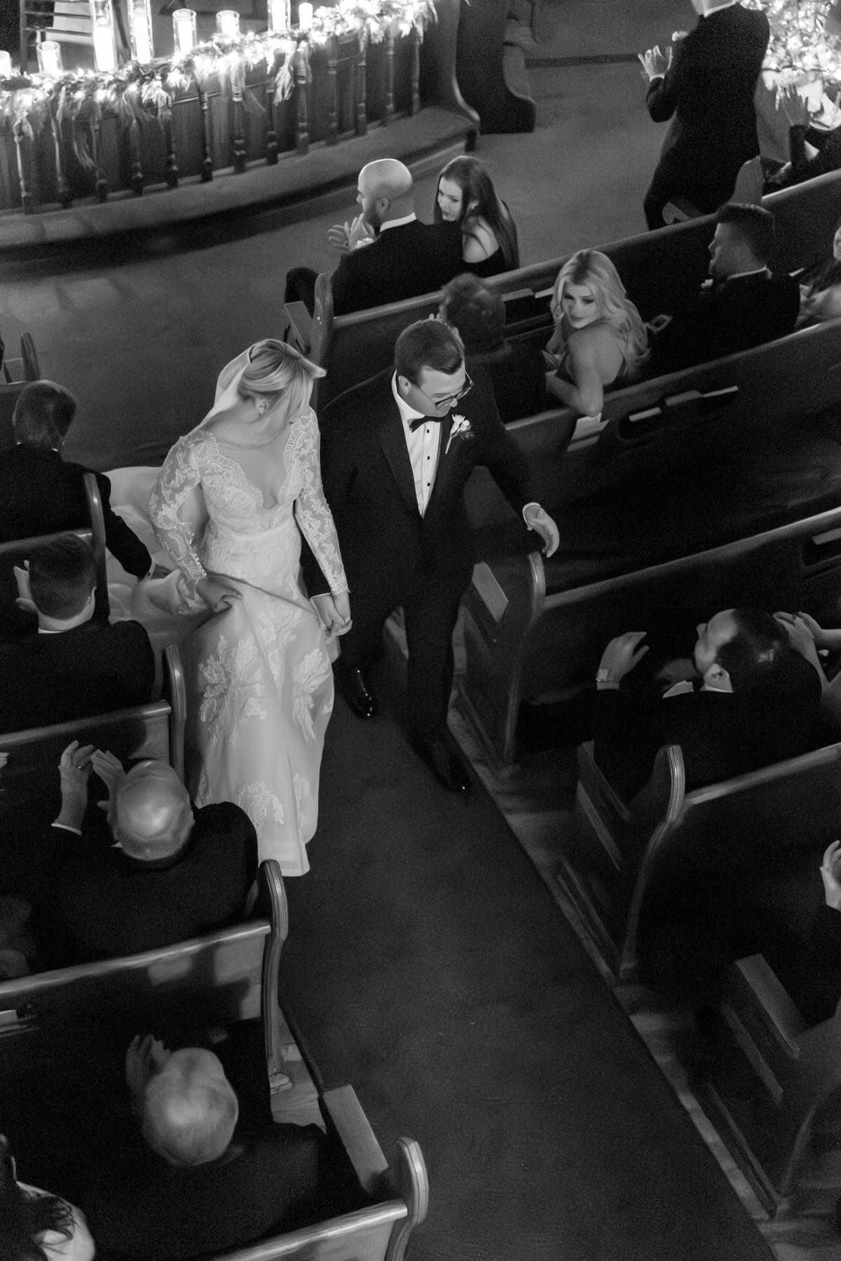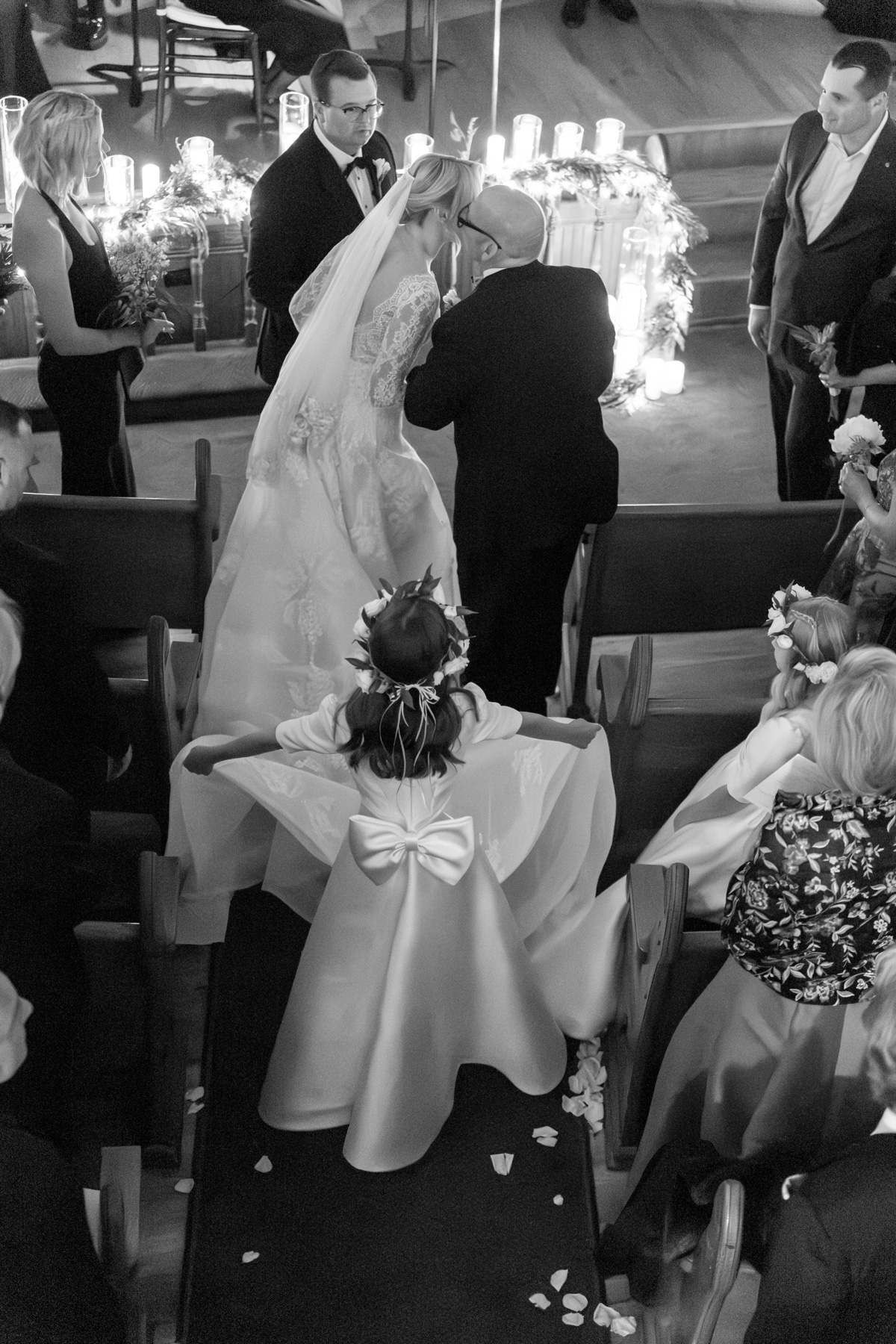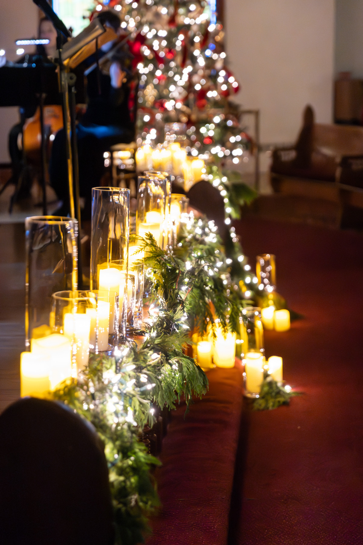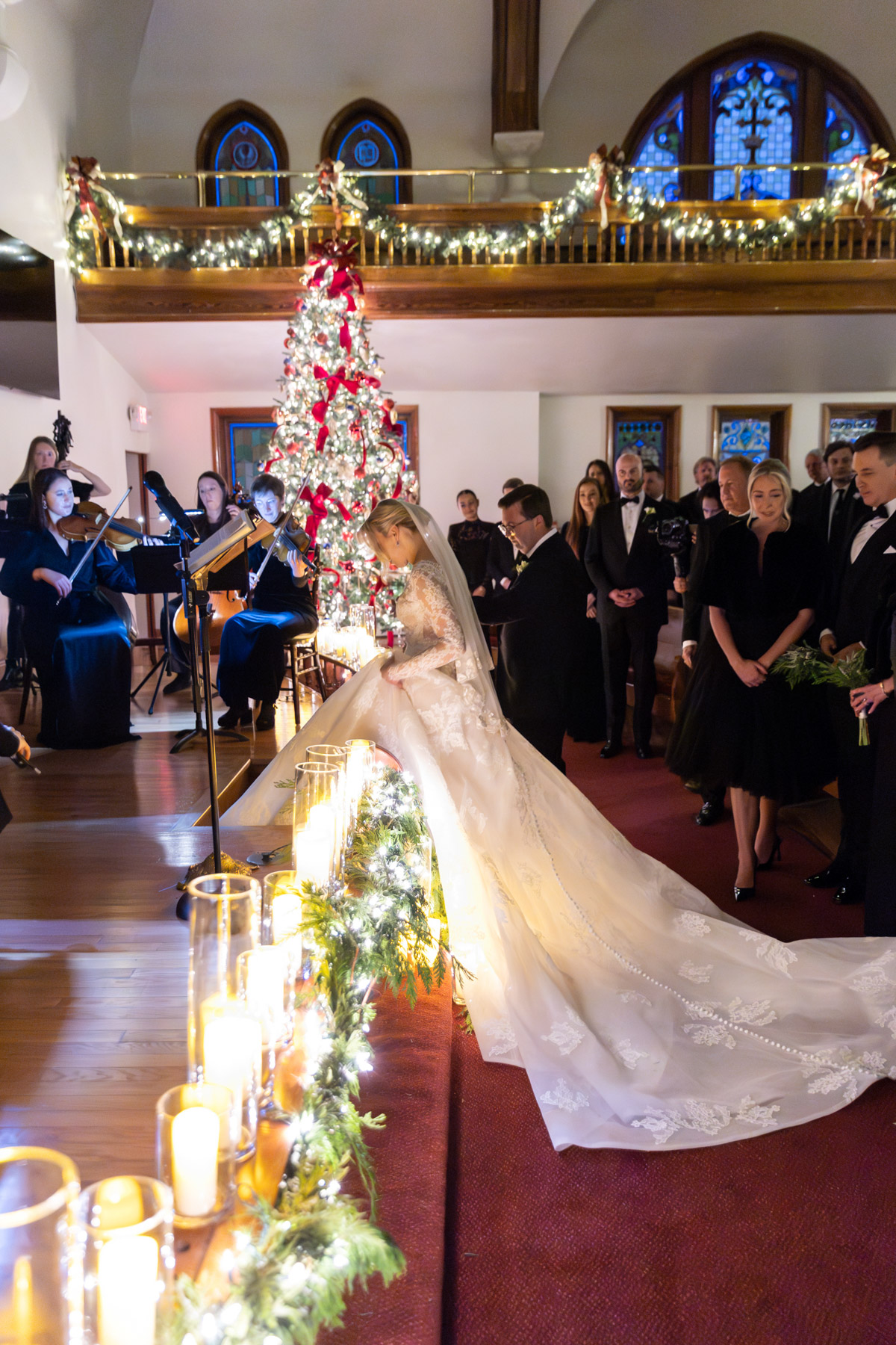 As snow continued to fall, the ceremony felt almost cinematic. Candlelight filled the church while music took center stage well before guests were seated. Two string quartets and a pianist created a full, orchestral sound, transforming the prelude into an experience of its own. Guests were invited to arrive early simply to listen, allowing the space to settle into a reverent, emotional atmosphere before the ceremony even began.