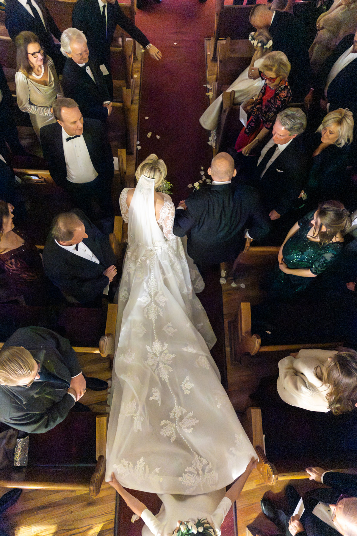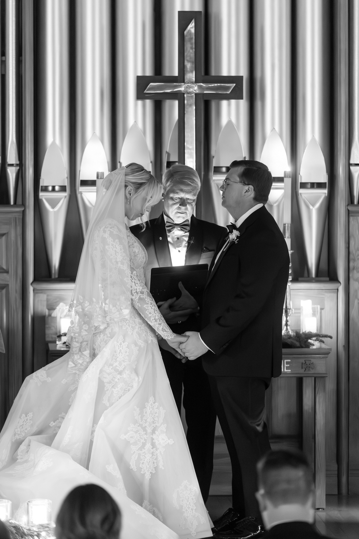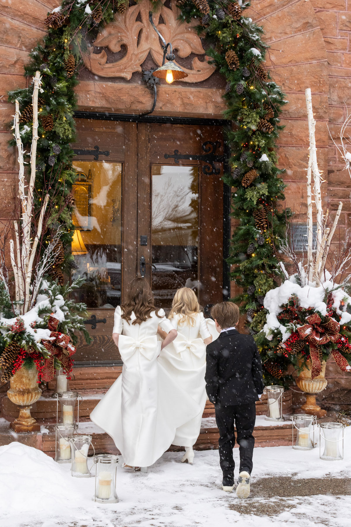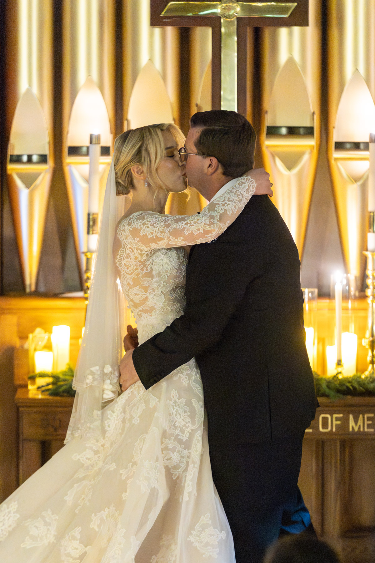 As snow continued to fall, the ceremony felt almost cinematic. Candlelight filled the church while music took center stage well before guests were seated. Two string quartets and a pianist created a full, orchestral sound, transforming the prelude into an experience of its own. Guests were invited to arrive early simply to listen, allowing the space to settle into a reverent, emotional atmosphere before the ceremony even began.