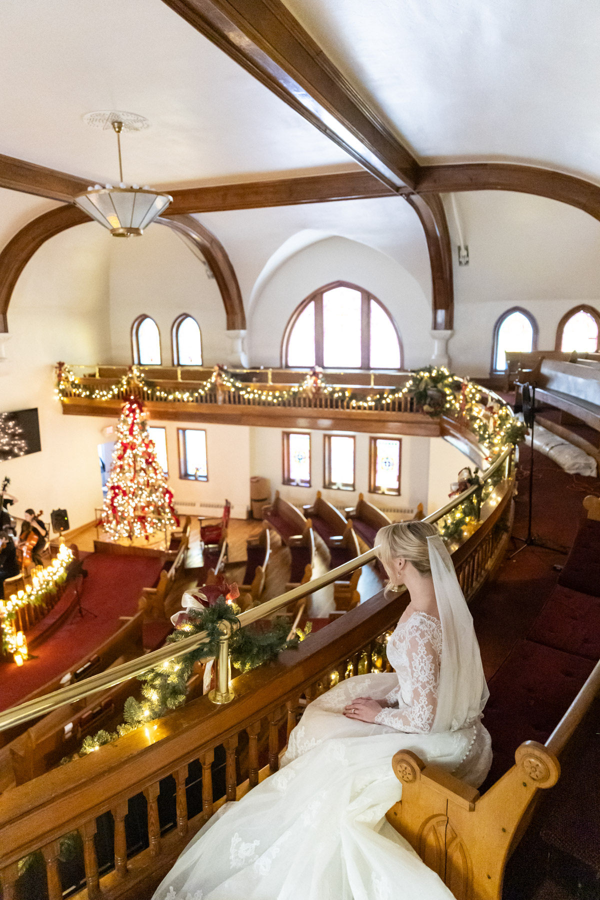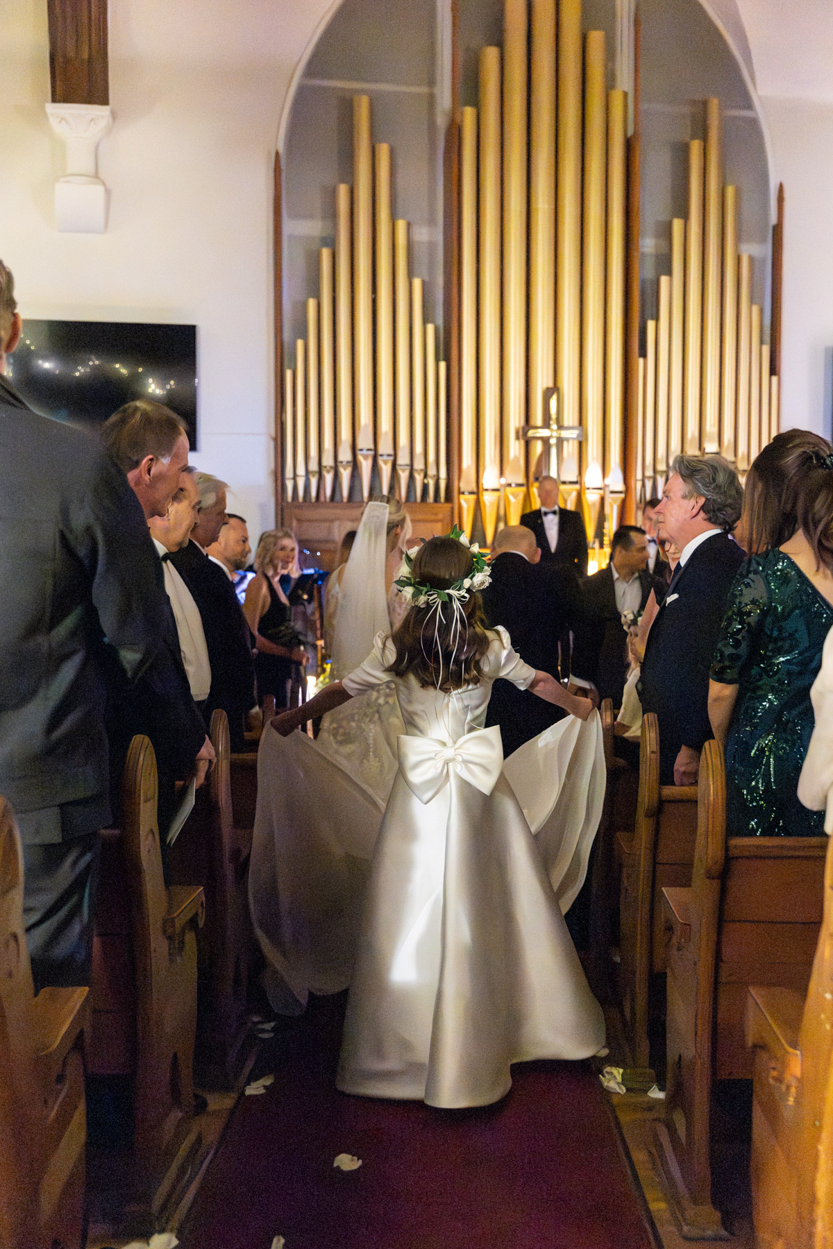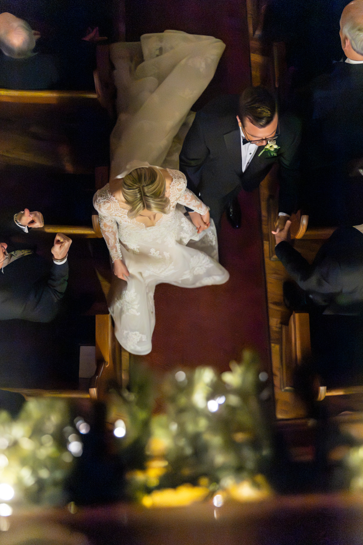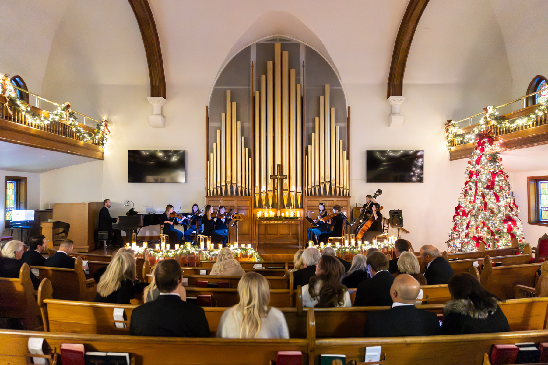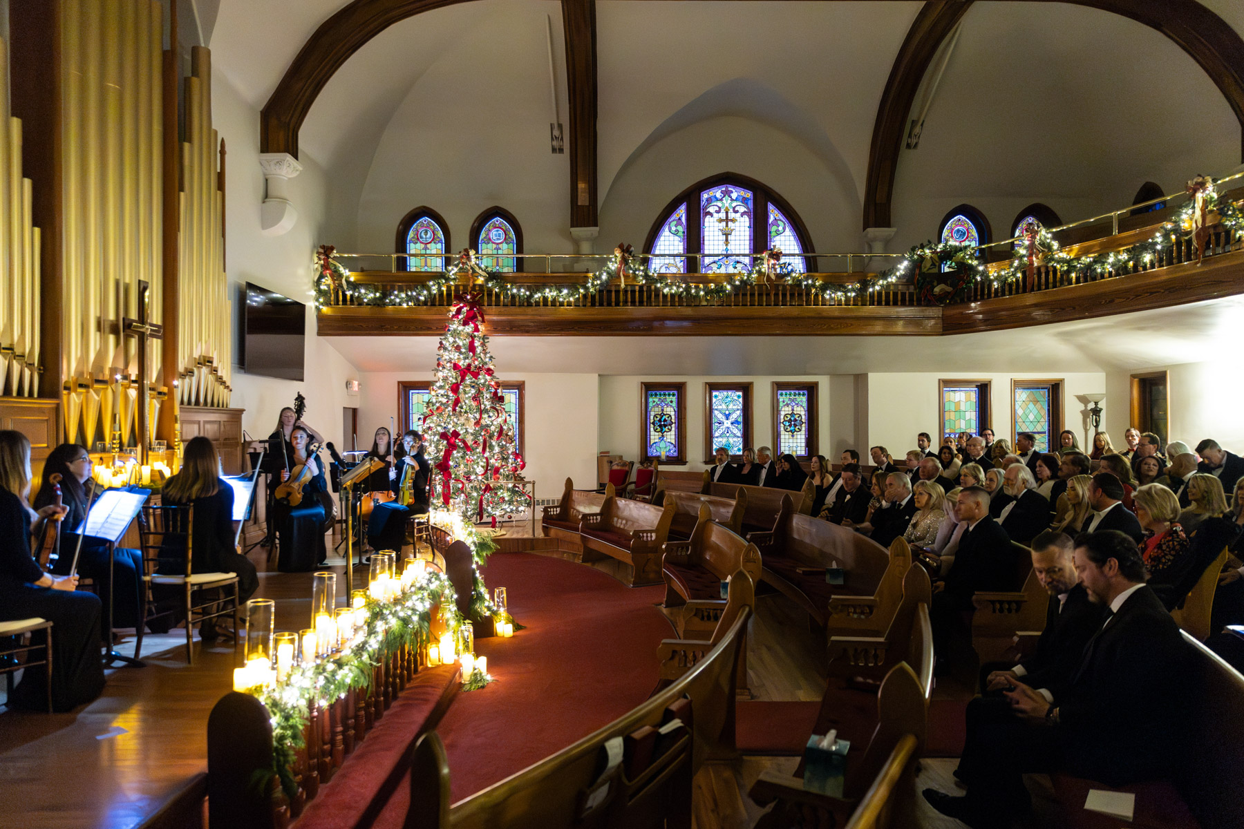 As snow continued to fall, the ceremony felt almost cinematic. Candlelight filled the church while music took center stage well before guests were seated. Two string quartets and a pianist created a full, orchestral sound, transforming the prelude into an experience of its own. Guests were invited to arrive early simply to listen, allowing the space to settle into a reverent, emotional atmosphere before the ceremony even began.