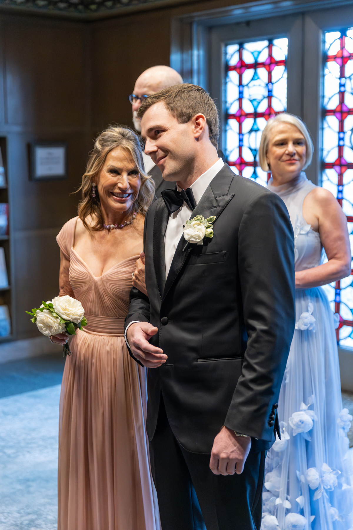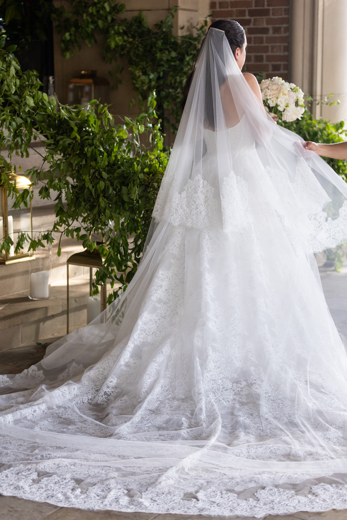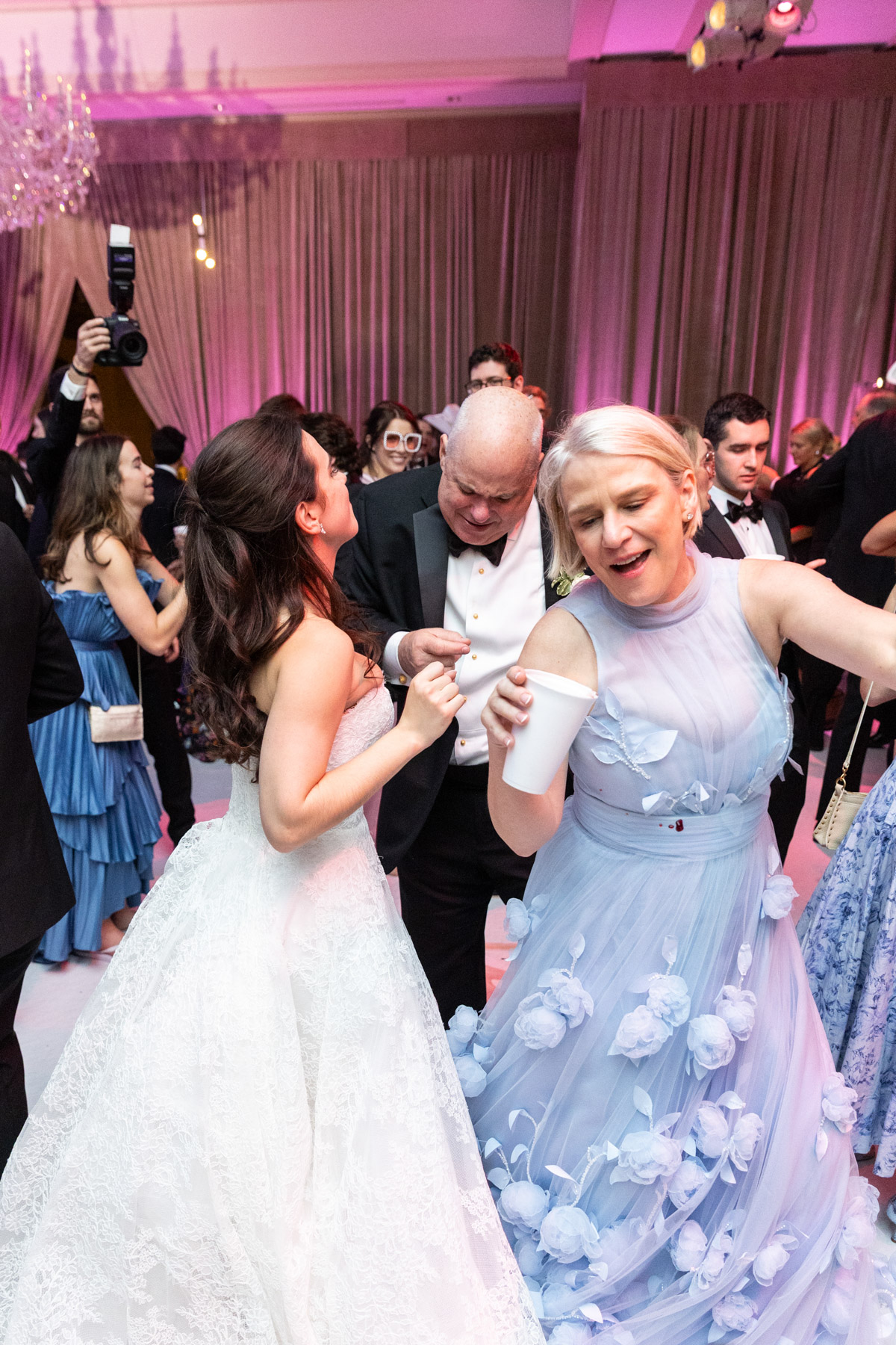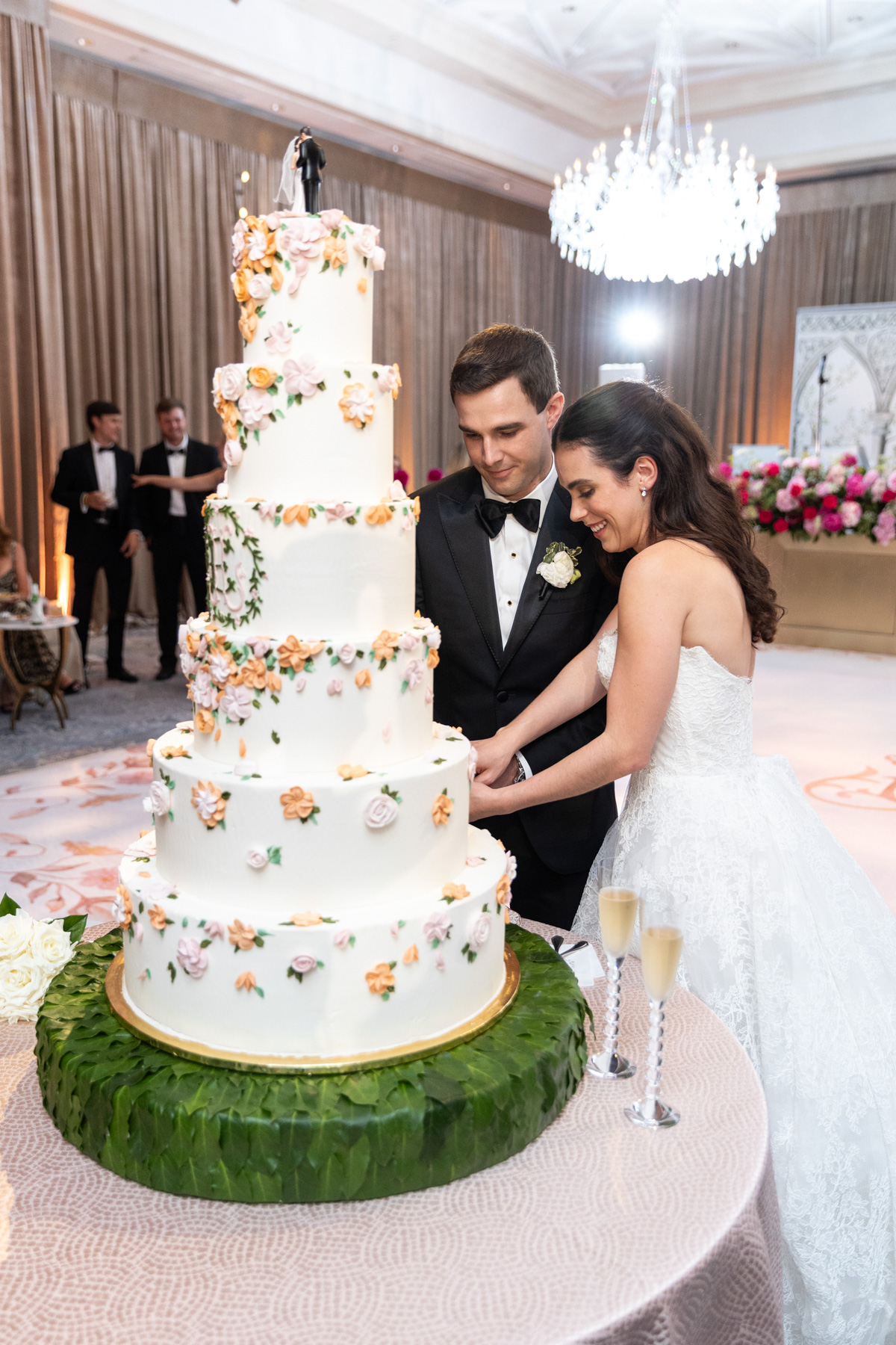 Every detail of the day carried personal meaning, starting with Helen’s wedding attire. Her “something old” was her wedding band, lovingly handmade by Eli himself. In the weeks leading up to their wedding, he melted down scrap platinum in their garage, incorporating the original setting from his mother’s engagement ring. Her “something new” was a custom Monique Lhuillier gown, inspired by elements from several designs she loved across the collection. The couple borrowed their cake-cutting set from Eli’s parents, while Helen’s mother, dressed in a stunning blue gown, became her “something blue.”