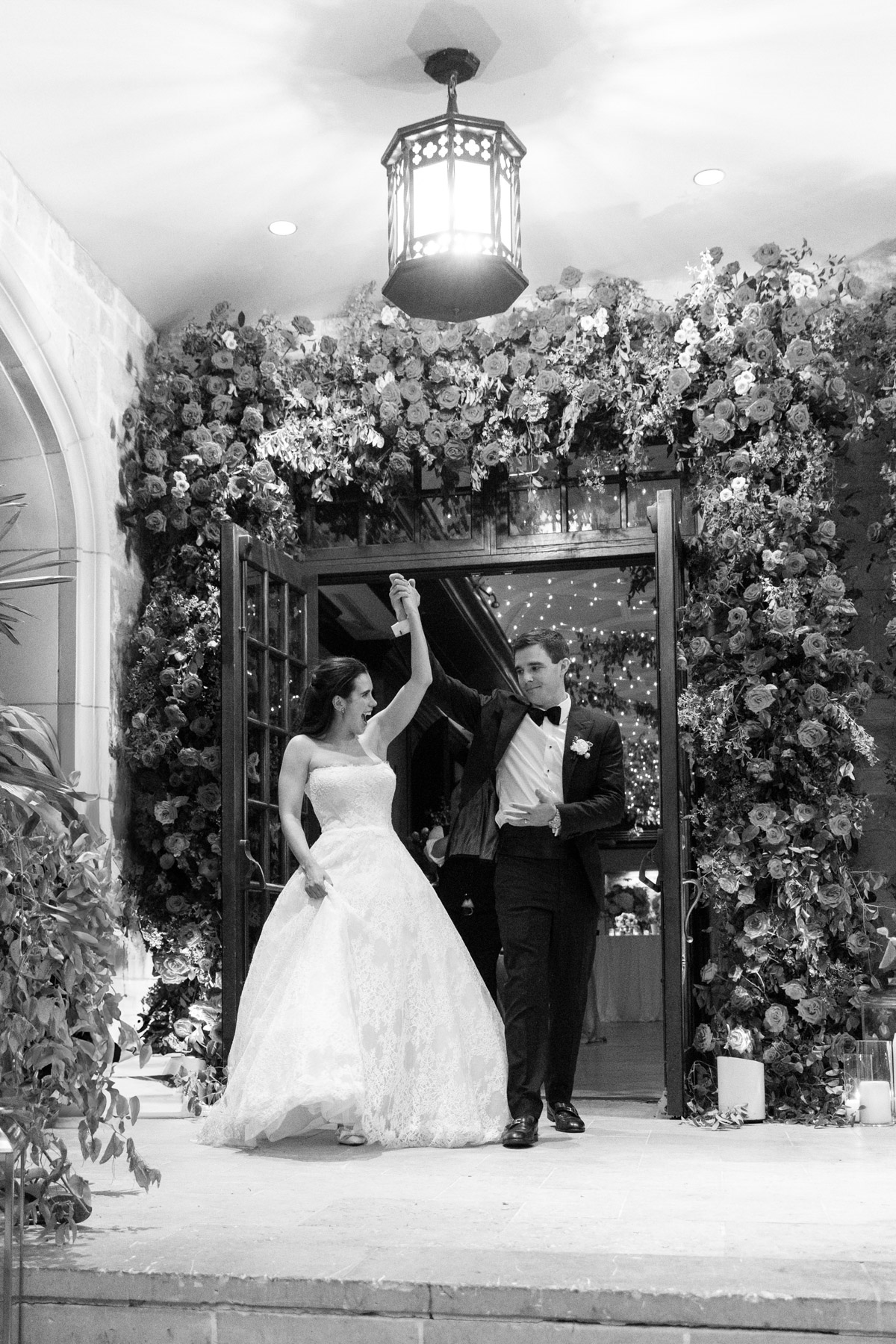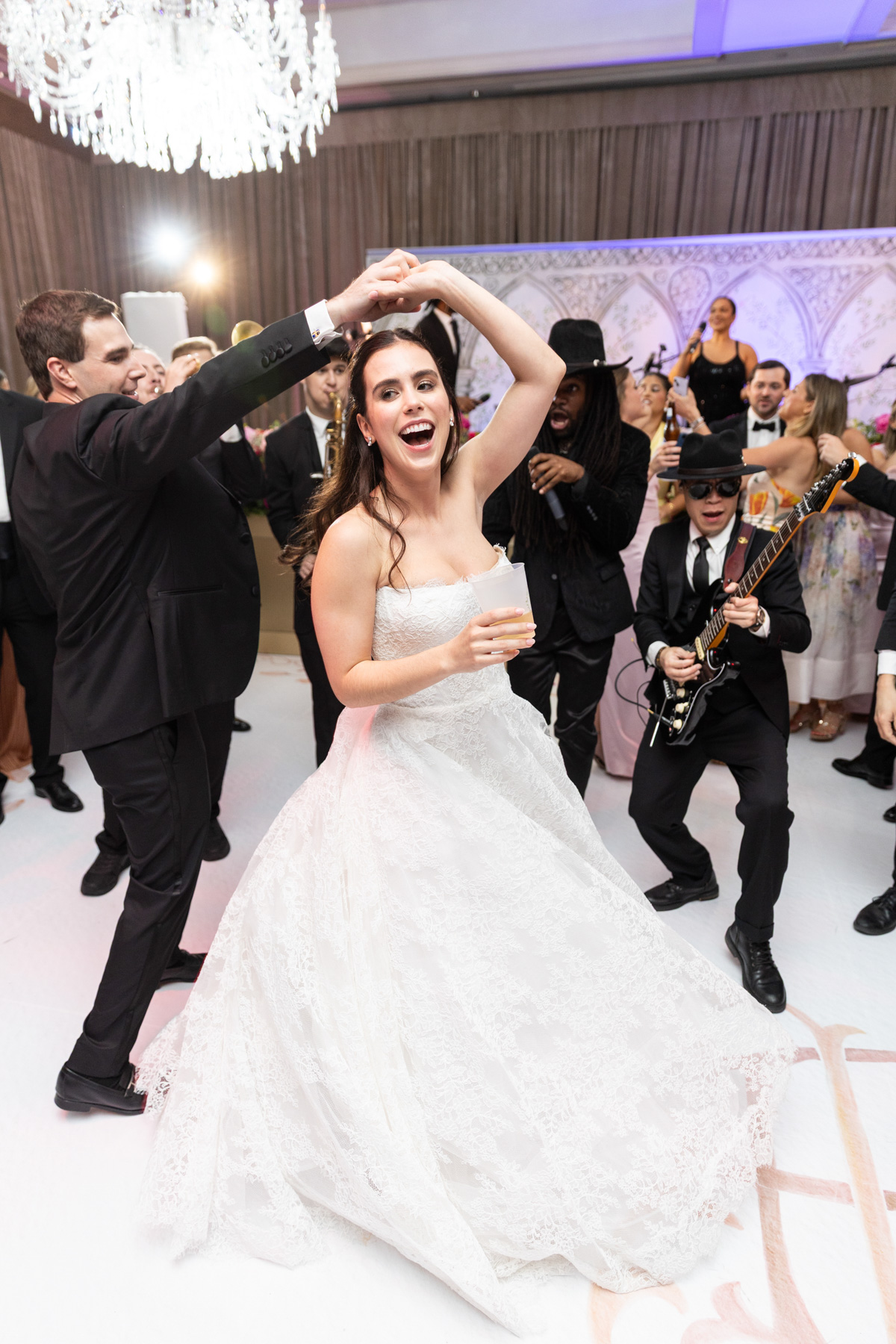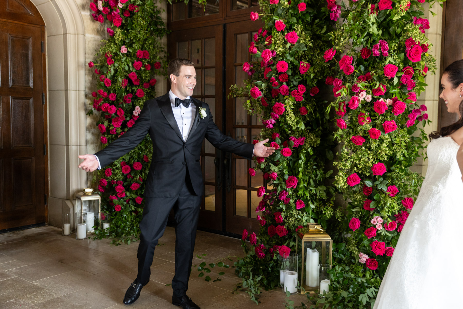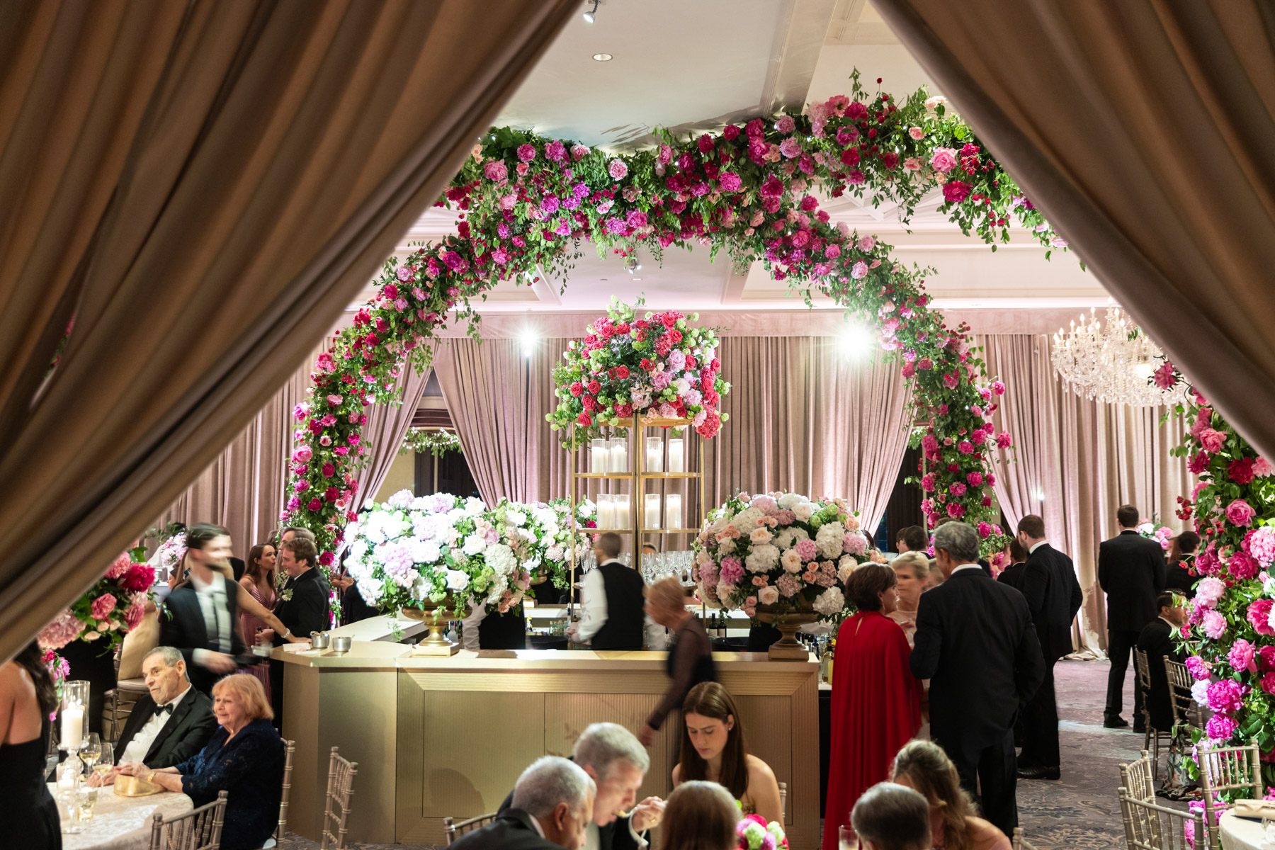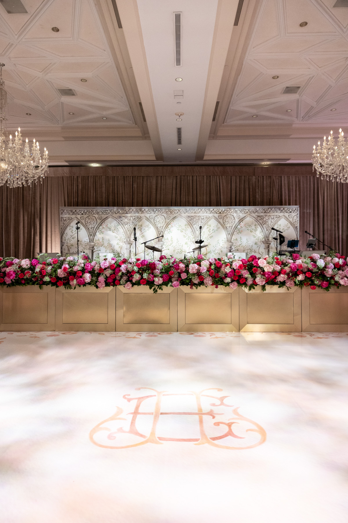 Helen and Eli also infused their love story into the design in unexpected ways. One of Helen’s favorite elements was the band backdrop, which she personally sketched to mirror the cloister at Mont-Saint-Michel, the breathtaking French abbey where Eli proposed. The architectural motif became a subtle yet striking focal point of the reception, weaving their engagement story into the heart of their celebration.