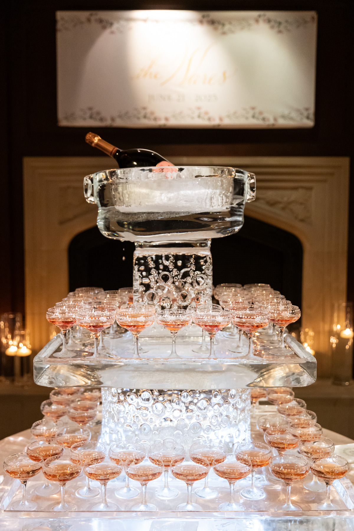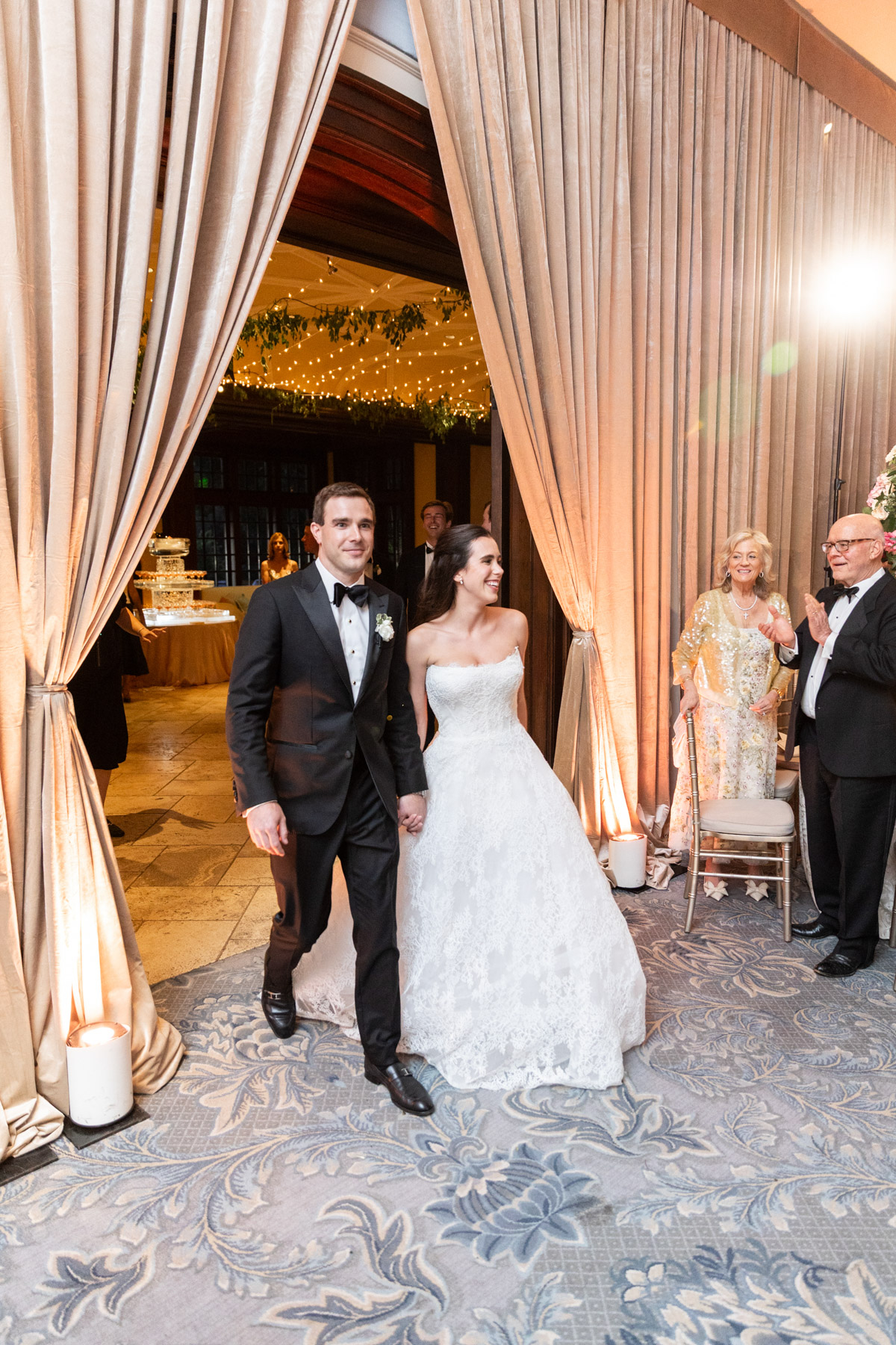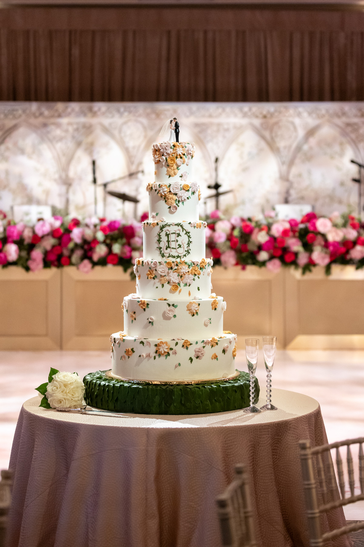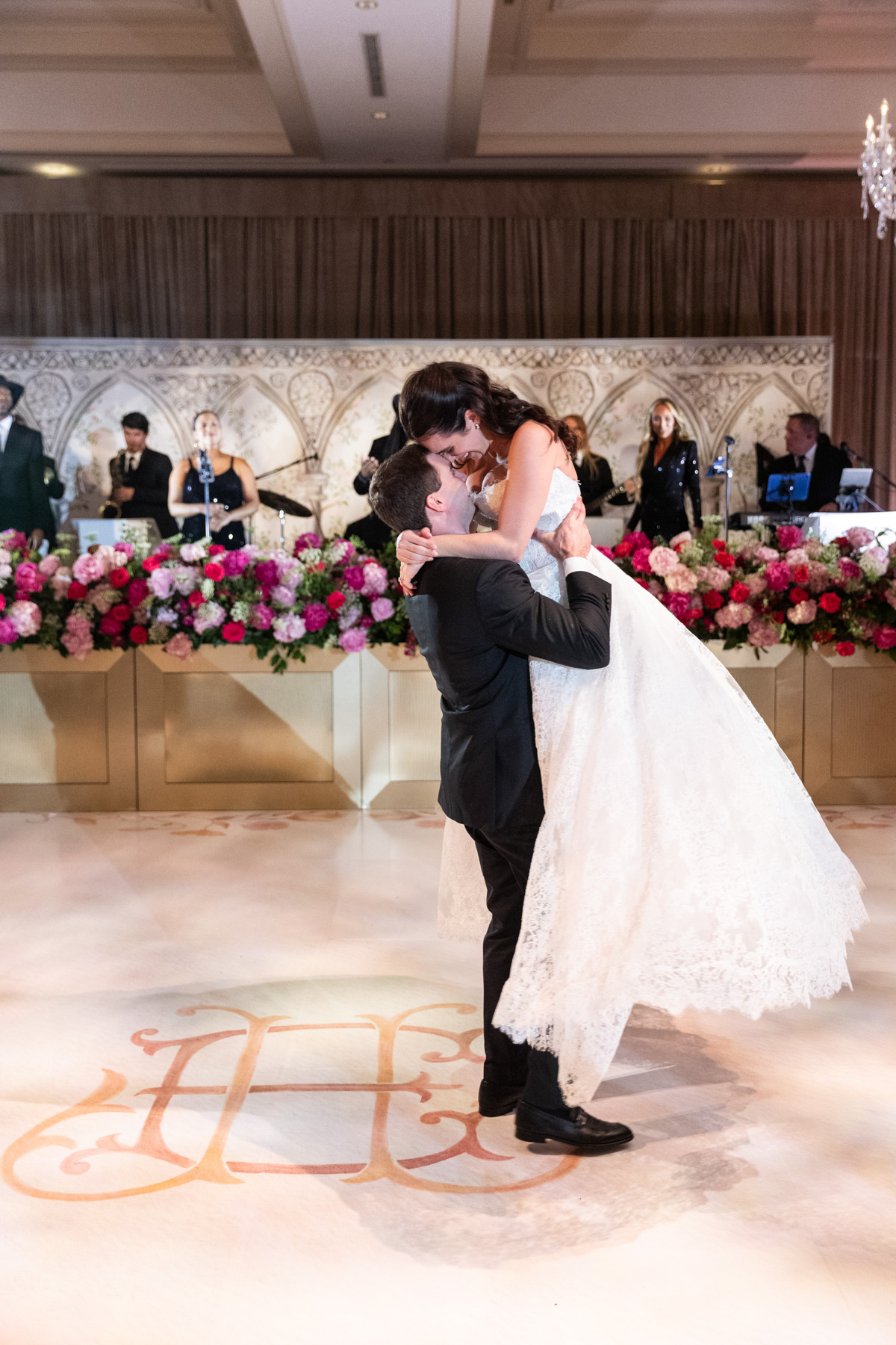 Helen and Eli also infused their love story into the design in unexpected ways. One of Helen’s favorite elements was the band backdrop, which she personally sketched to mirror the cloister at Mont-Saint-Michel, the breathtaking French abbey where Eli proposed. The architectural motif became a subtle yet striking focal point of the reception, weaving their engagement story into the heart of their celebration.