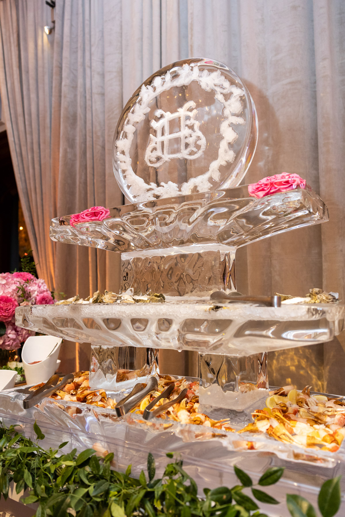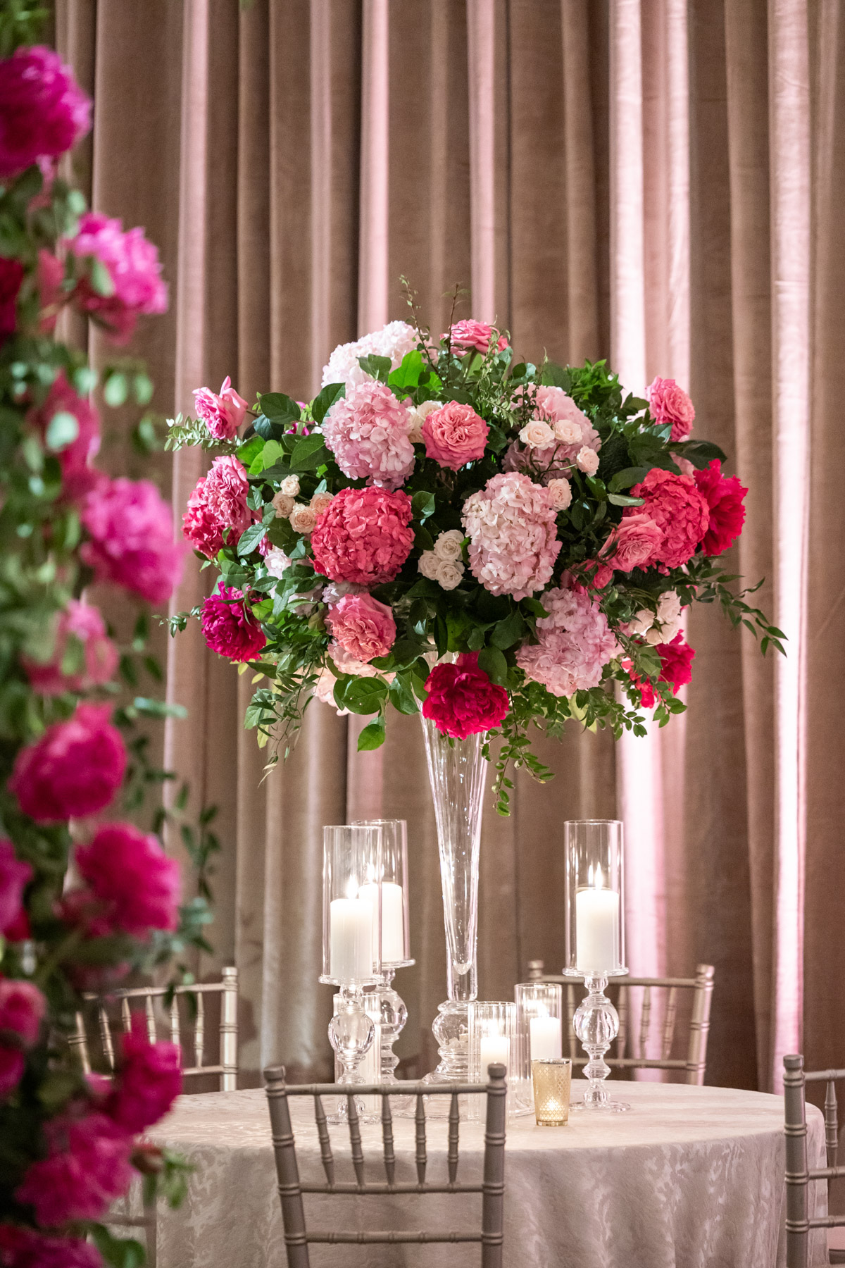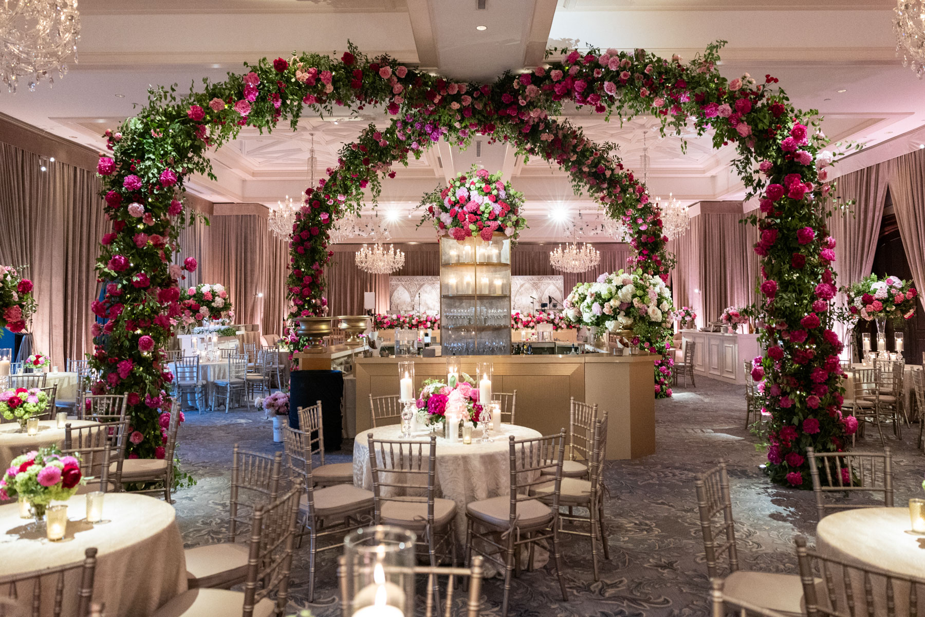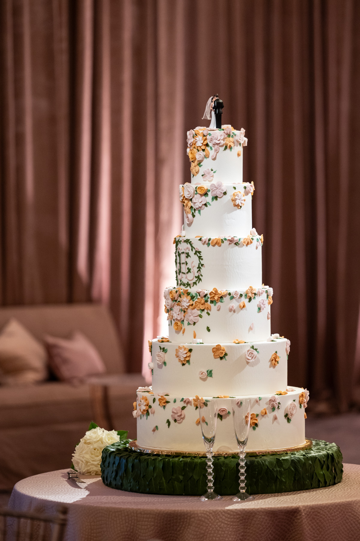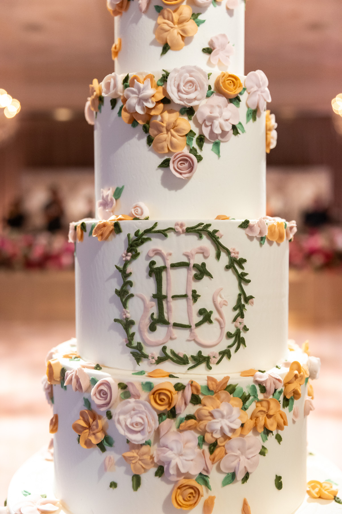 Helen and Eli also infused their love story into the design in unexpected ways. One of Helen’s favorite elements was the band backdrop, which she personally sketched to mirror the cloister at Mont-Saint-Michel, the breathtaking French abbey where Eli proposed. The architectural motif became a subtle yet striking focal point of the reception, weaving their engagement story into the heart of their celebration.