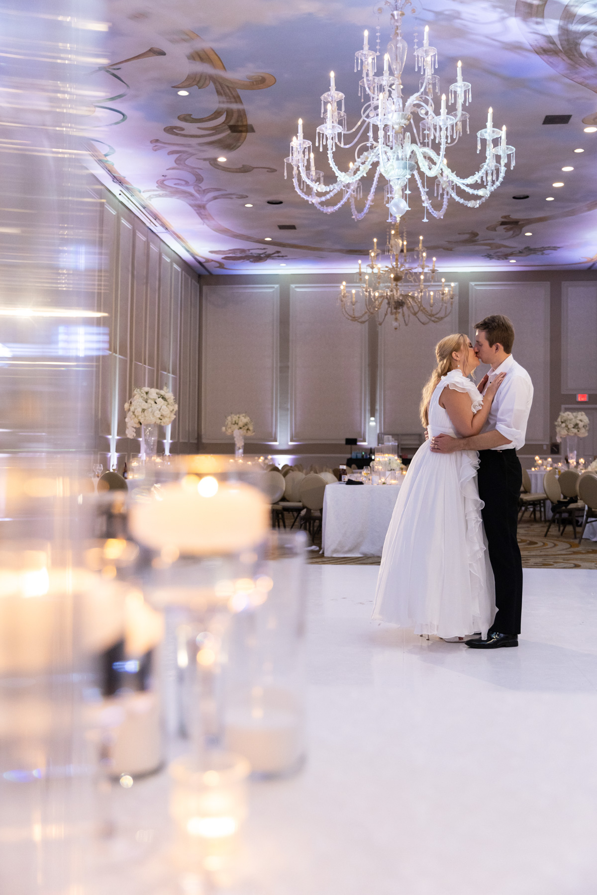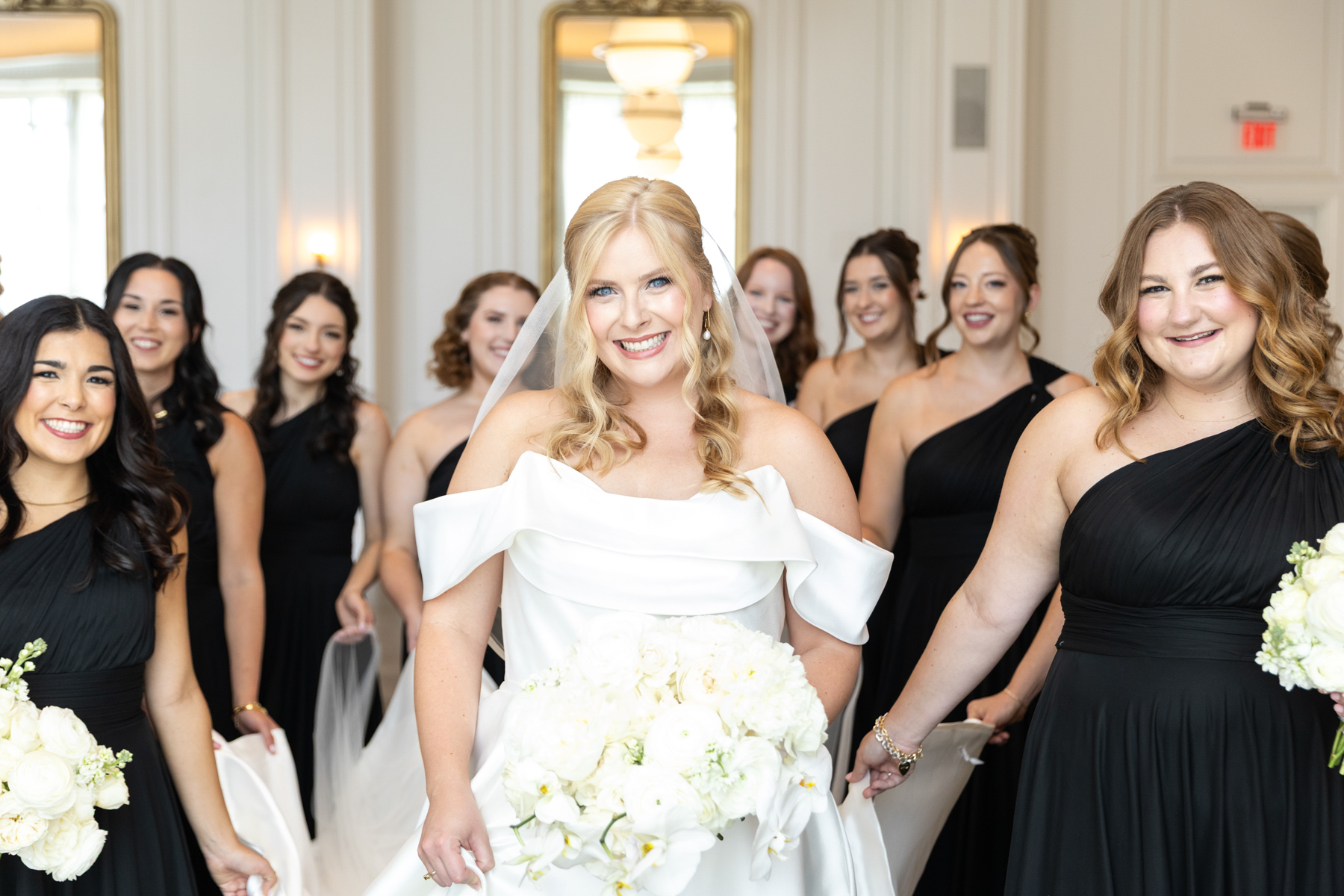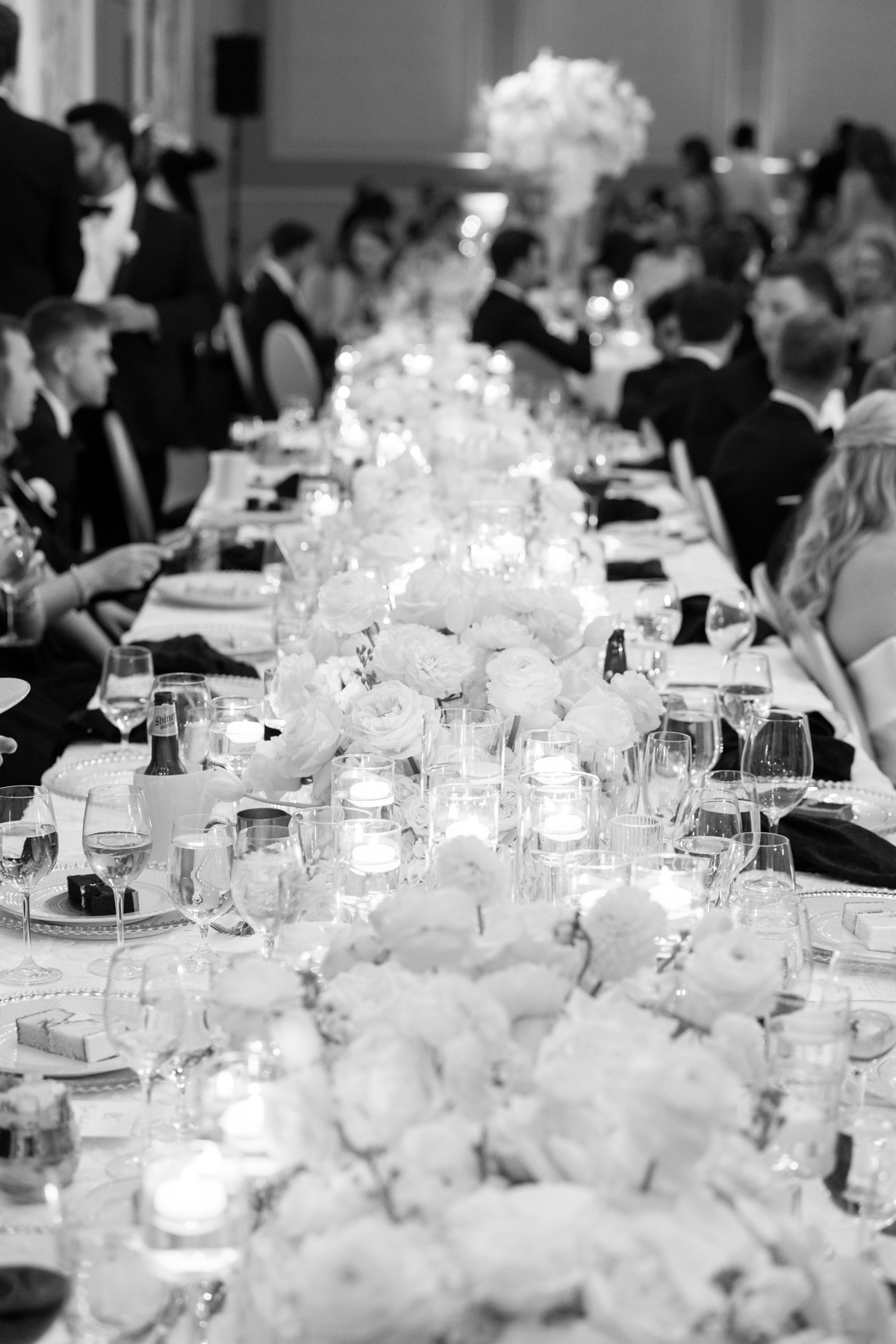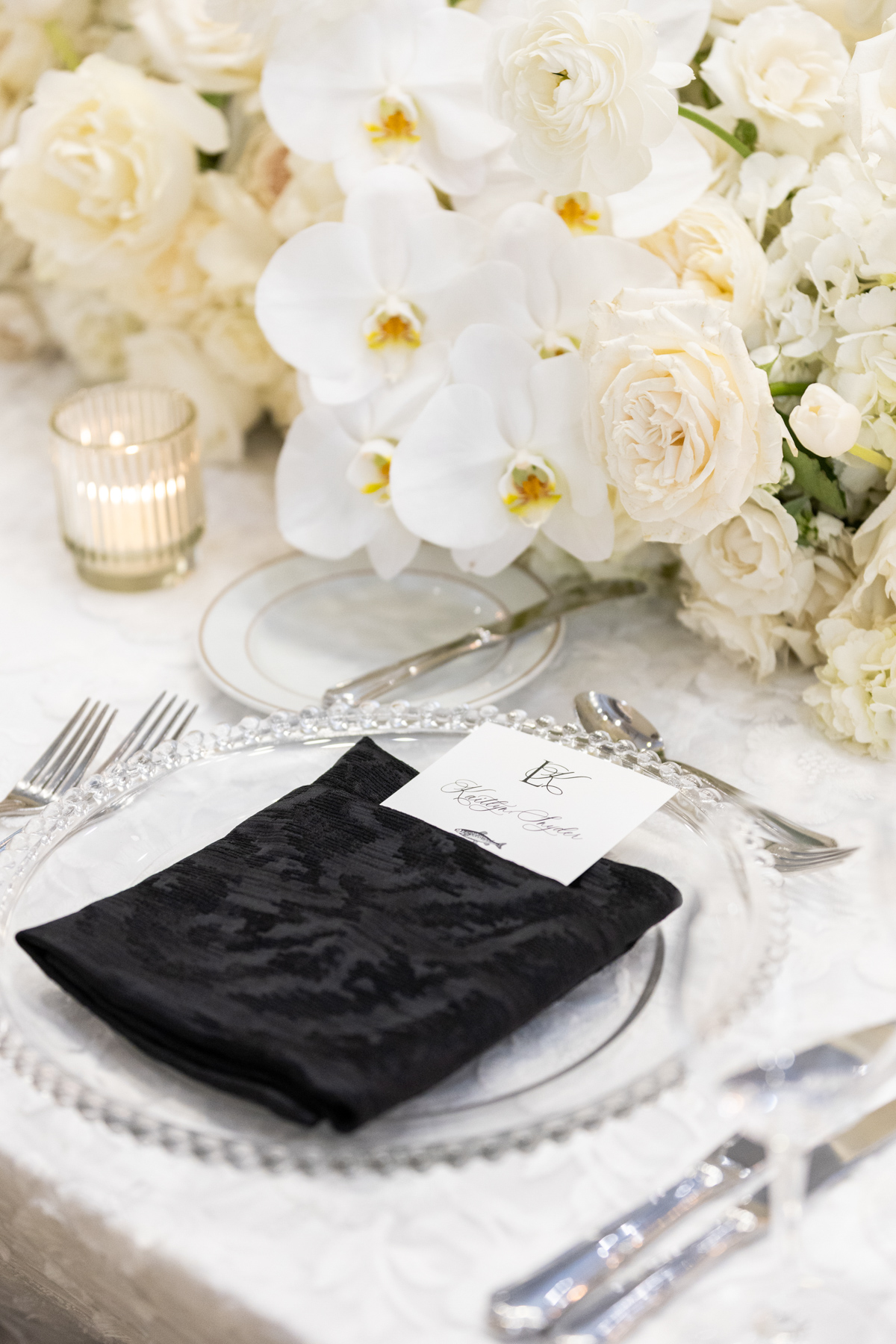 When it came to design, Kaitlyn embraced a classic black-and-white palette with soft candlelight and lush white florals. Though she considered incorporating her favorite color, blue, she ultimately leaned into timeless simplicity. Her bridesmaids, dressed in sleek black gowns, looked effortlessly elegant against the backdrop of The Adolphus ballroom.