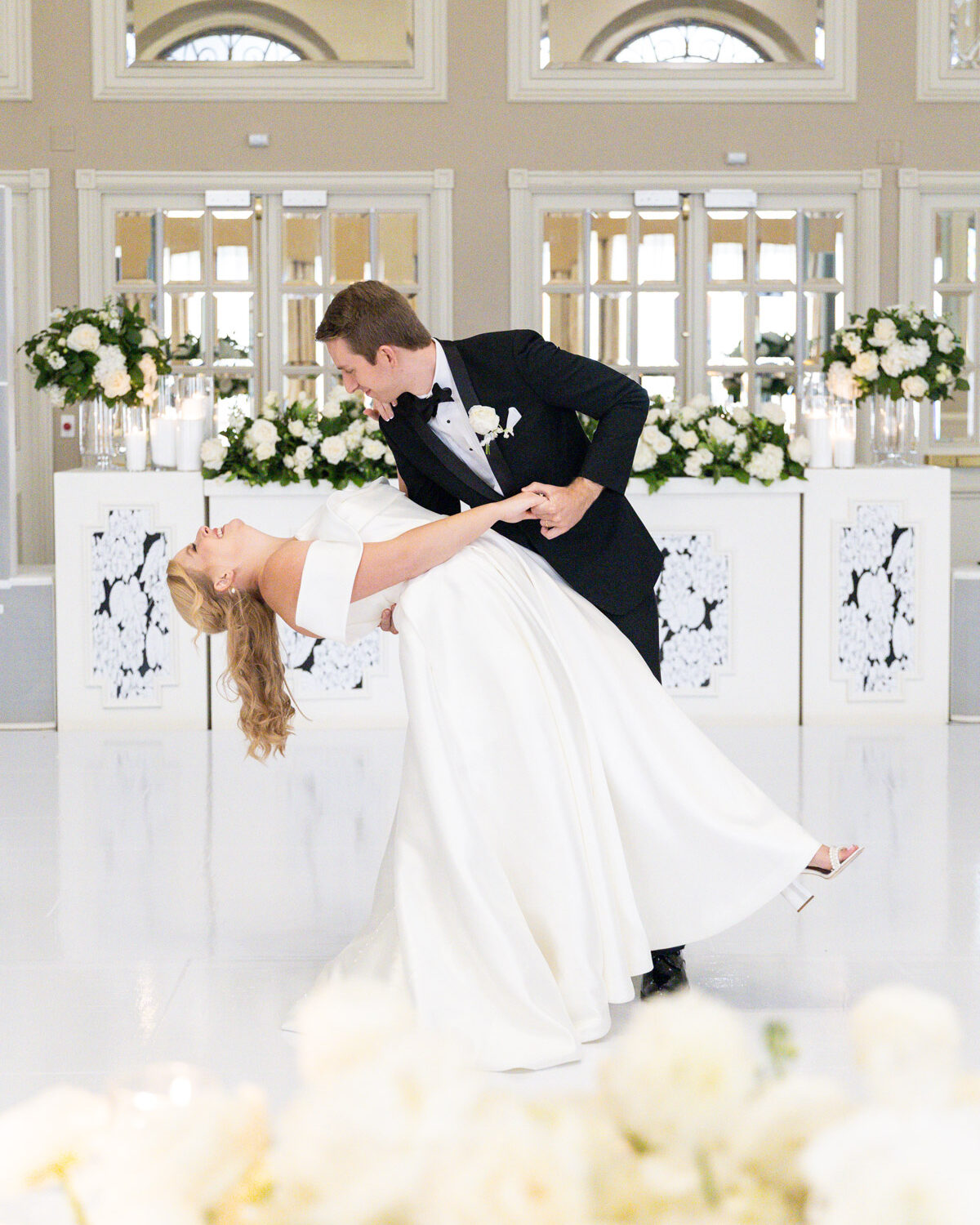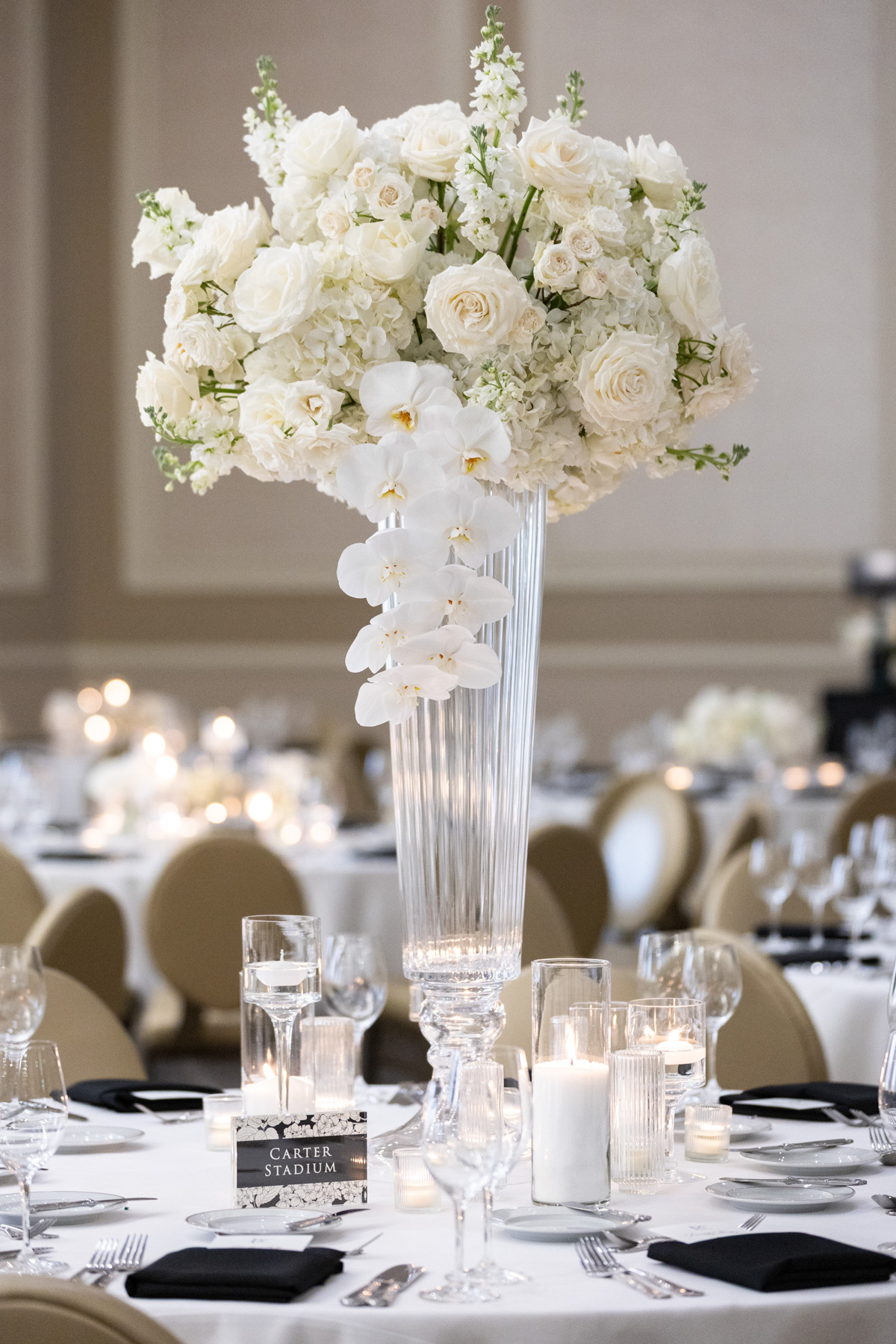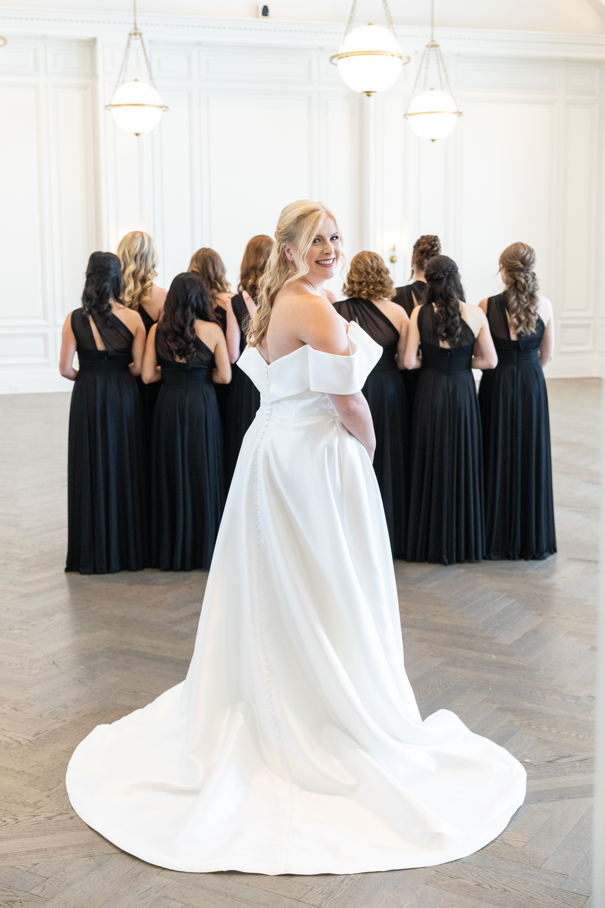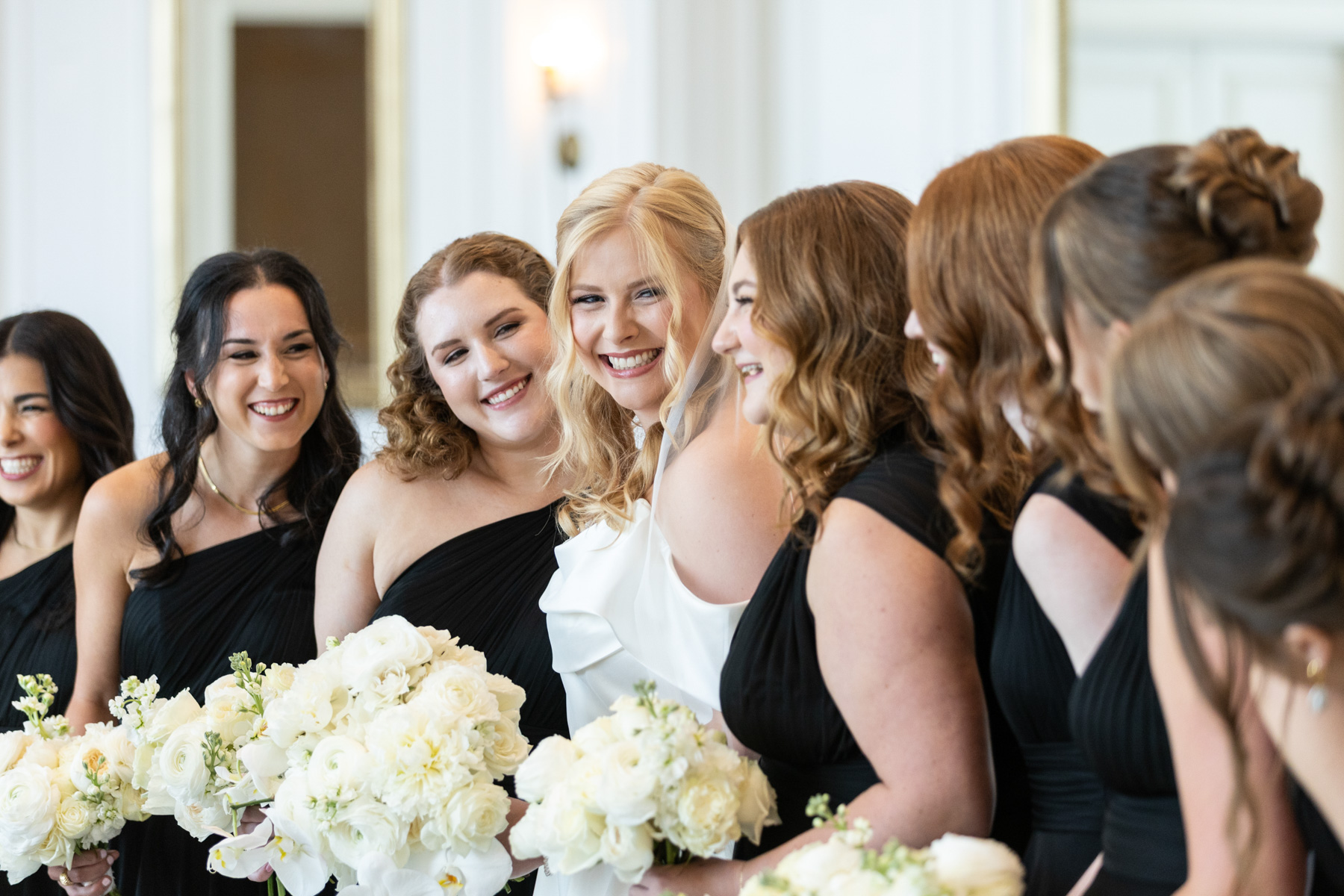 When it came to design, Kaitlyn embraced a classic black-and-white palette with soft candlelight and lush white florals. Though she considered incorporating her favorite color, blue, she ultimately leaned into timeless simplicity. Her bridesmaids, dressed in sleek black gowns, looked effortlessly elegant against the backdrop of The Adolphus ballroom.