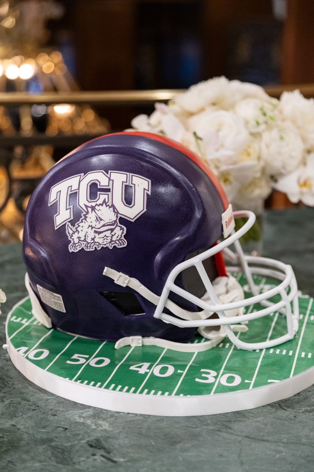 Throughout the process, Kaitlyn and Leighton took joy in the details. Leighton was involved in every step, especially when creating spreadsheets, attending meetings, and championing his key wedding-day priorities: a DJ instead of a band, seafood on the menu, and a custom Groom’s Cake that combined his love for the Kansas City Chiefs and their alma mater, TCU.