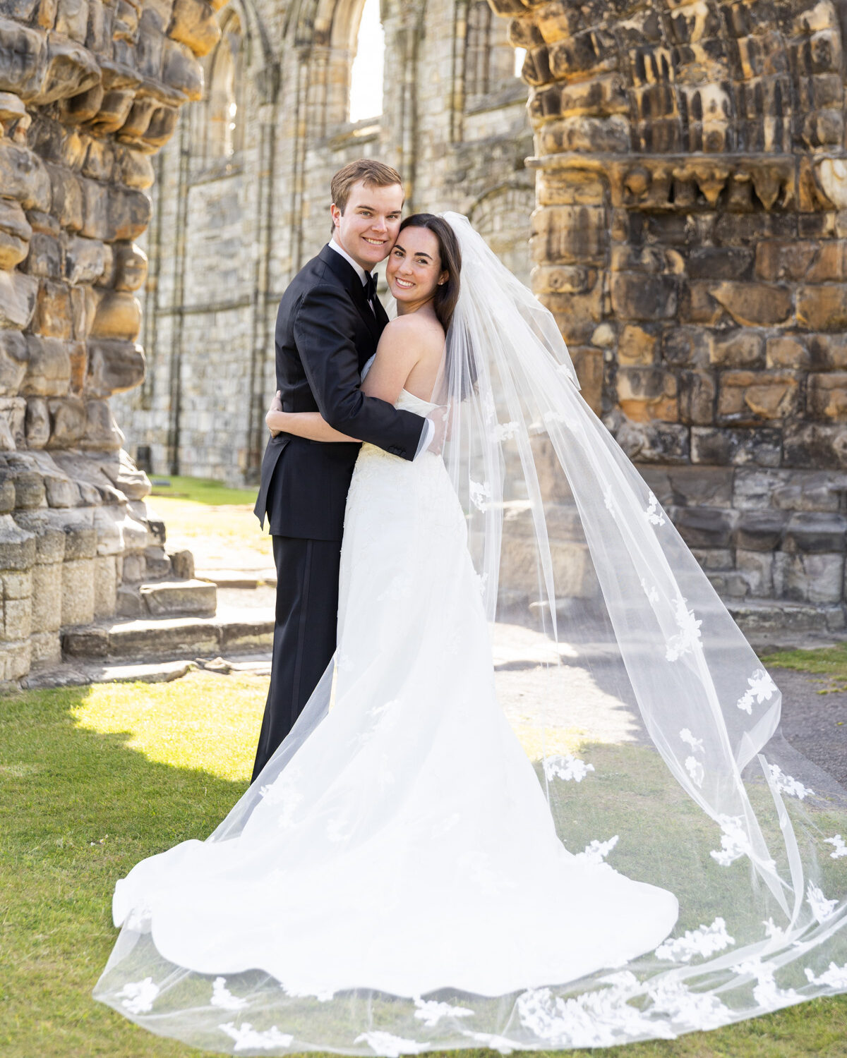 The couple began their day in the ancient St. Salvator’s Chapel at the University of St. Andrews, Laura Catherine’s alma mater. Beneath soaring Gothic arches and the golden glow of candlelight, Laura Catherine walked the aisle wearing her sister’s veil and grandmothers pearl bracelet. Here, modern love found its place among centuries of tradition, a reverent nod to history and the places that have shaped them.