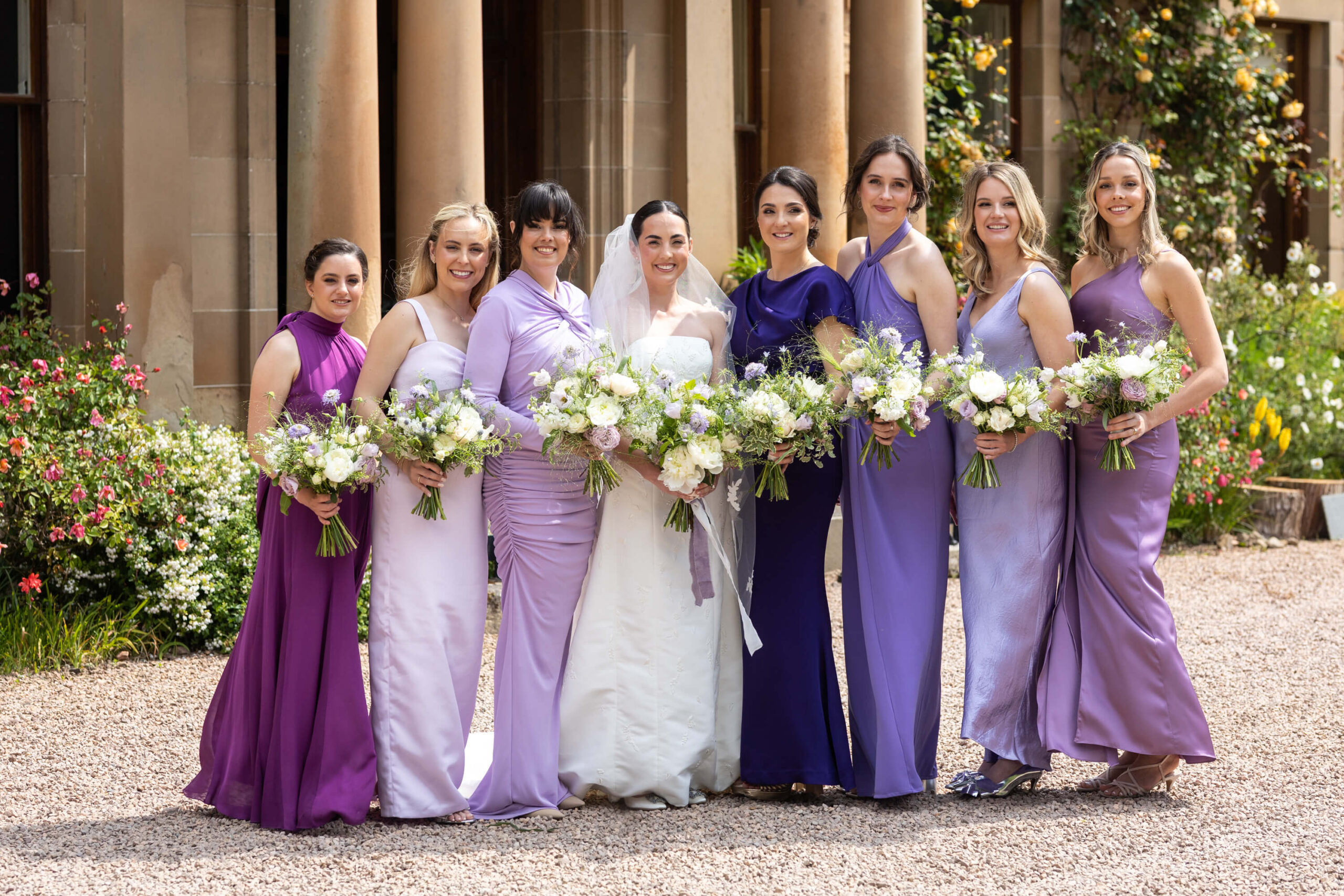 The reception space was a reflection of the landscape itself, with florals in refined shades of purple anchored by Scottish thistle and grounded in muted greenery, echoing the rugged beauty of the estate. The natural palette and ancient stone, bathed in the soft summer light, reflected a kind of beauty only Scotland can offer: unforced, unpolished, and deeply resonant.