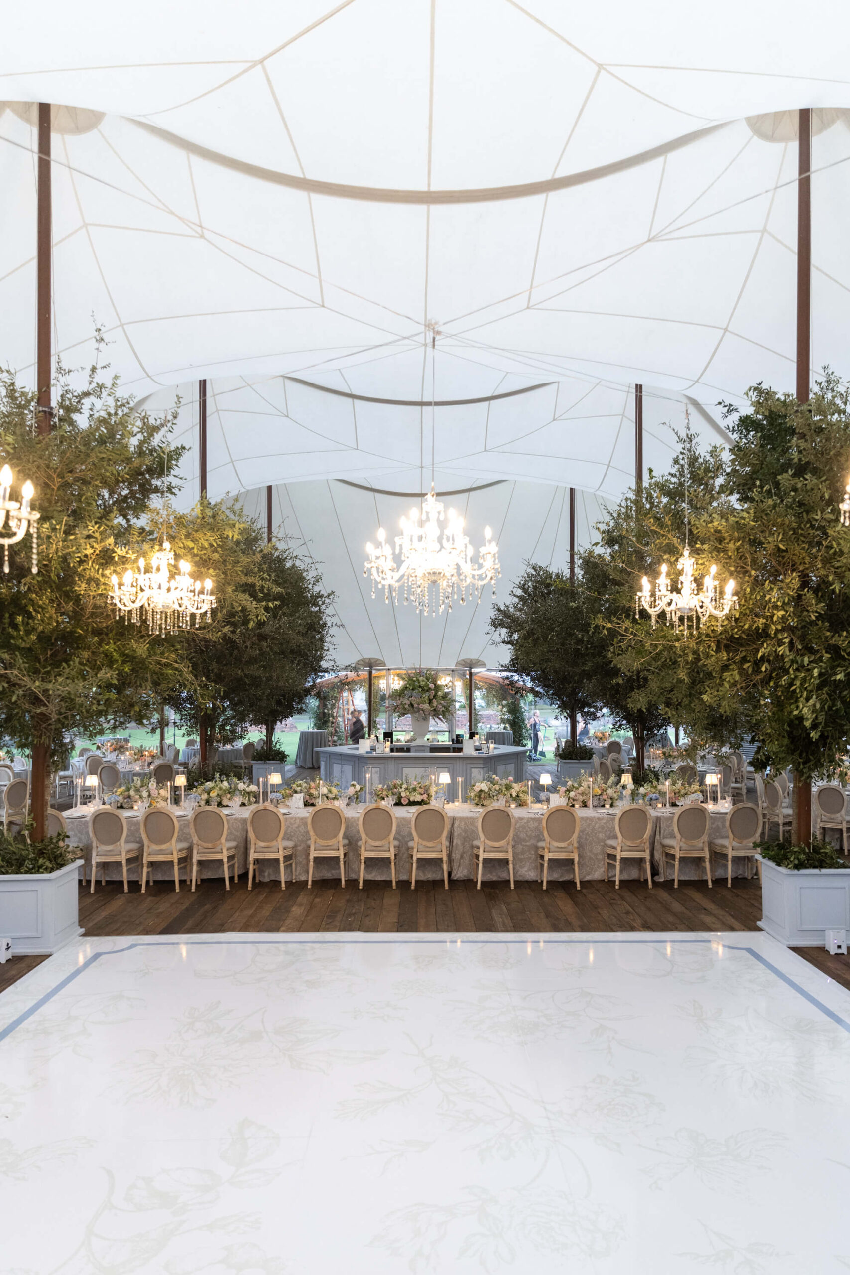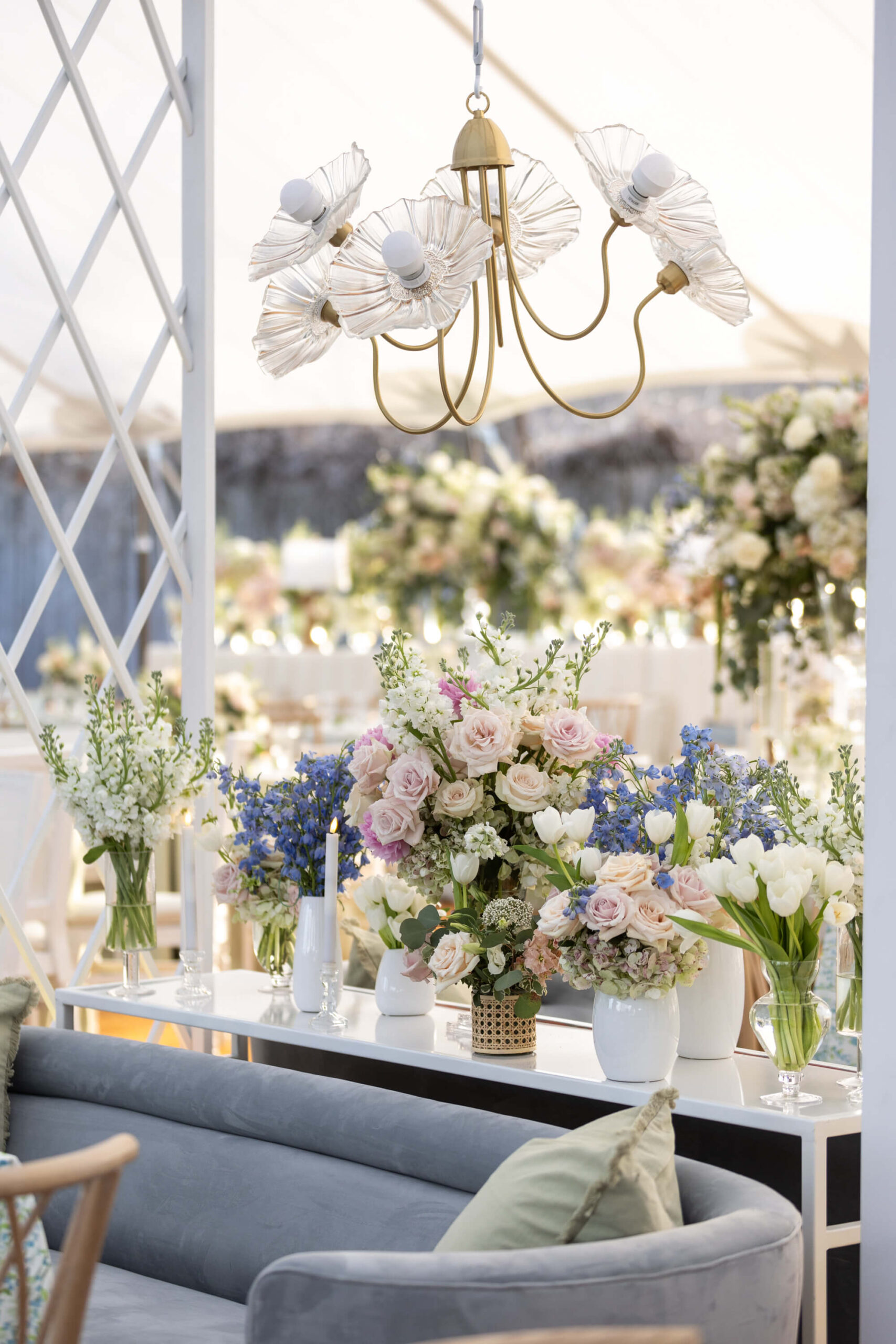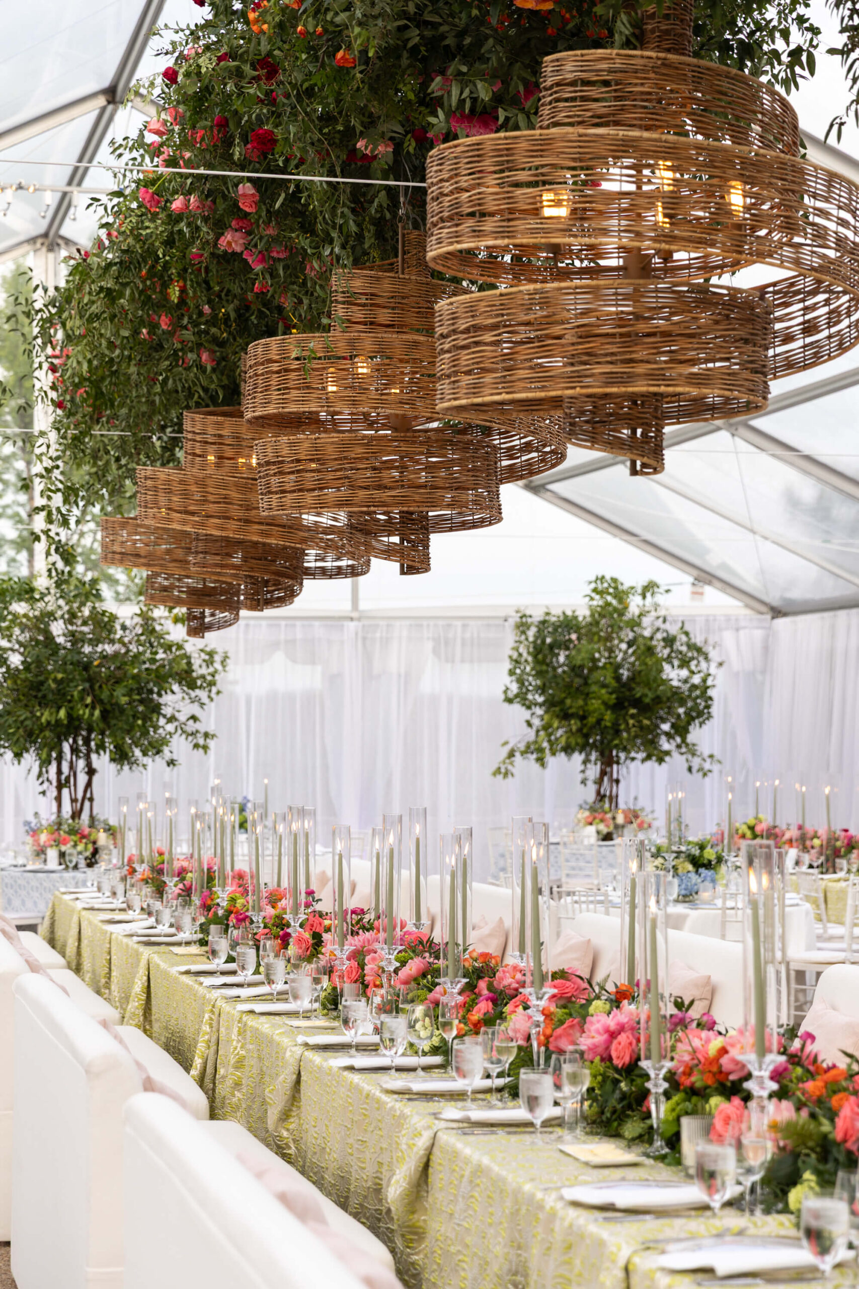 Chandeliers have become far more than classic ceiling décor, they’re sculptural centerpieces. Crystal tiers bring timeless romance, while modern, minimalist silhouettes strike a sleek, editorial note. Suspended over a dance floor, clustered above long dinner tables, or dripping with greenery in a tent, chandeliers instantly add luxury and dimension to a space.