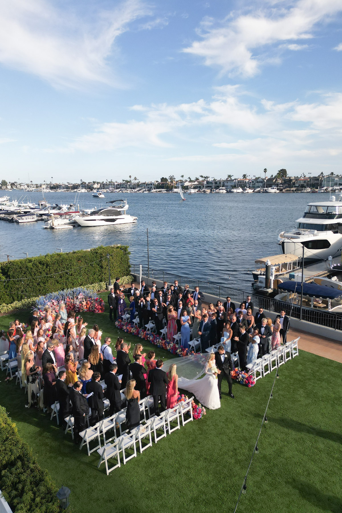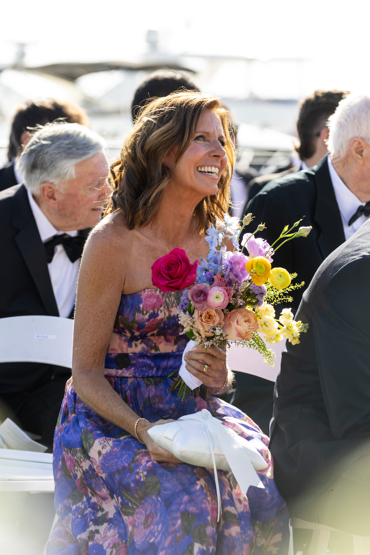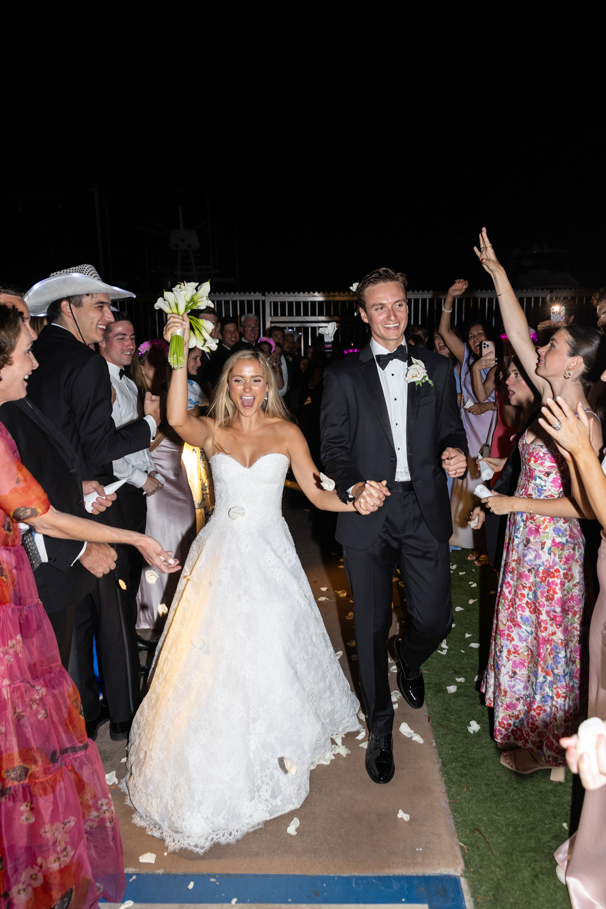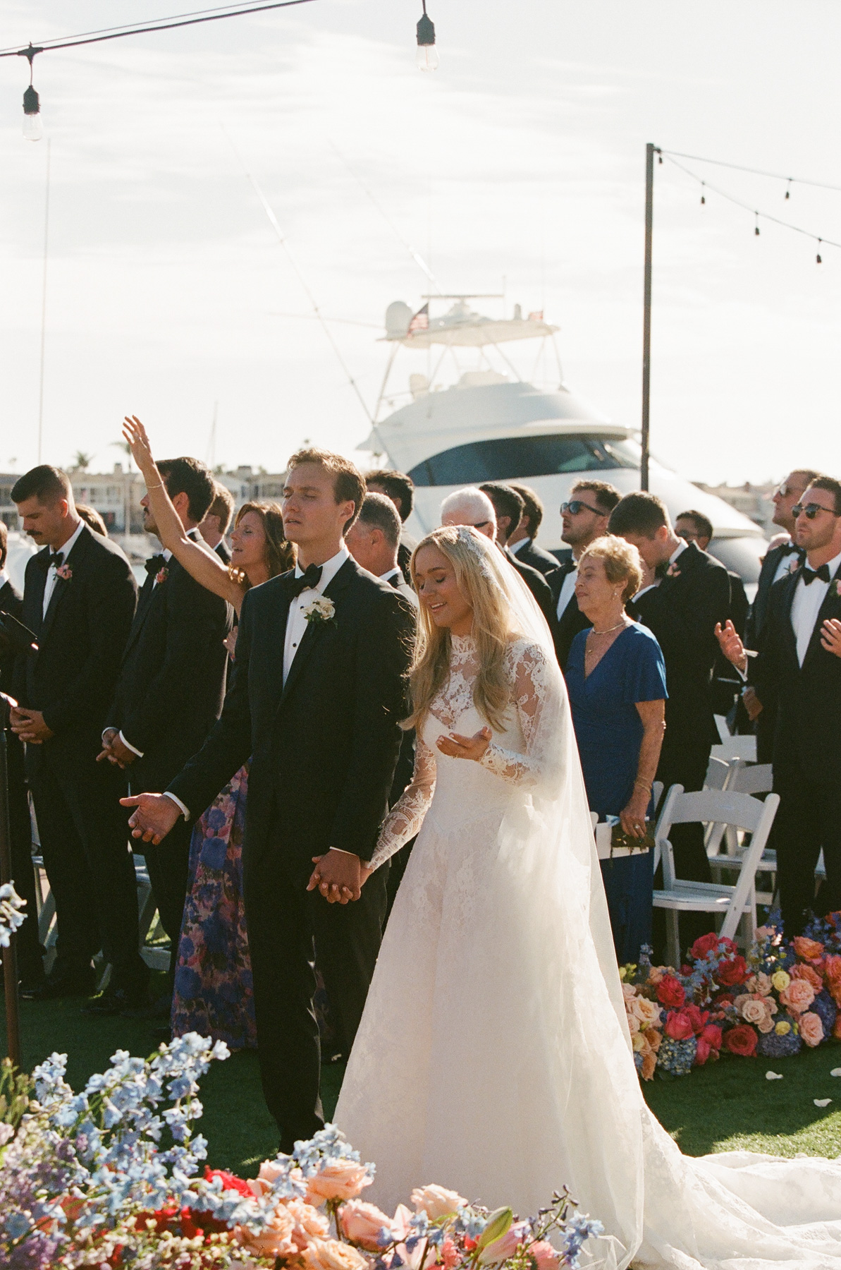 The wedding weekend was filled with intentional moments. The rehearsal dinner welcomed more than 100 guests overlooking the bay, where friends and family shared heartfelt speeches that left the couple feeling deeply loved and supported. The next day, their ceremony was a powerful hour and fifteen minutes of worship, communion, and vows: a true reflection of the couple’s heart for God. As their friends led worship, the music spilled out over the bay, with boats pulling up just to listen, creating an unforgettable atmosphere of joy and reverence.
