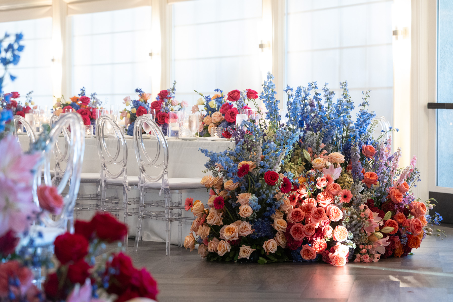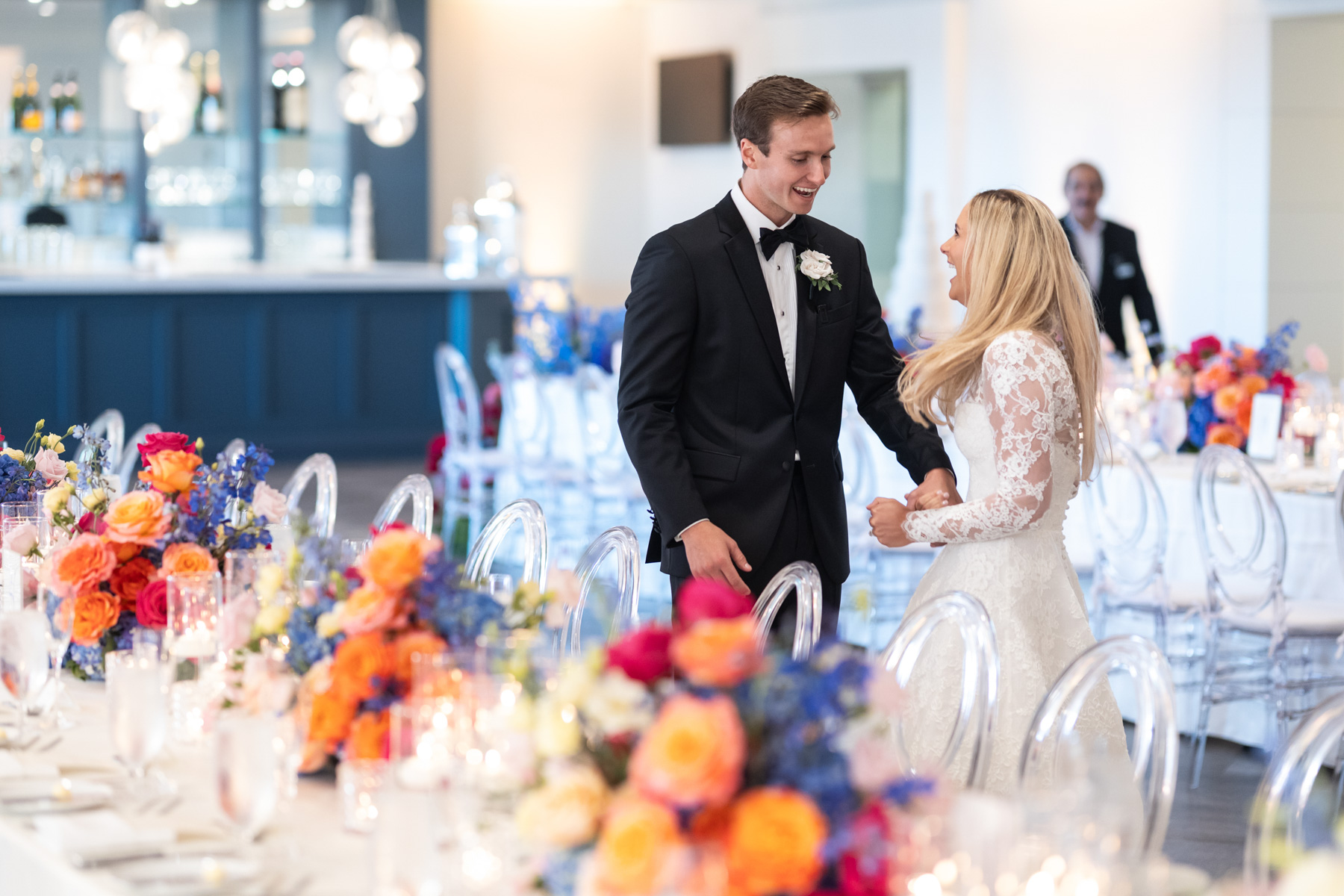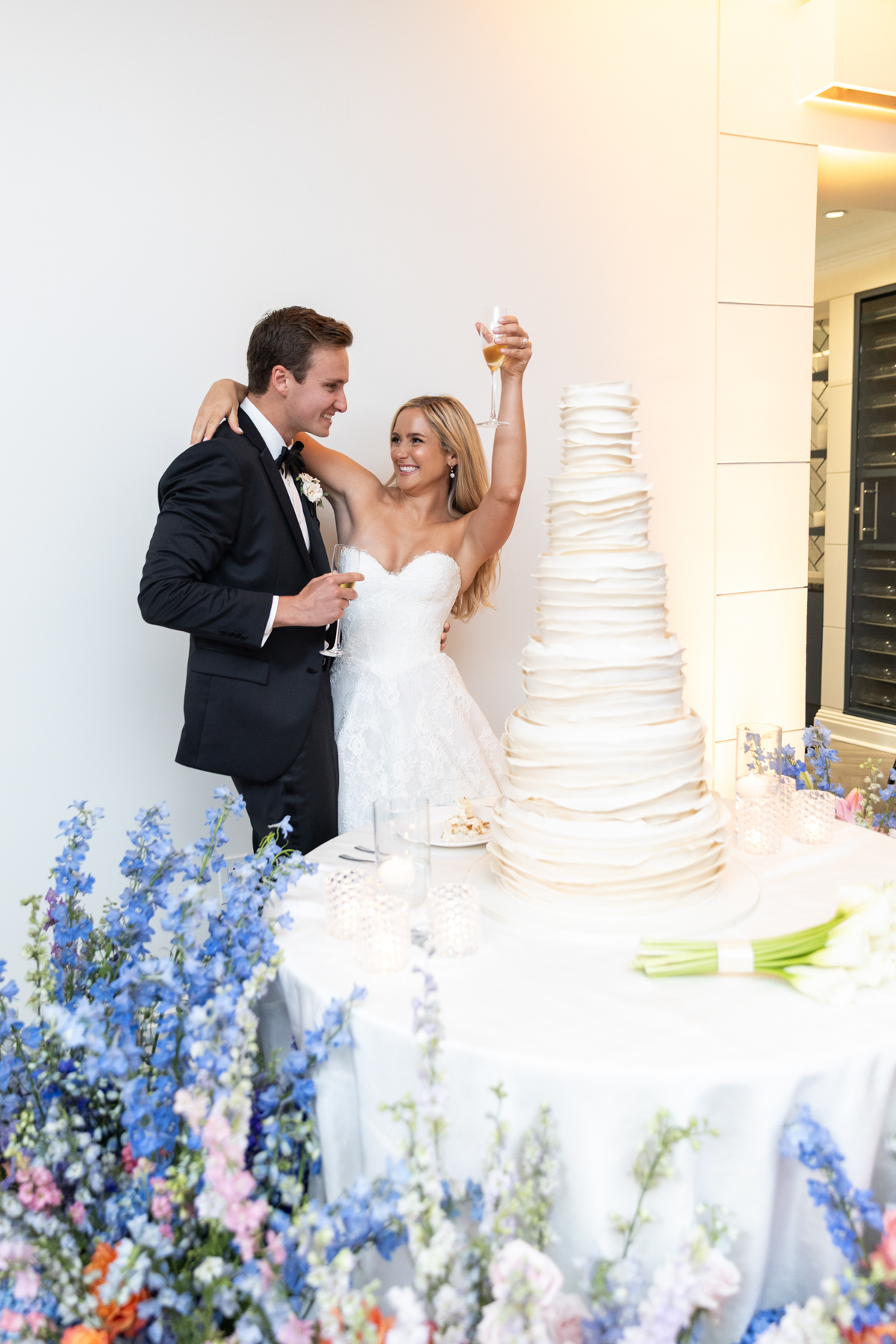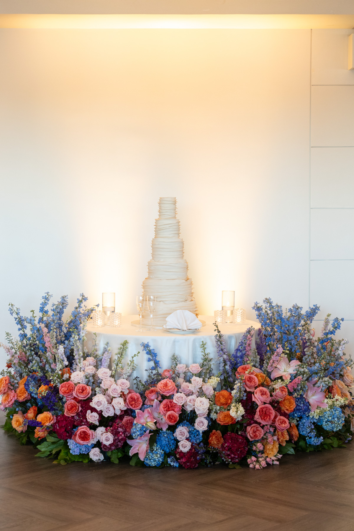 The reception carried the same spirit of celebration. Guests were welcomed with a stunning floral design that transformed the room into a vibrant garden by the water. Benton and Lindsay shared a choreographed first dance he designed just for them, filling the room with laughter and joy. The evening was made complete with a textured cake as beautiful as it was delicious: almond with Bavarian cream and chocolate hazelnut with Oreo cream.
