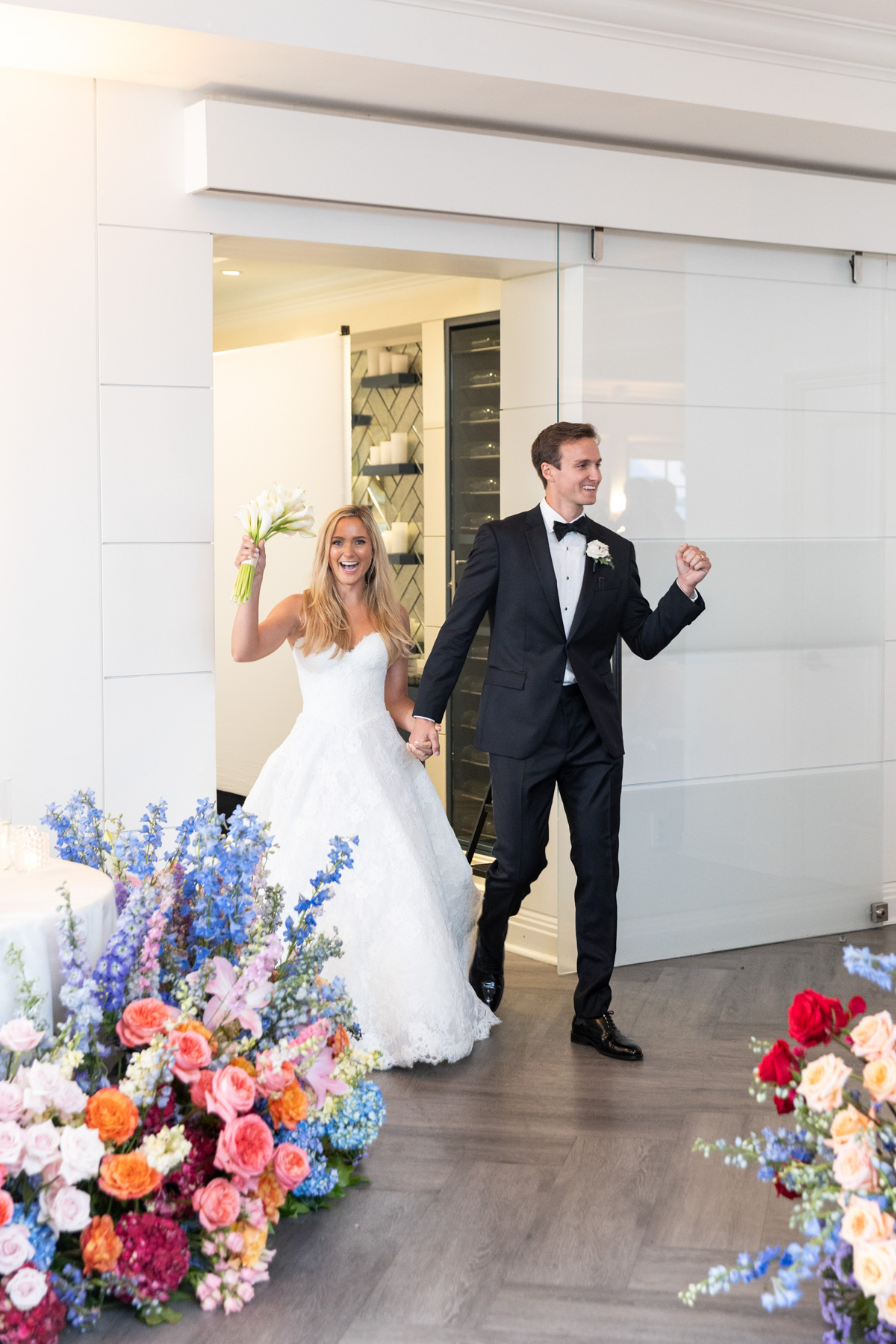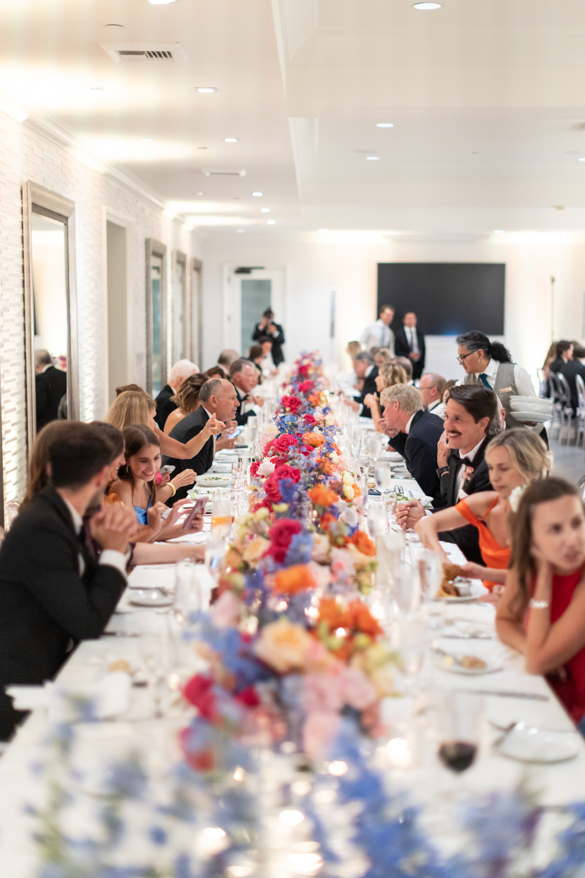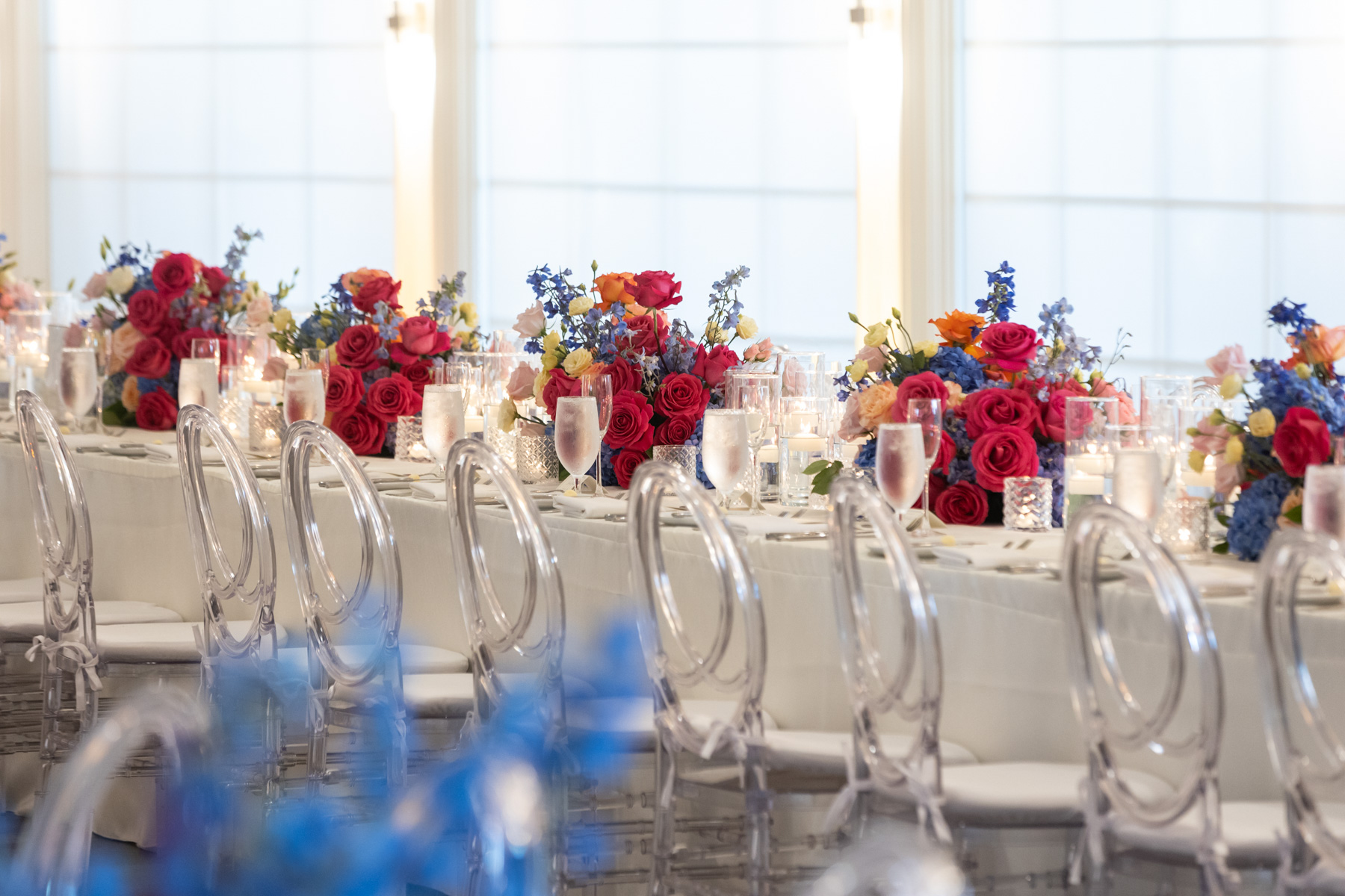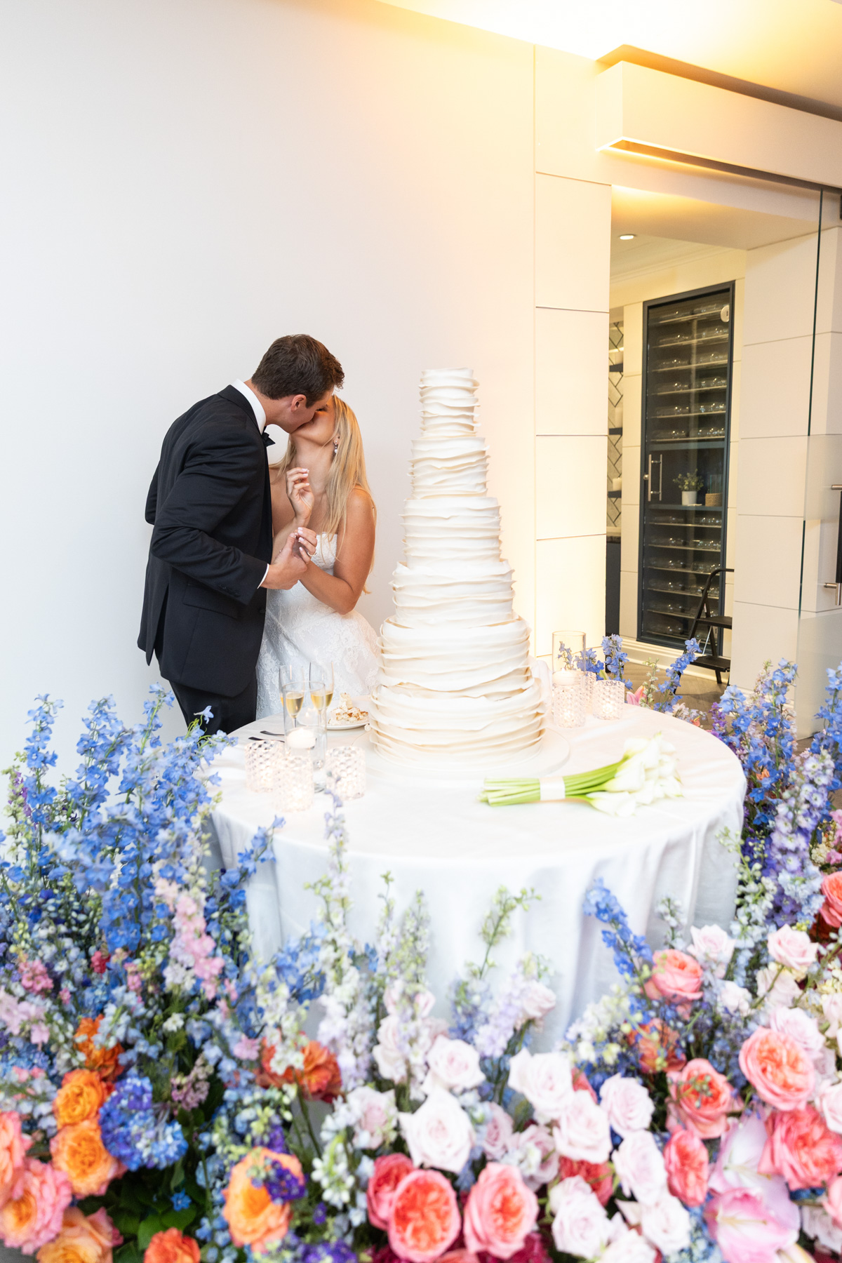 The reception carried the same spirit of celebration. Guests were welcomed with a stunning floral design that transformed the room into a vibrant garden by the water. Benton and Lindsay shared a choreographed first dance he designed just for them, filling the room with laughter and joy. The evening was made complete with a textured cake as beautiful as it was delicious: almond with Bavarian cream and chocolate hazelnut with Oreo cream.