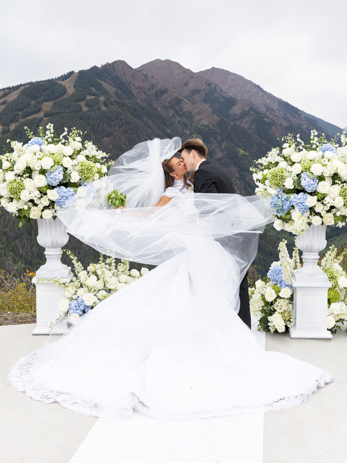 To reach the ceremony site atop the mountain, guests and the wedding party rode the chairlift, creating an unforgettable arrival experience. Madeline, ever the adventurous bride, opted to ride up in full hair, makeup, and gown, wrapping herself in a white scarf and cat-eye sunglasses for what became one of the day’s most iconic moments. “It felt old Hollywood, a little Slim Aarons, and a touch of mountain chic,” she said.