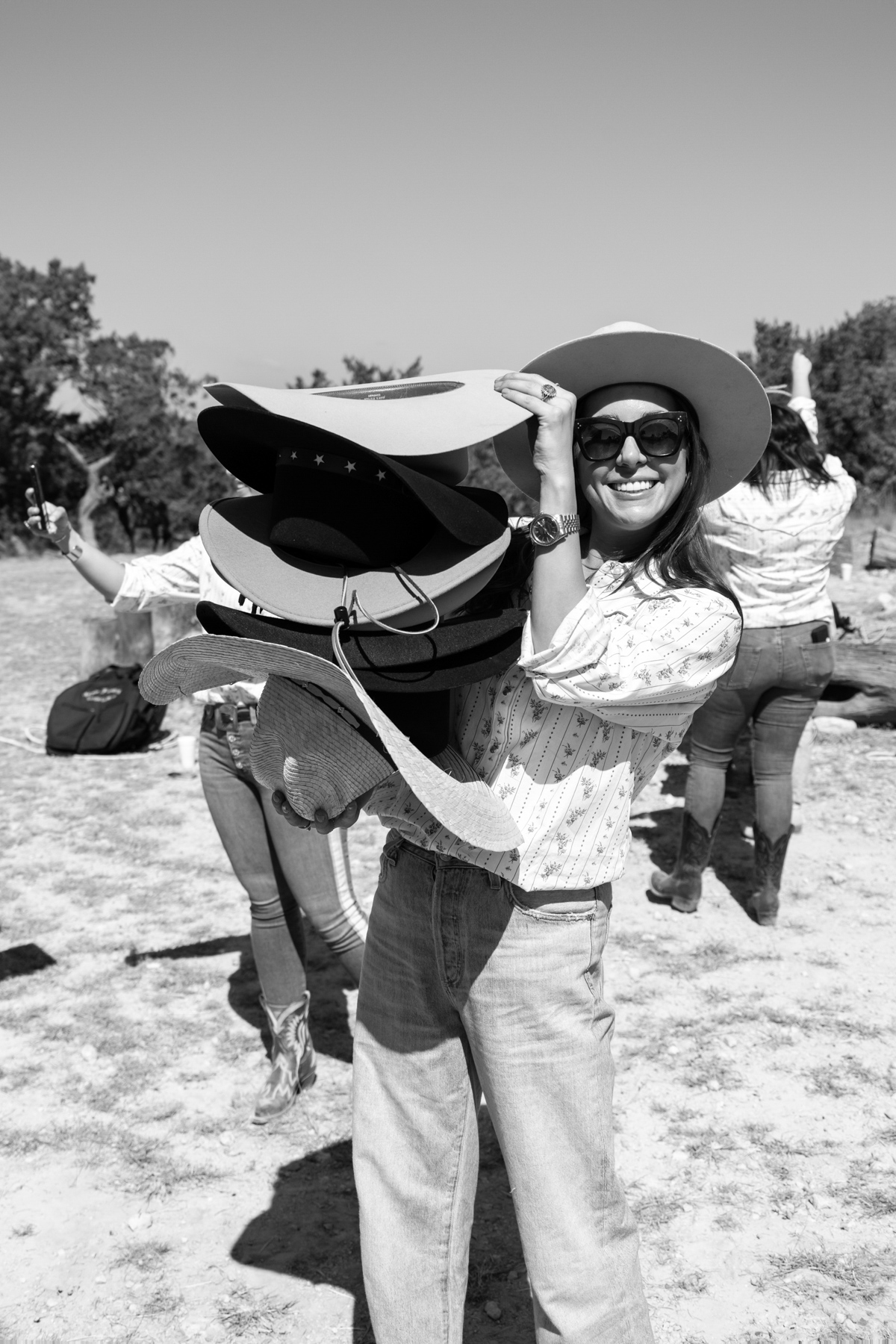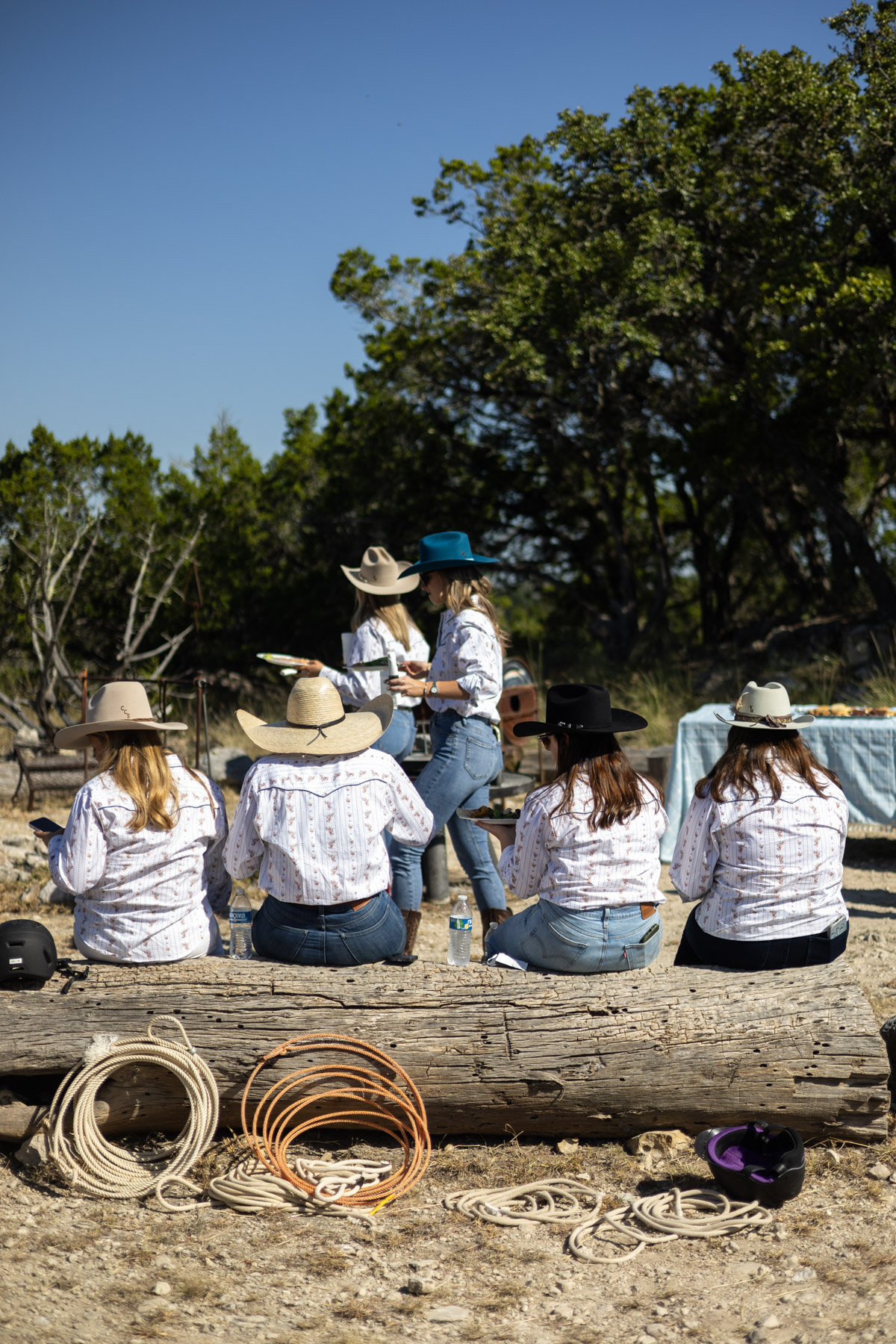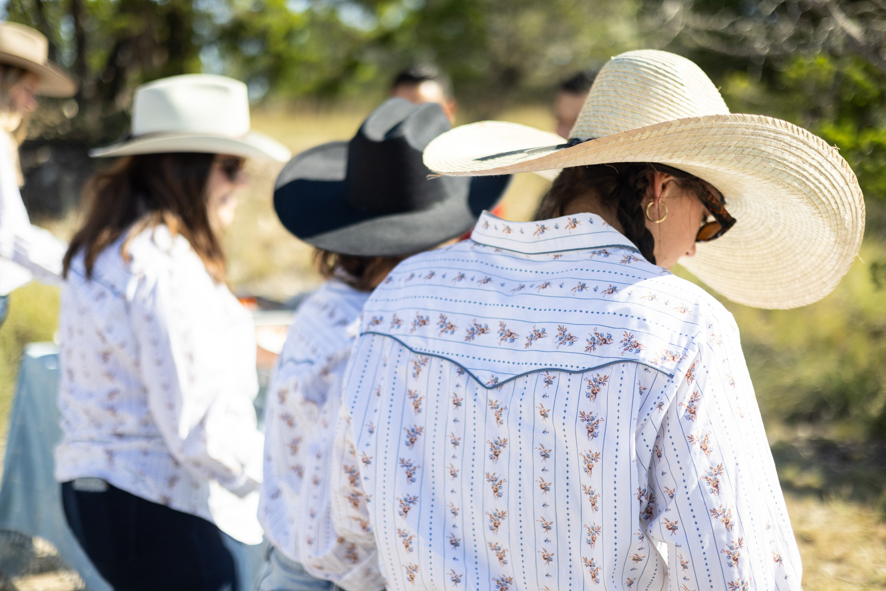 Dressed in effortlessly cool Western-inspired styles (think boots, denim, and breezy button-downs) the group rode beneath the wide Texas sky, shared laughs during roping lessons, and came together for a beautifully curated outdoor lunch that felt like a scene from a modern ranch retreat. Bathed in warm sunlight and filled with easy, joyful conversation, this gathering was the perfect pause before the weekend’s festivities unfolded.
